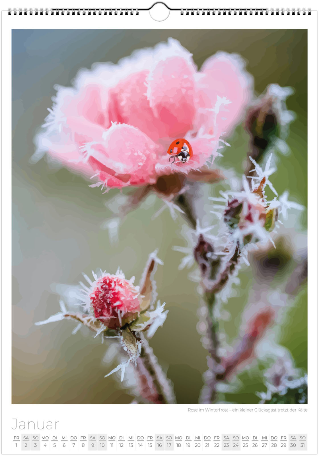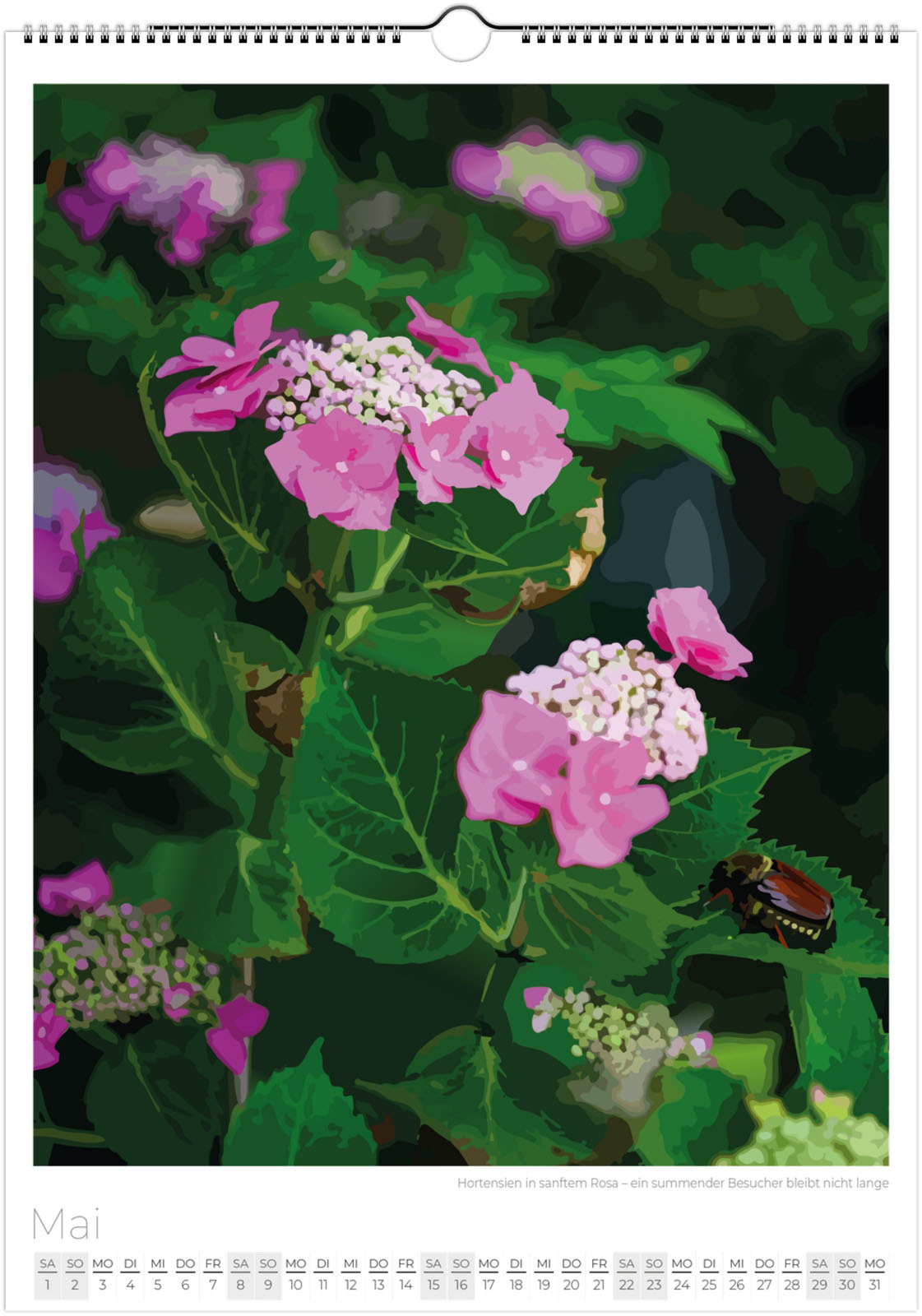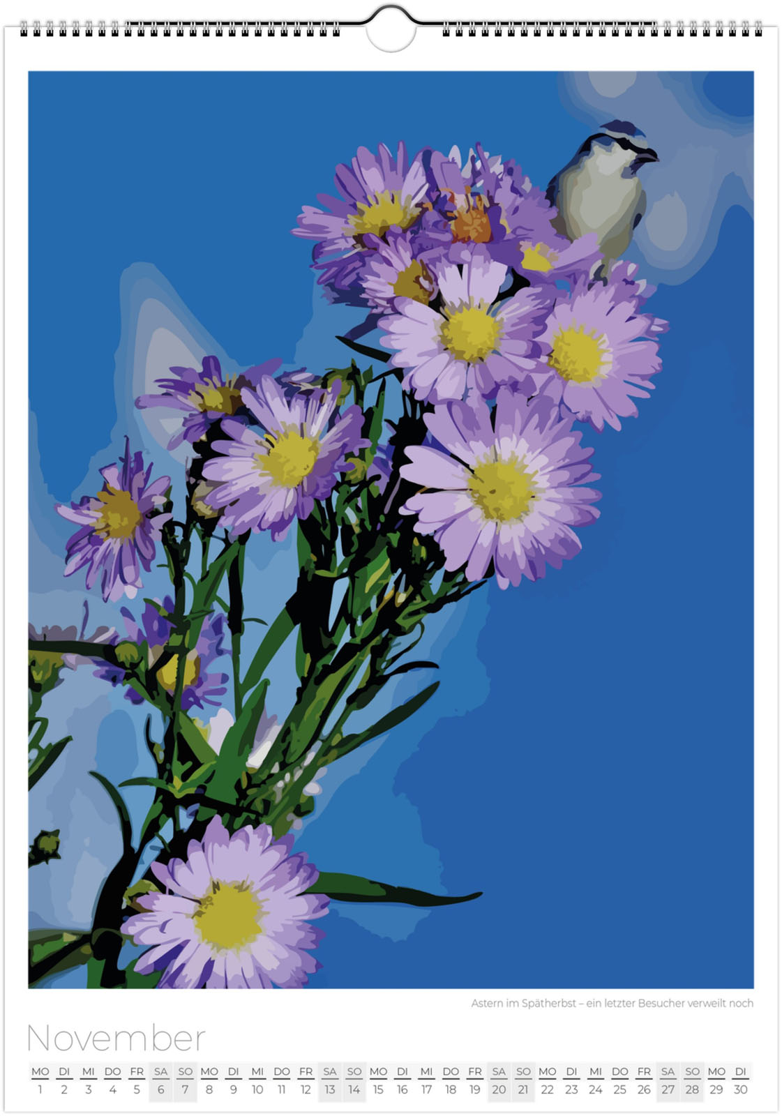 Jeder Monat zeigt eine liebevoll gestaltete Blumenillustration, ergänzt durch einen kleinen tierischen Besucher, der die Szene lebendig werden lässt.