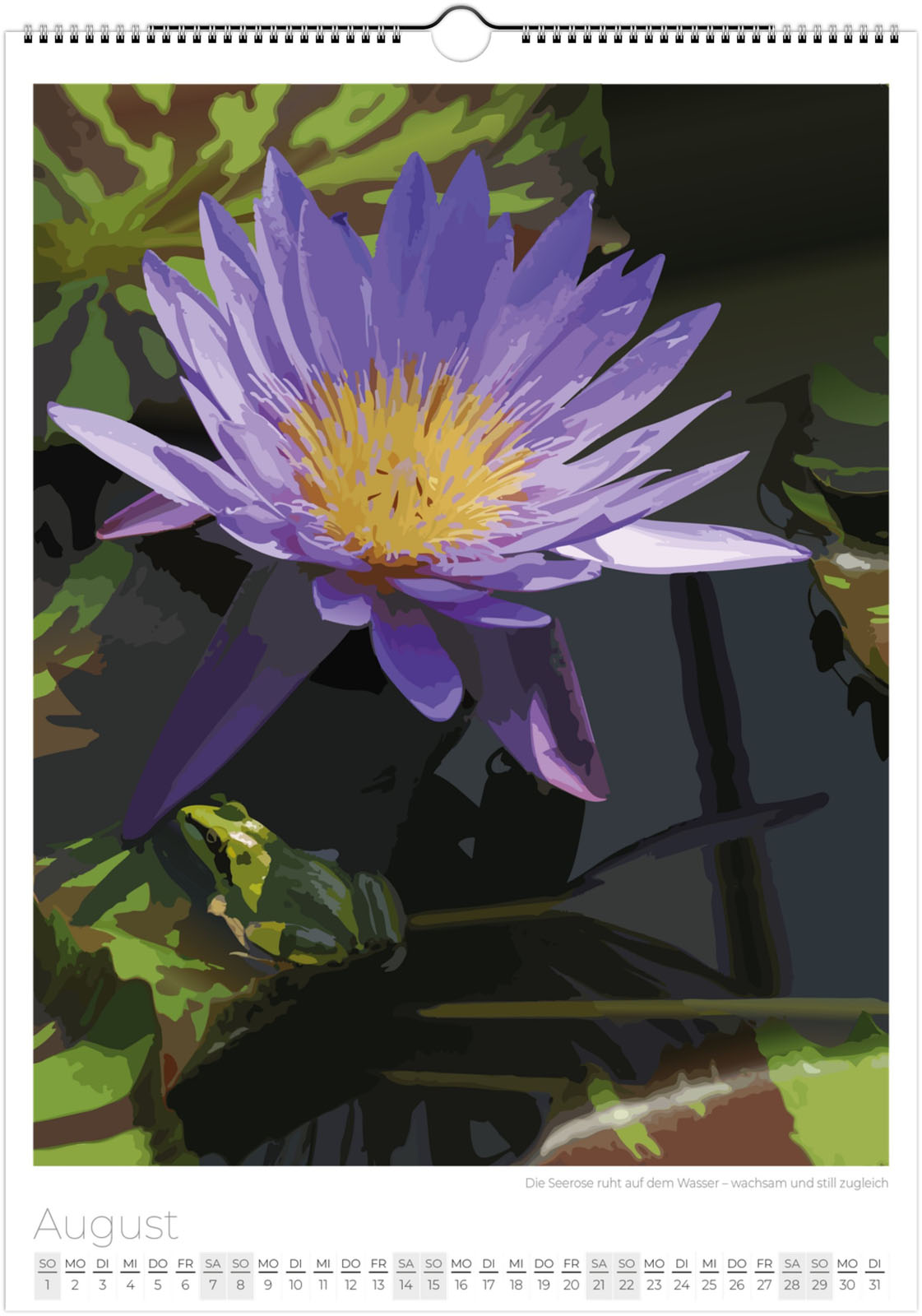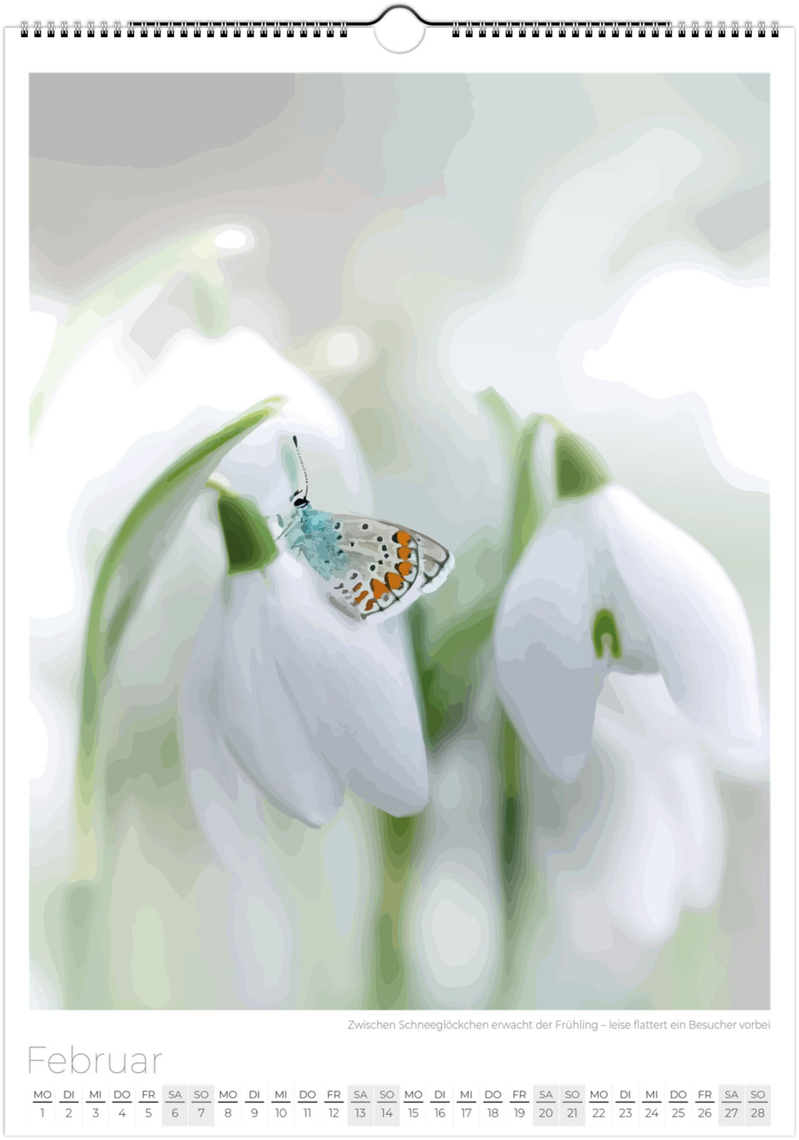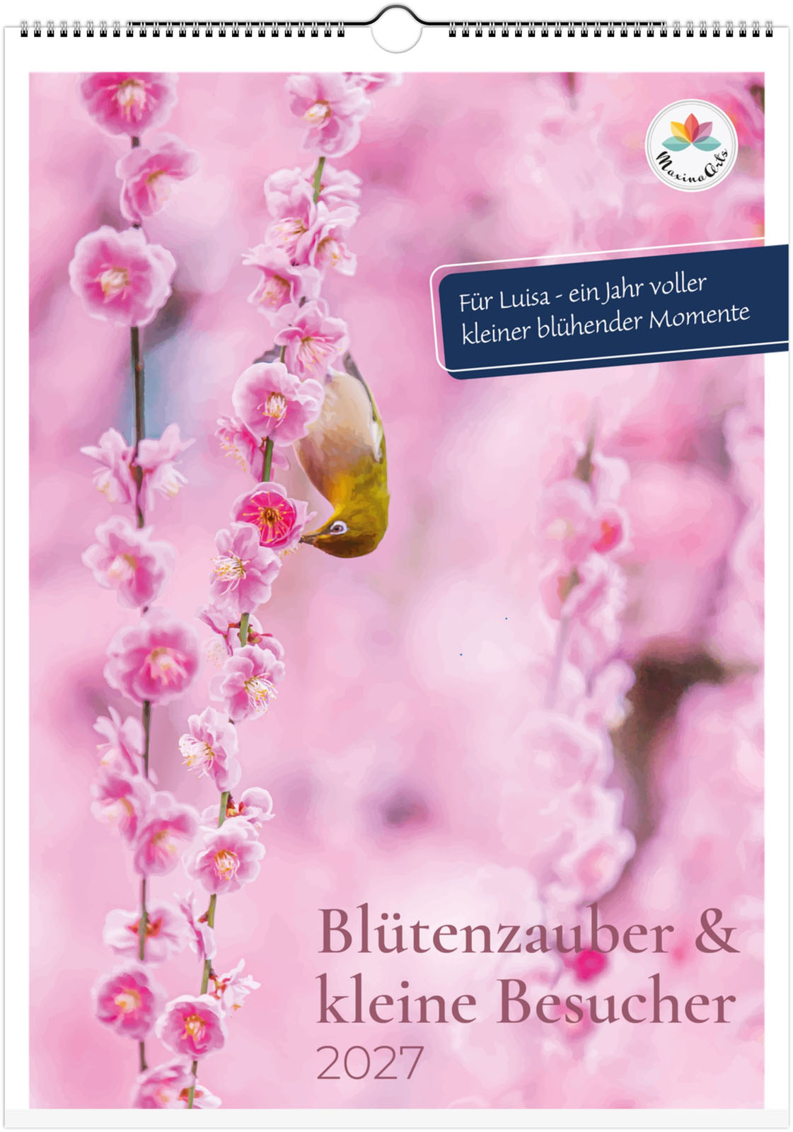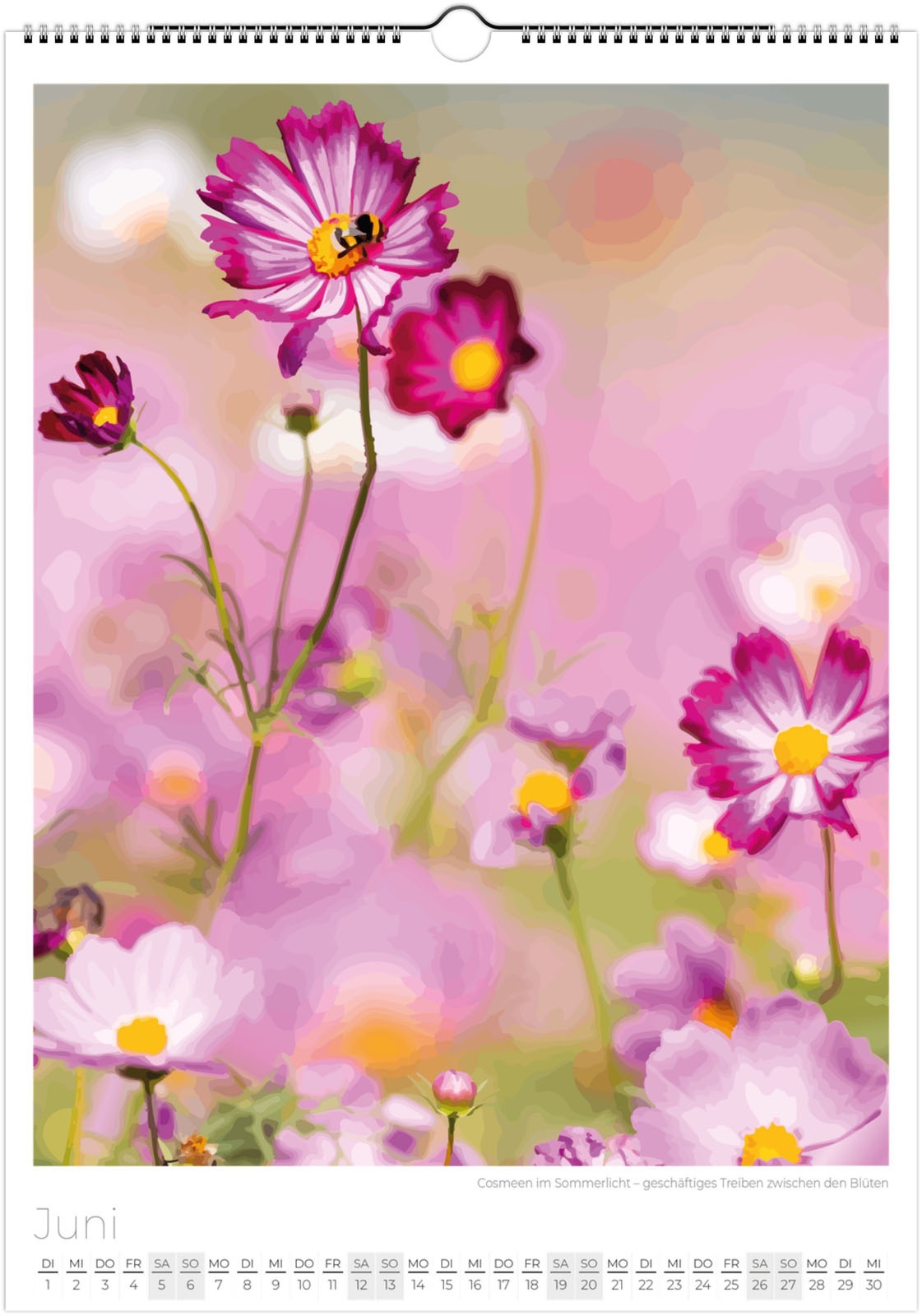 Jeder Monat zeigt eine liebevoll gestaltete Blumenillustration, ergänzt durch einen kleinen tierischen Besucher, der die Szene lebendig werden lässt.