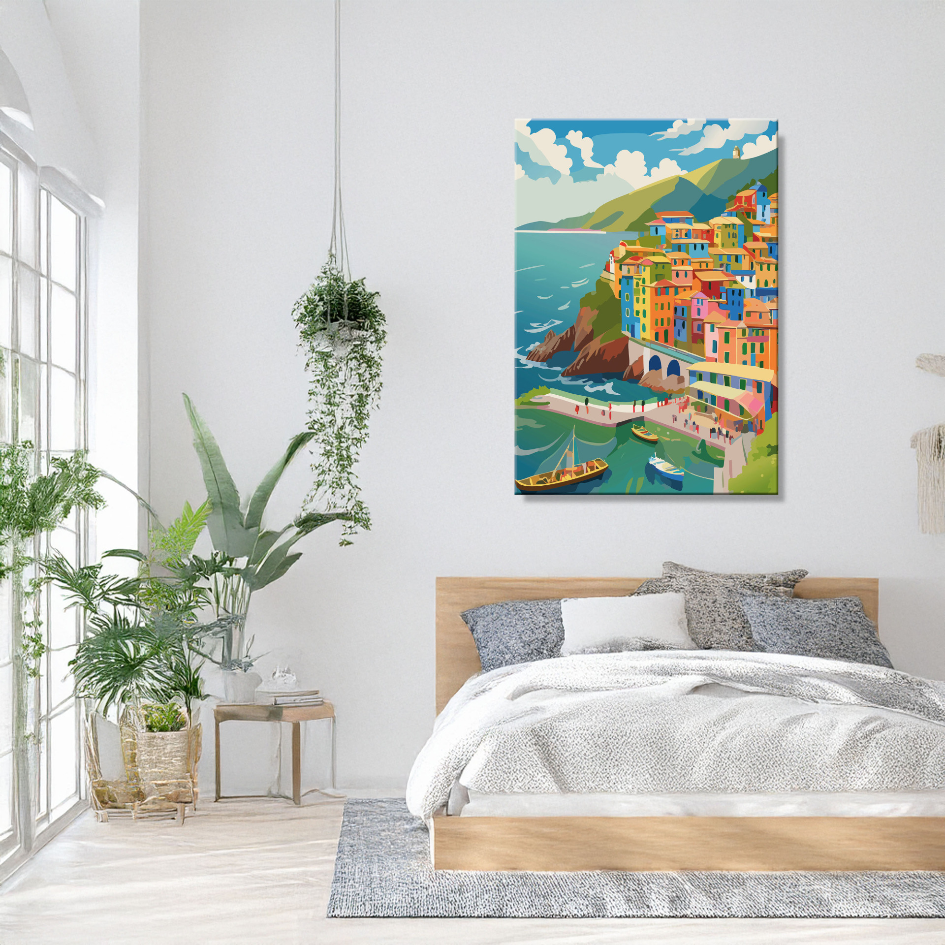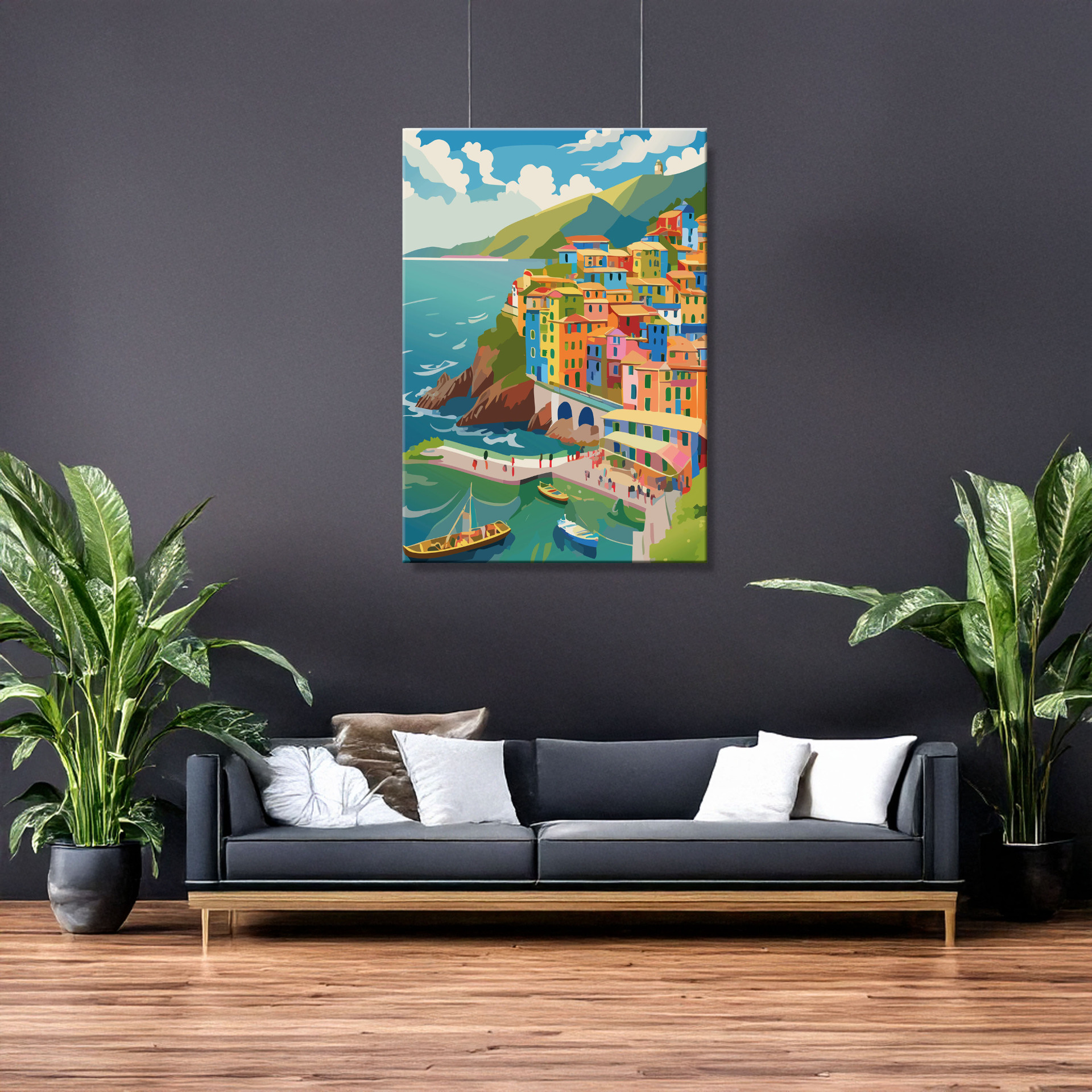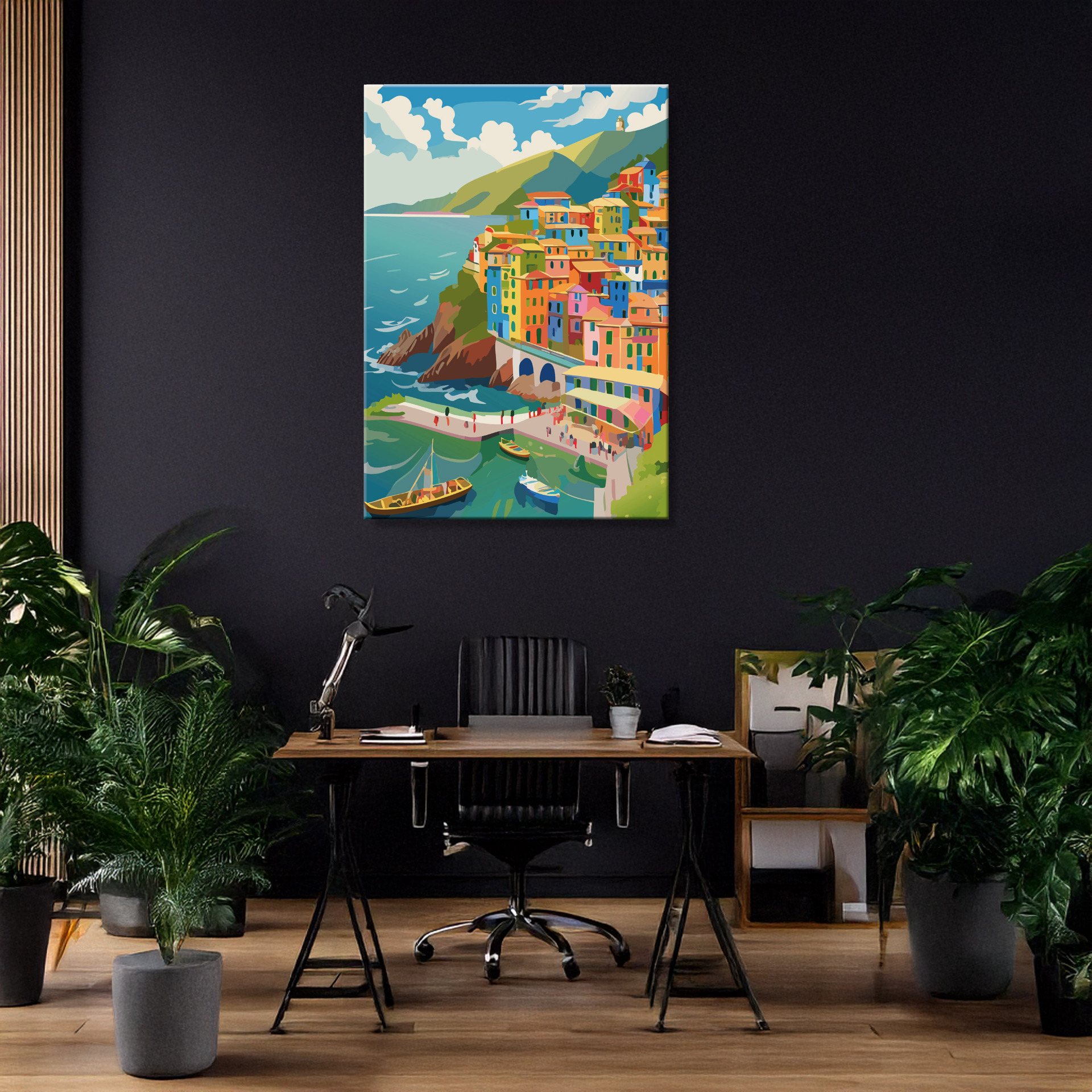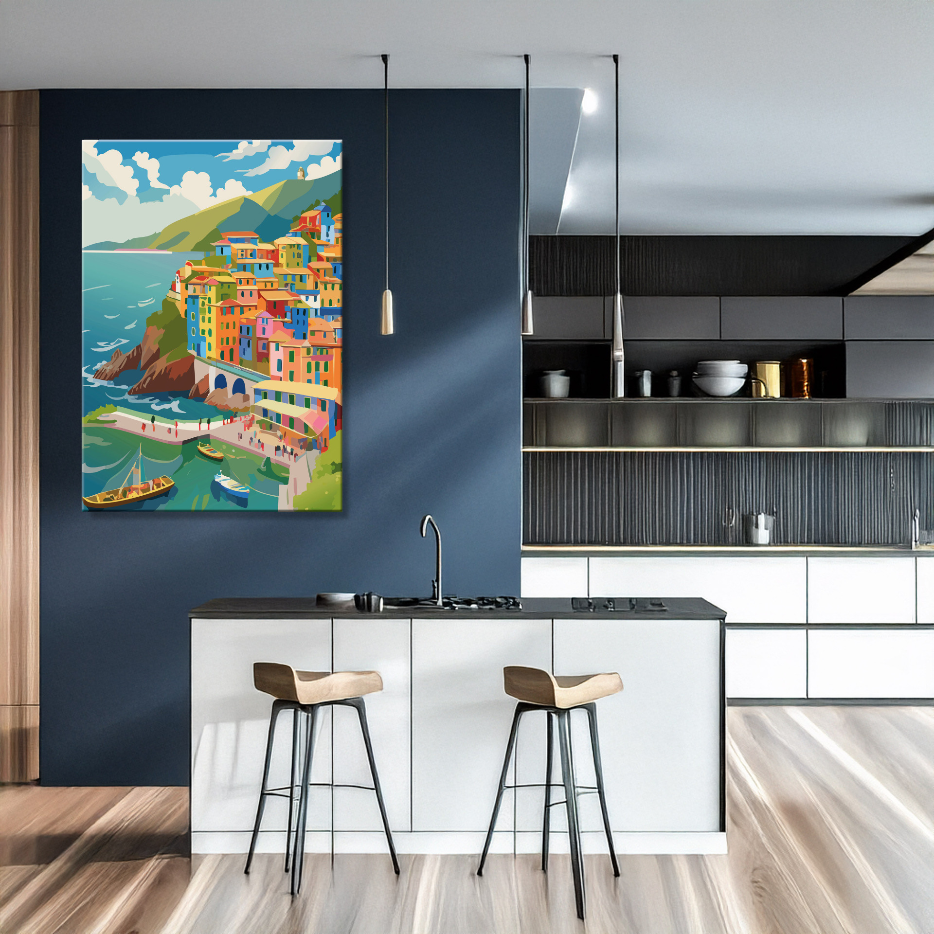 Bunte Häuser an der Felsen­küste Liguriens, über dem azurblauen Meer – 'Cinque Terre' fängt diesen Moment ein und verleiht jedem Raum italienische Leichtigkeit."