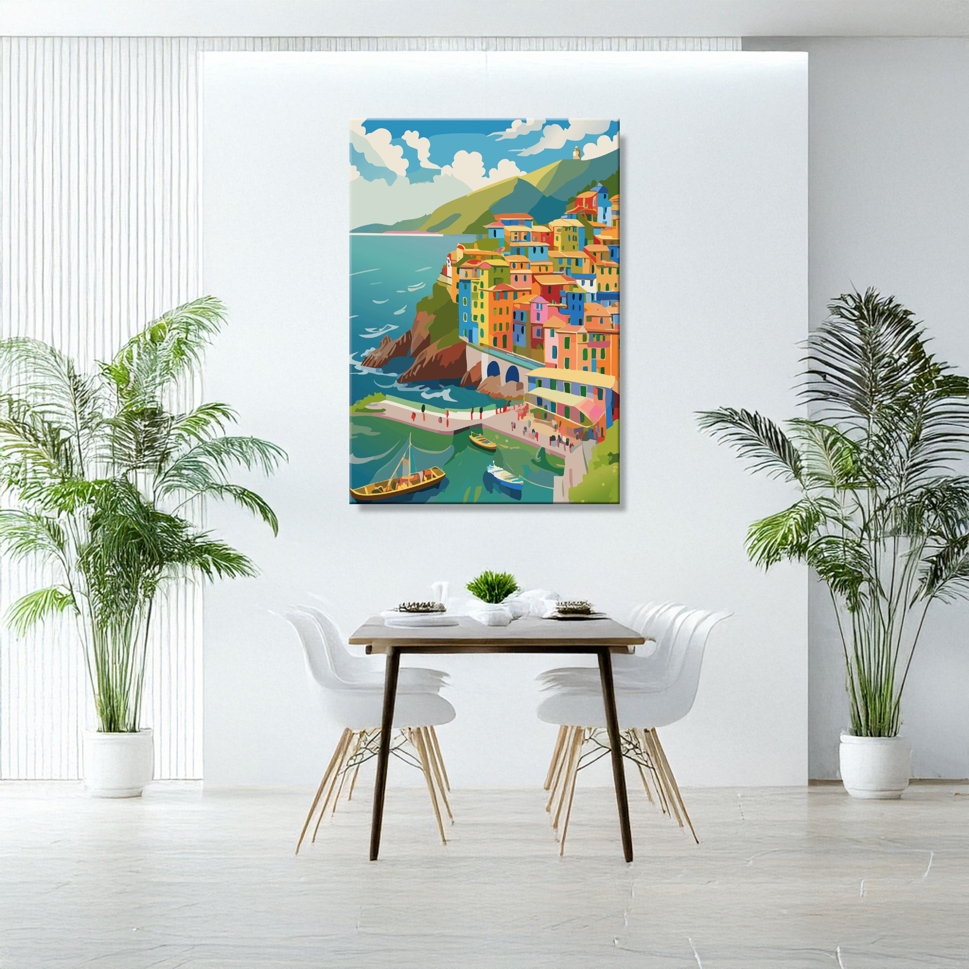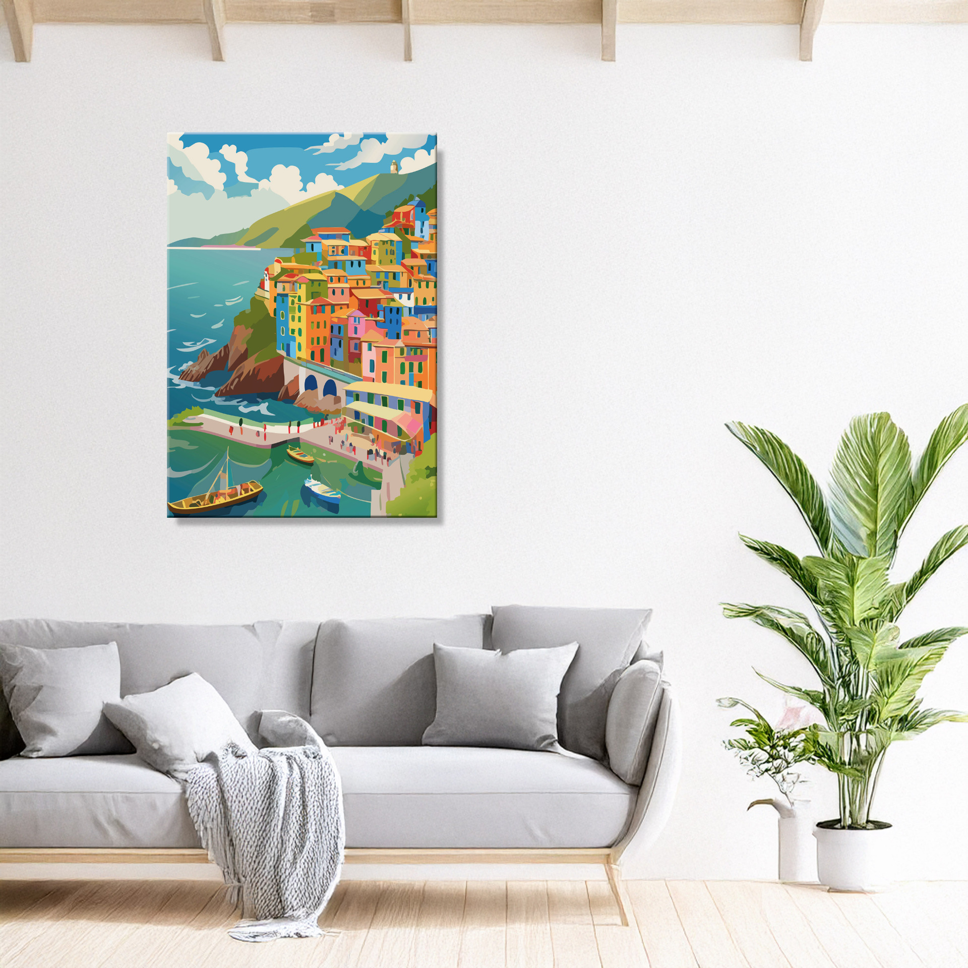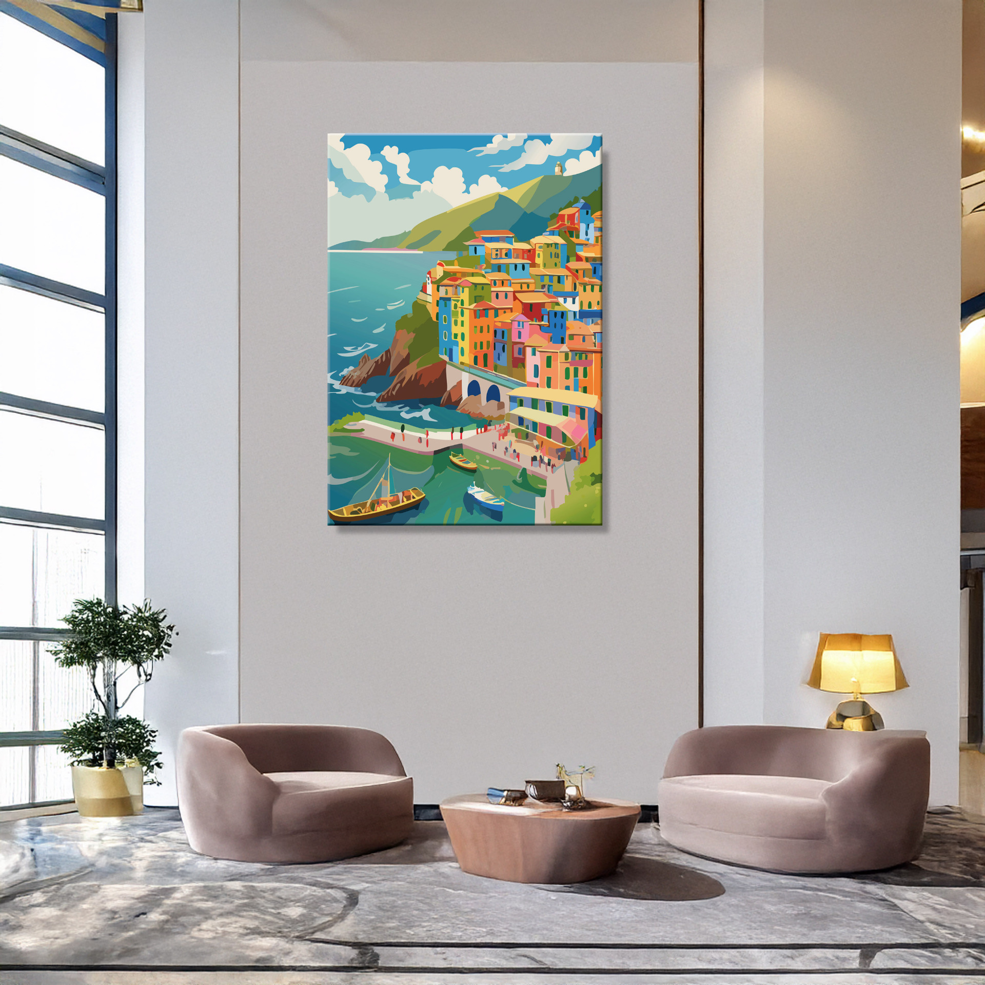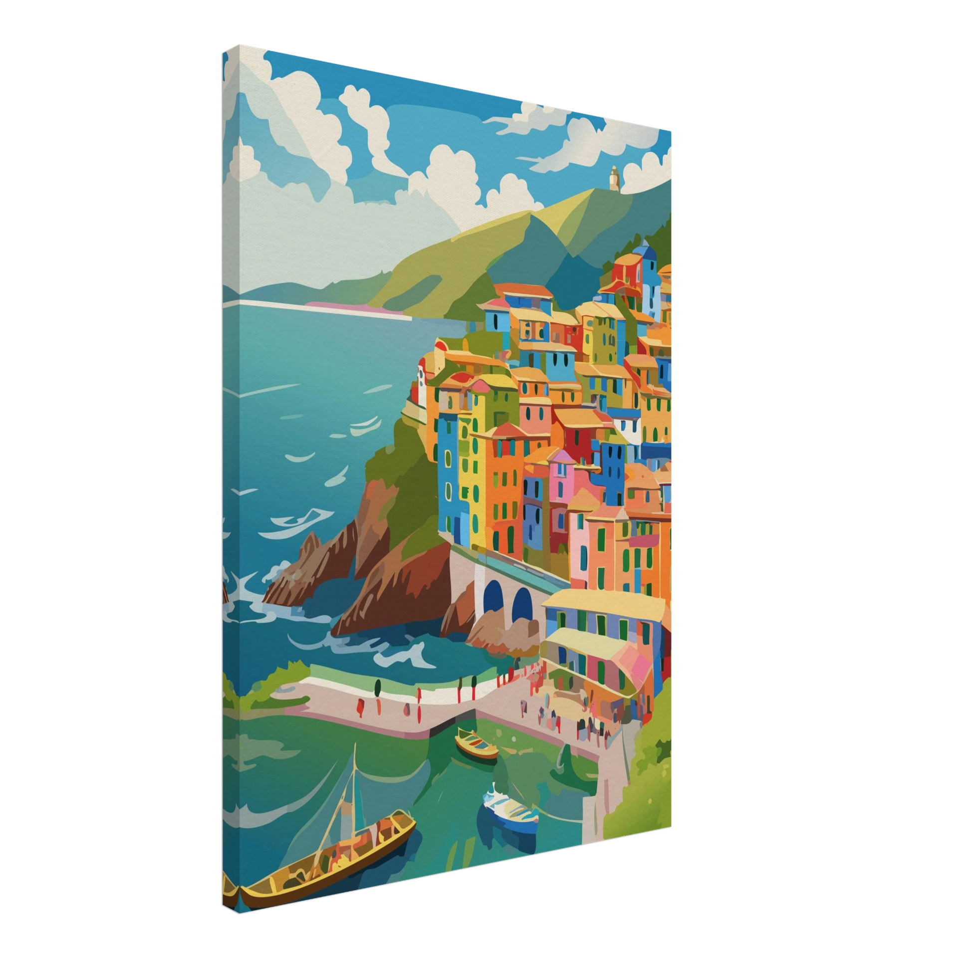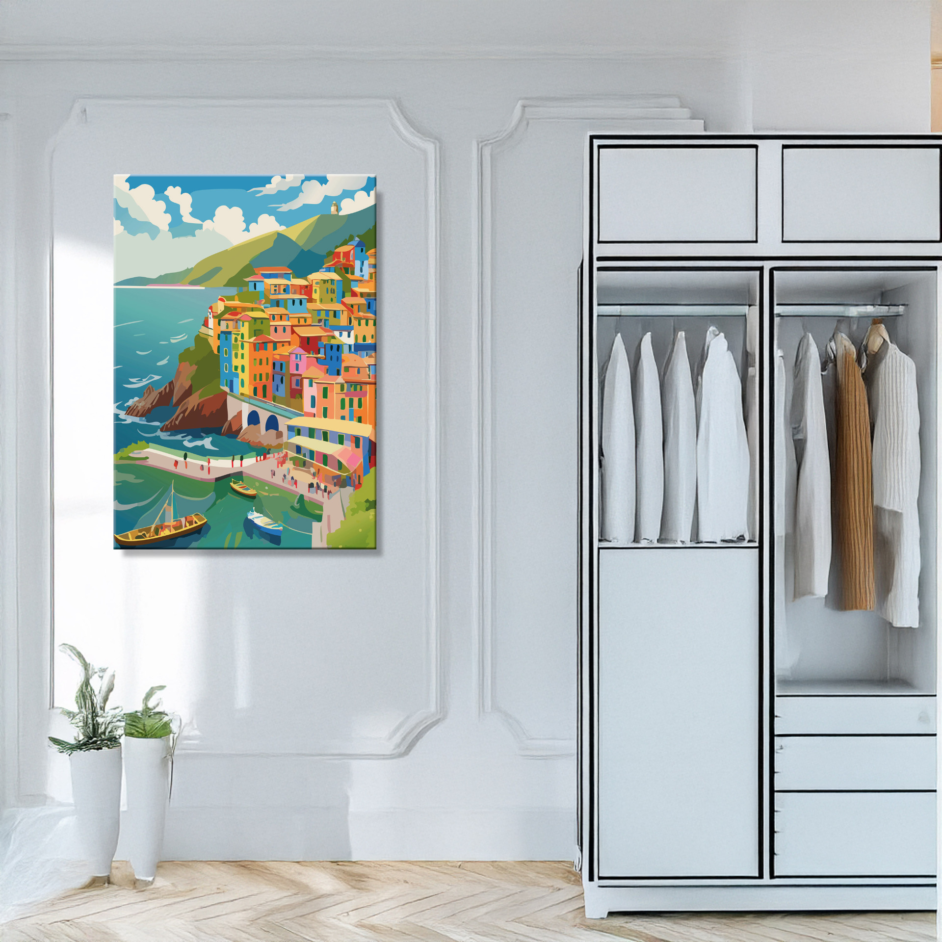 Bunte Häuser an der Felsen­küste Liguriens, über dem azurblauen Meer – 'Cinque Terre' fängt diesen Moment ein und verleiht jedem Raum italienische Leichtigkeit."