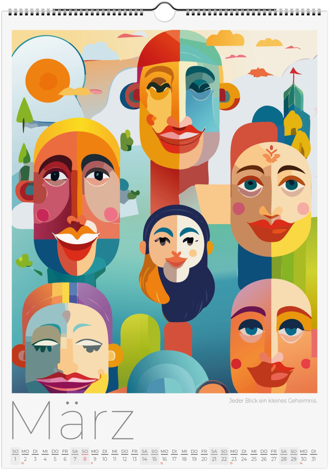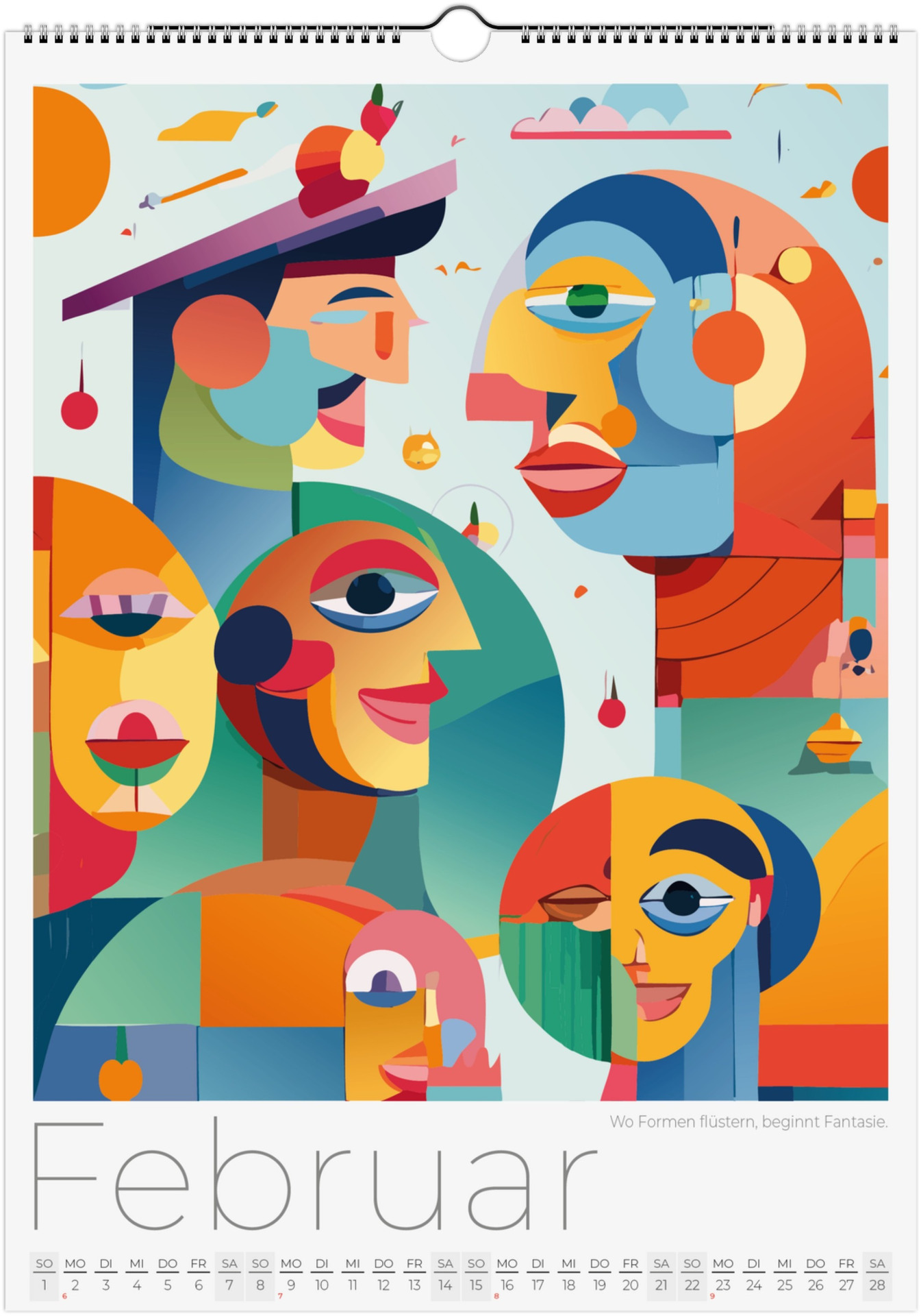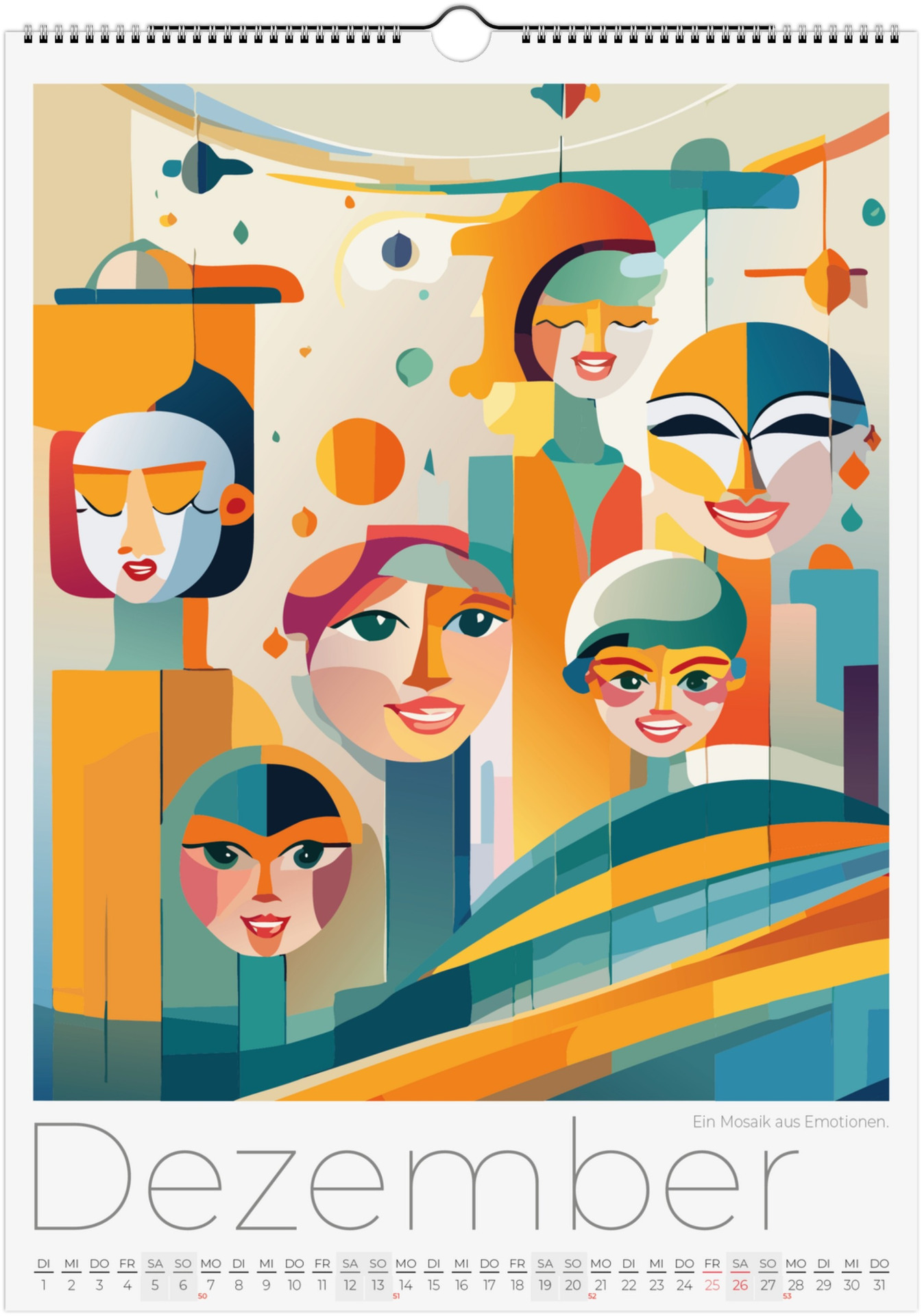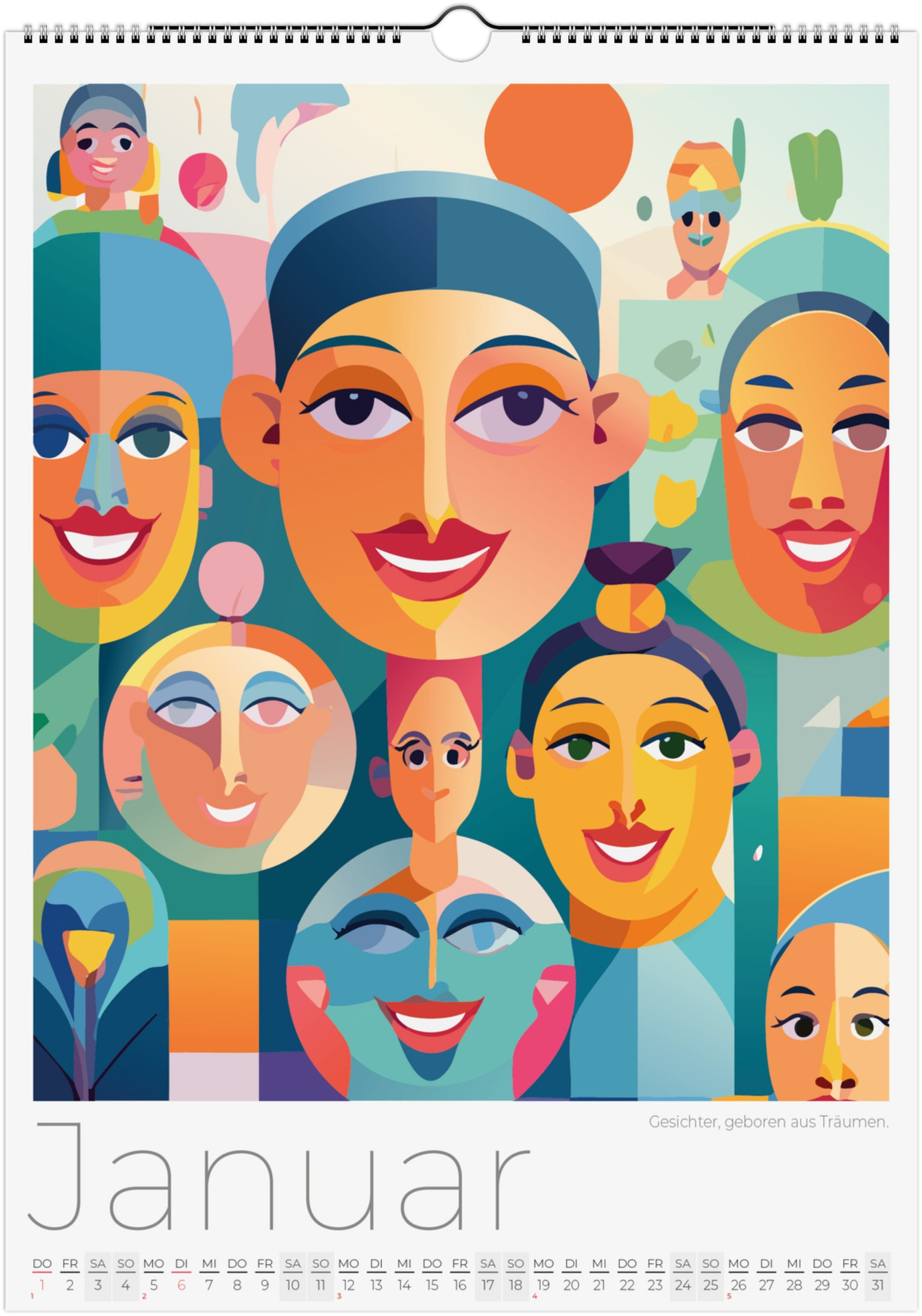 12 Monate abstarkte, bunte Gesichter voller Fantasie, Ausdruck und Farben. Jedes Monatsblatt zeigt ein neues Kunstwerk, das Emotionen, Surrealismus und kreative Vielfalt miteinander verbindet.