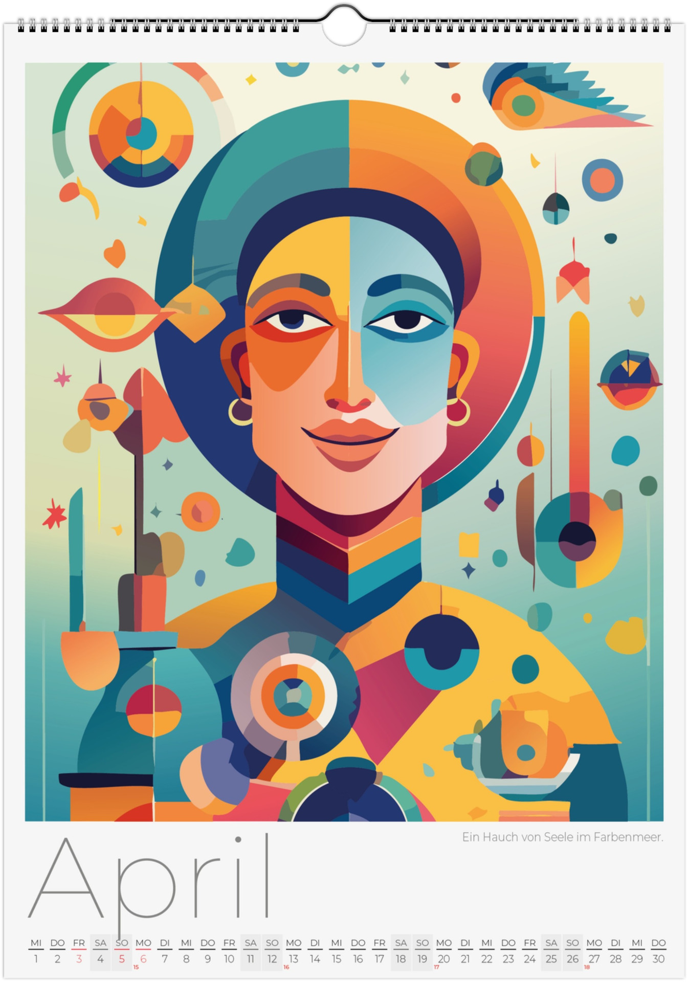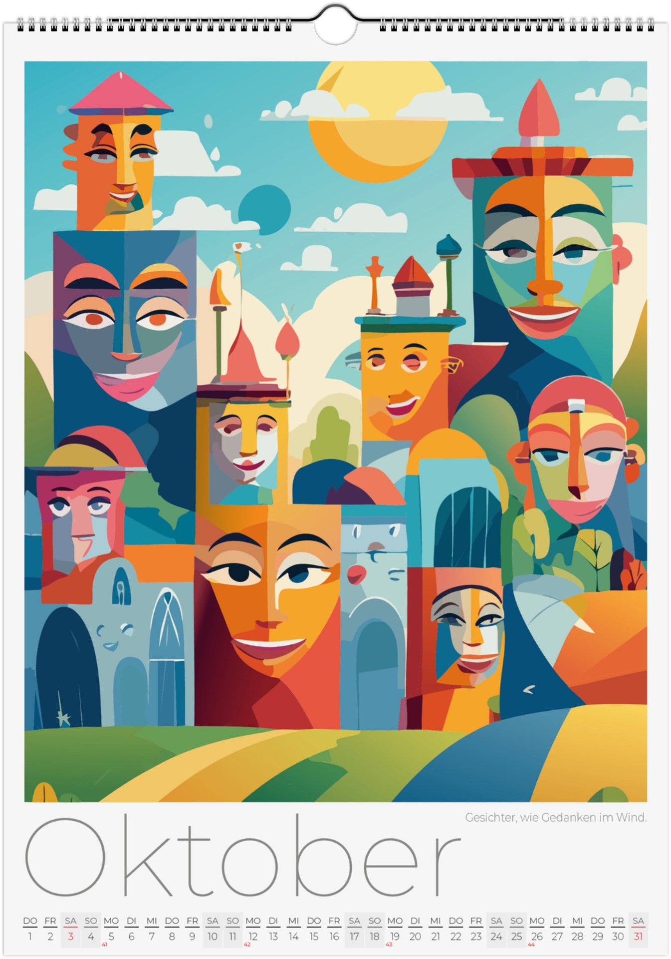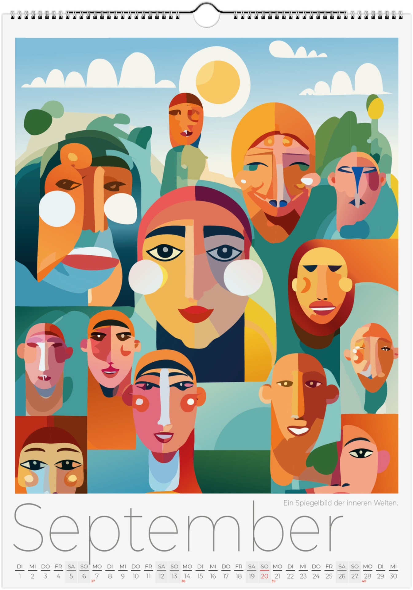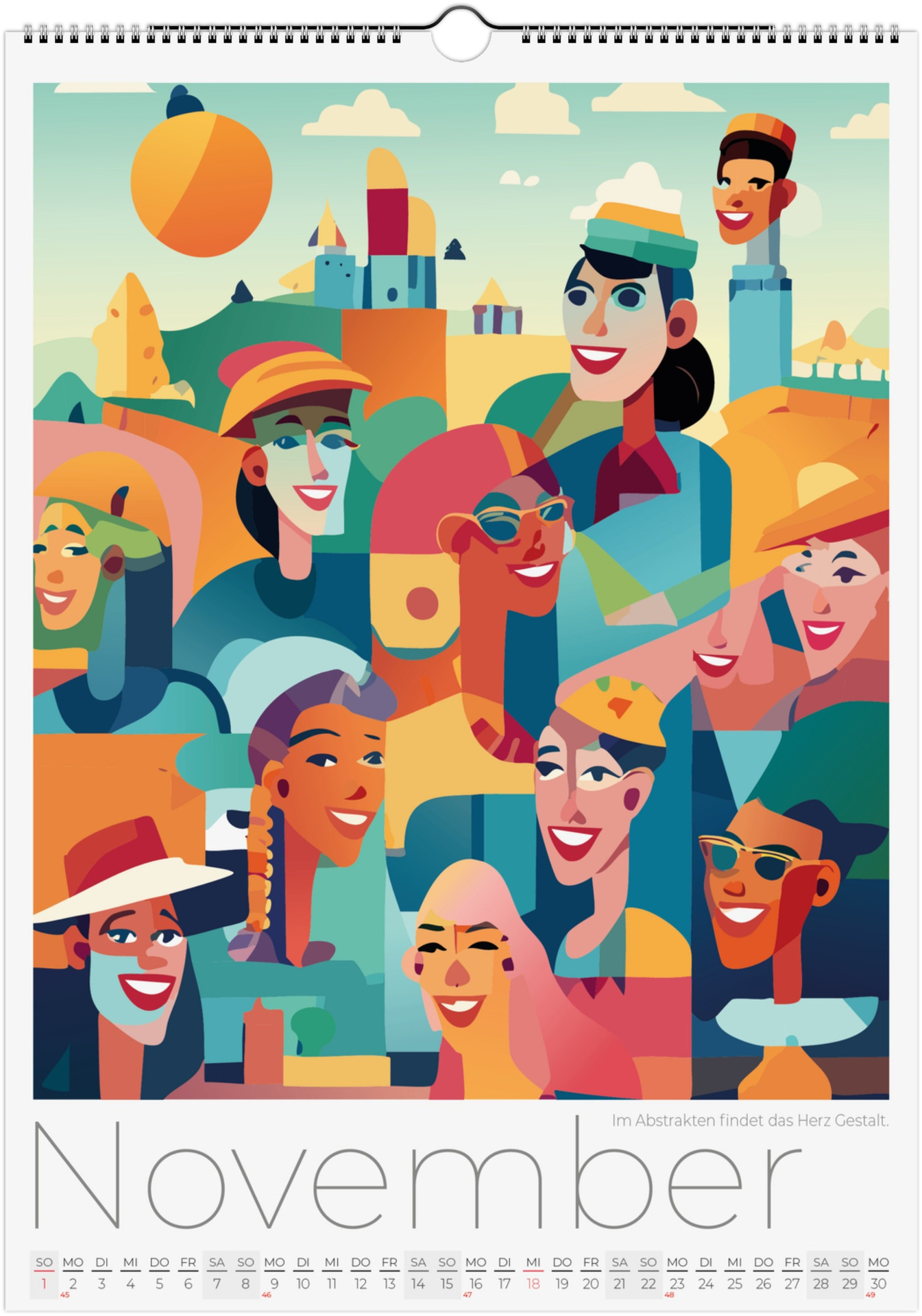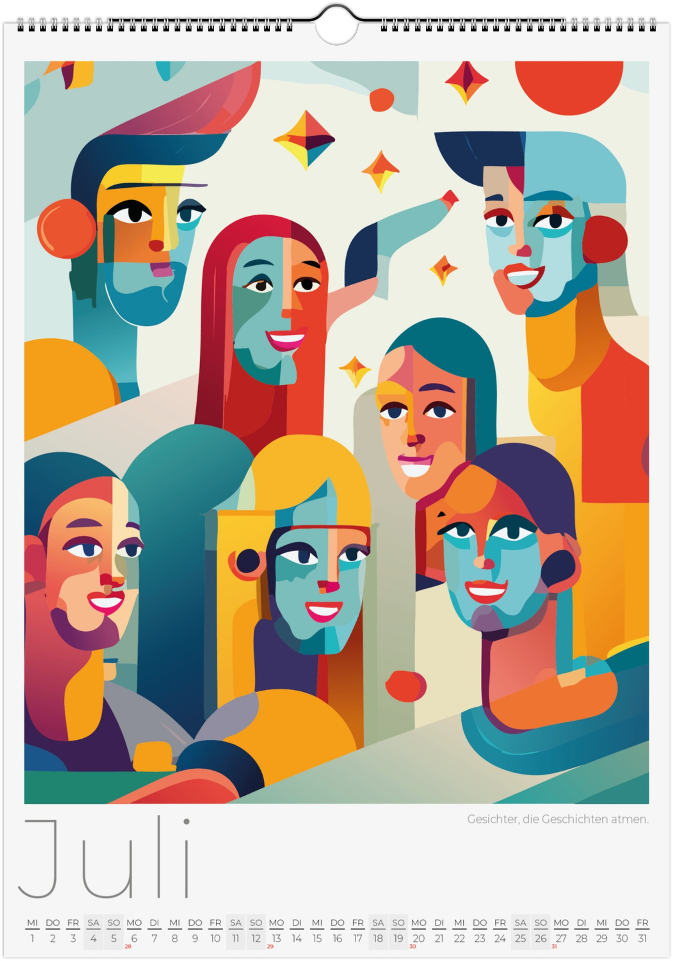 12 Monate abstarkte, bunte Gesichter voller Fantasie, Ausdruck und Farben. Jedes Monatsblatt zeigt ein neues Kunstwerk, das Emotionen, Surrealismus und kreative Vielfalt miteinander verbindet.