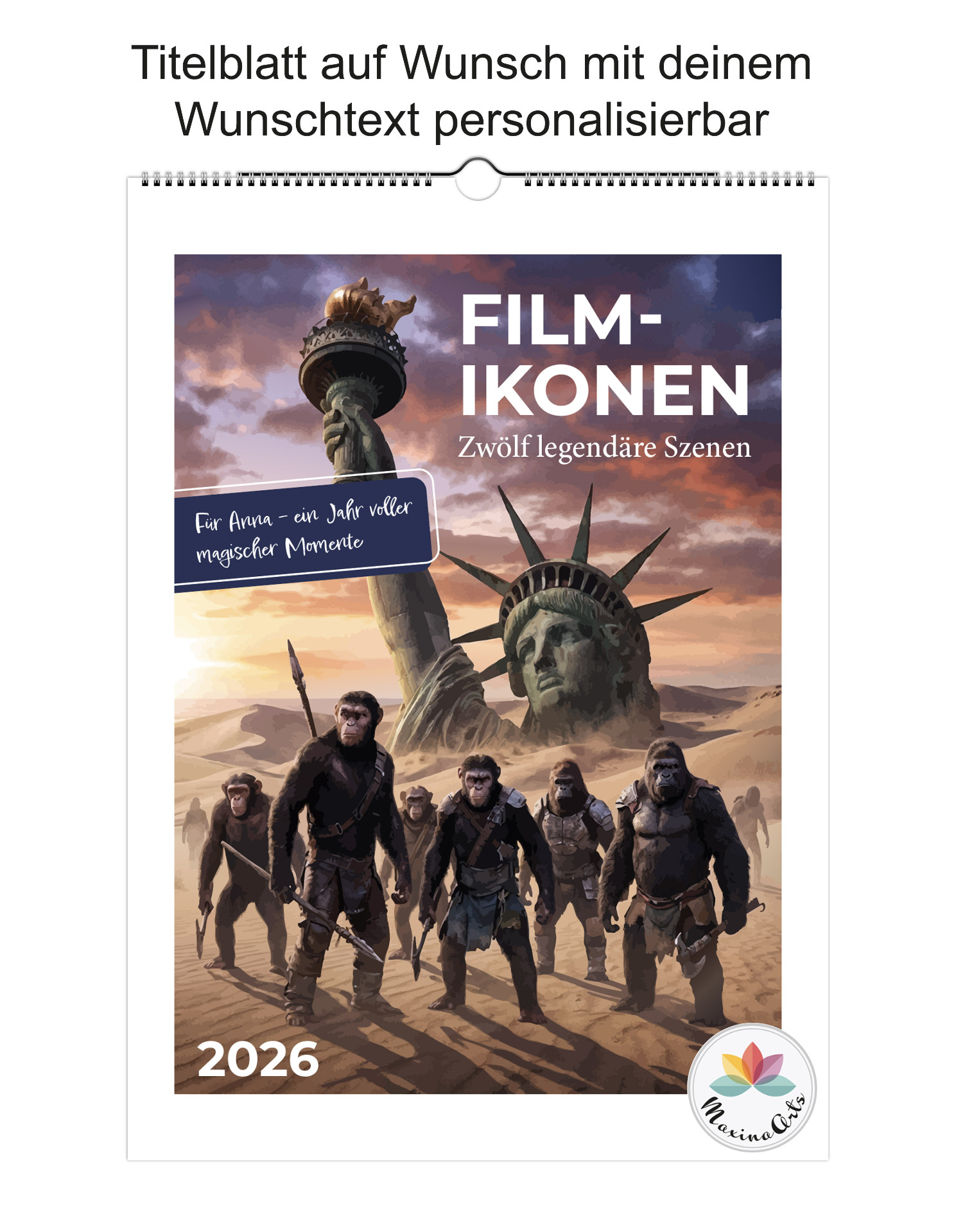 Der Film-Ikonen-Kalender 2026 zeigt 12 poetische und detailreiche Illustrationen, inspiriert von ikonischen Momenten der Filmgeschichte – gestaltet im Stil klassischer Kino-Poster.