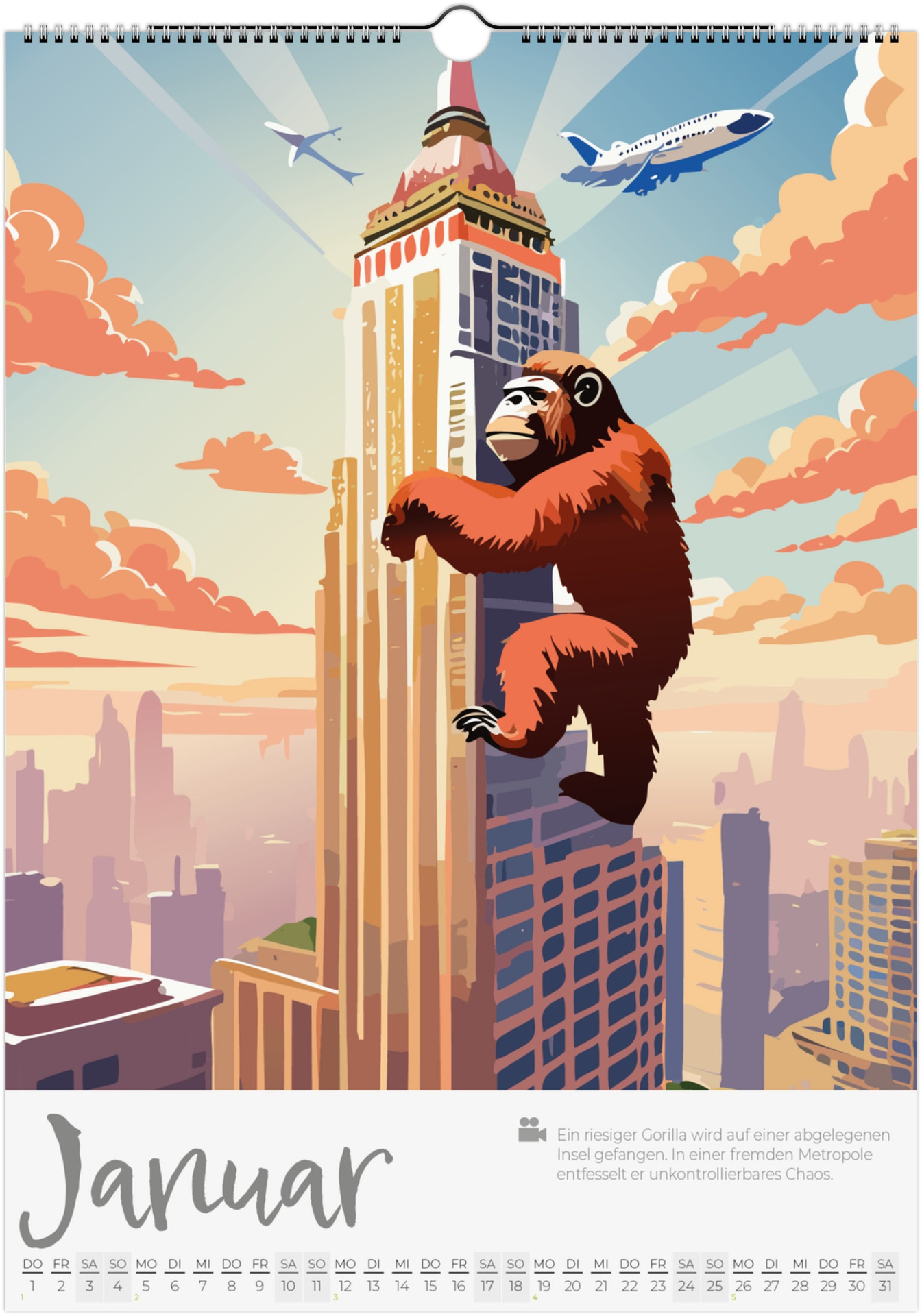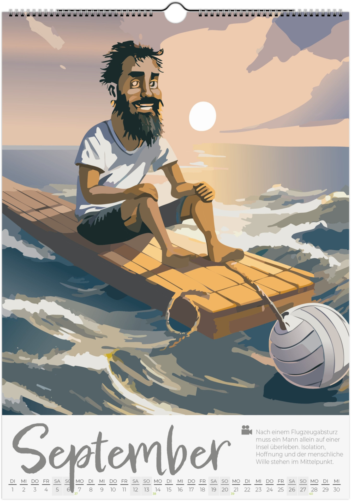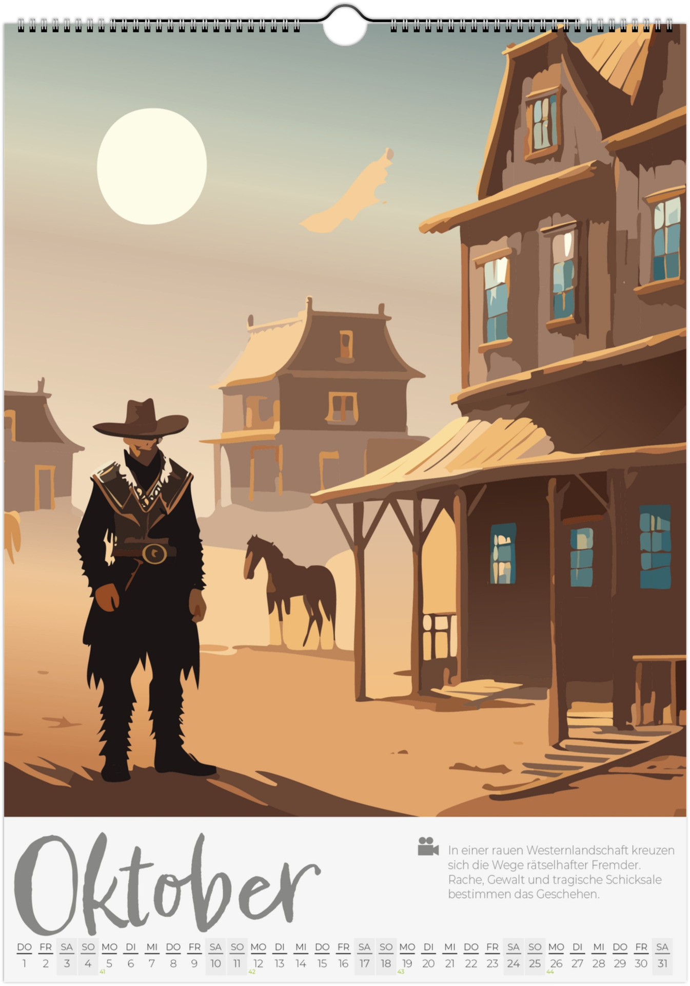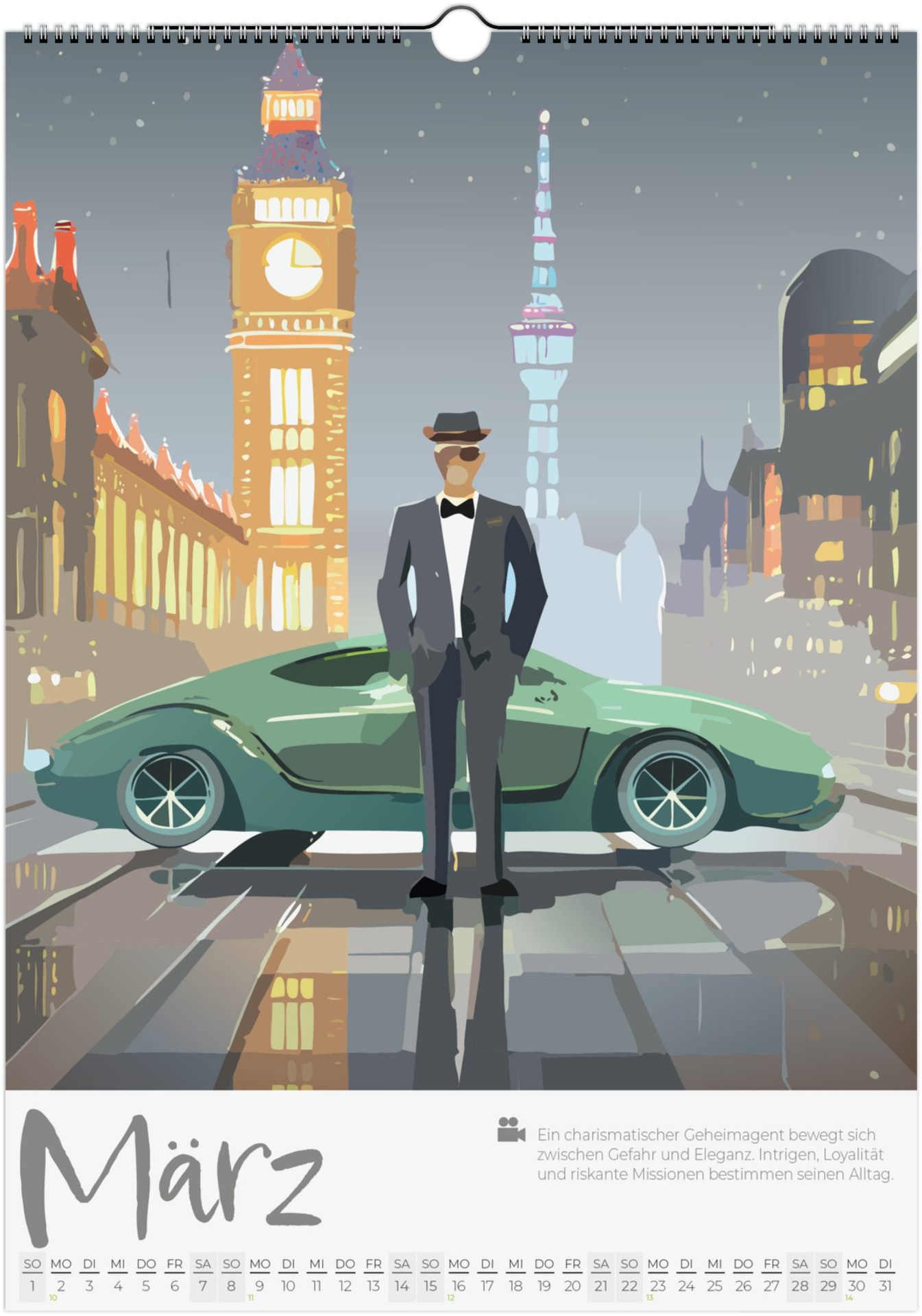 Der Film-Legenden-Kalender 2026 zeigt 12 detailreiche Illustrationen, inspiriert von der Geschichte des Kinos – im Stil klassischer Filmplakate.