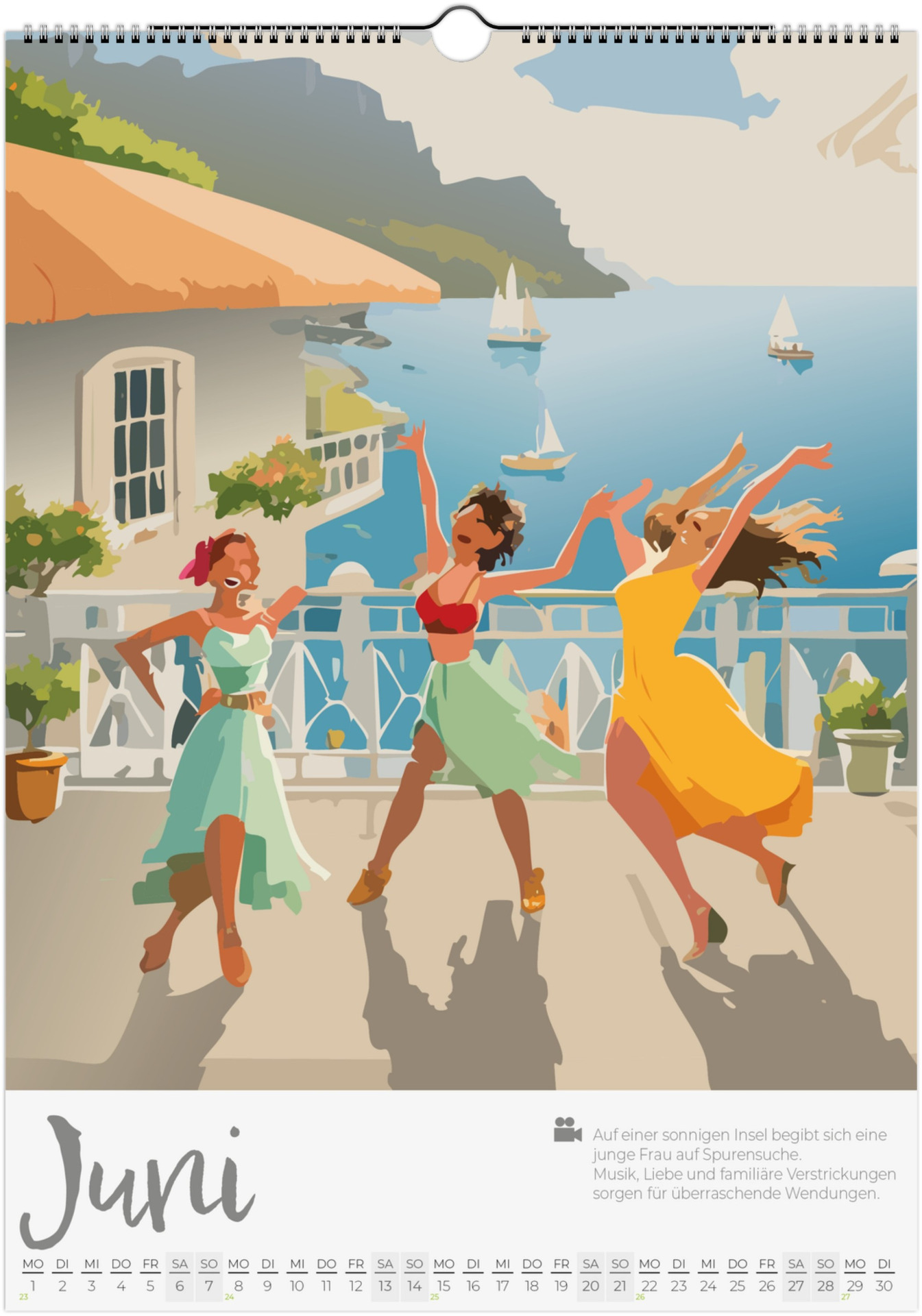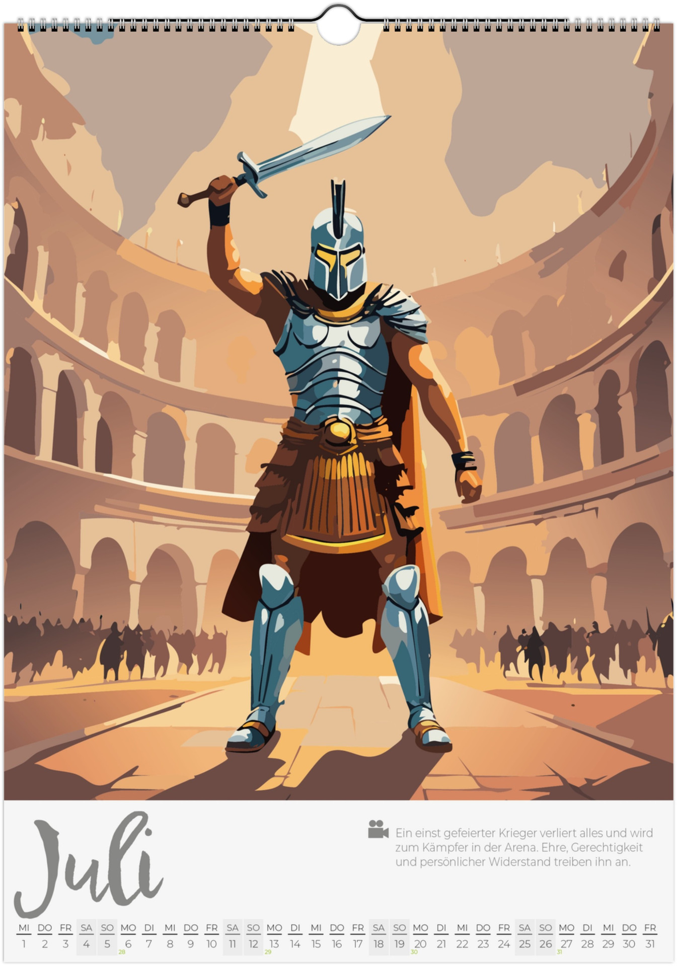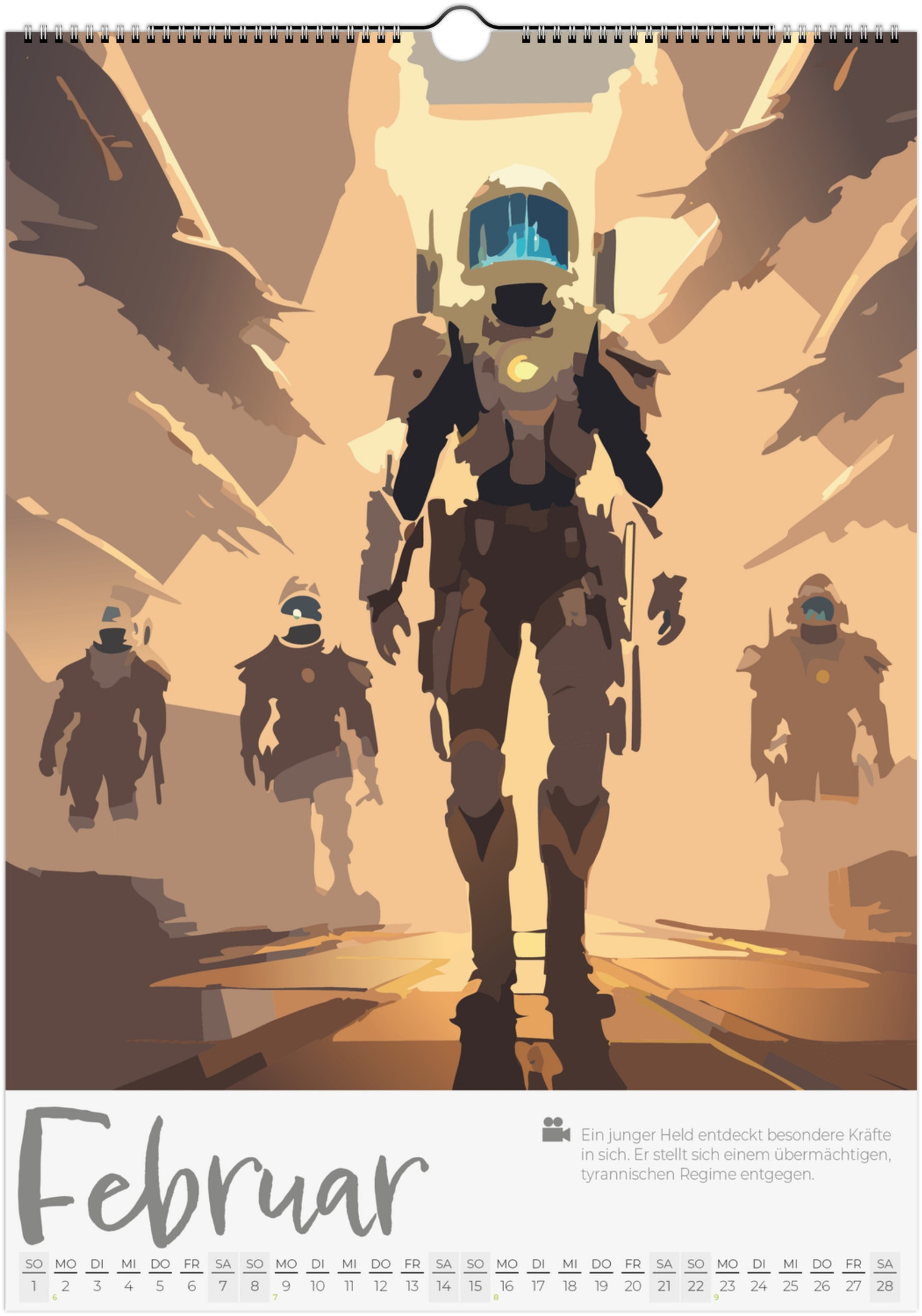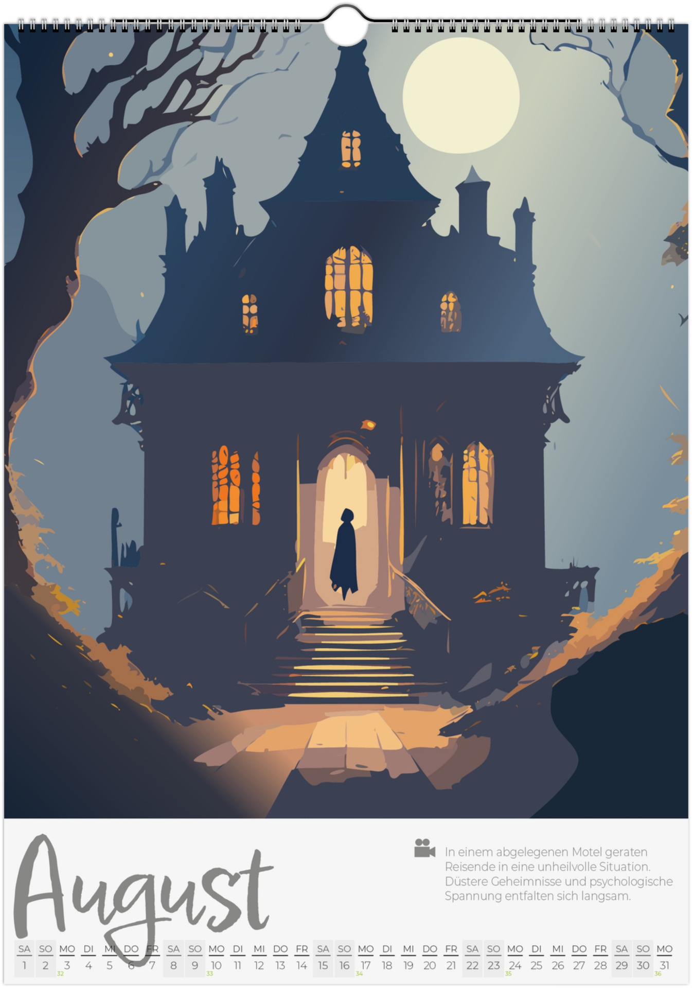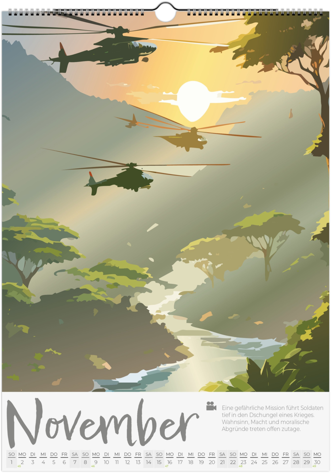Der Film-Legenden-Kalender 2026 zeigt 12 detailreiche Illustrationen, inspiriert von der Geschichte des Kinos – im Stil klassischer Filmplakate.