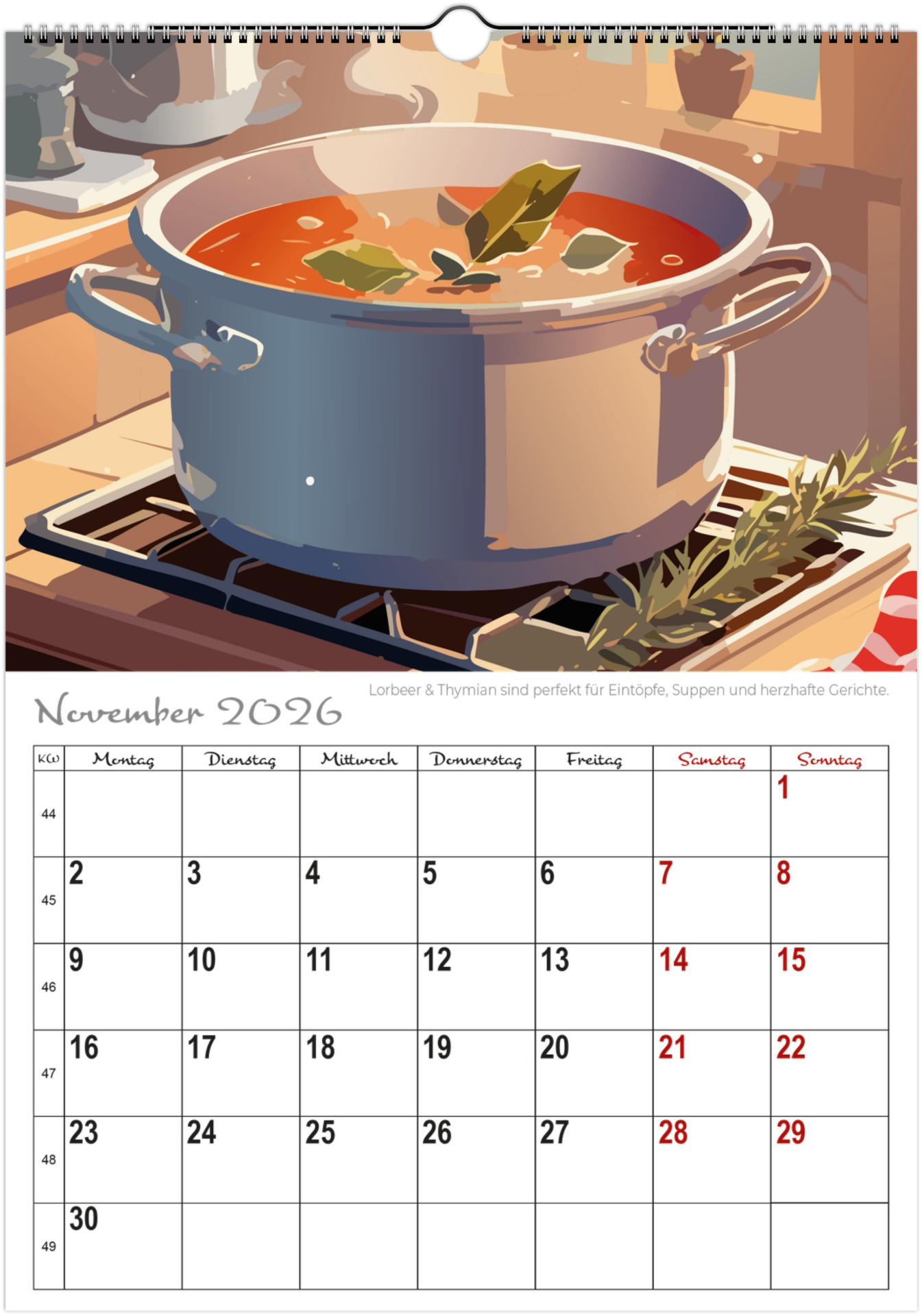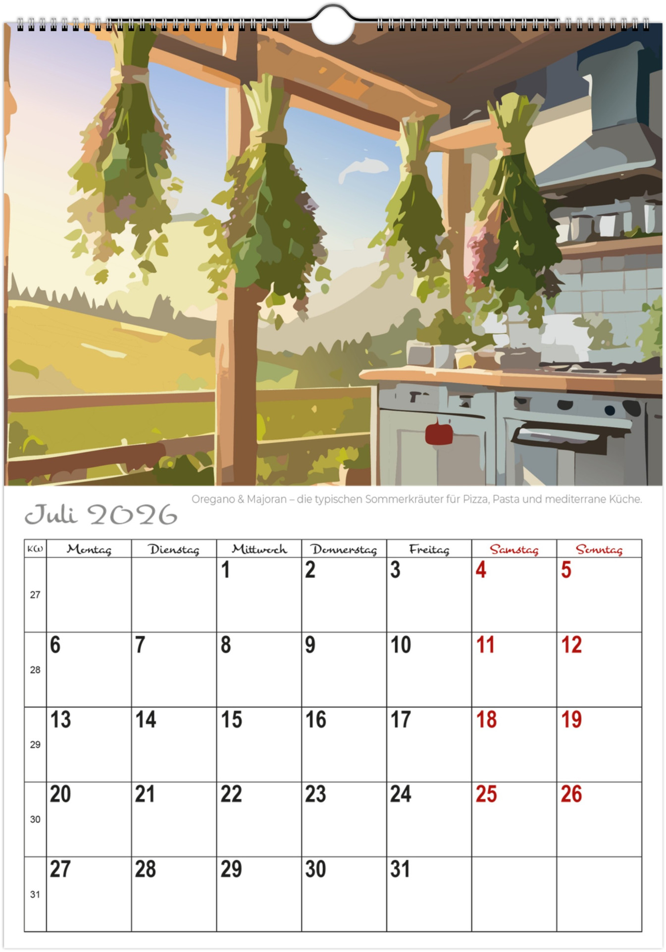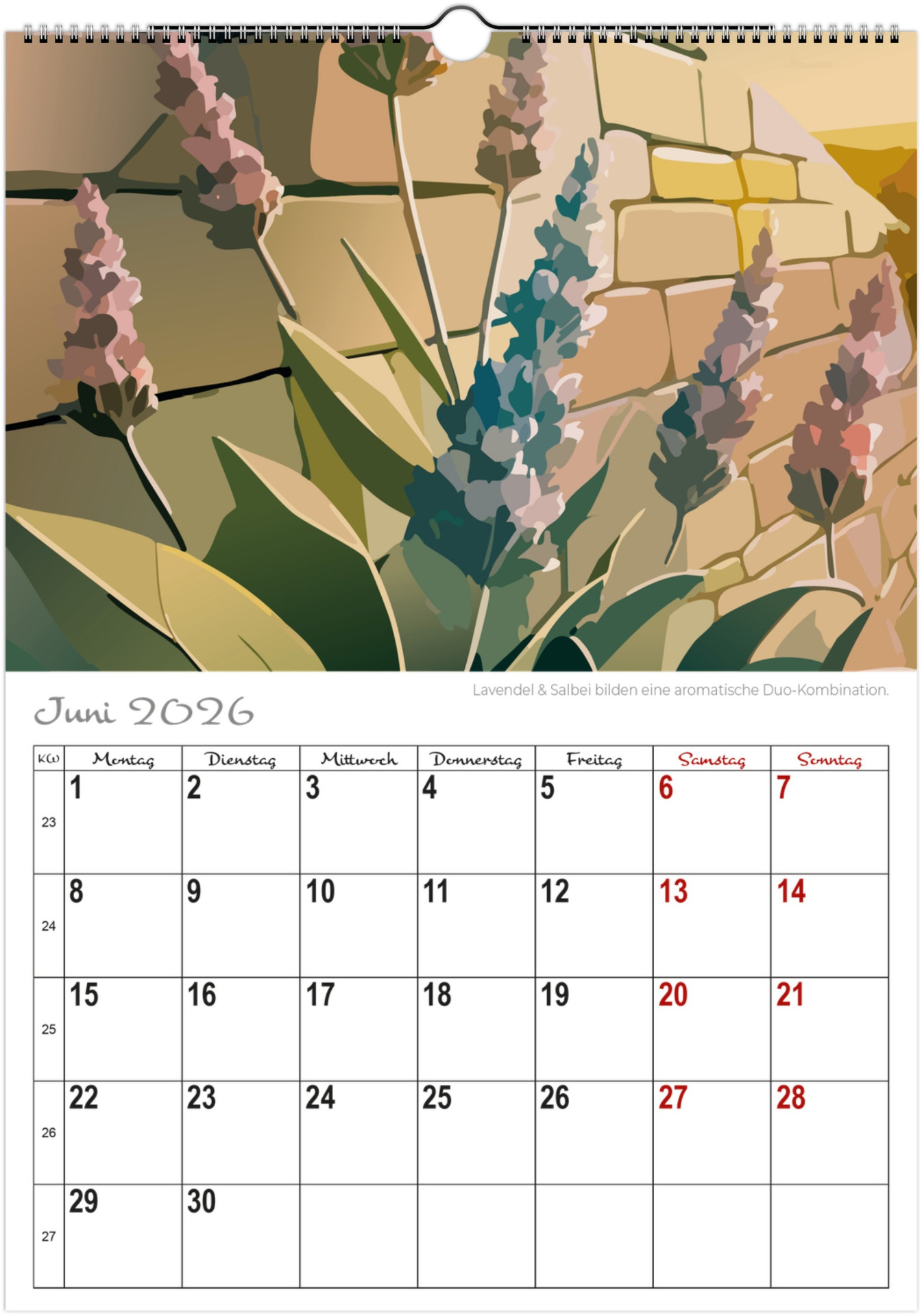 Jeder Monat zeigt liebevoll illustrierte Kräuter- und Pflanzenmotive und bietet viel Platz für Termine, Geburtstage & Notizen.