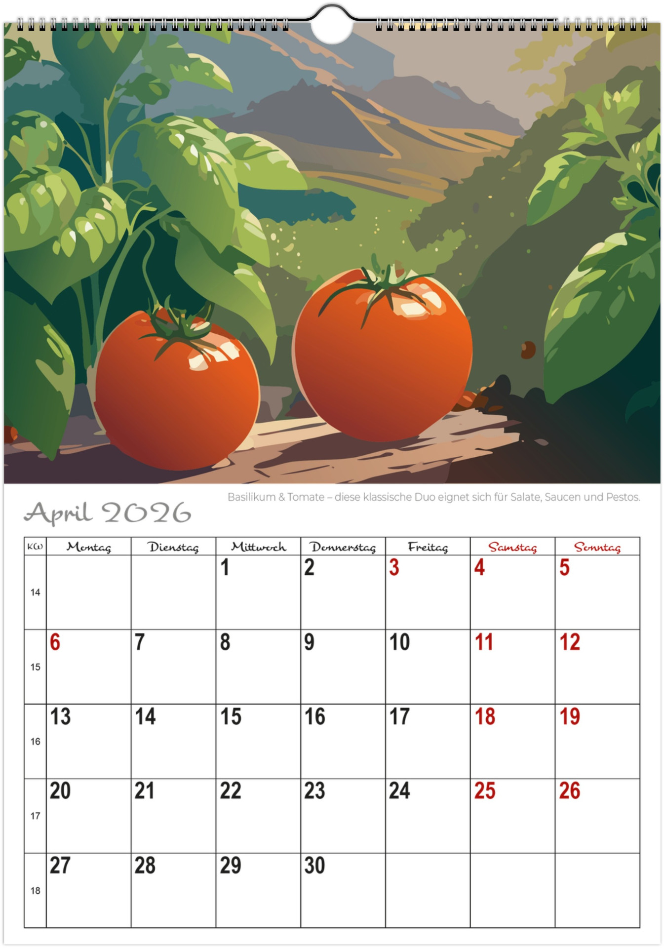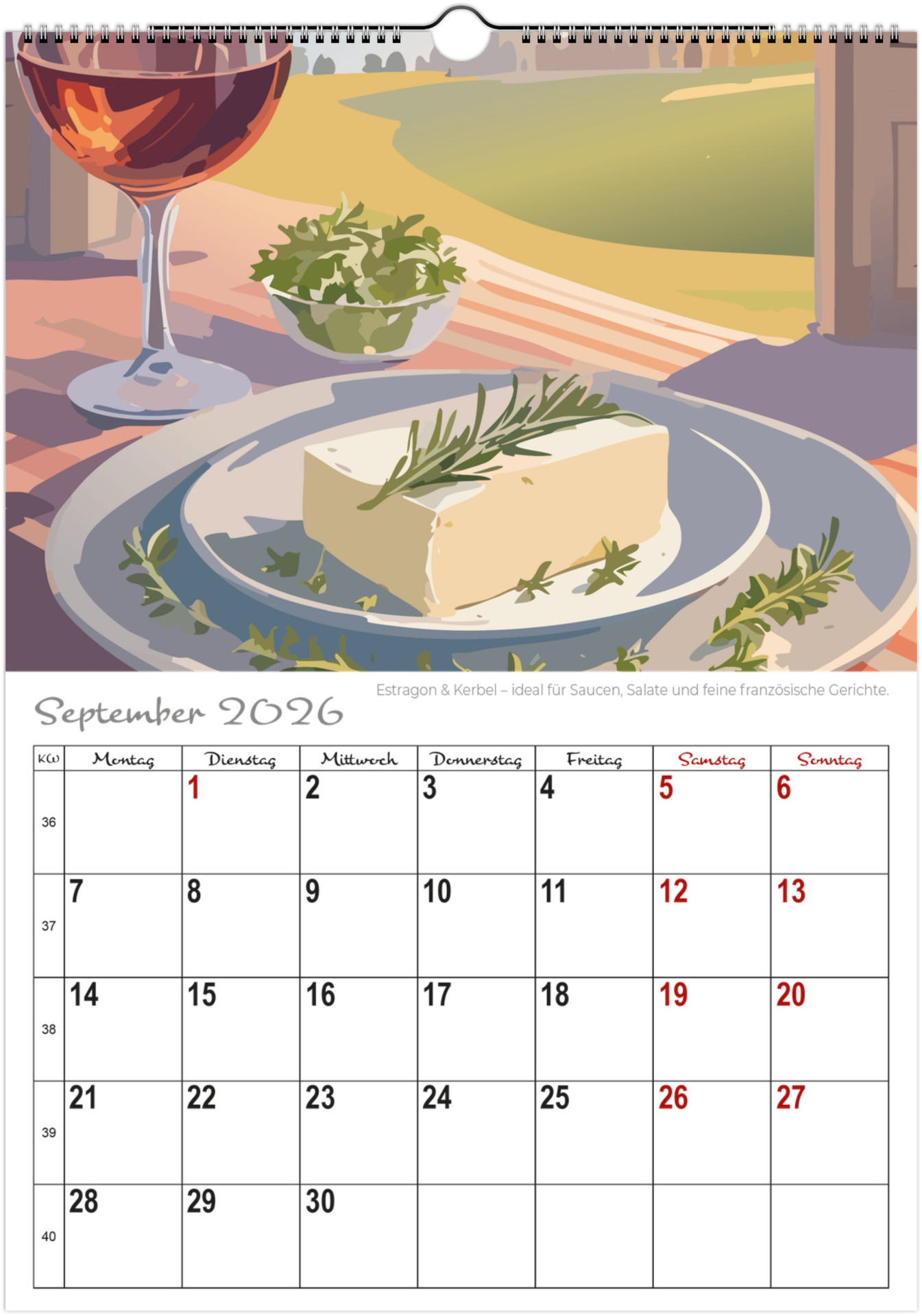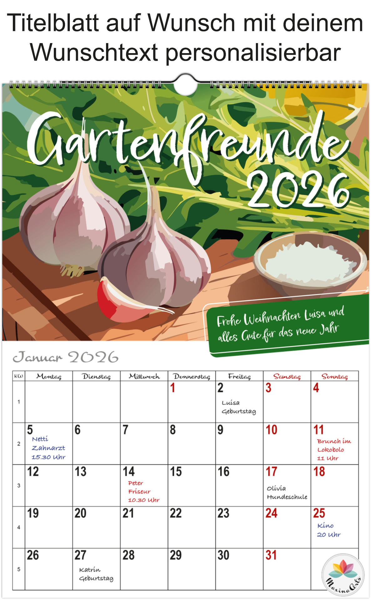 Jeder Monat zeigt liebevoll illustrierte Kräuter- und Pflanzenmotive und bietet viel Platz für Termine, Geburtstage & Notizen.