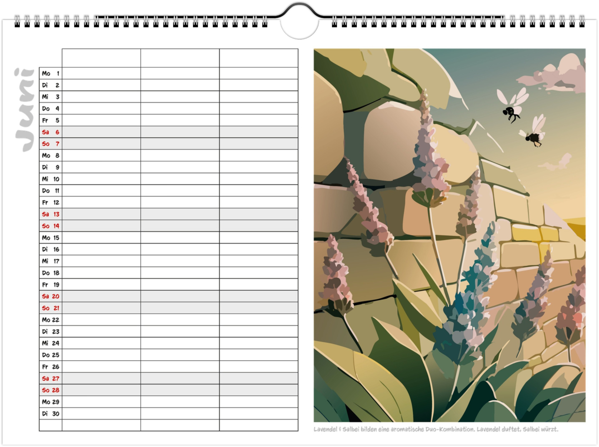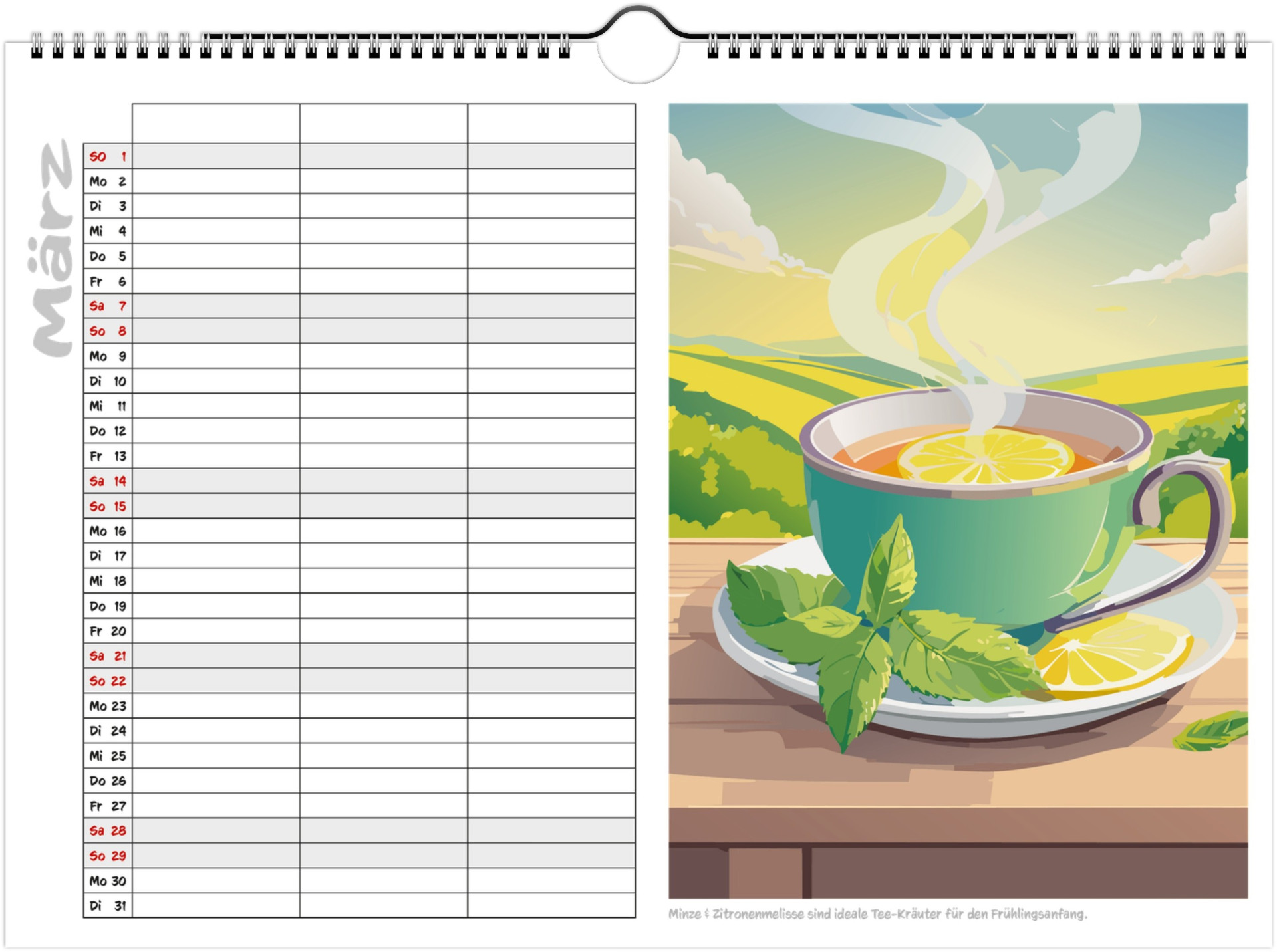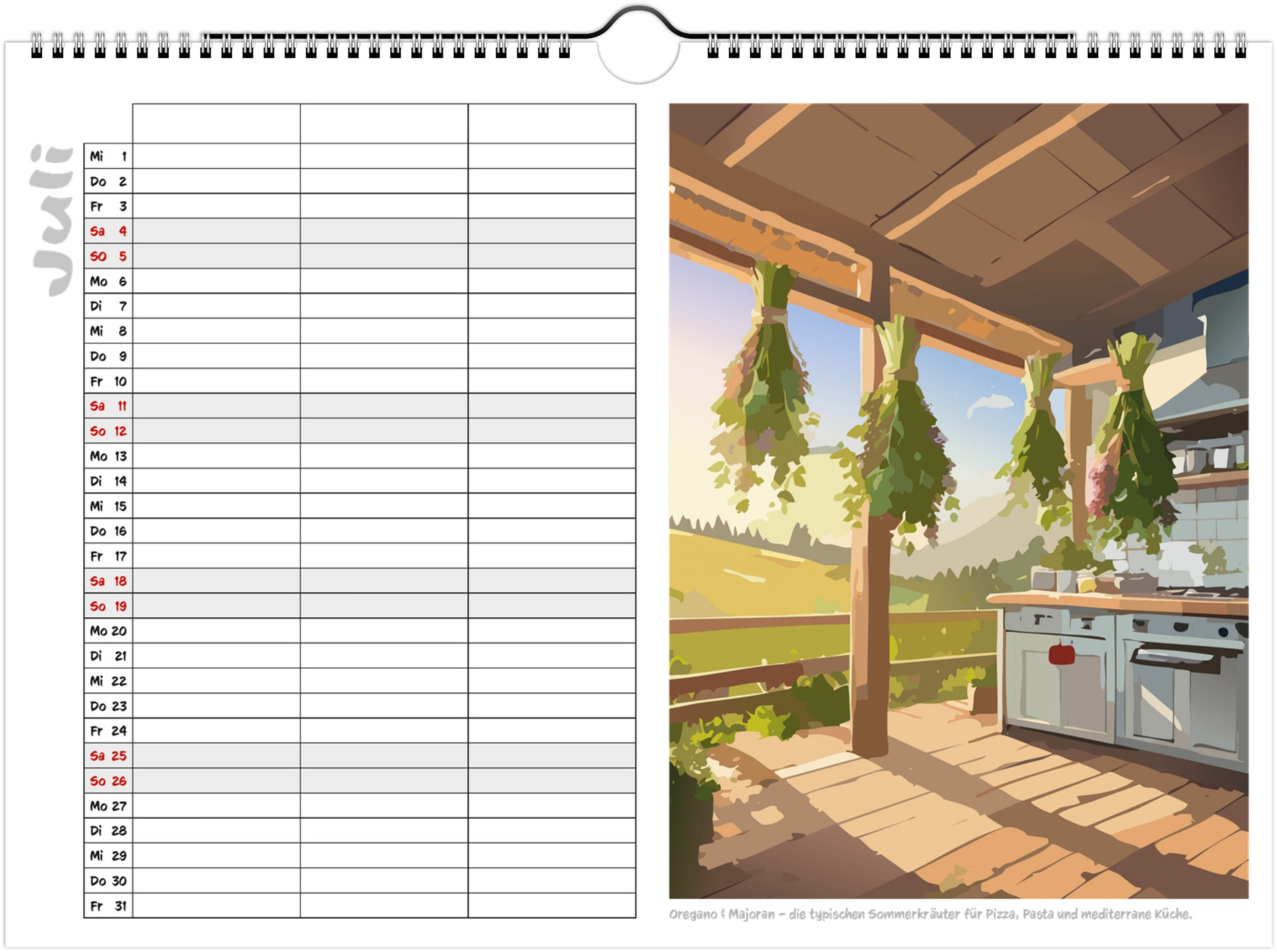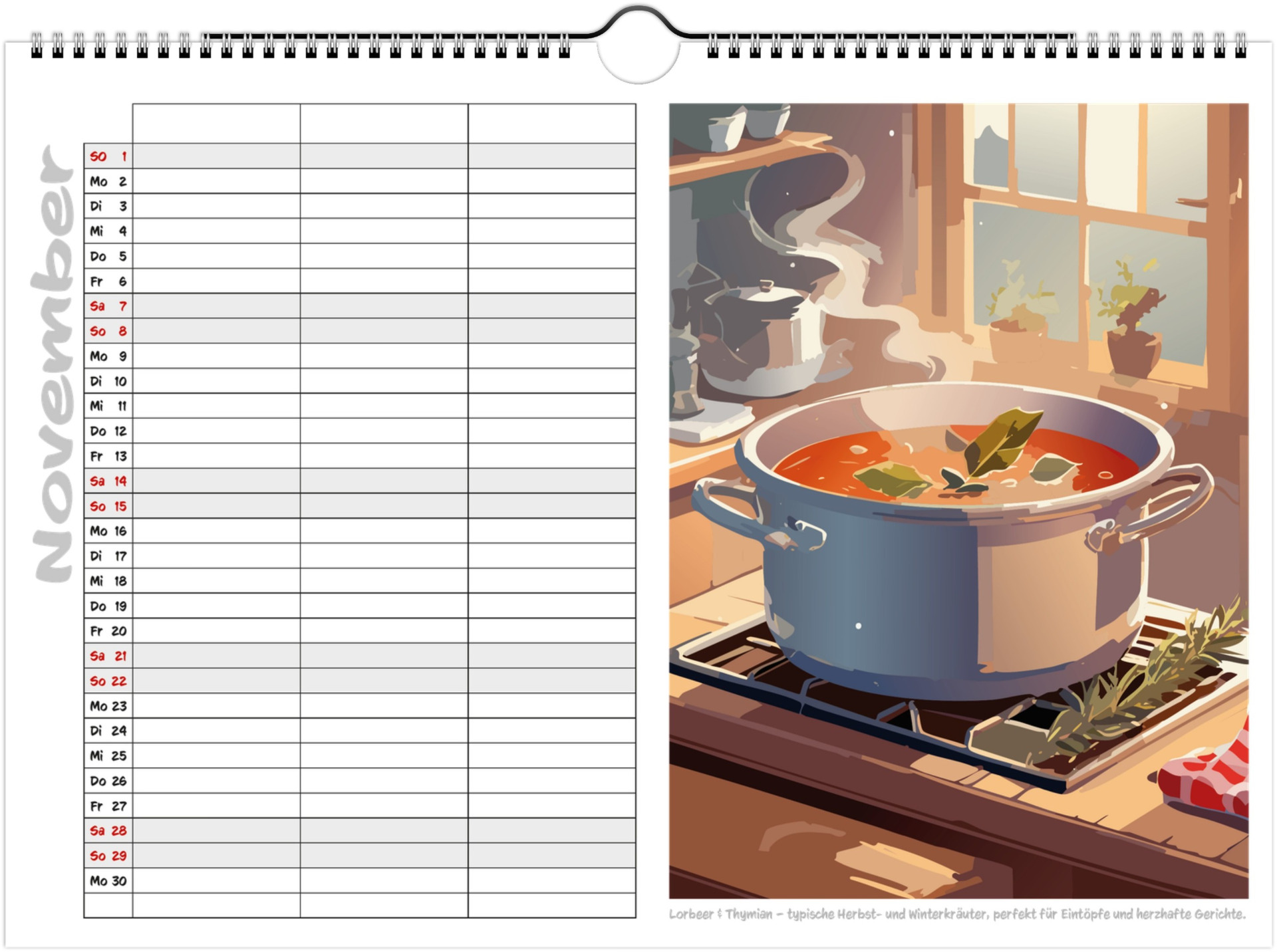 Jeder Monat zeigt liebevoll illustrierte Kräuter- und Pflanzenmotive und bietet viel Platz für Termine, Geburtstage & Notizen.