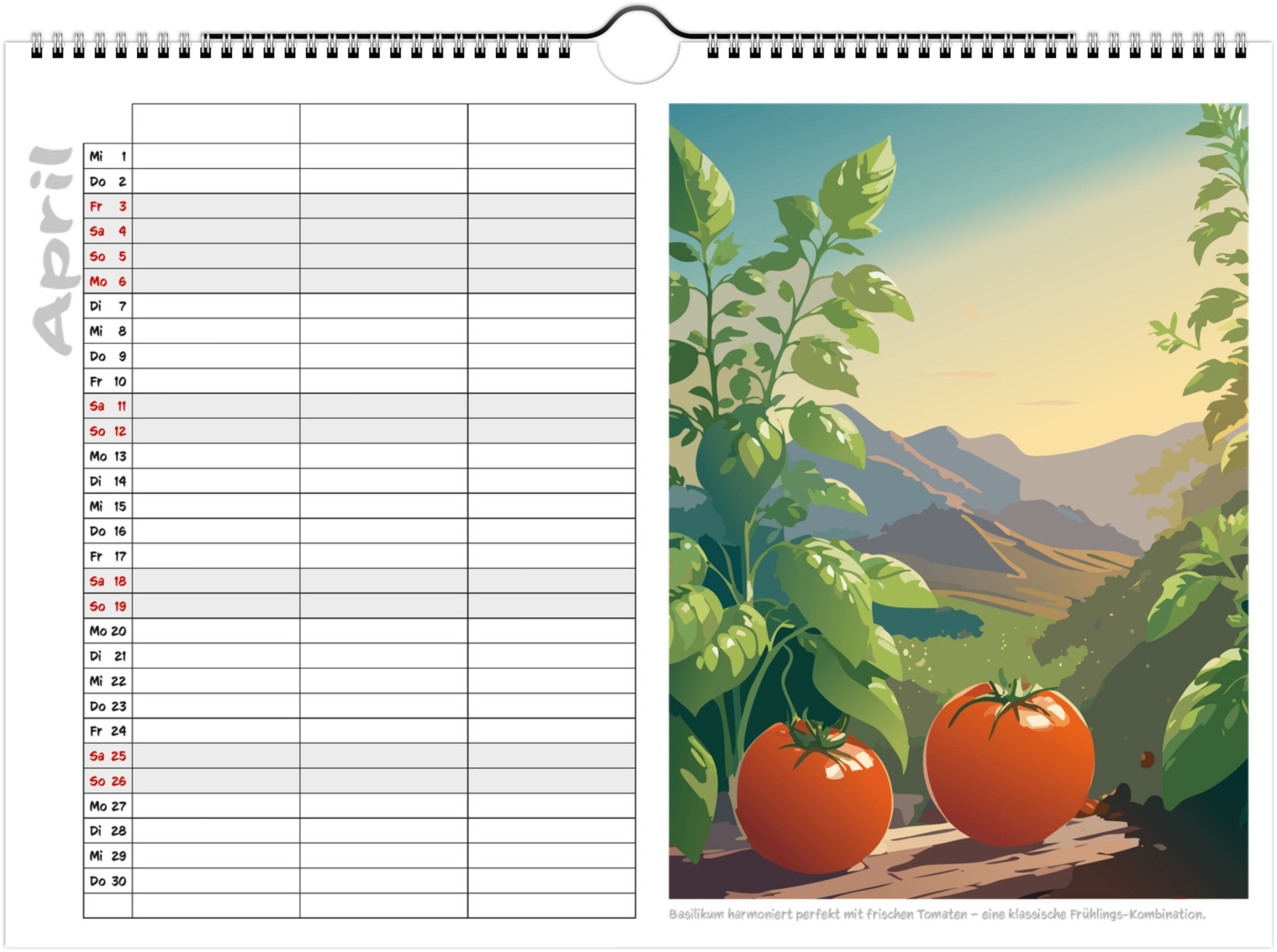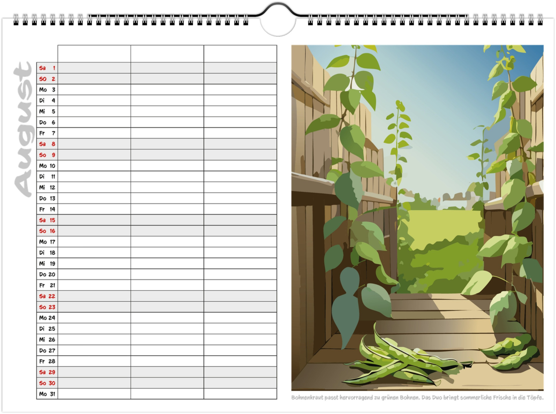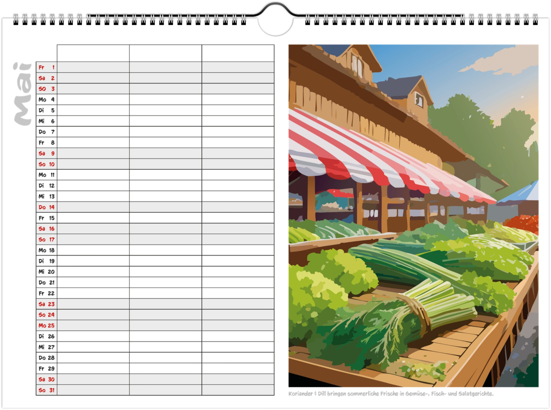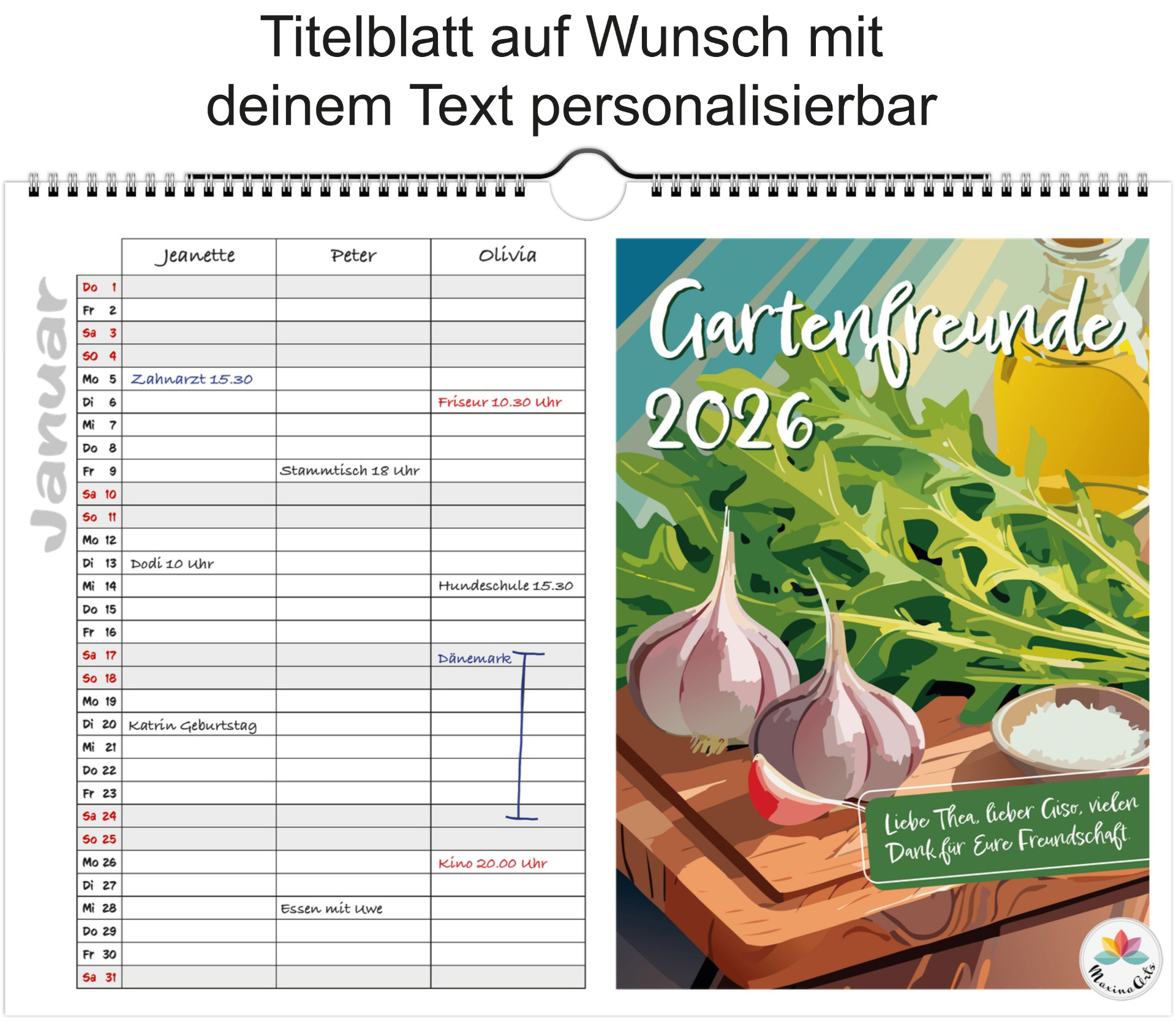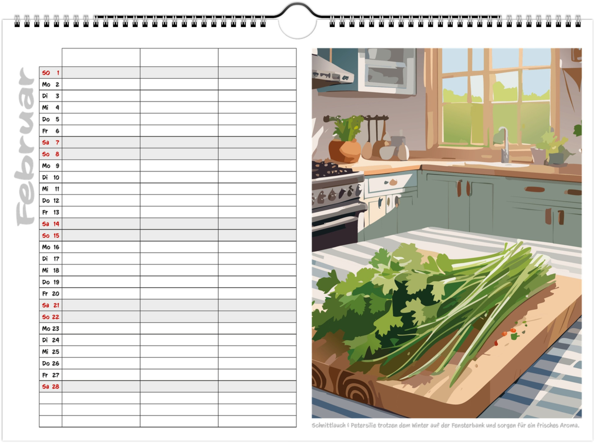Jeder Monat zeigt liebevoll illustrierte Kräuter- und Pflanzenmotive und bietet viel Platz für Termine, Geburtstage & Notizen.