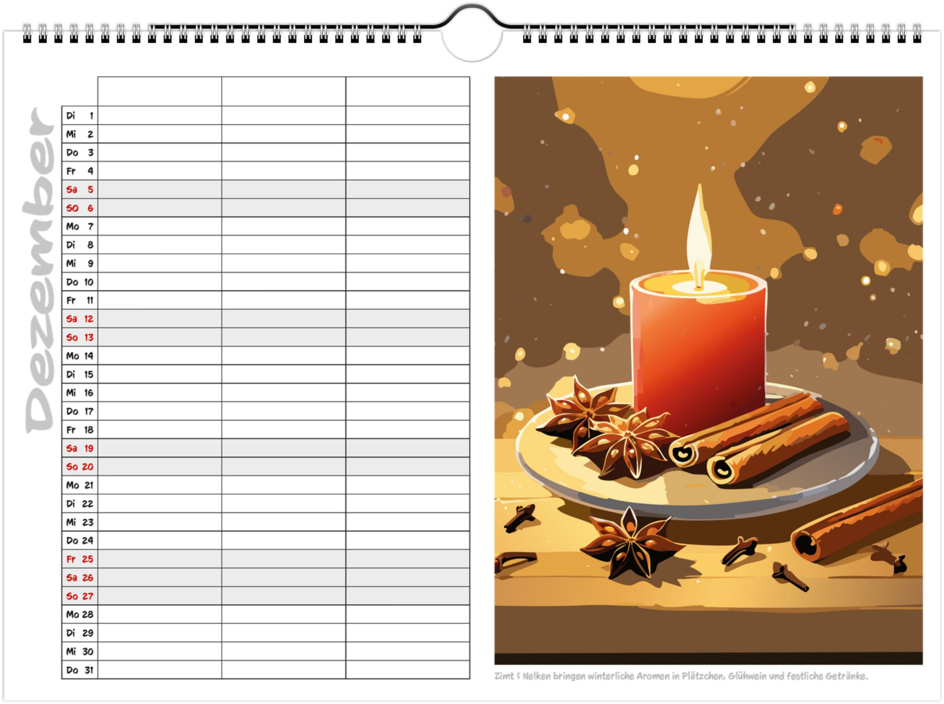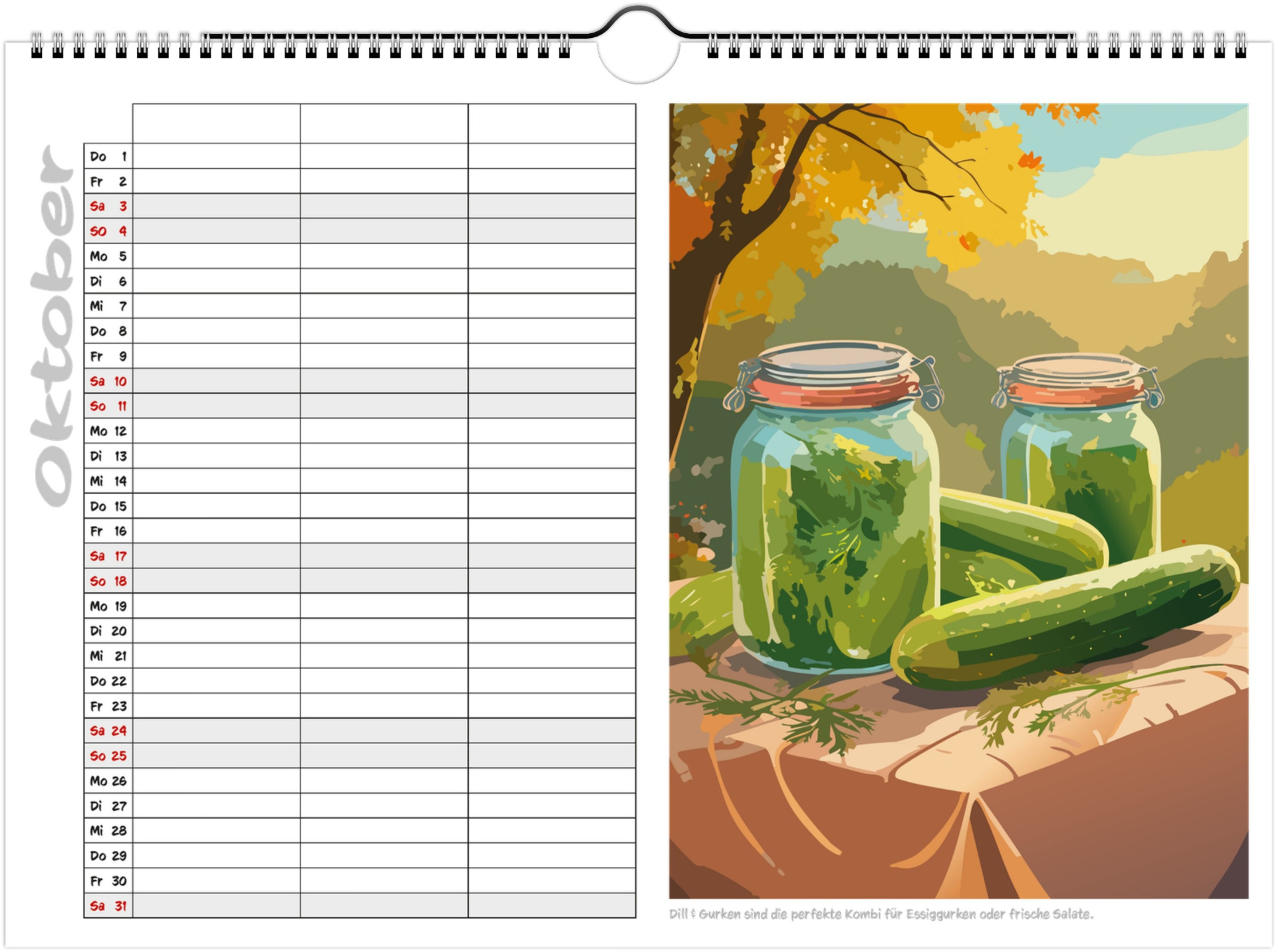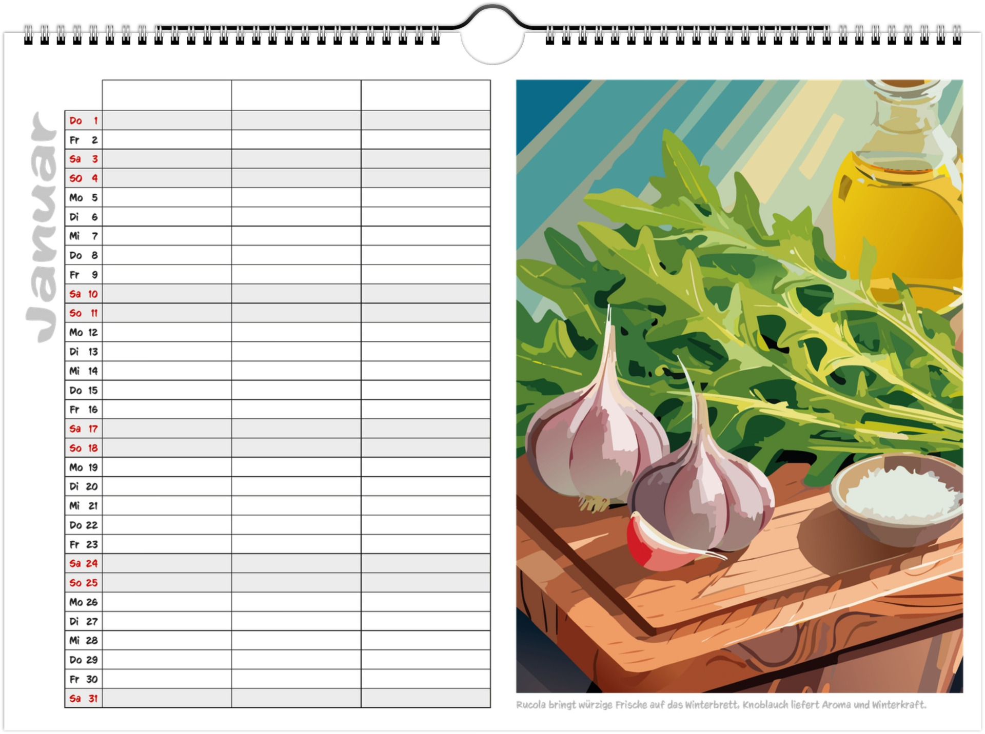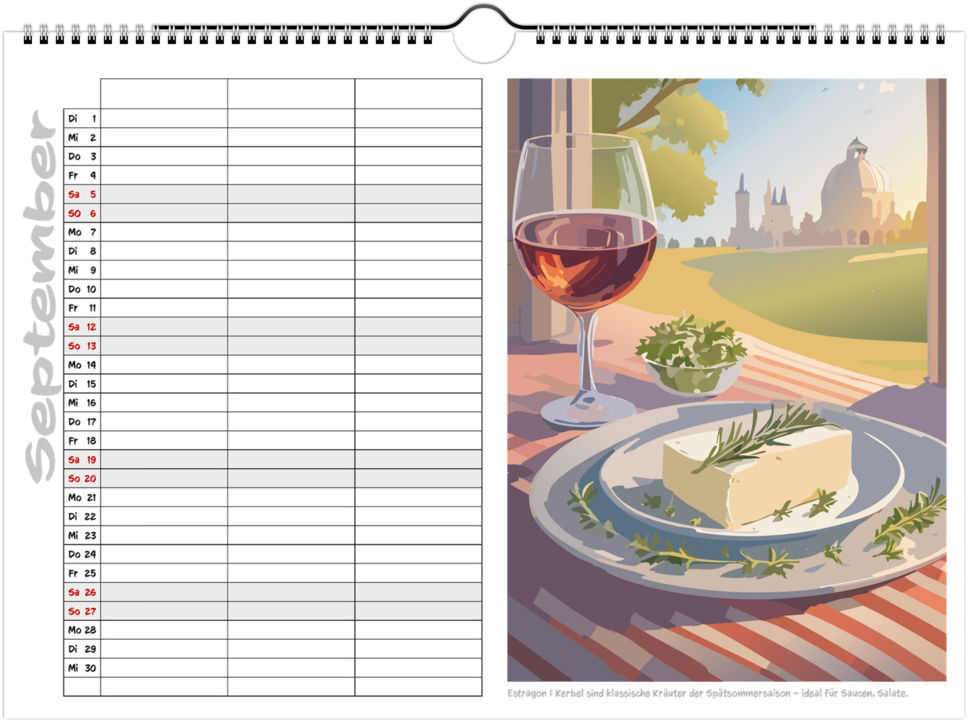 Jeder Monat zeigt liebevoll illustrierte Kräuter- und Pflanzenmotive und bietet viel Platz für Termine, Geburtstage & Notizen.