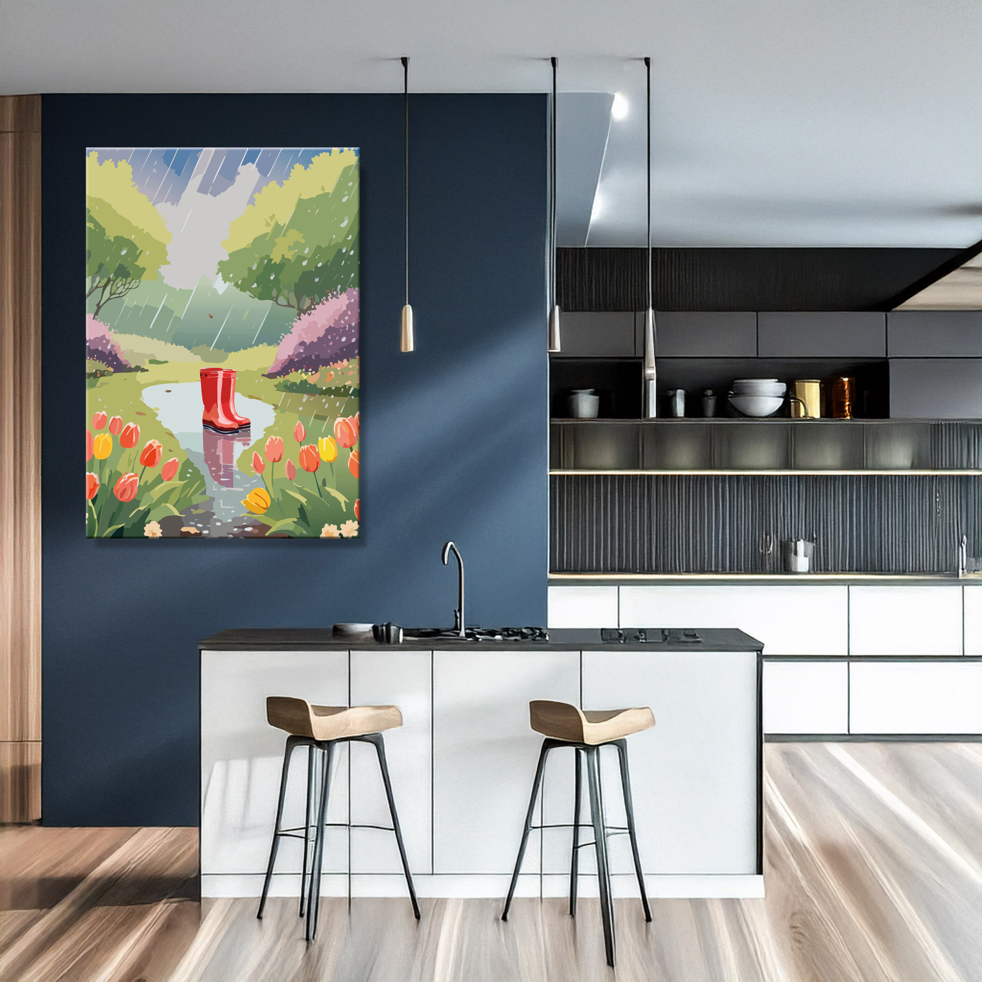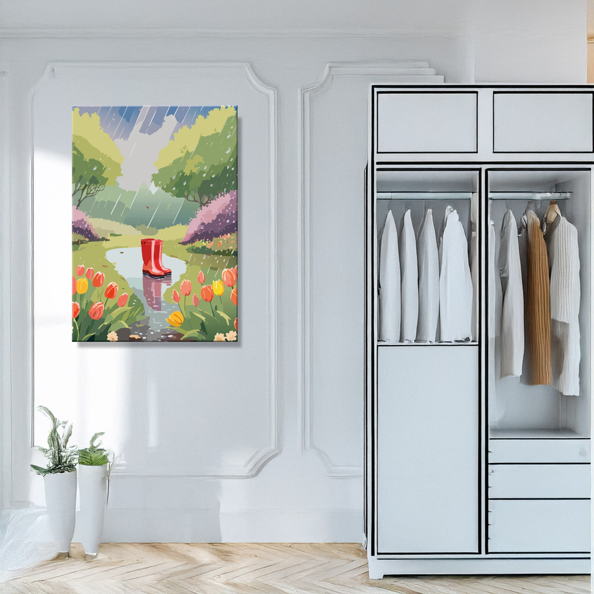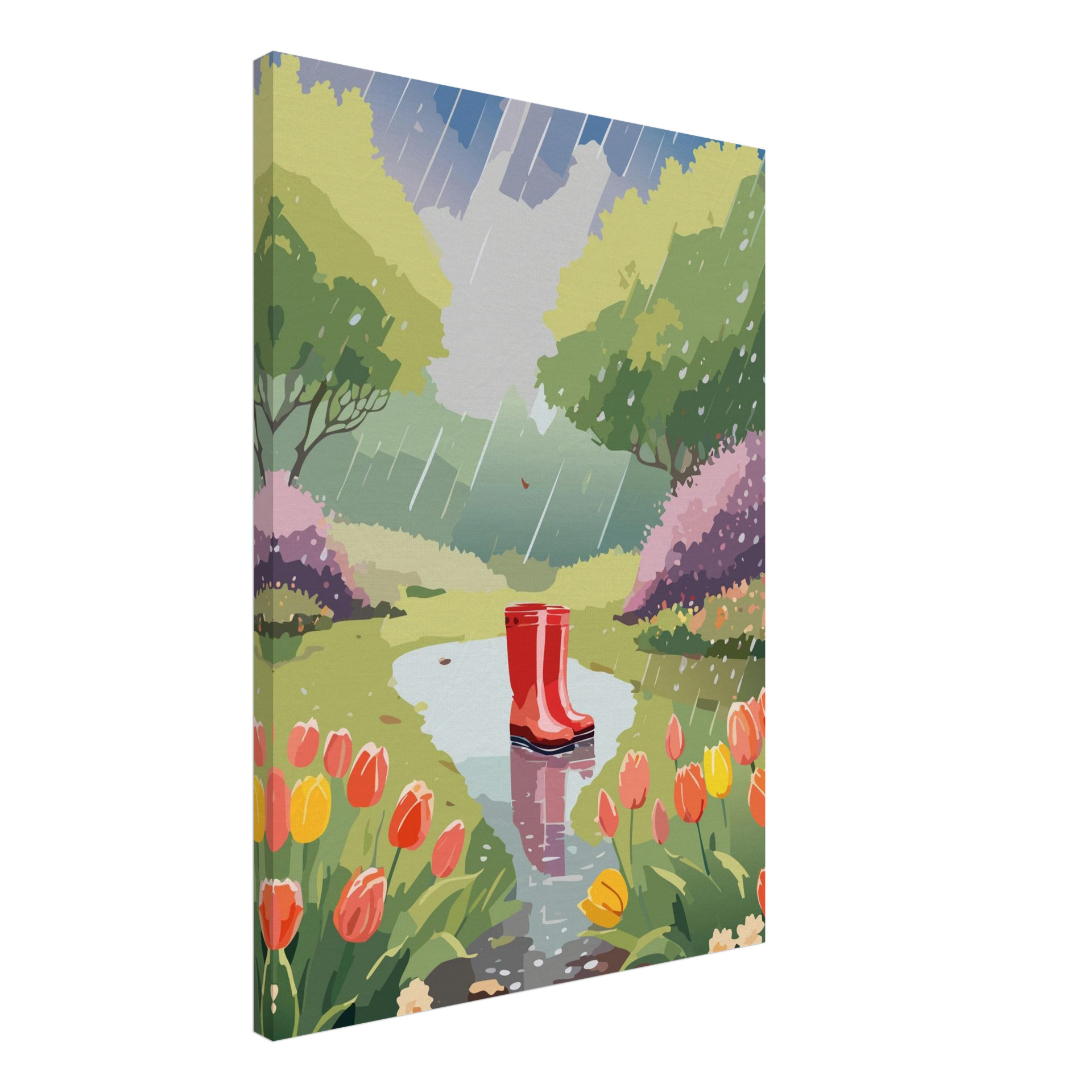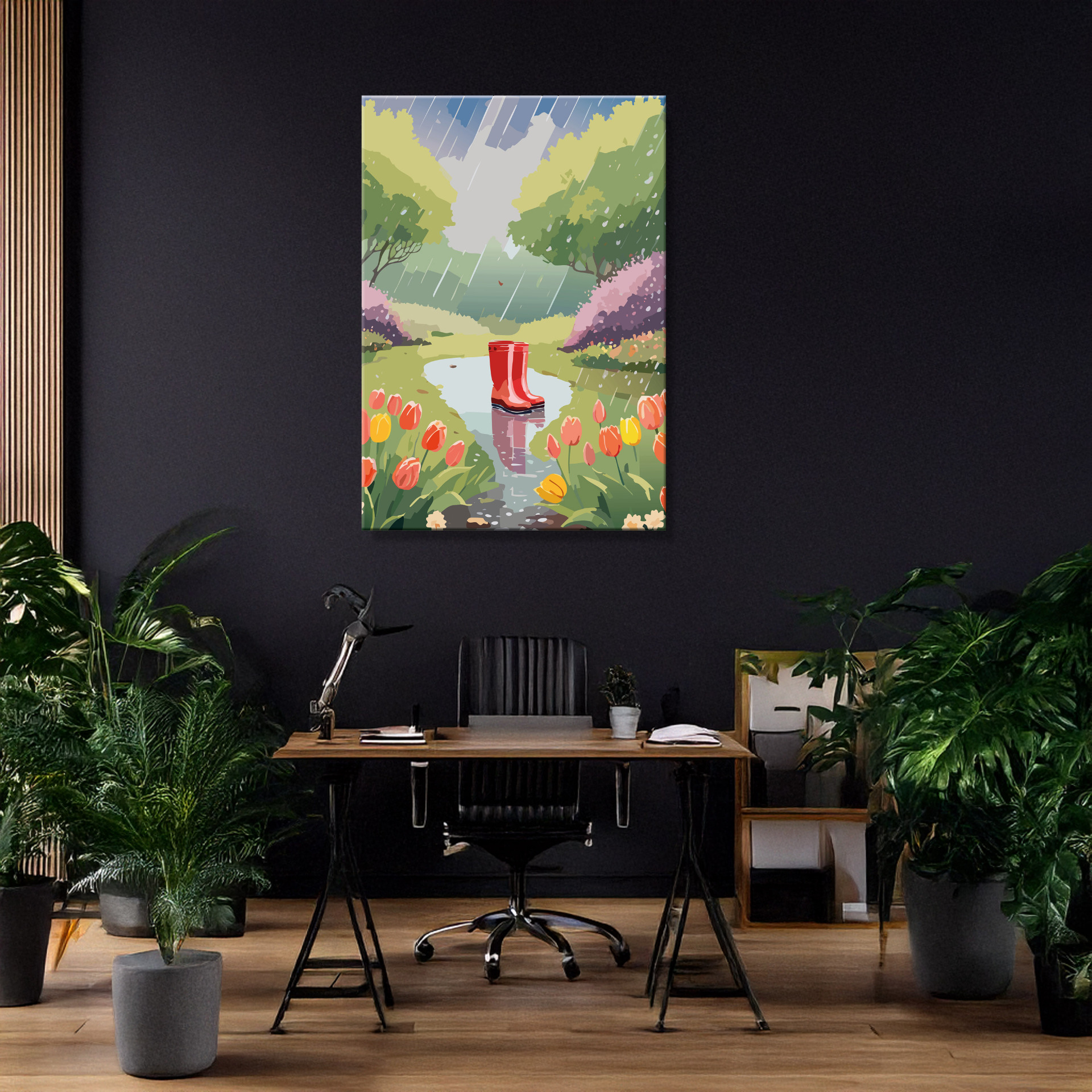 Wenn Gummistiefel durch den sanften Regen springen und Tulpen um sie herum blühen – dieses Werk feiert den Frühling auf charmante Weise. Gedruckt auf hochwertiger Leinwand, in verschiedenen Formaten erhältlich.