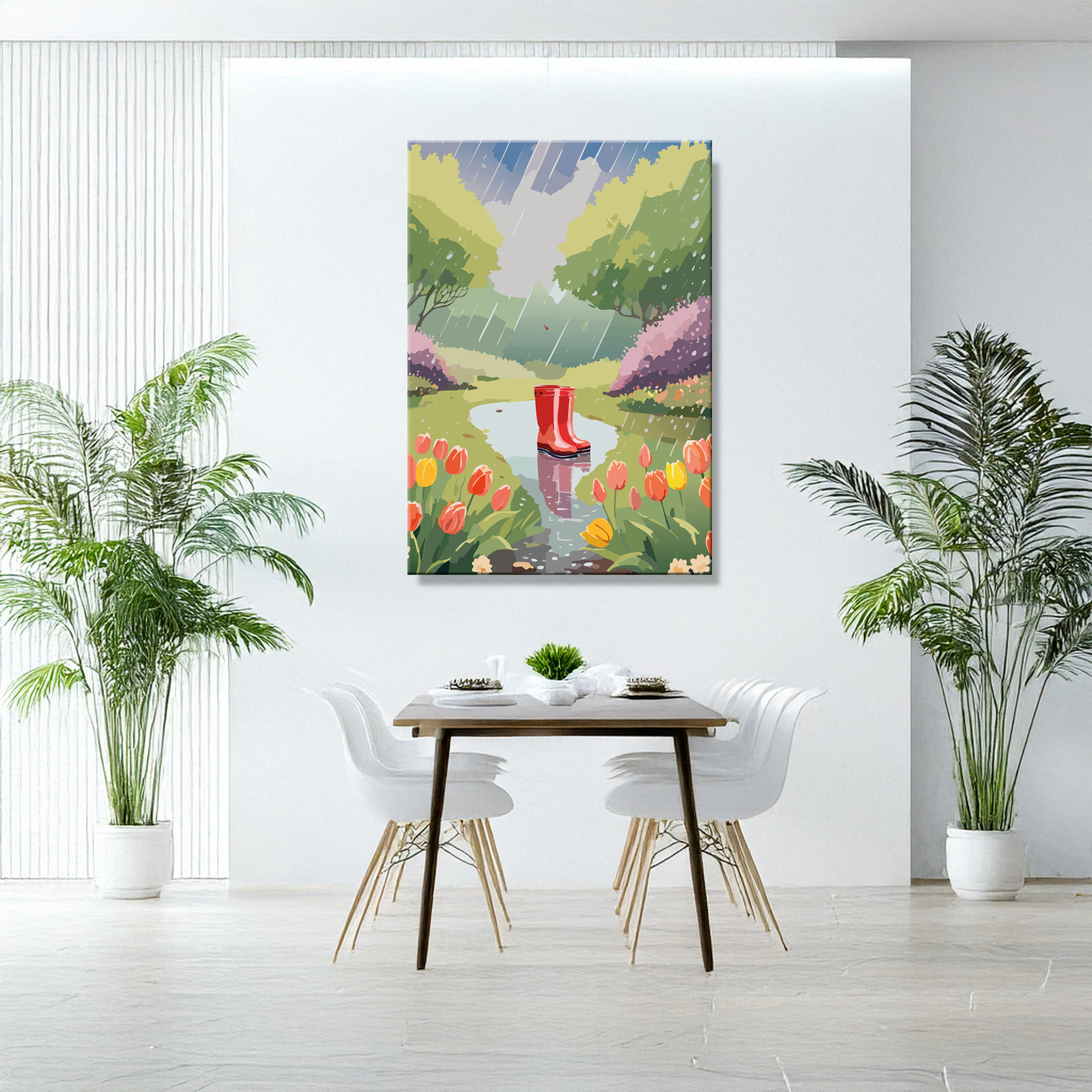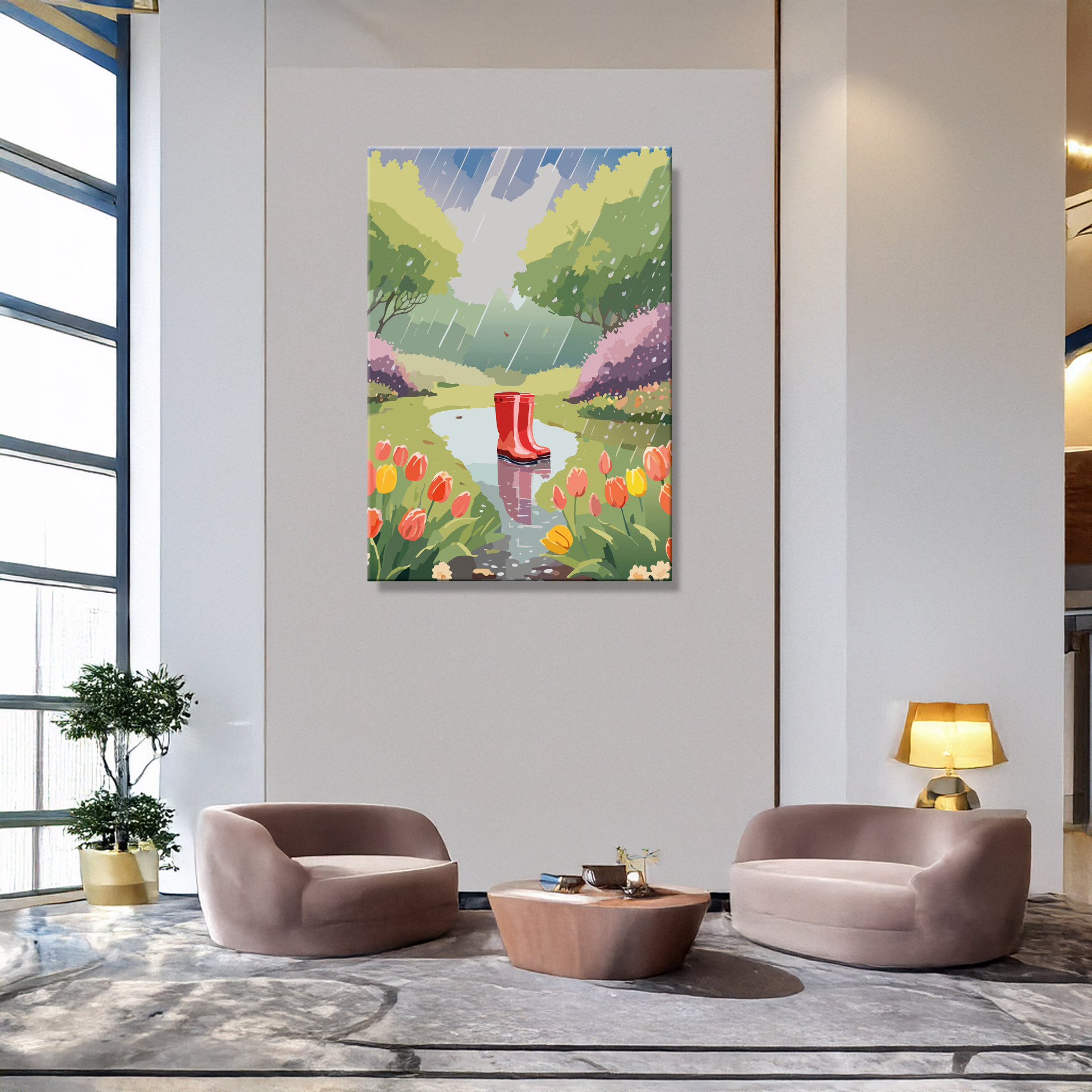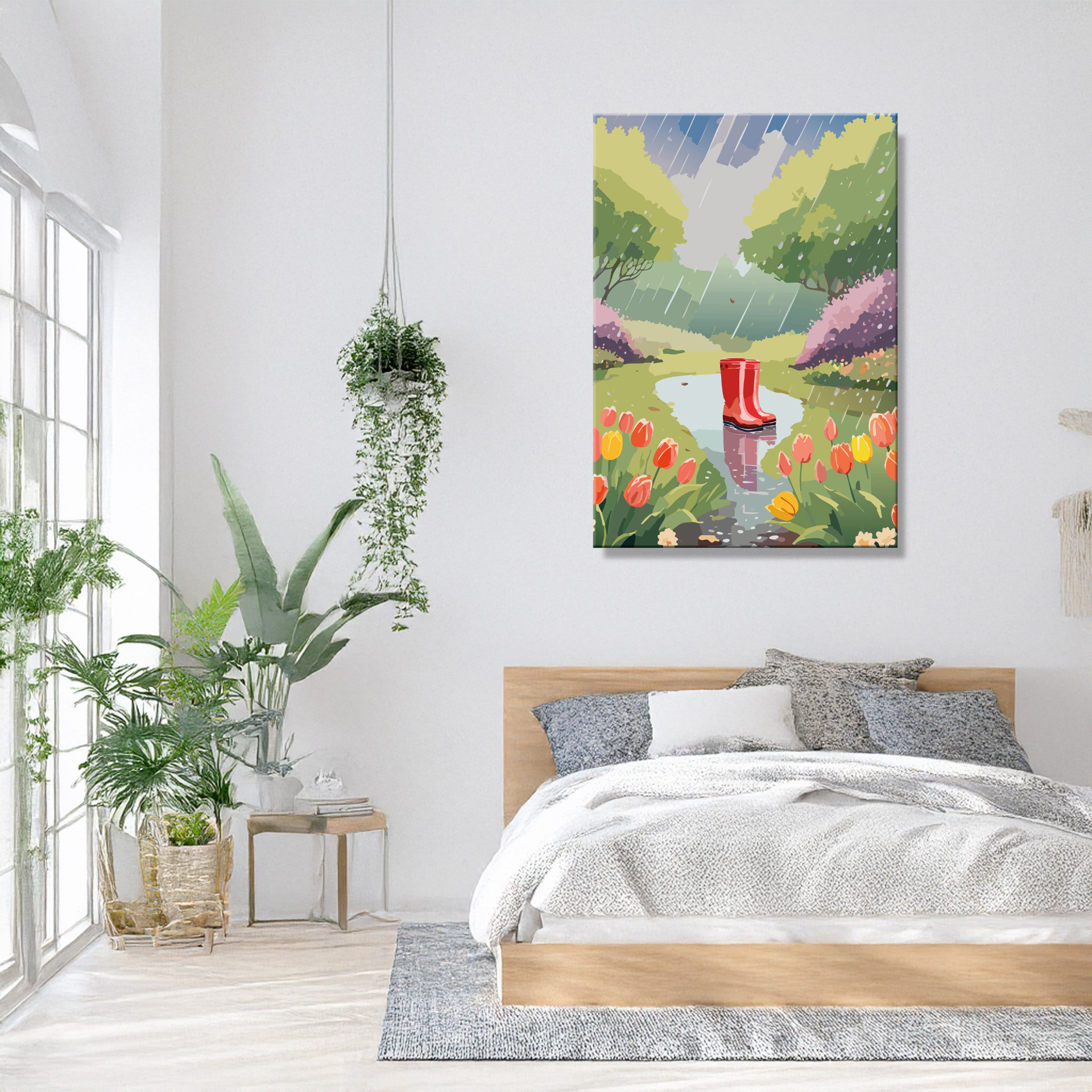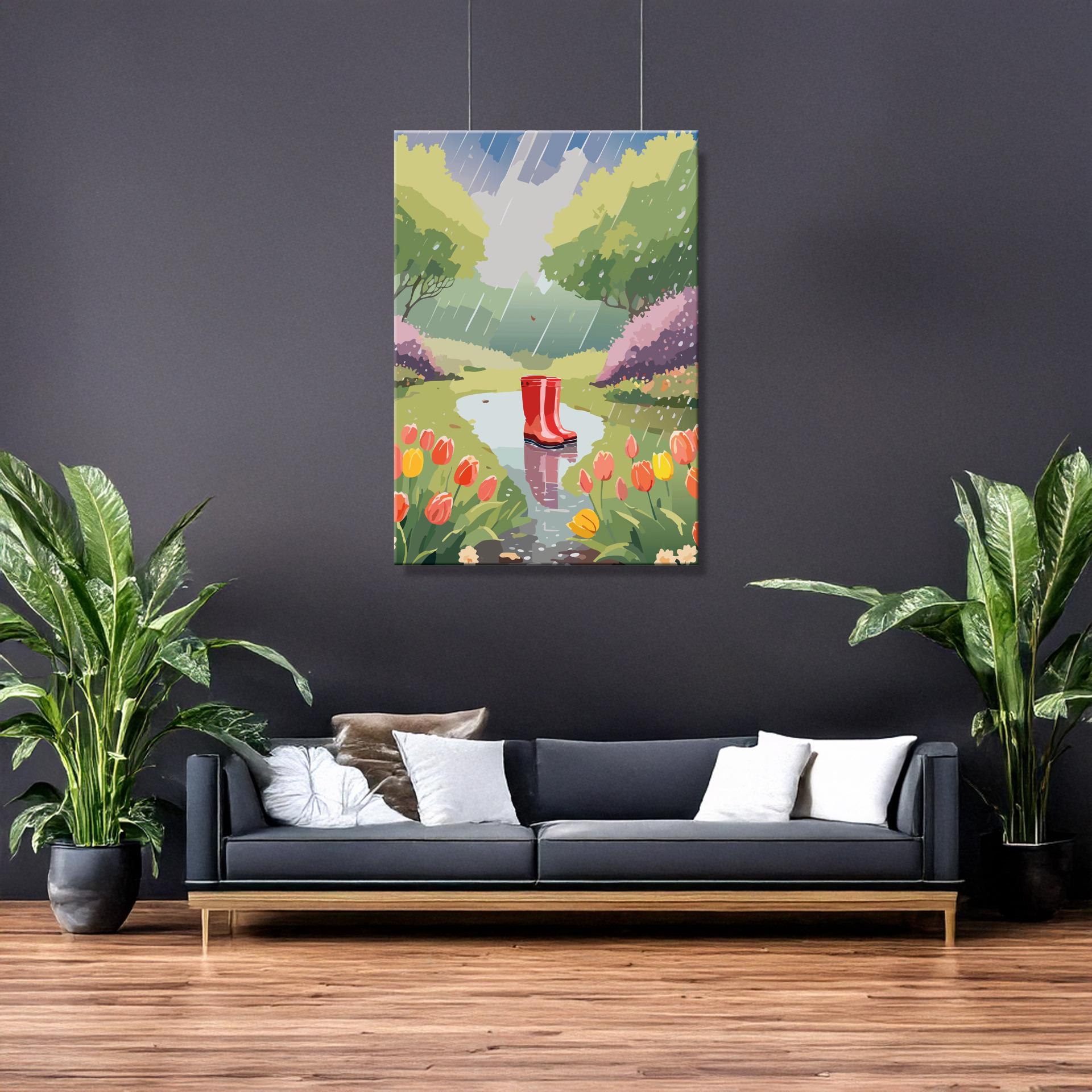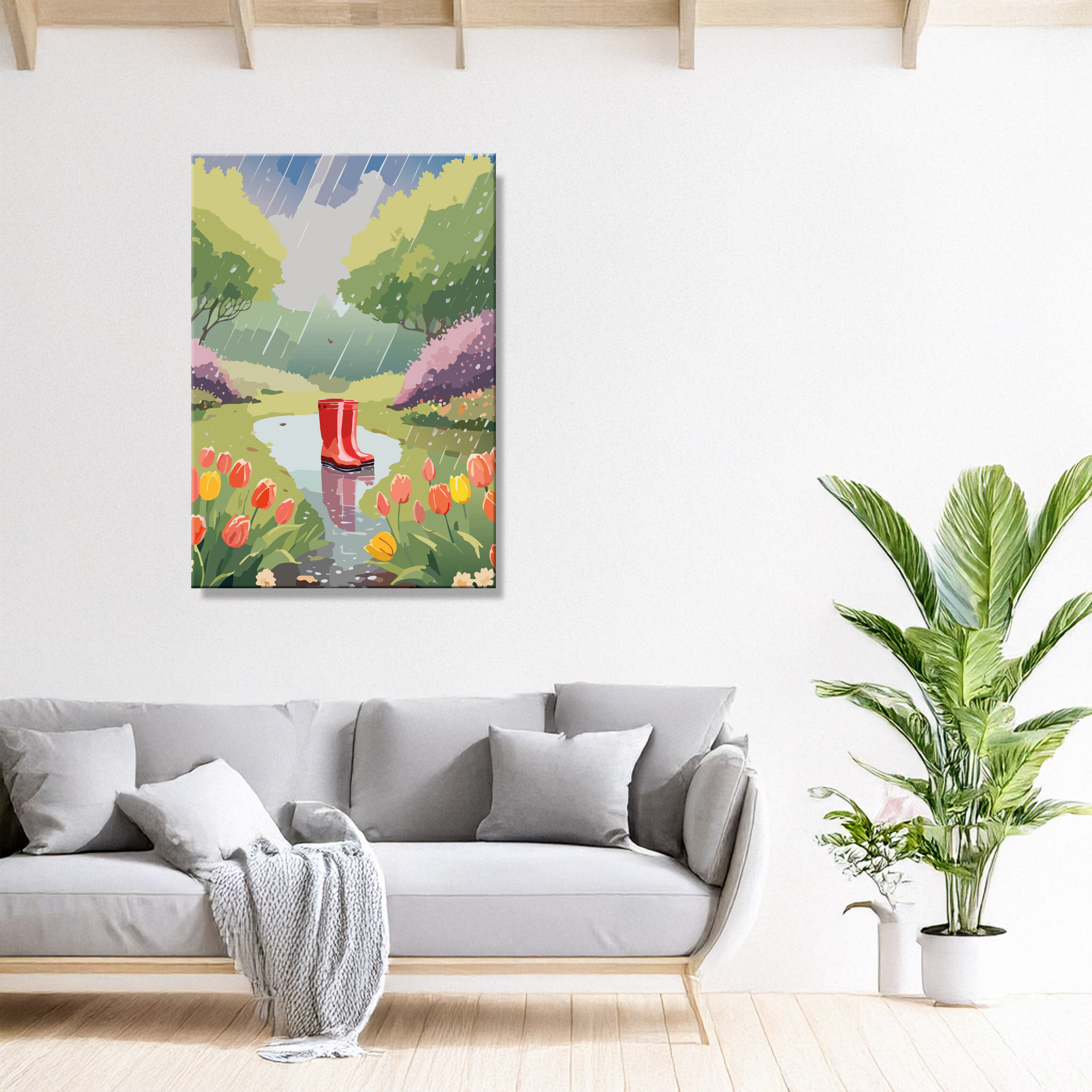 Wenn Gummistiefel durch den sanften Regen springen und Tulpen um sie herum blühen – dieses Werk feiert den Frühling auf charmante Weise. Gedruckt auf hochwertiger Leinwand, in verschiedenen Formaten erhältlich.
