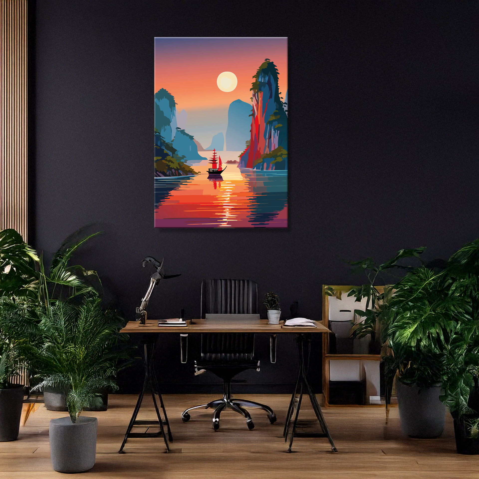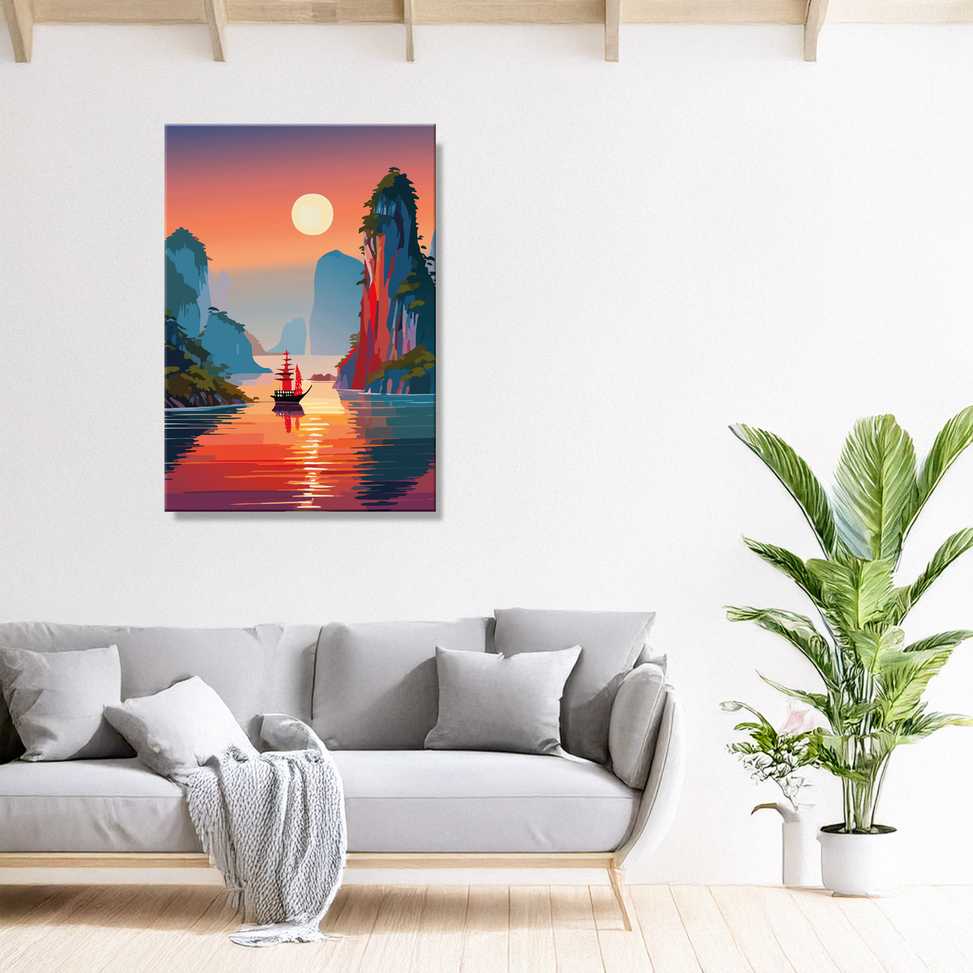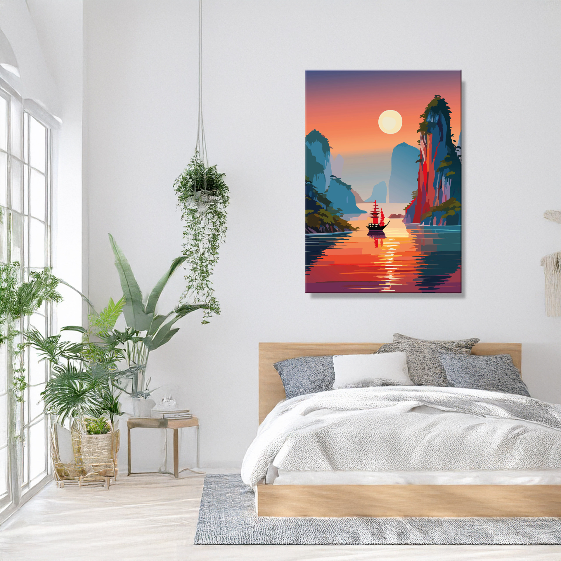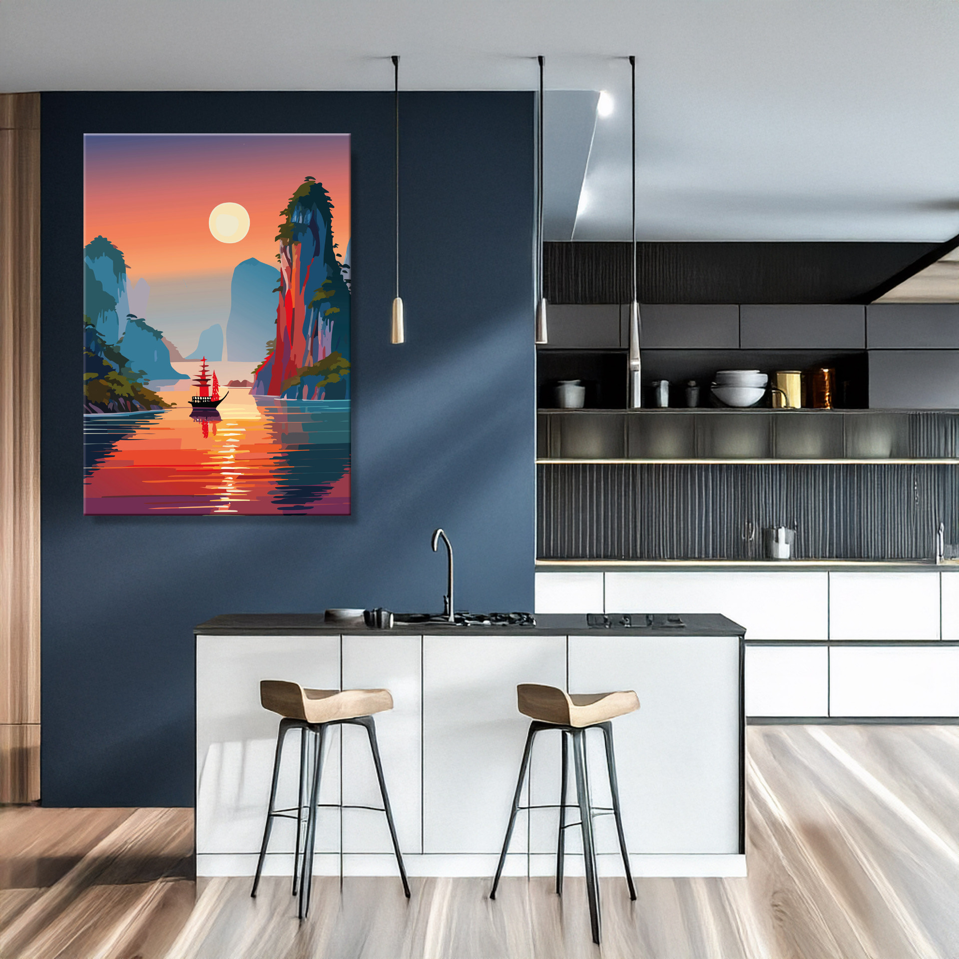 Wo Wasser, Felsen und Licht in Harmonie zusammentreffen – dieser Blick auf die Halong‑Bucht verkörpert Gelassenheit und Ästhetik zugleich. Ideal für Wohnräume oder Büro — hochwertig gedruckt und in verschiedenen Formaten verfügbar."