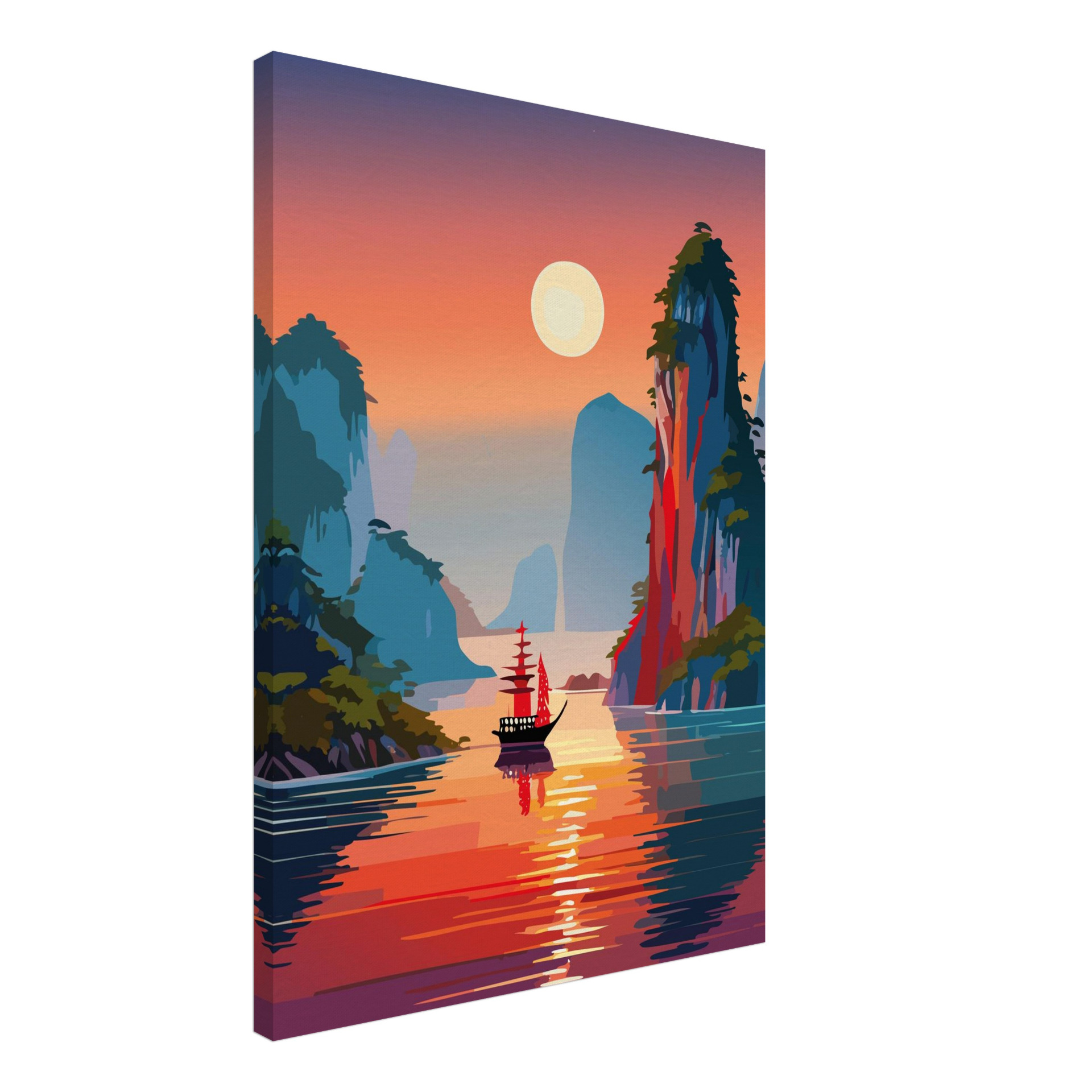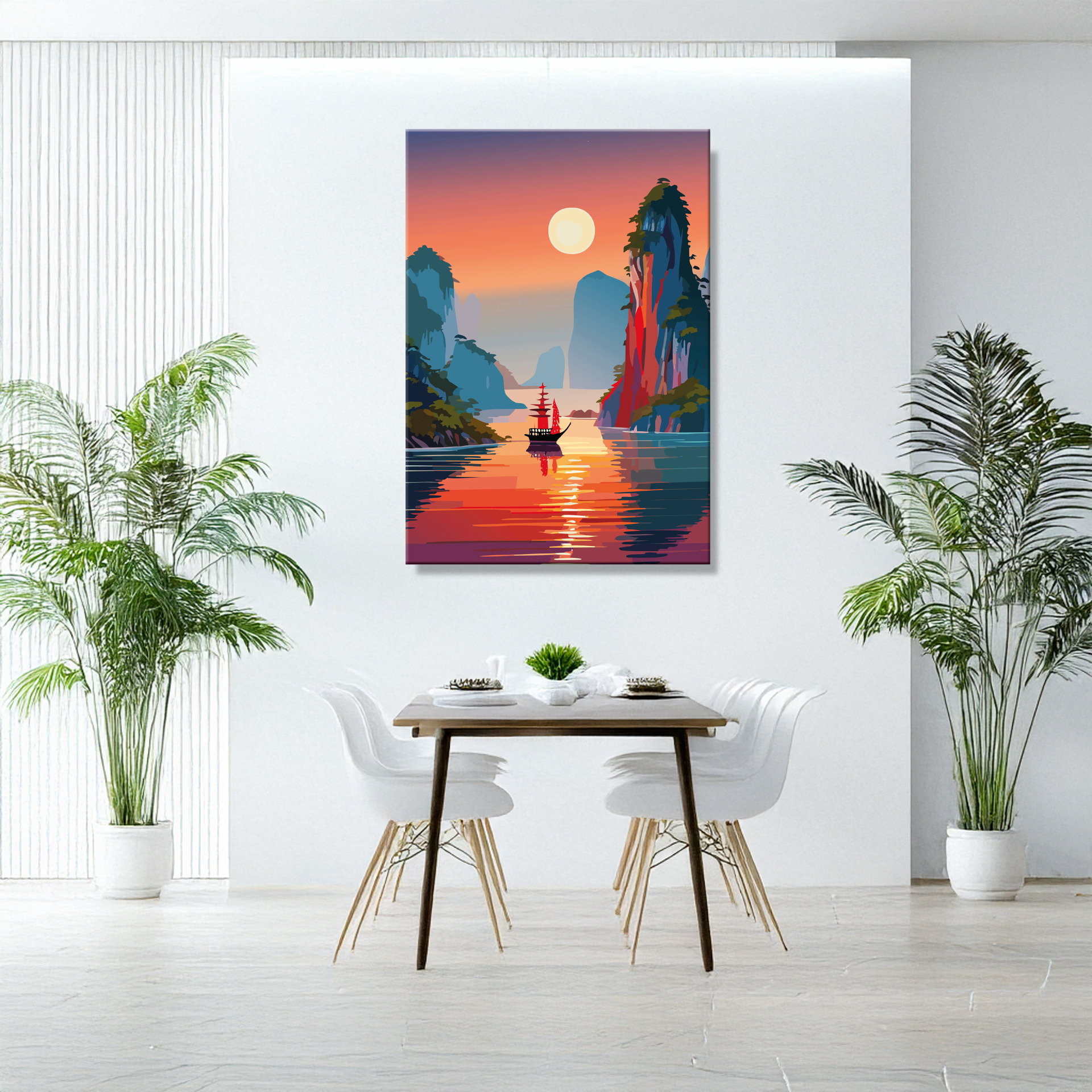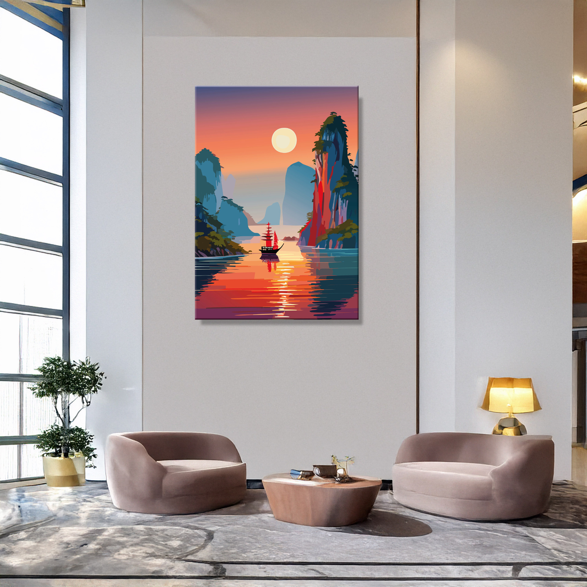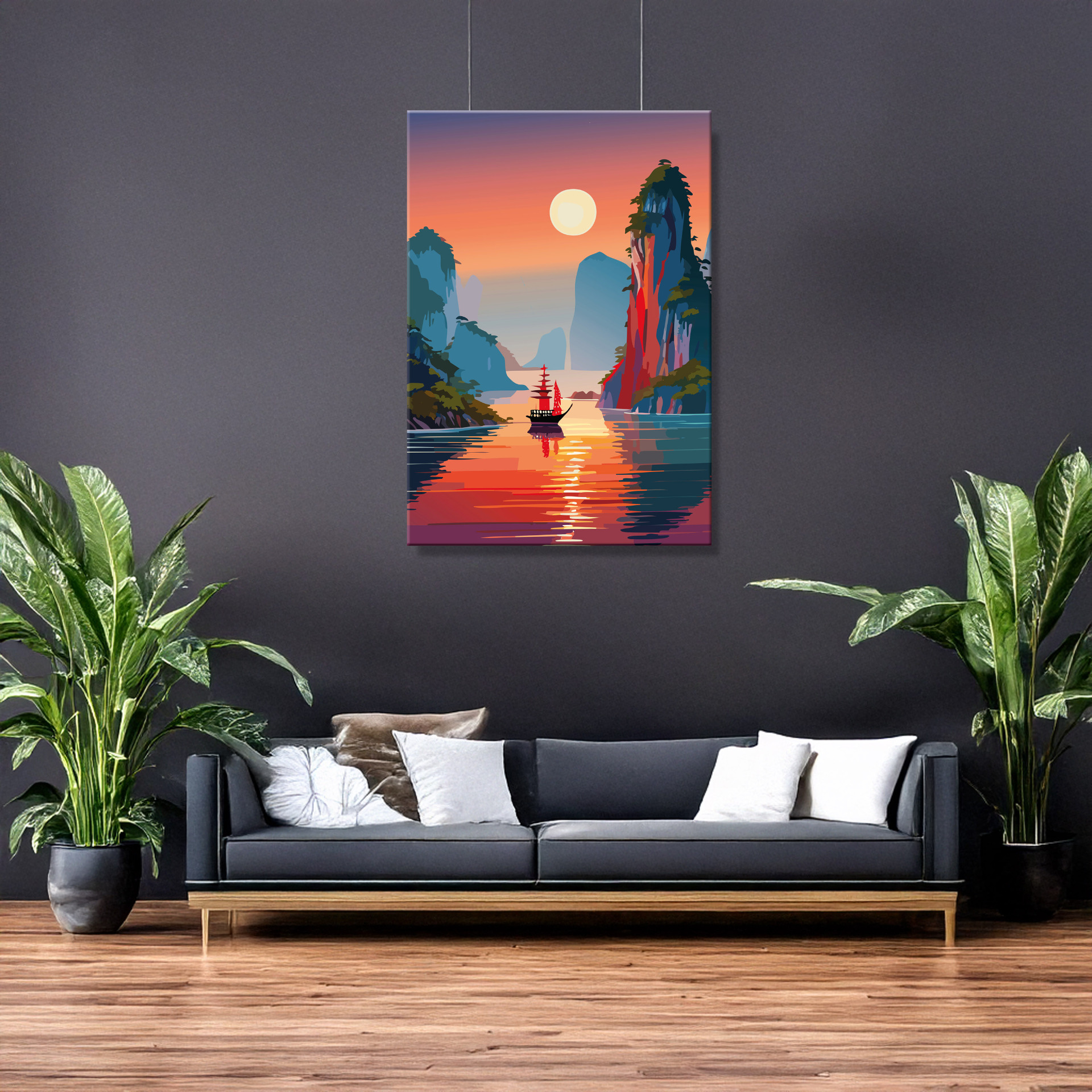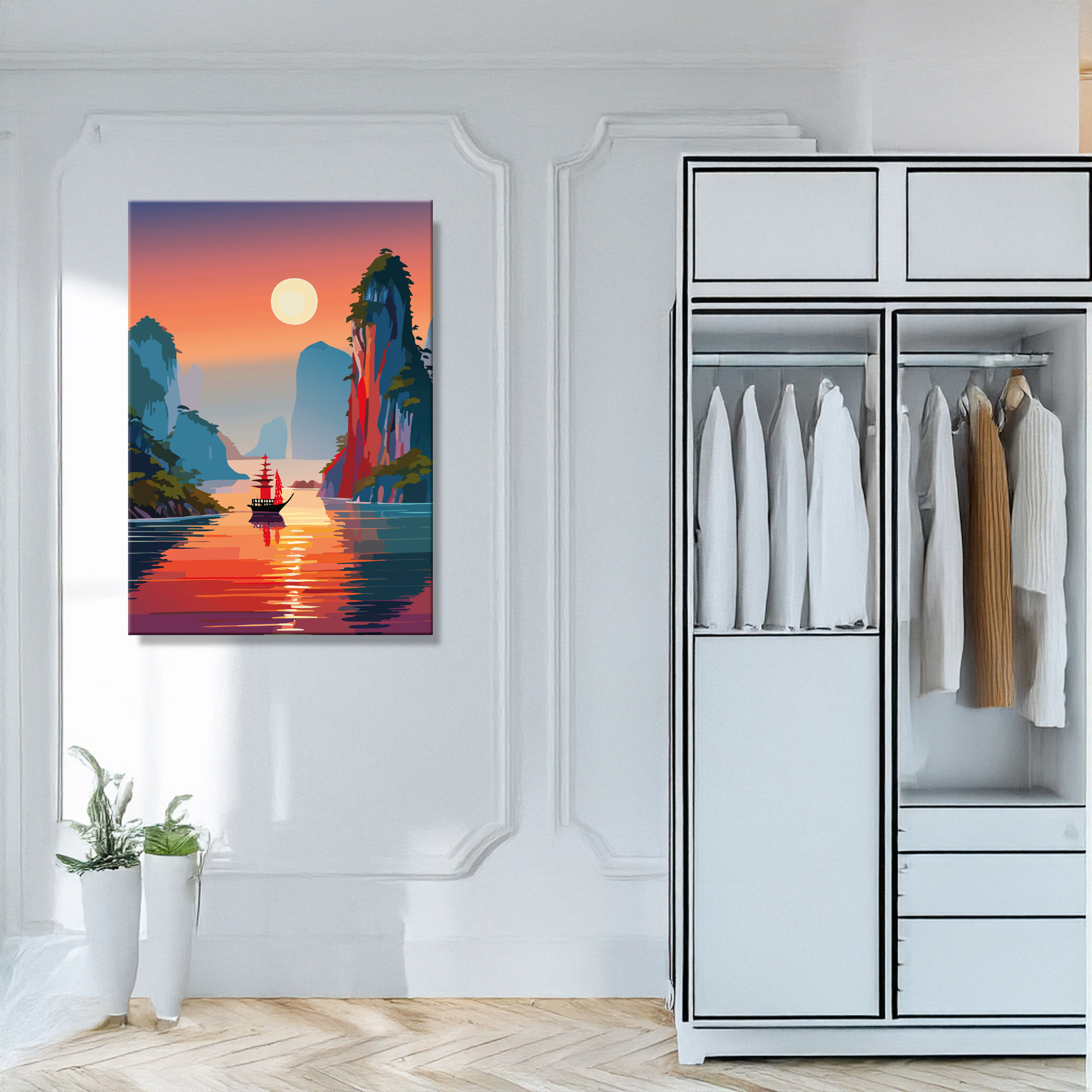 Wo Wasser, Felsen und Licht in Harmonie zusammentreffen – dieser Blick auf die Halong‑Bucht verkörpert Gelassenheit und Ästhetik zugleich. Ideal für Wohnräume oder Büro — hochwertig gedruckt und in verschiedenen Formaten verfügbar."