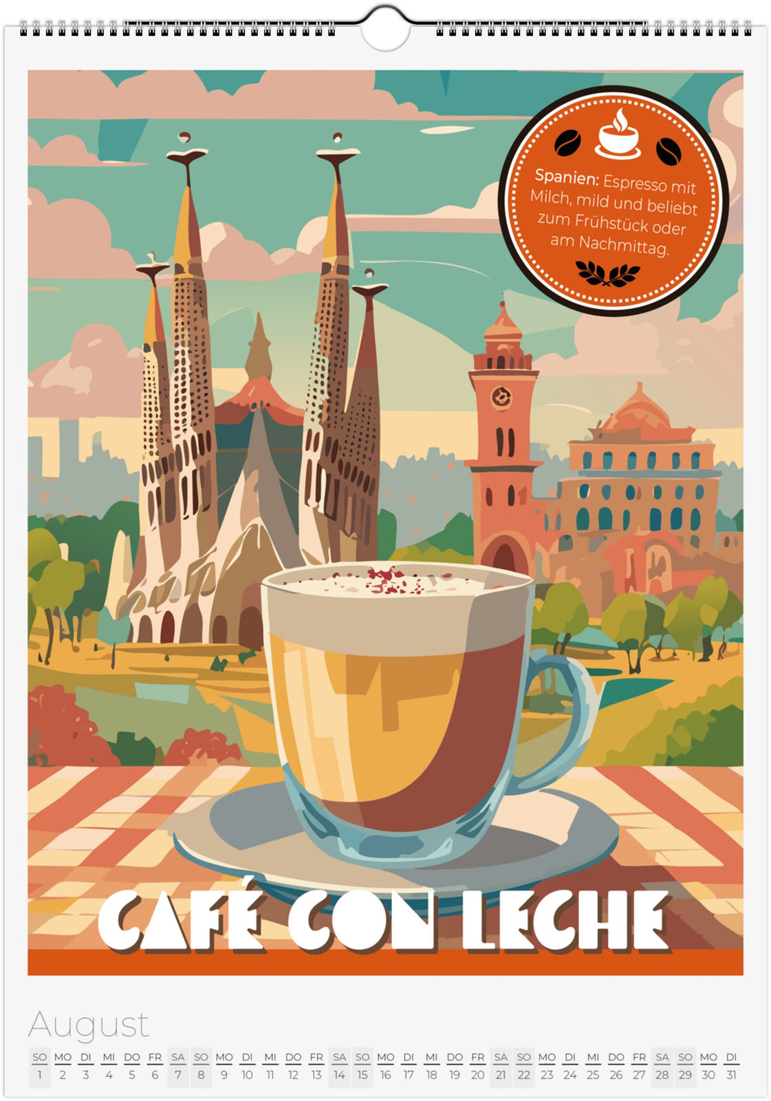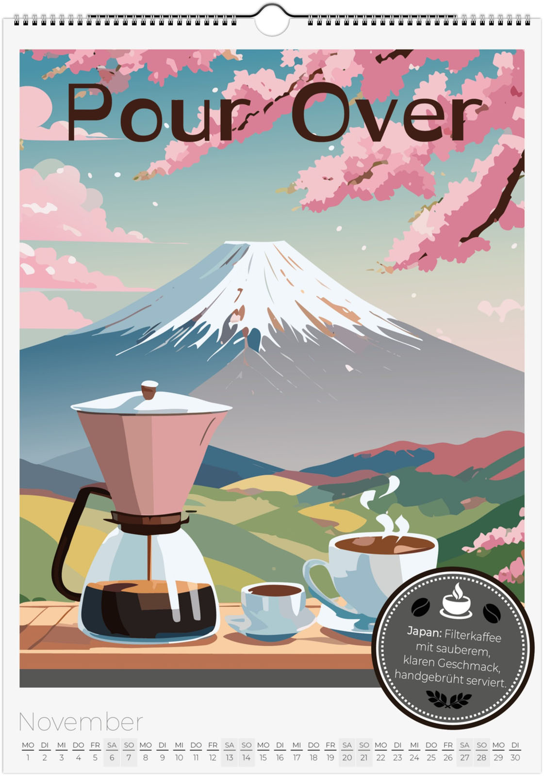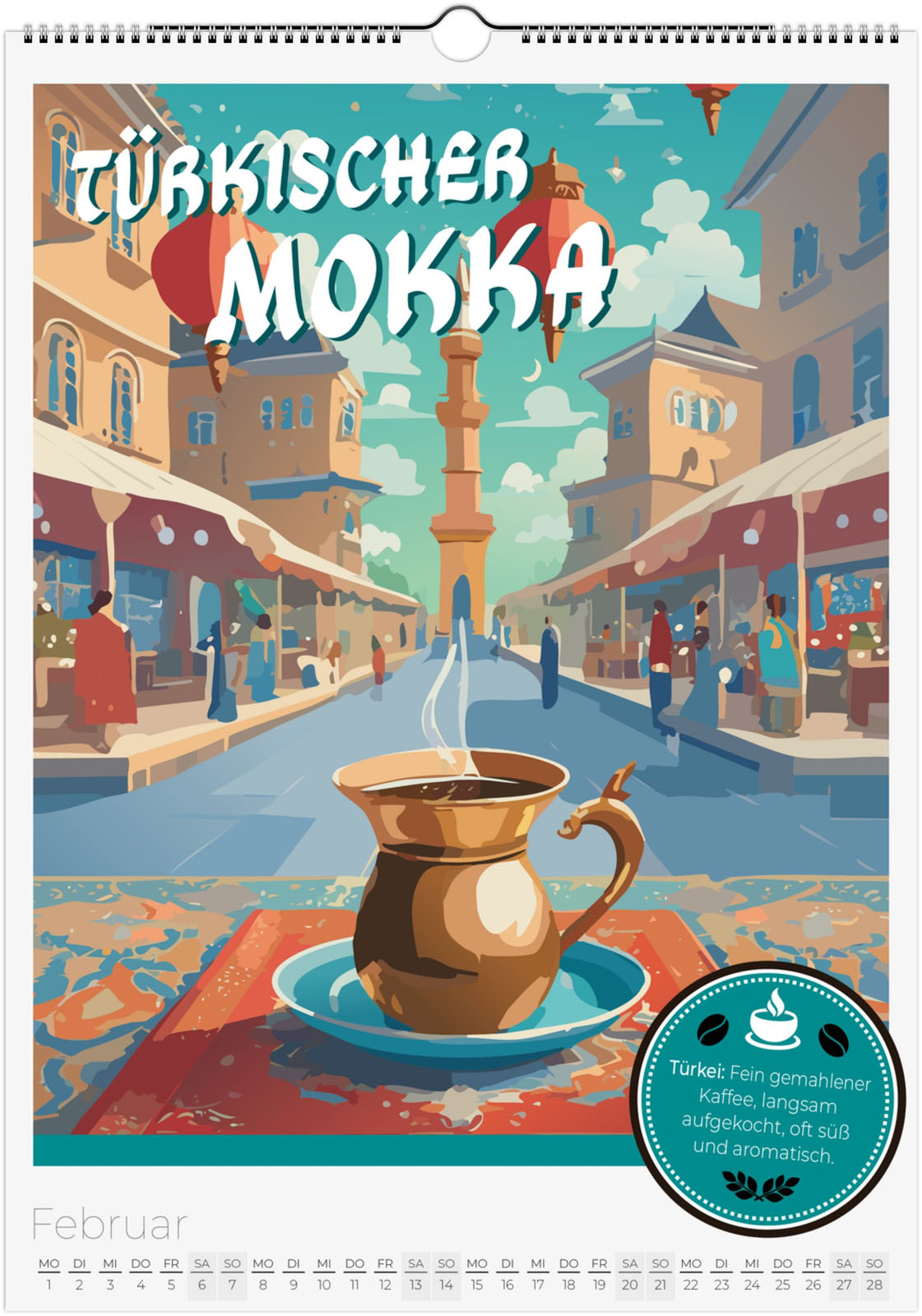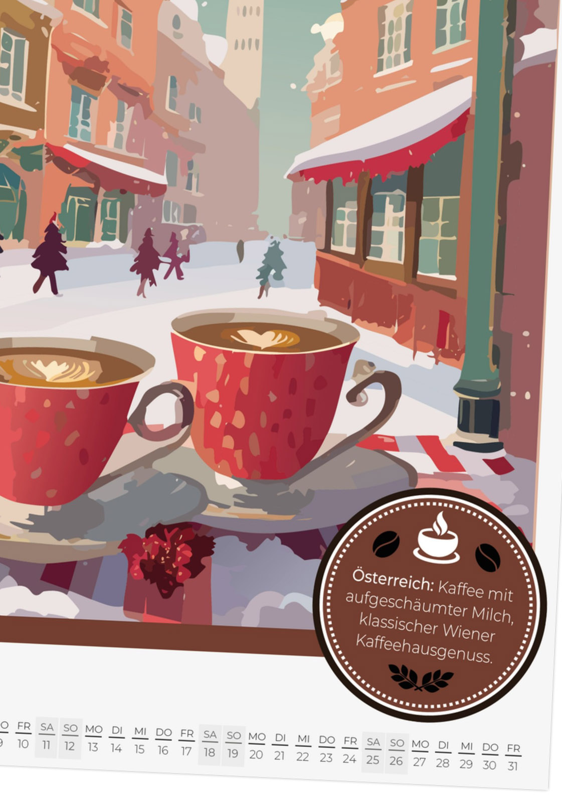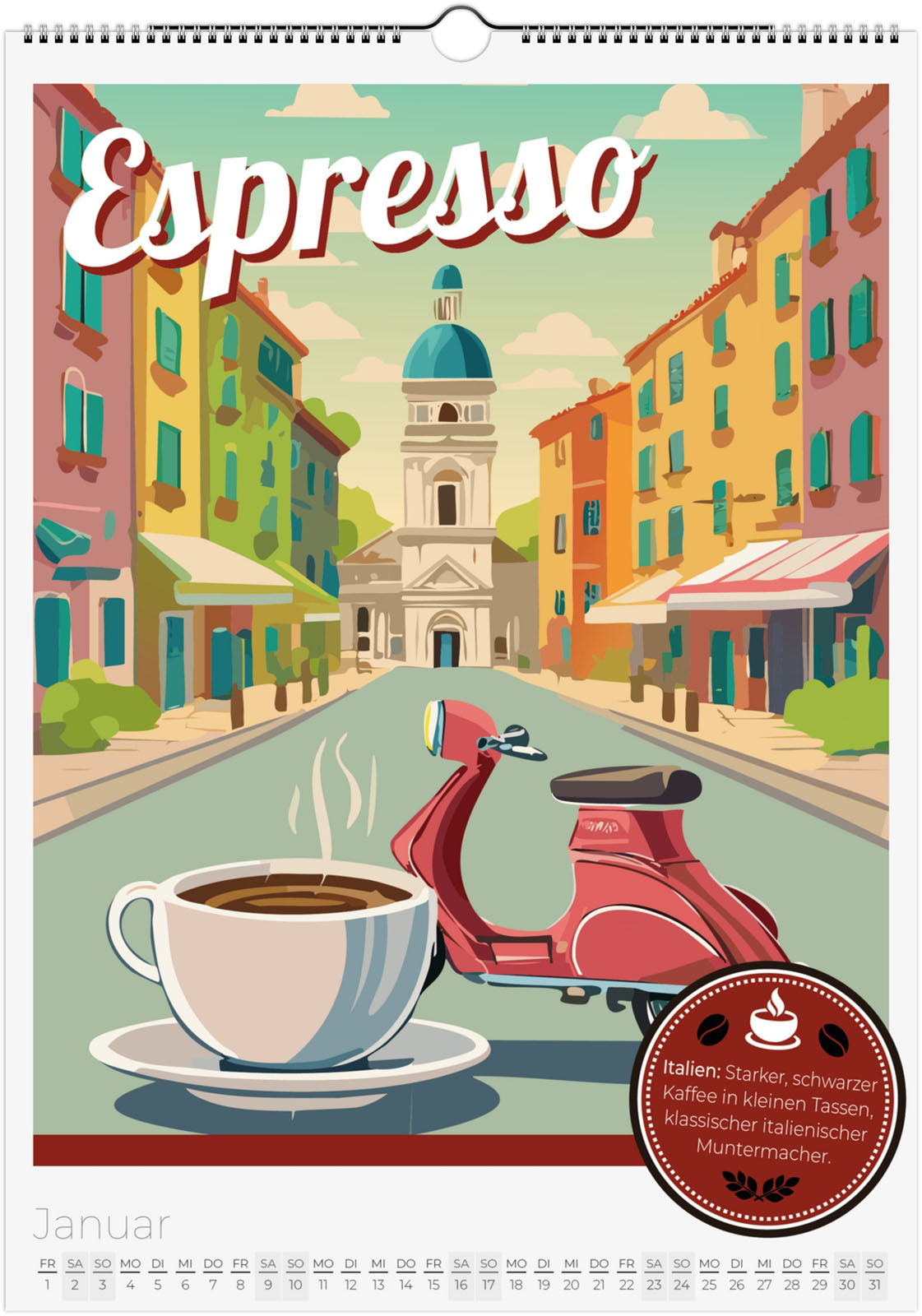 12 Monate voller aromatischer Kaffeemomente aus aller Welt. Jeder Monat zeigt eine besondere Kaffeespezialität im Retro-Poster-Look, inspiriert von Italien, Äthiopien, Japan, Österreich und vielen weiteren Ländern.