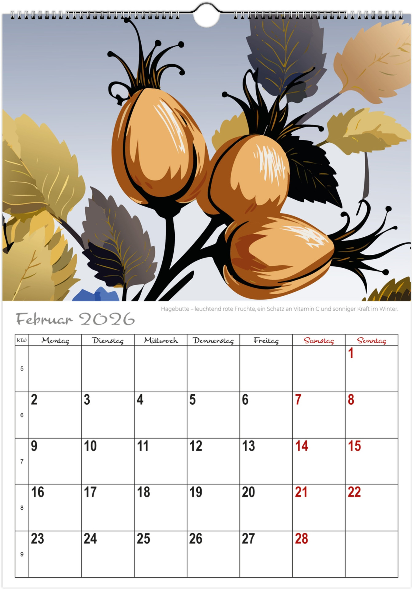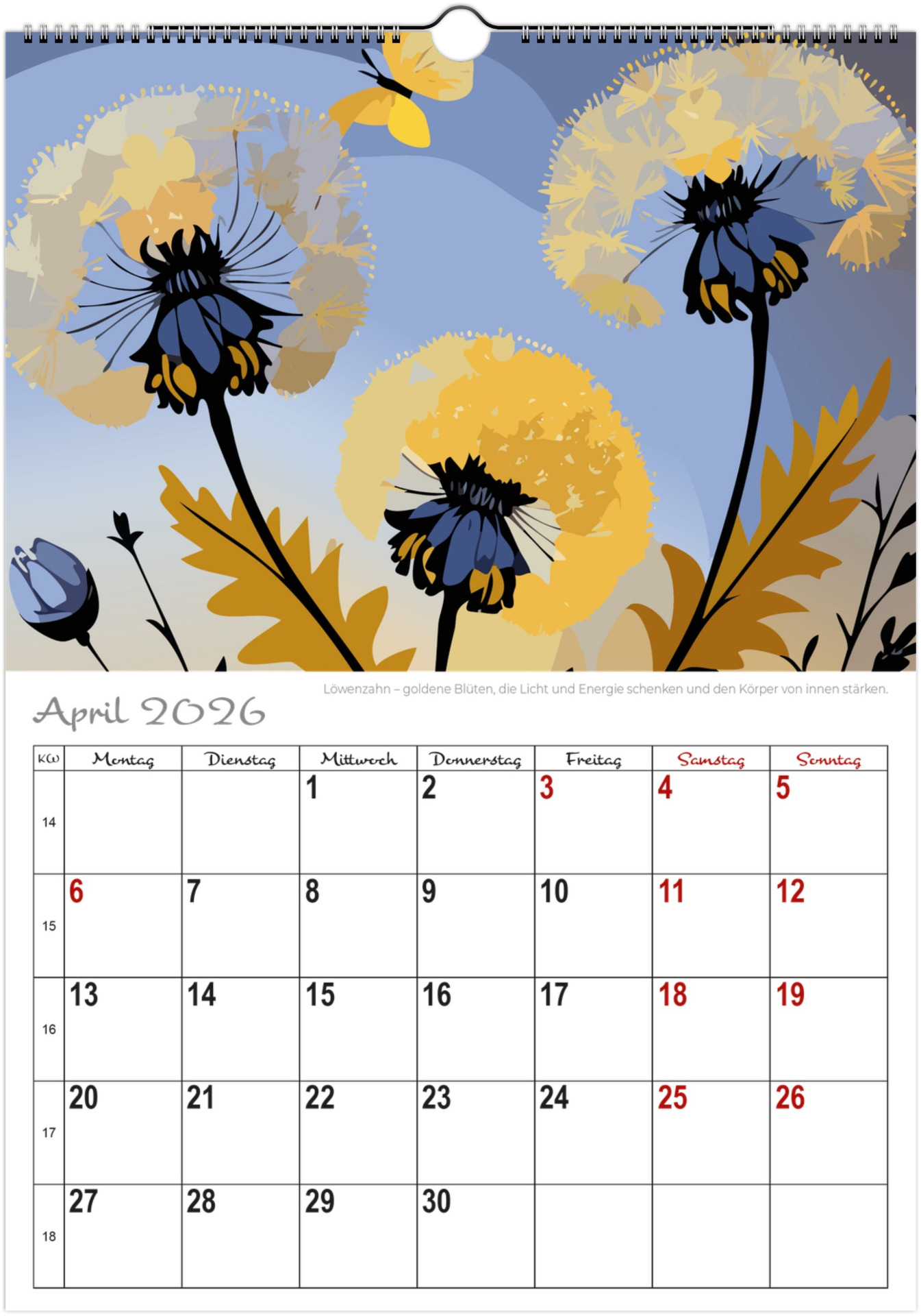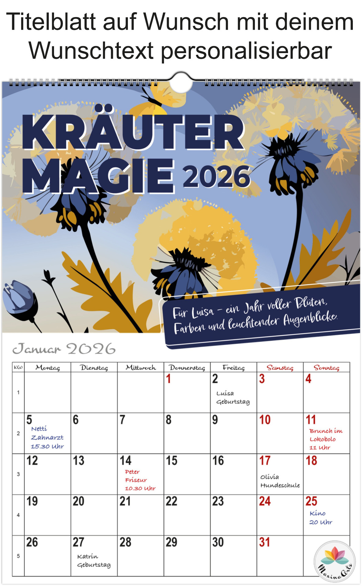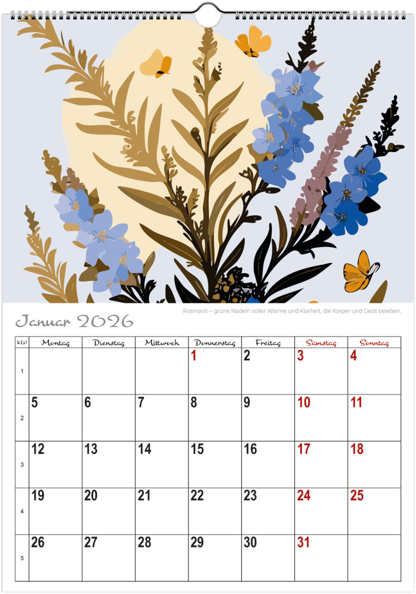 Jeder Monat zeigt eine liebevoll illustrierte Heilpflanze – von Rosmarin bis zur Christrose – und bietet viel Platz für Termine, Geburtstage & Notizen.