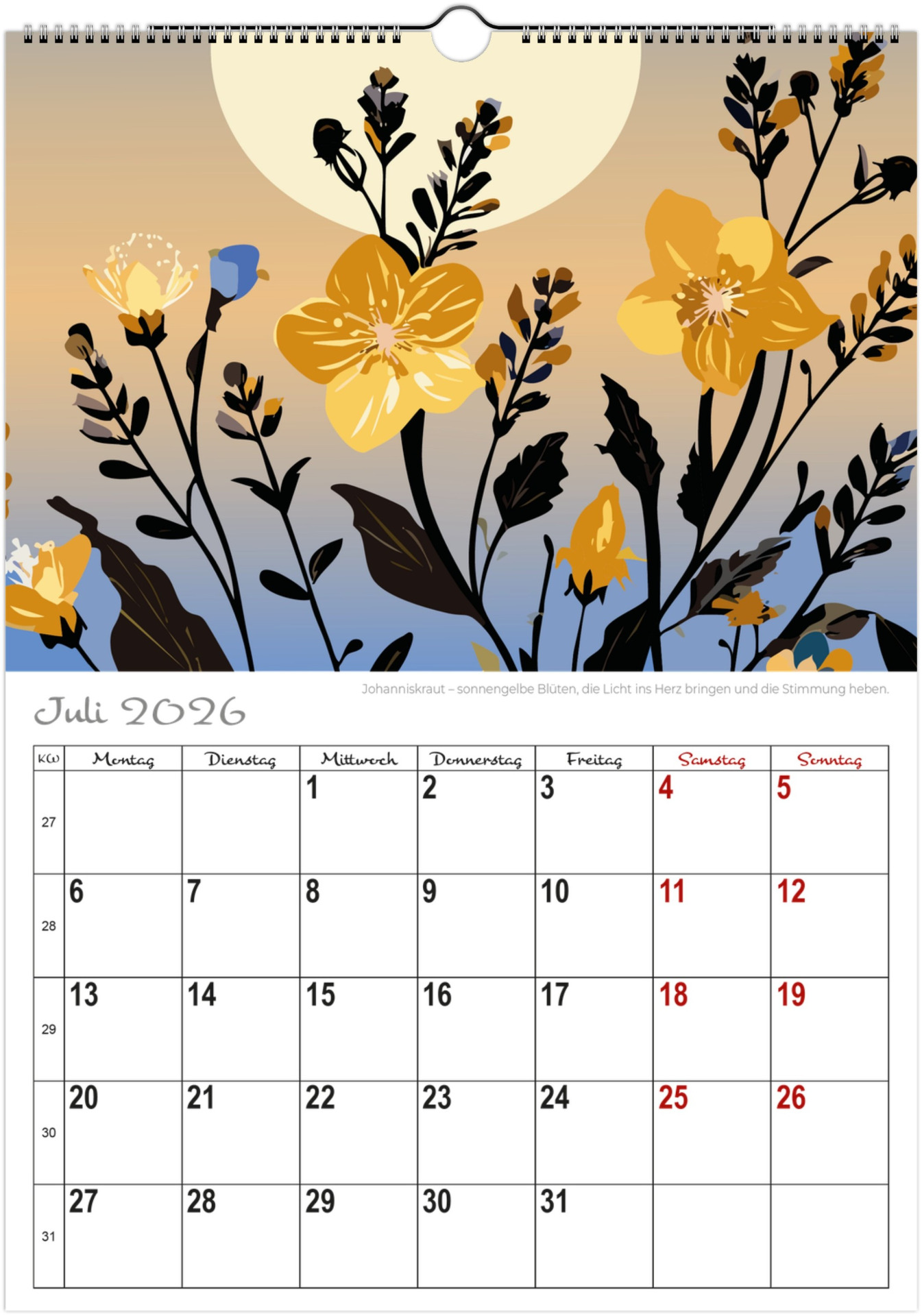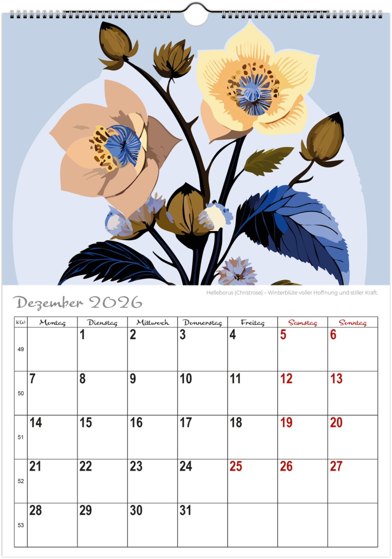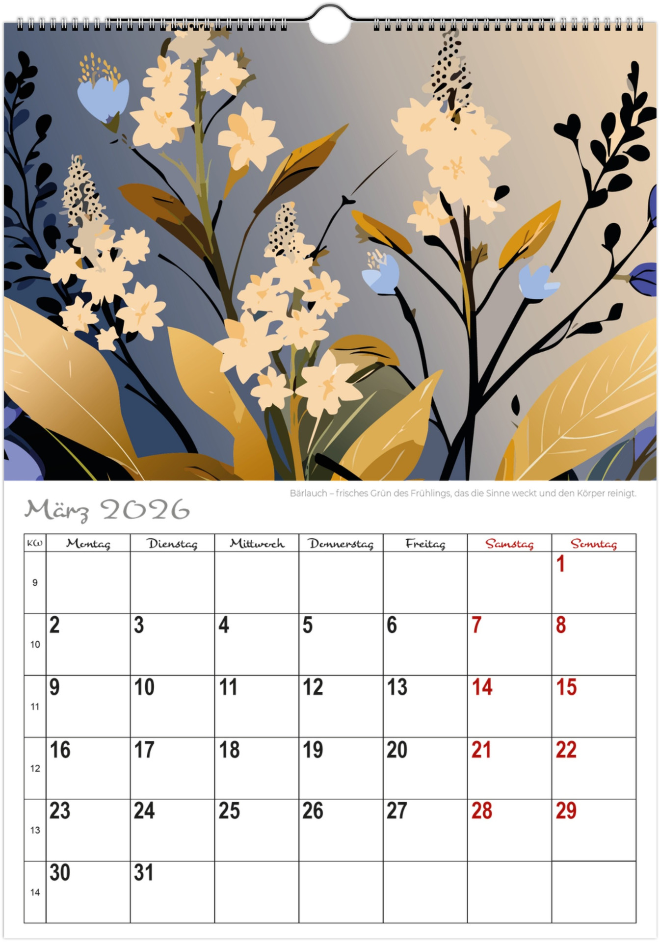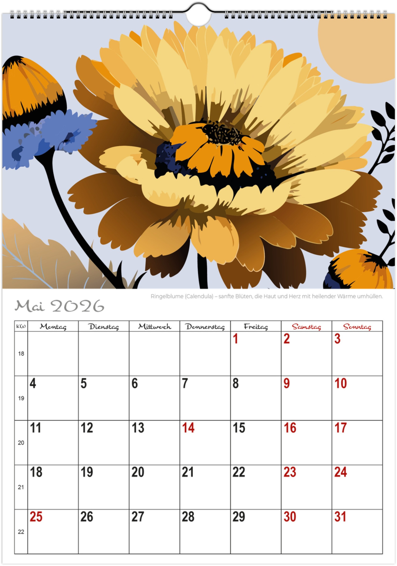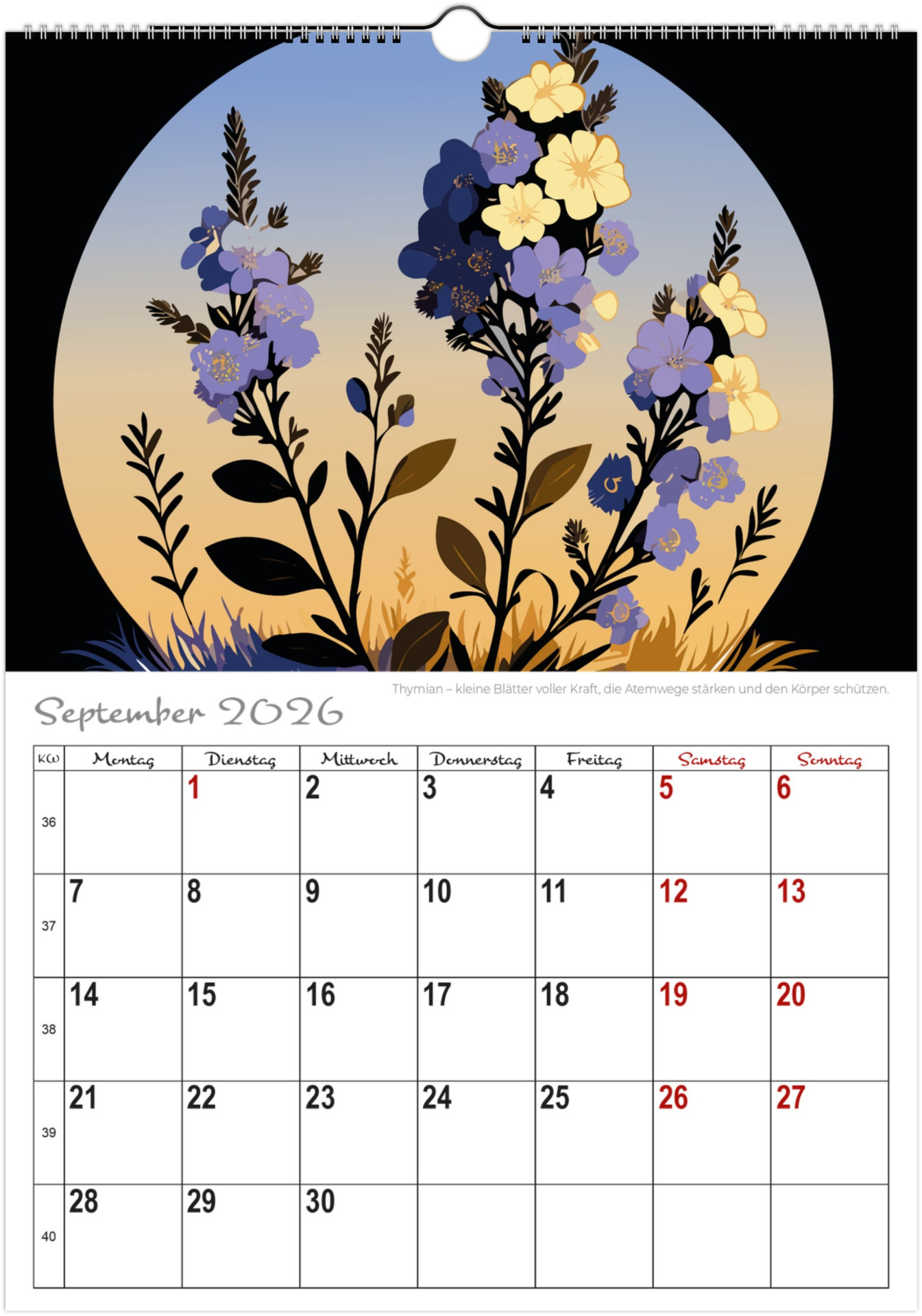 Jeder Monat zeigt eine liebevoll illustrierte Heilpflanze – von Rosmarin bis zur Christrose – und bietet viel Platz für Termine, Geburtstage & Notizen.