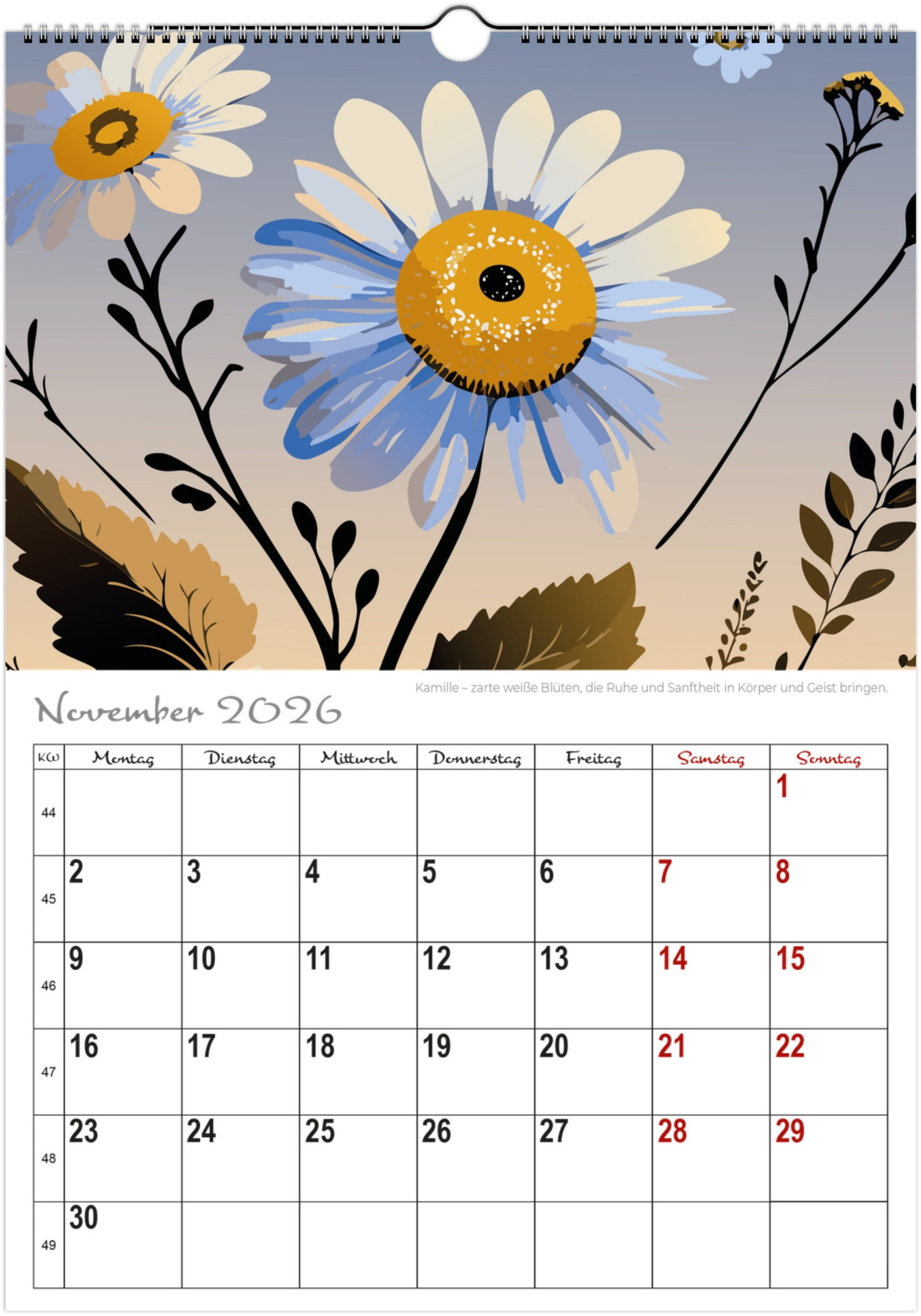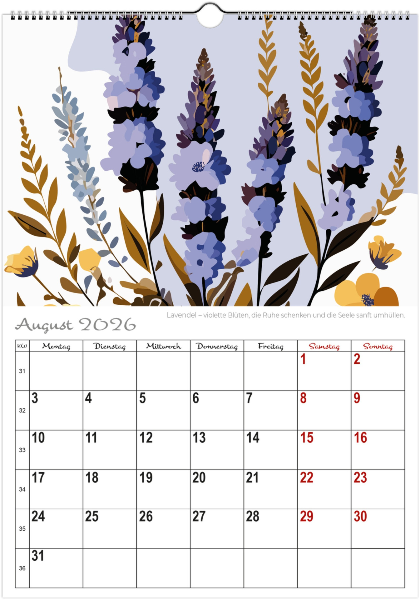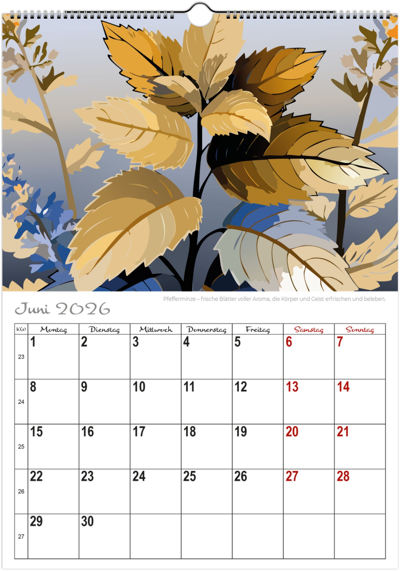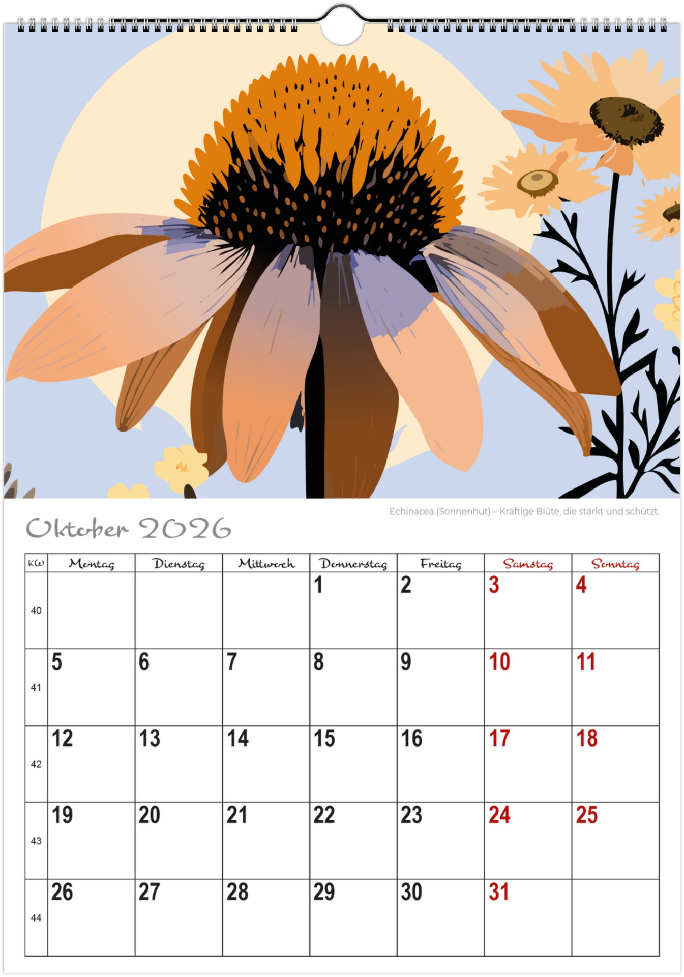 Jeder Monat zeigt eine liebevoll illustrierte Heilpflanze – von Rosmarin bis zur Christrose – und bietet viel Platz für Termine, Geburtstage & Notizen.
