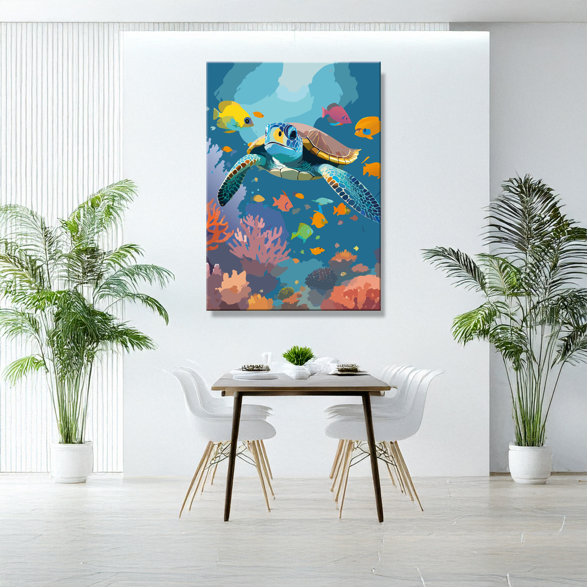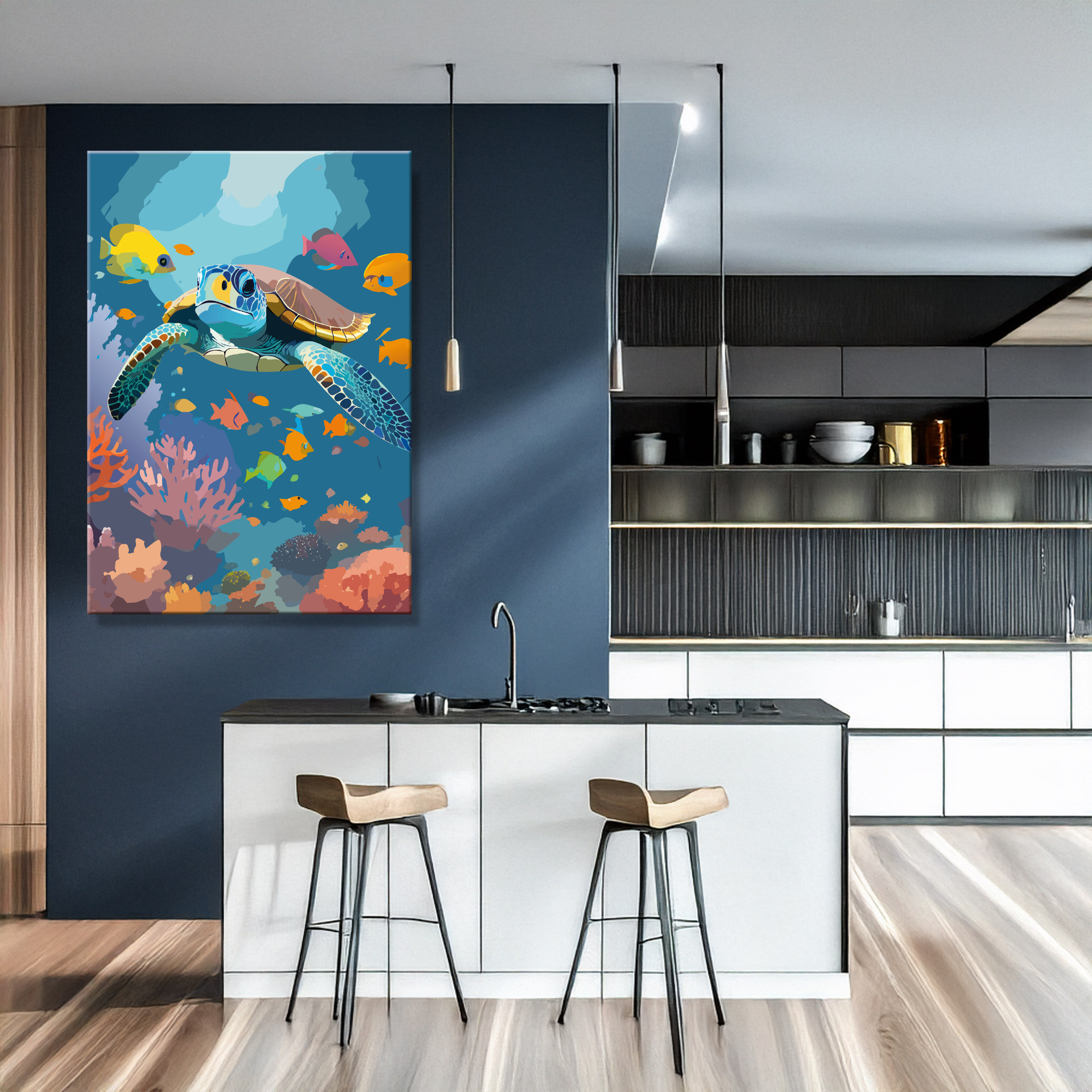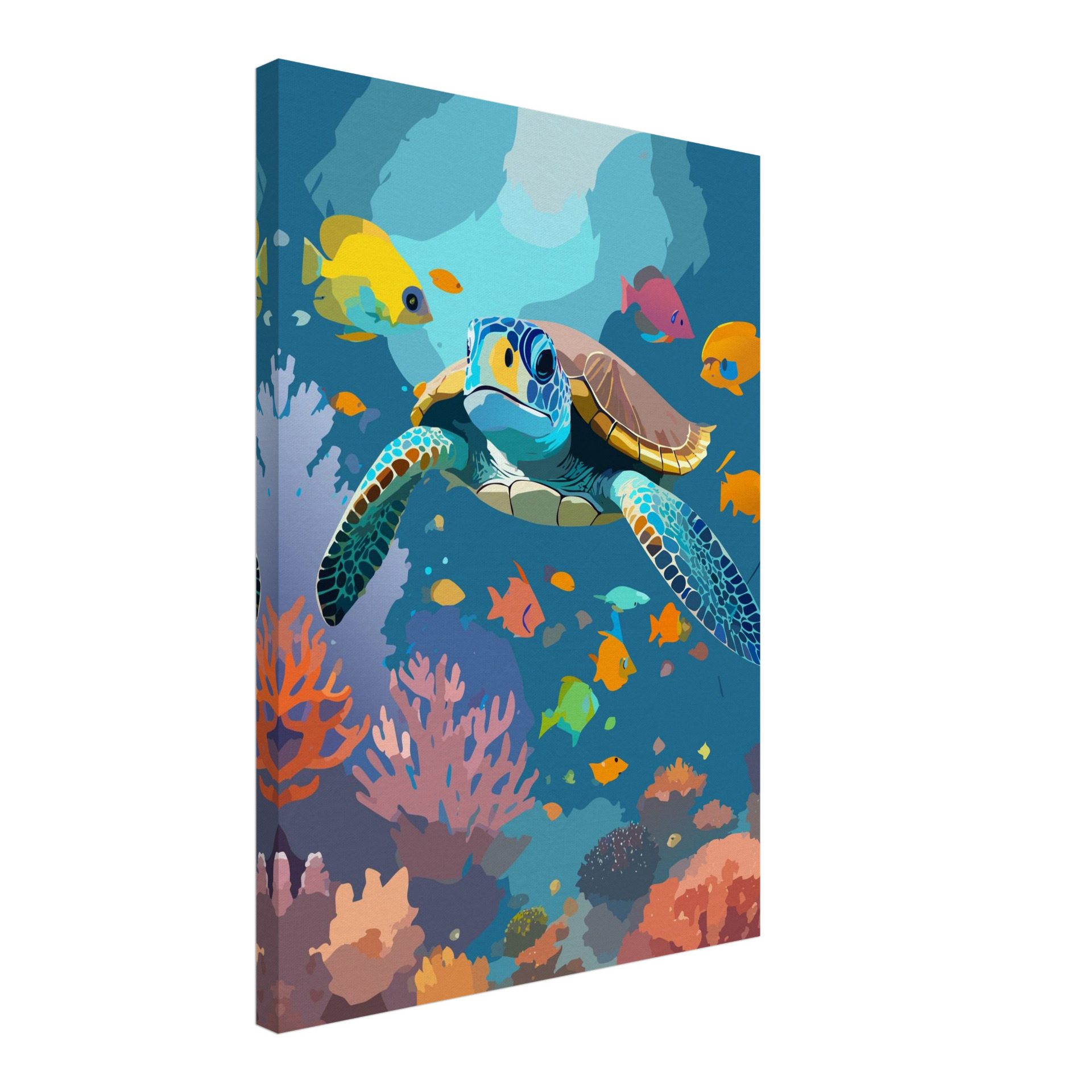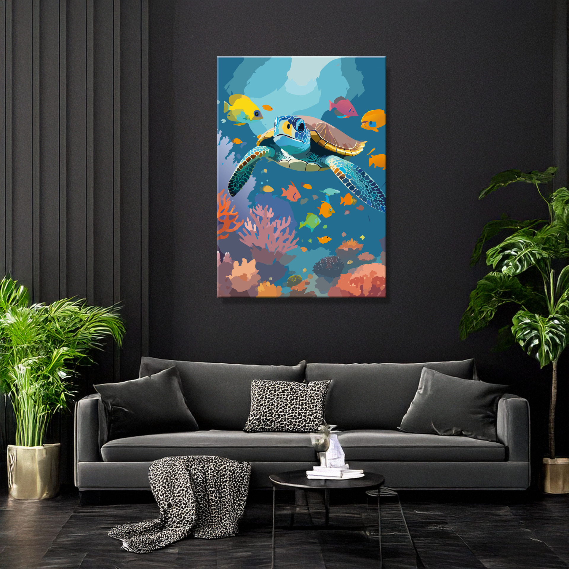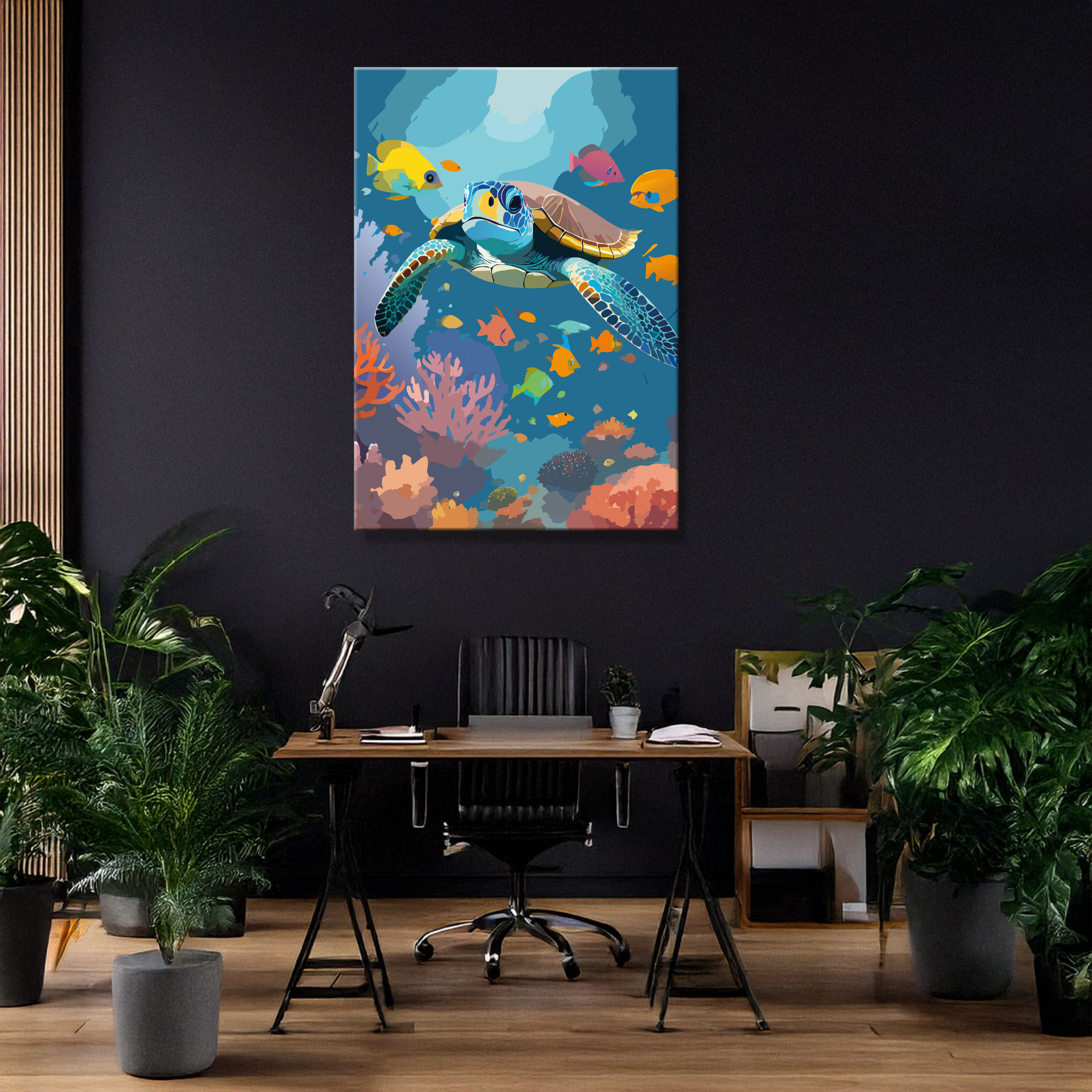 Majestätisch und anmutig gleitet die Schildkröte durch die farbenreiche Unterwasserwelt – umgeben von leuchtenden Korallen und bunten Fischen. Dieses Bild strahlt Ruhe, Tiefe und natürliche Eleganz aus – ein Stück Ozean zum Träumen und Verweilen. Erhältlich in verschiedenen Formaten auf hochwertiger Leinwand.
