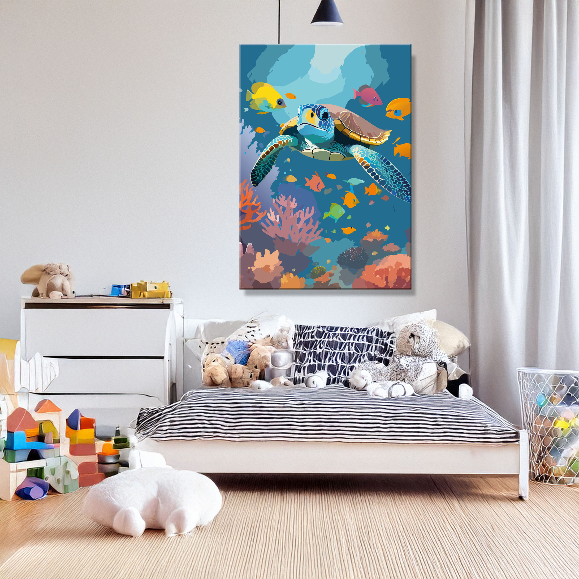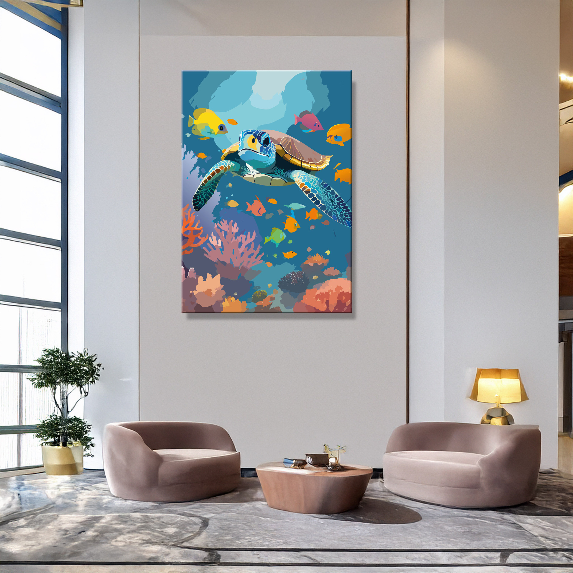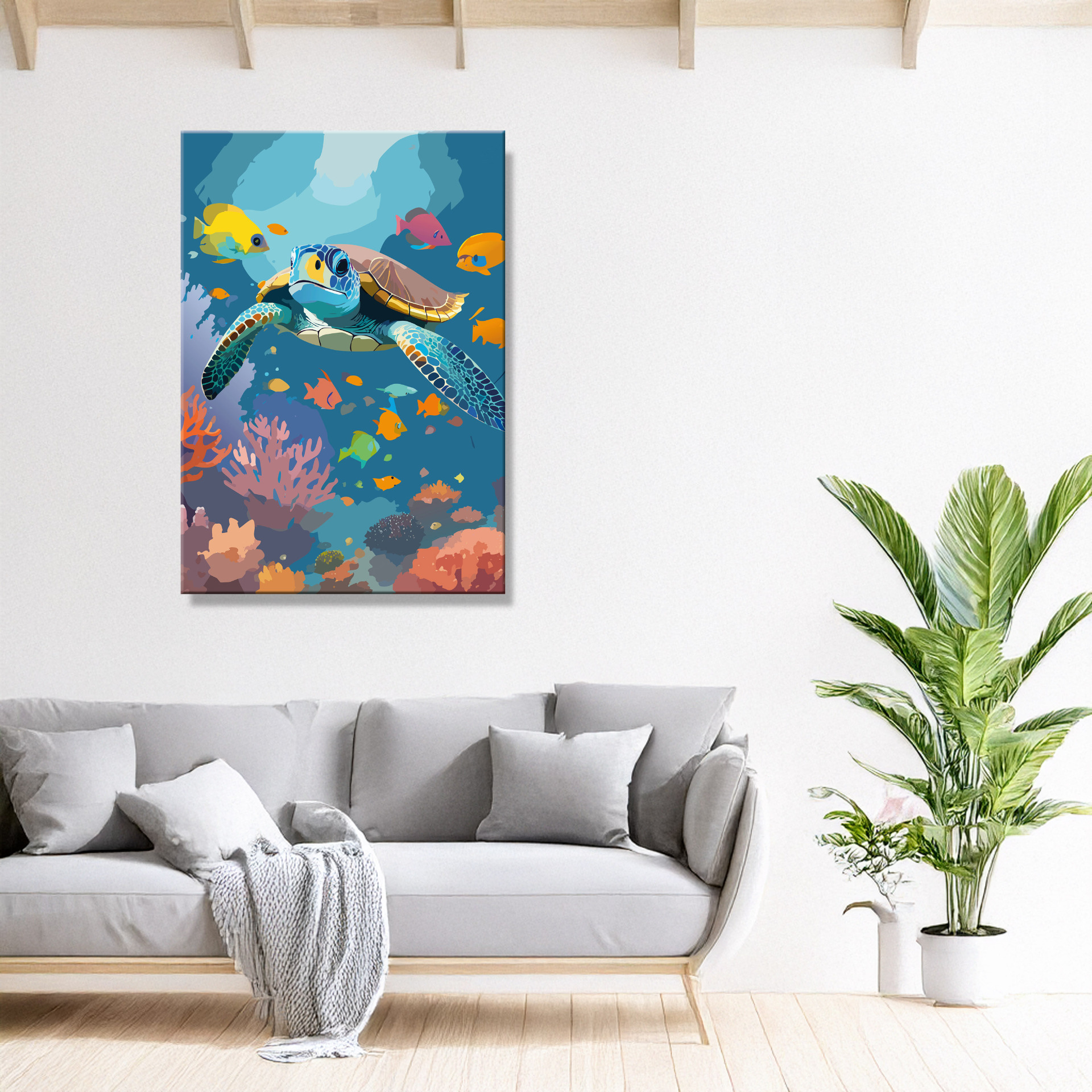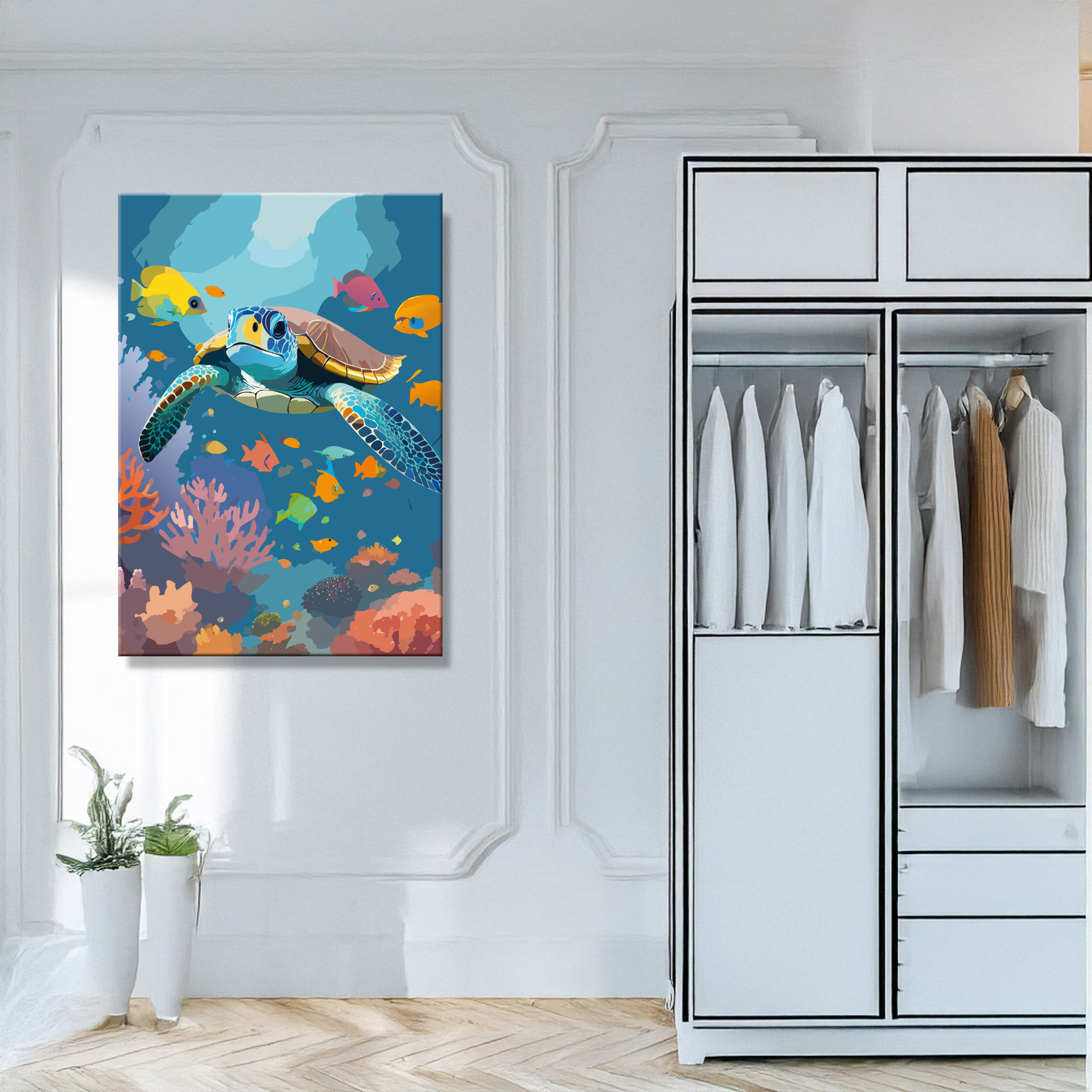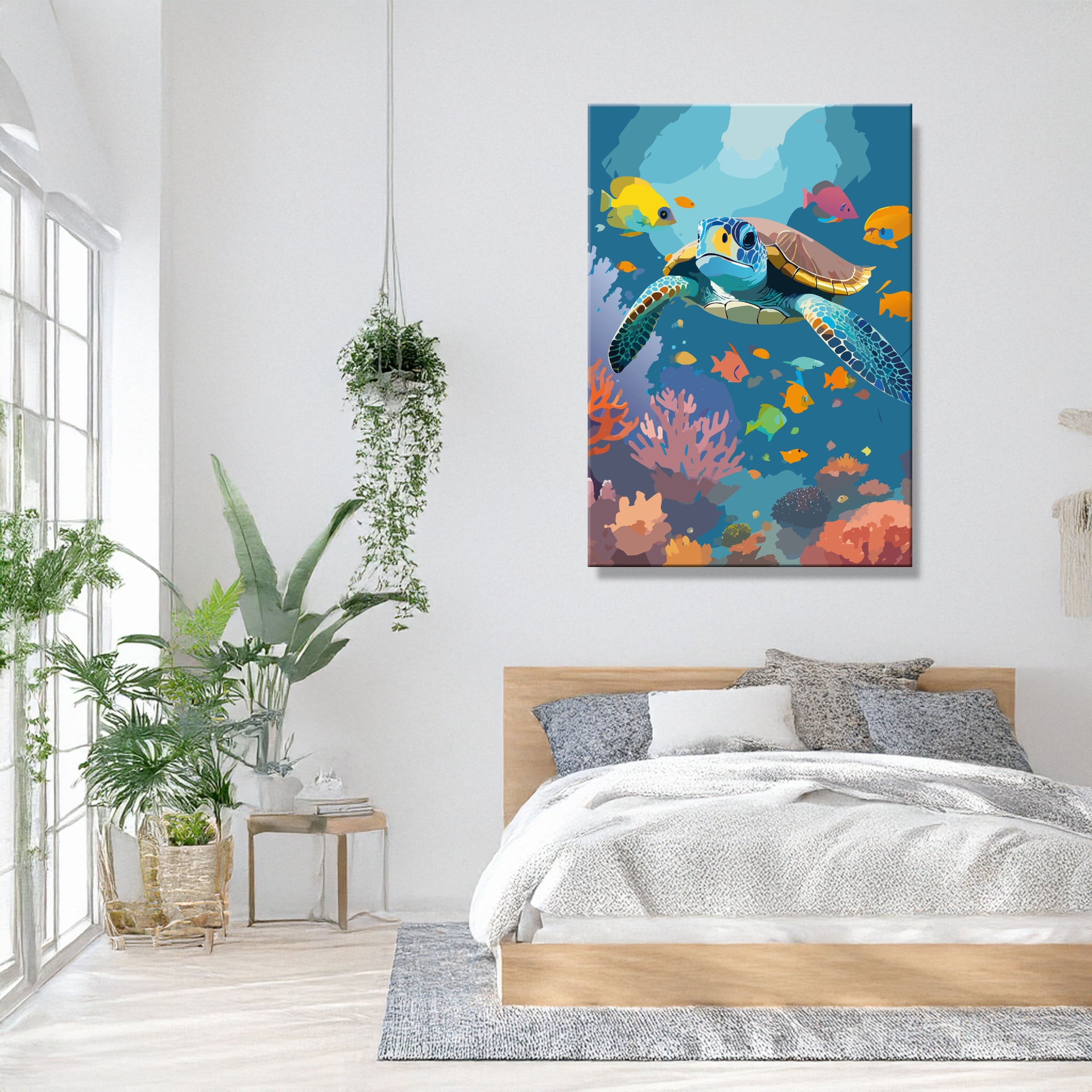 Majestätisch und anmutig gleitet die Schildkröte durch die farbenreiche Unterwasserwelt – umgeben von leuchtenden Korallen und bunten Fischen. Dieses Bild strahlt Ruhe, Tiefe und natürliche Eleganz aus – ein Stück Ozean zum Träumen und Verweilen. Erhältlich in verschiedenen Formaten auf hochwertiger Leinwand.