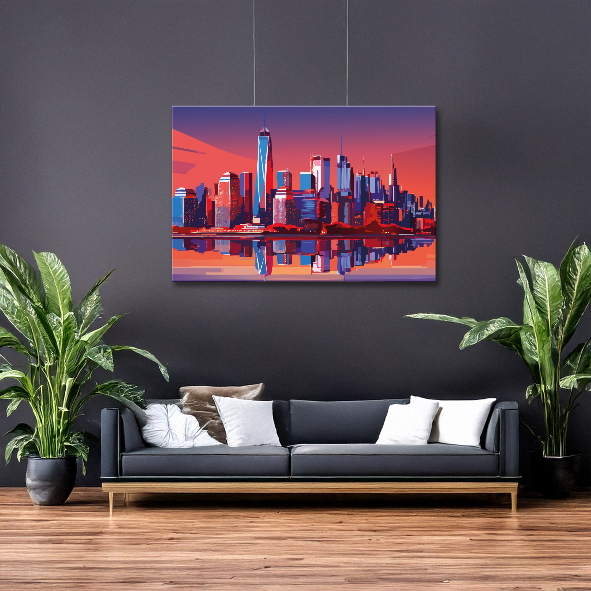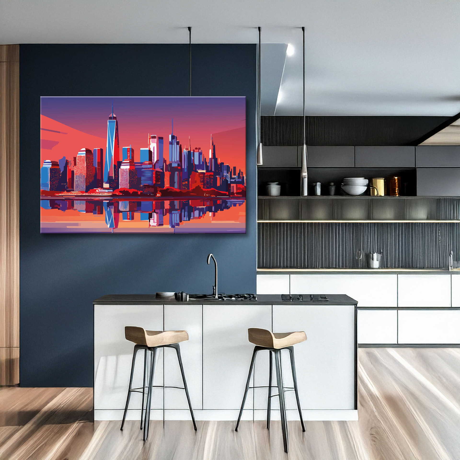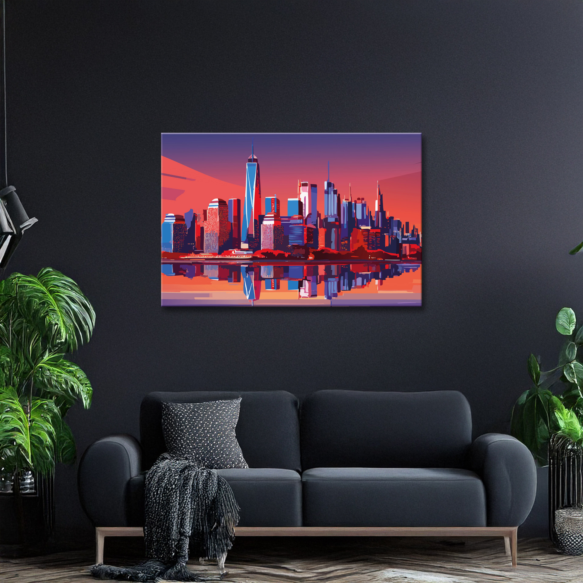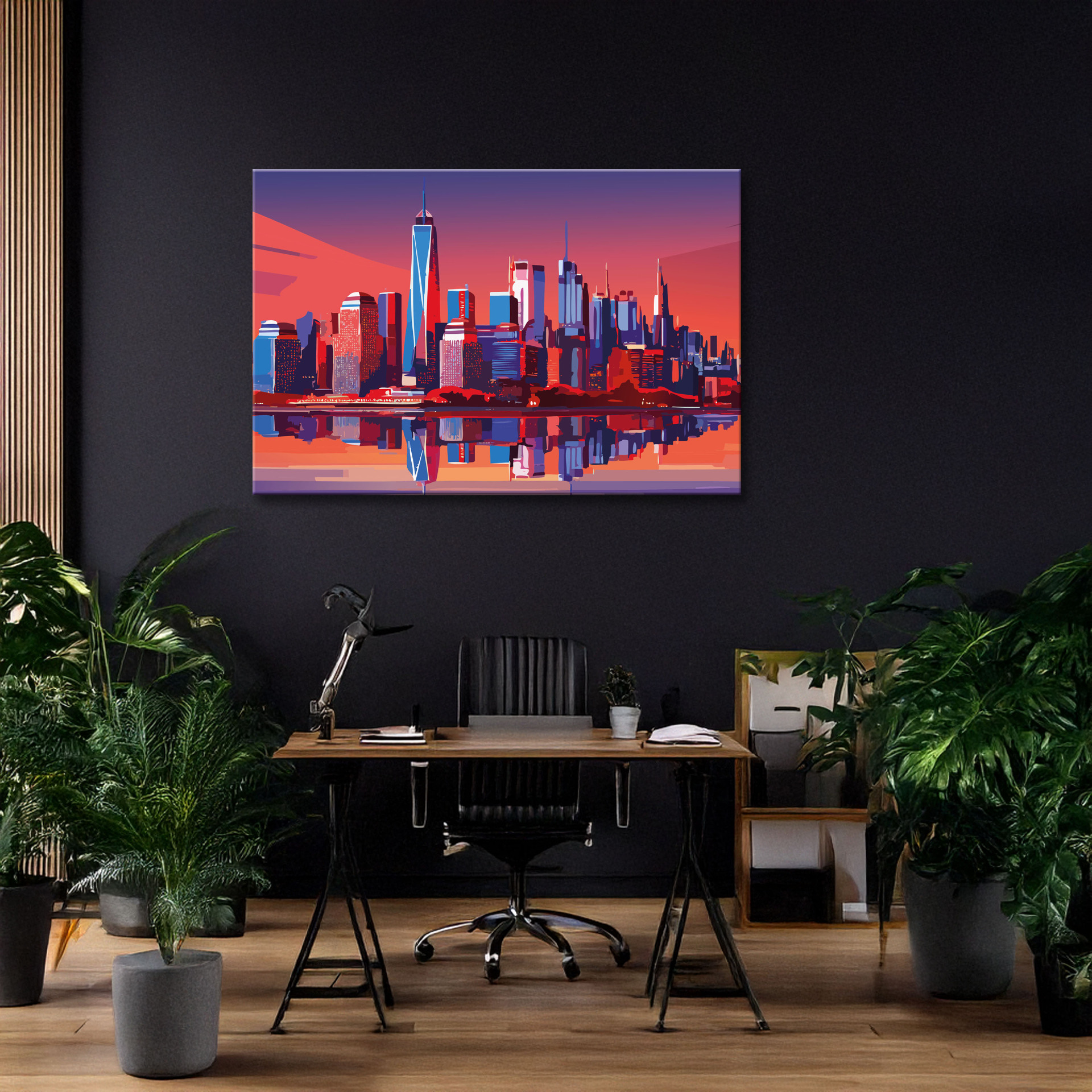Die Skyline von New York erhebt sich majestätisch im Abendlicht, klare Linien und sanfte Farben verschmelzen zu einem urbanen Moment voller Energie und Eleganz. Ein Bild, das Großstadtflair, Stil und Atmosphäre in jeden Raum bringt.