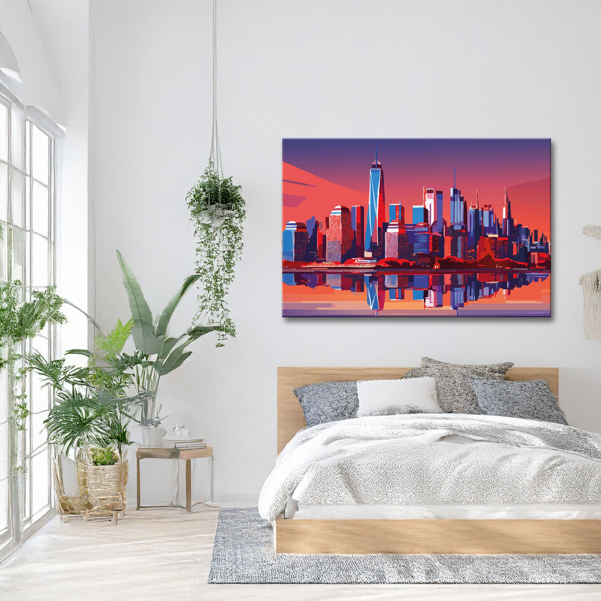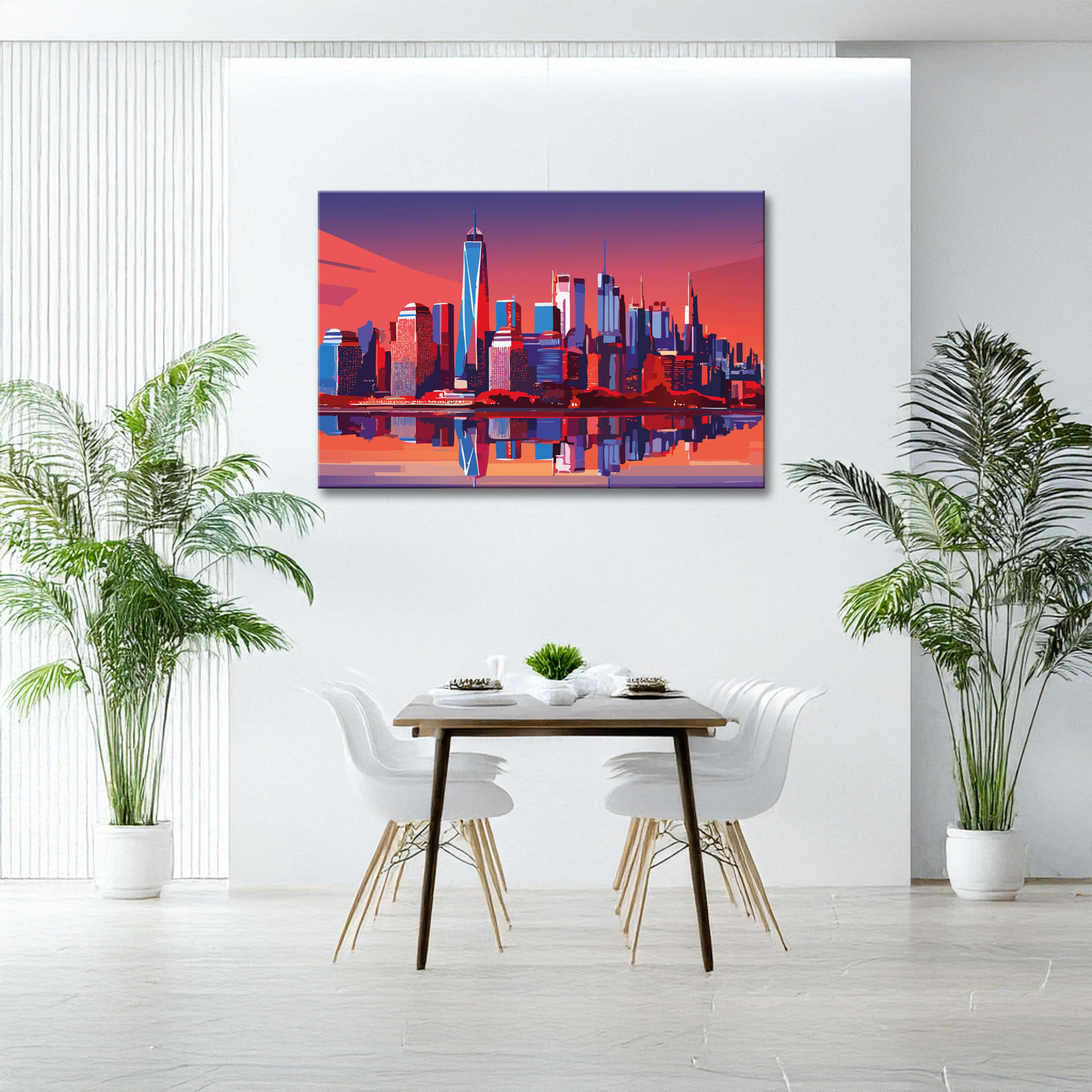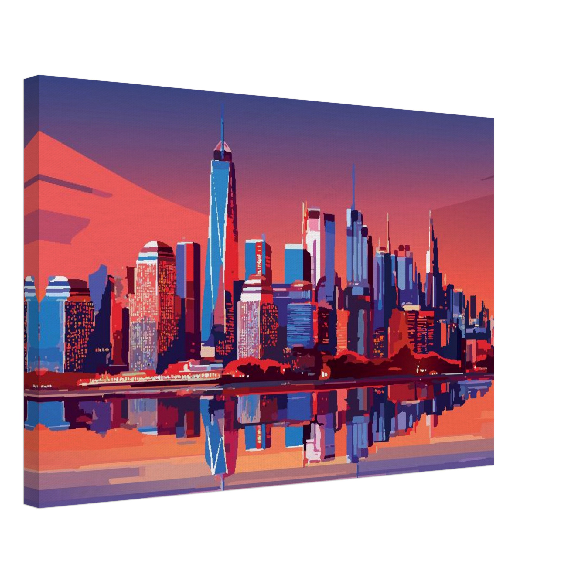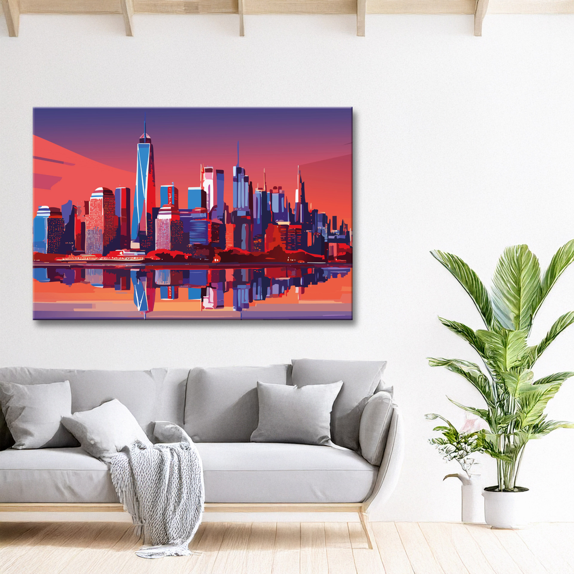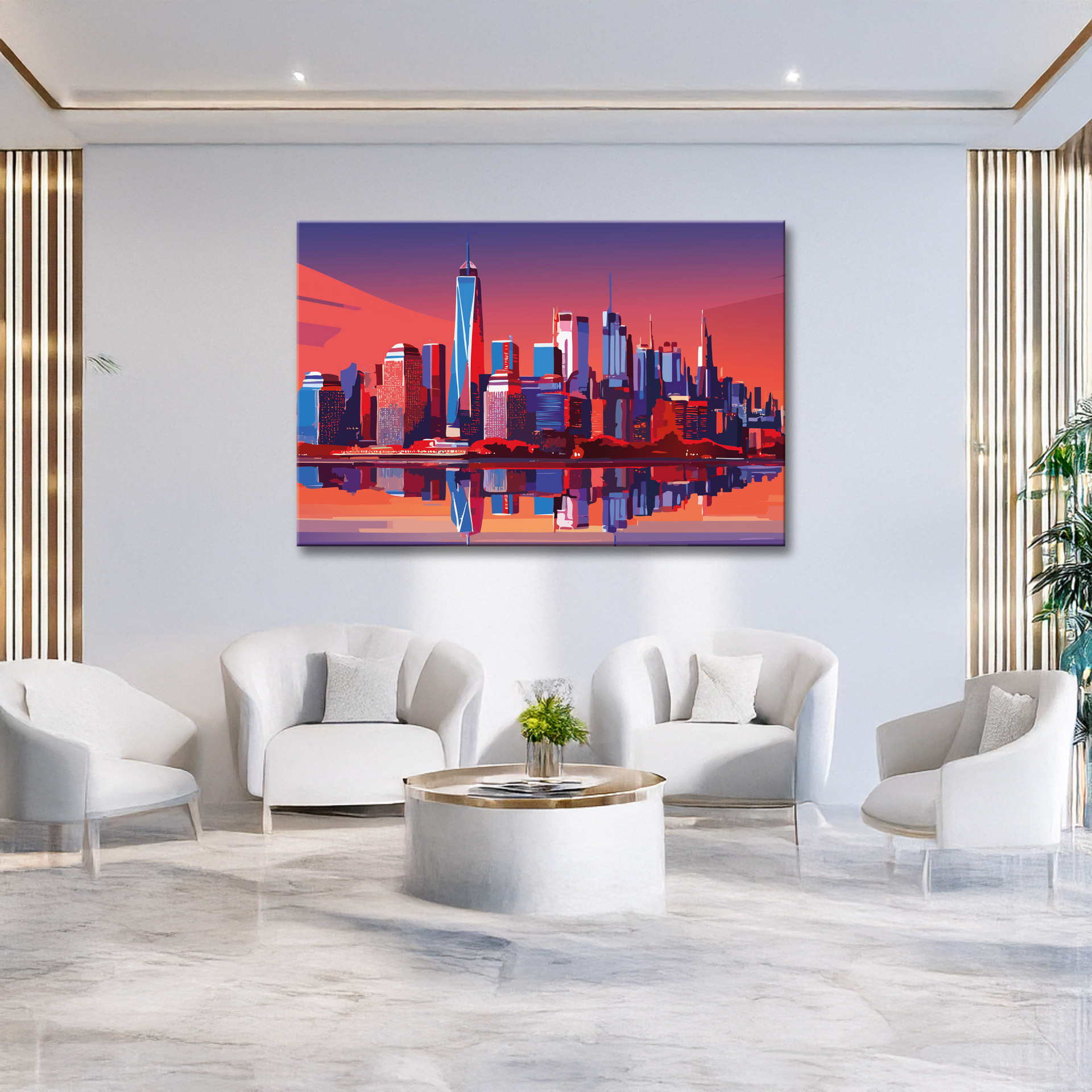 Die Skyline von New York erhebt sich majestätisch im Abendlicht, klare Linien und sanfte Farben verschmelzen zu einem urbanen Moment voller Energie und Eleganz. Ein Bild, das Großstadtflair, Stil und Atmosphäre in jeden Raum bringt.