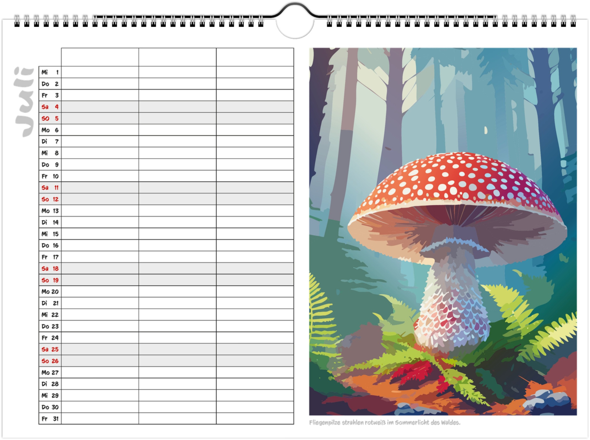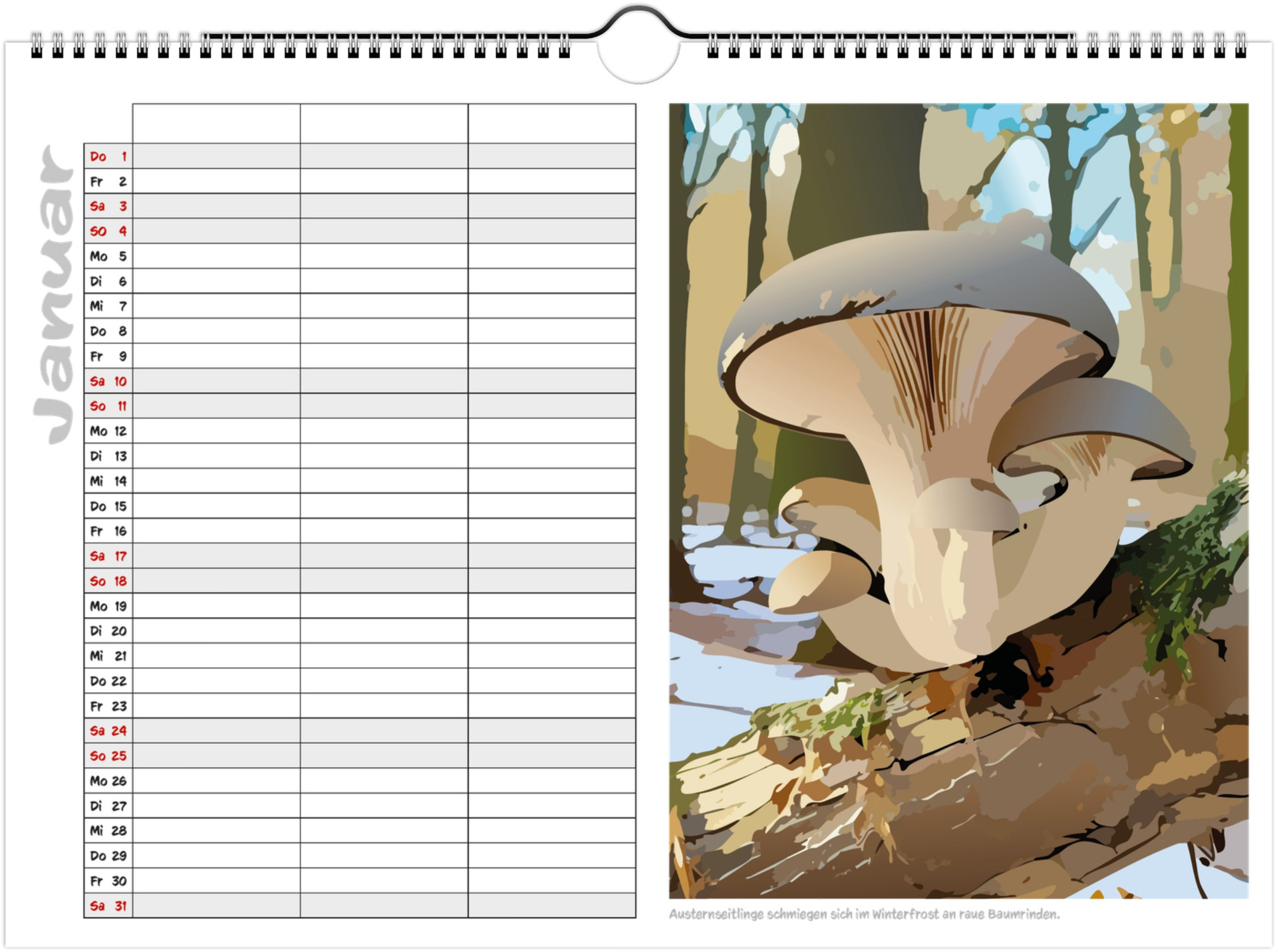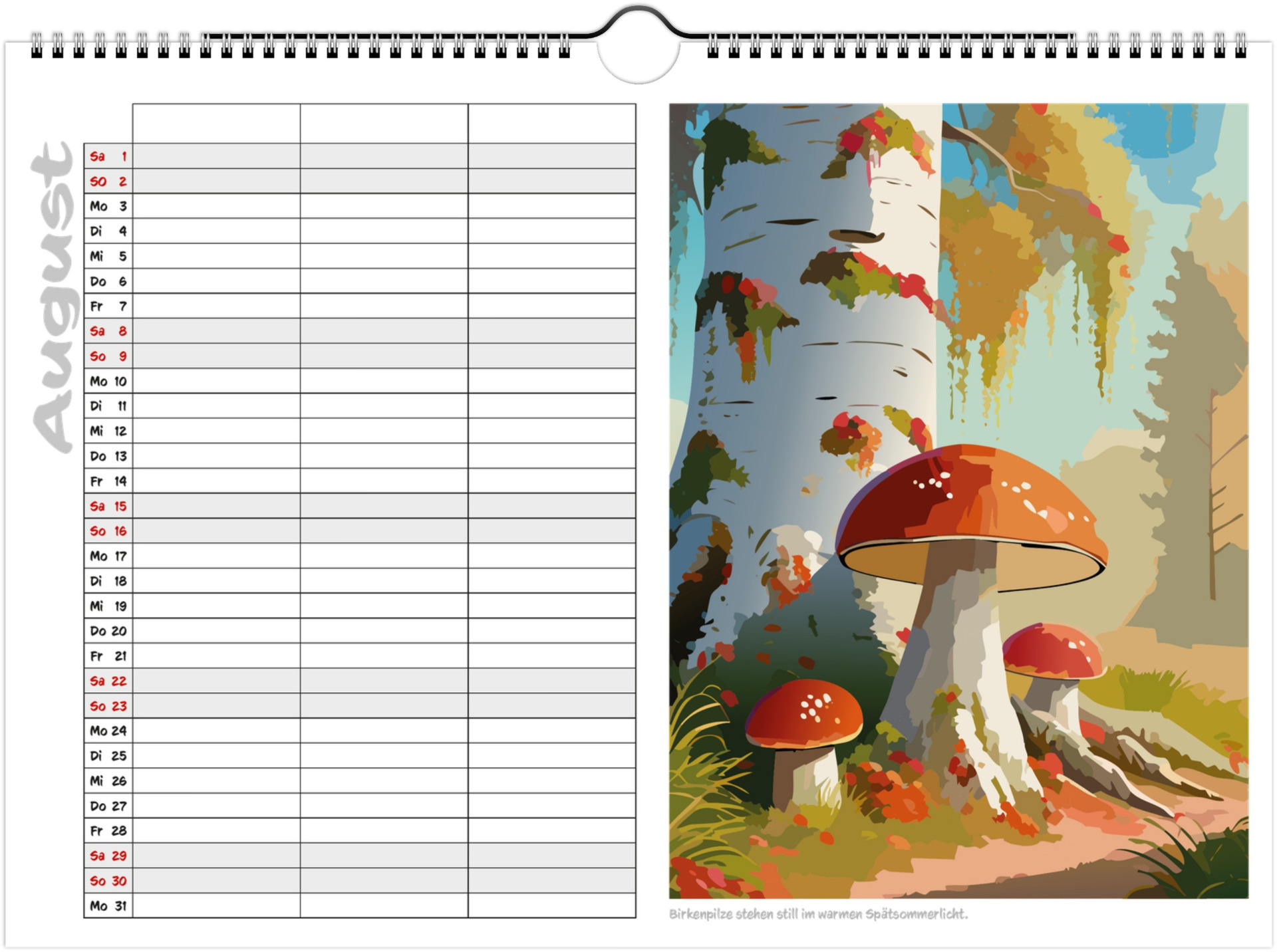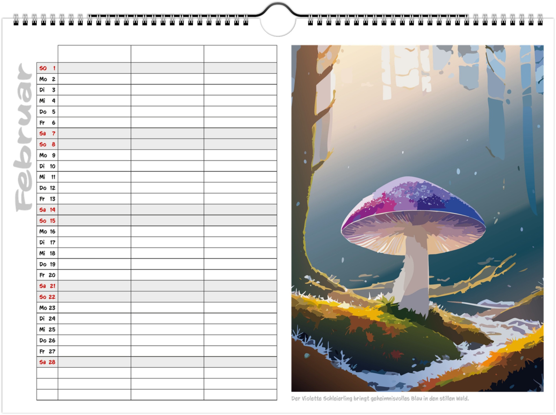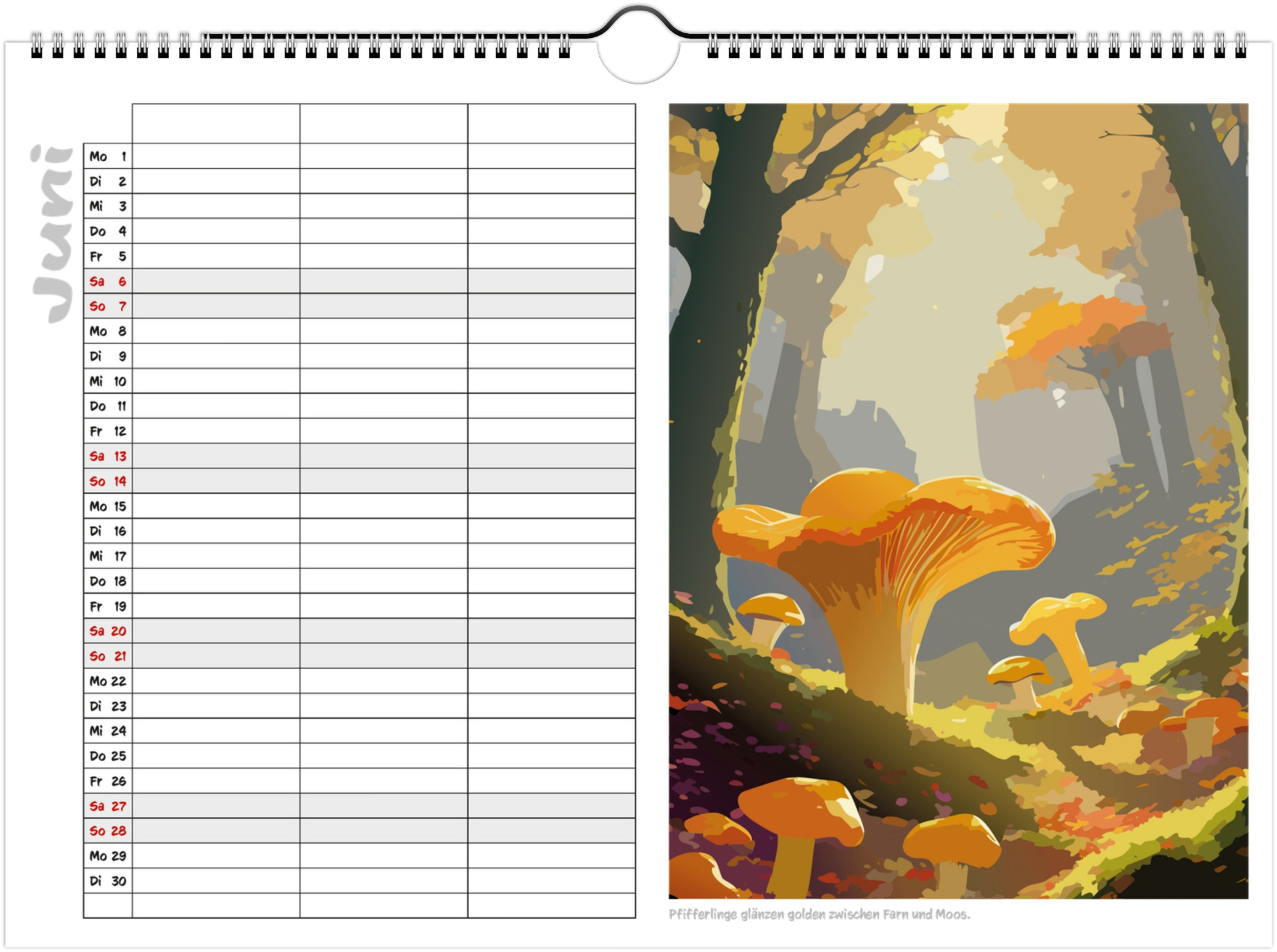 Jeder Monat zeigt liebevoll illustrierte Pilze in ihrer natürlichen Umgebung und bietet viel Platz für Termine, Geburtstage & Notizen.