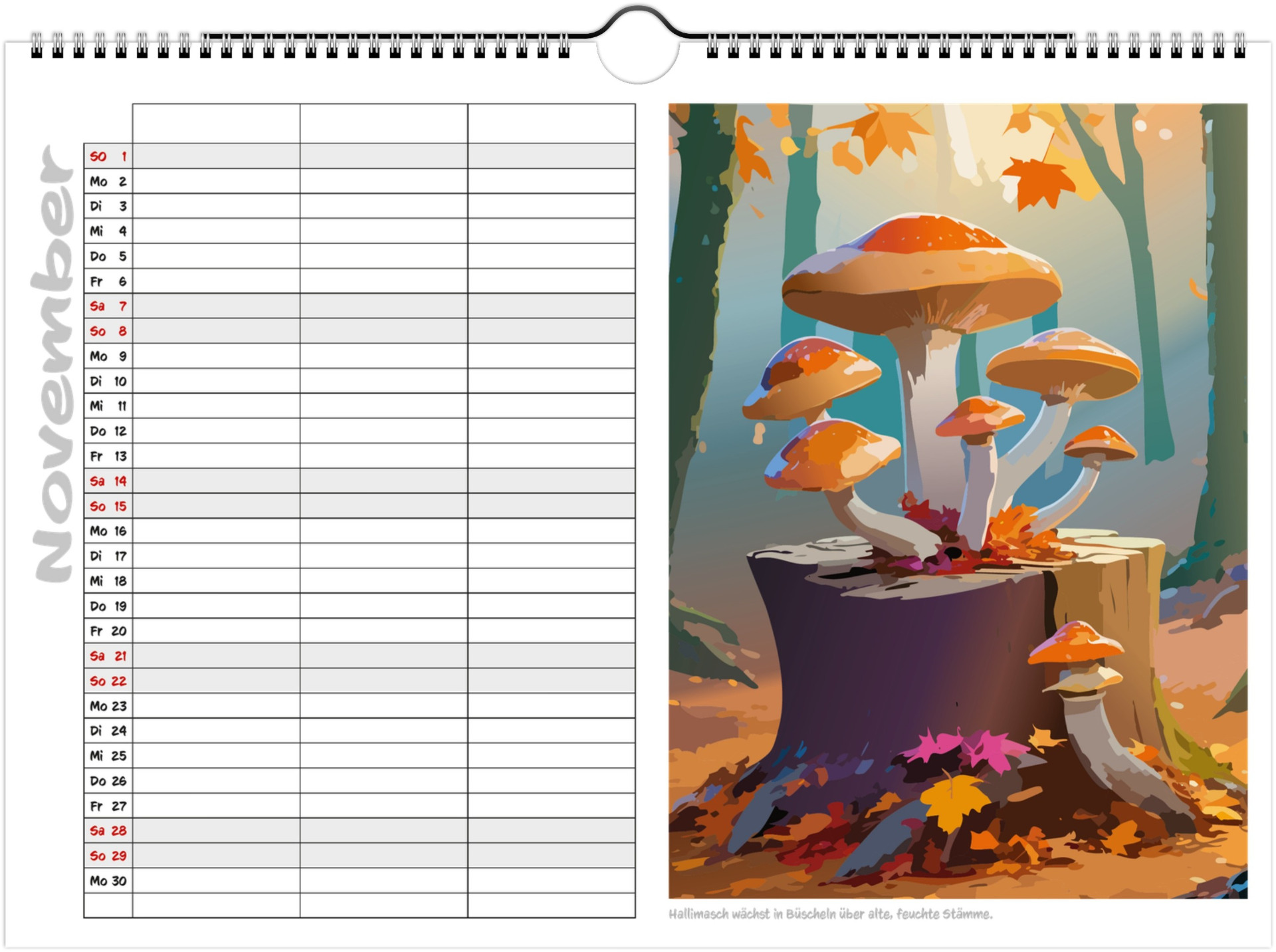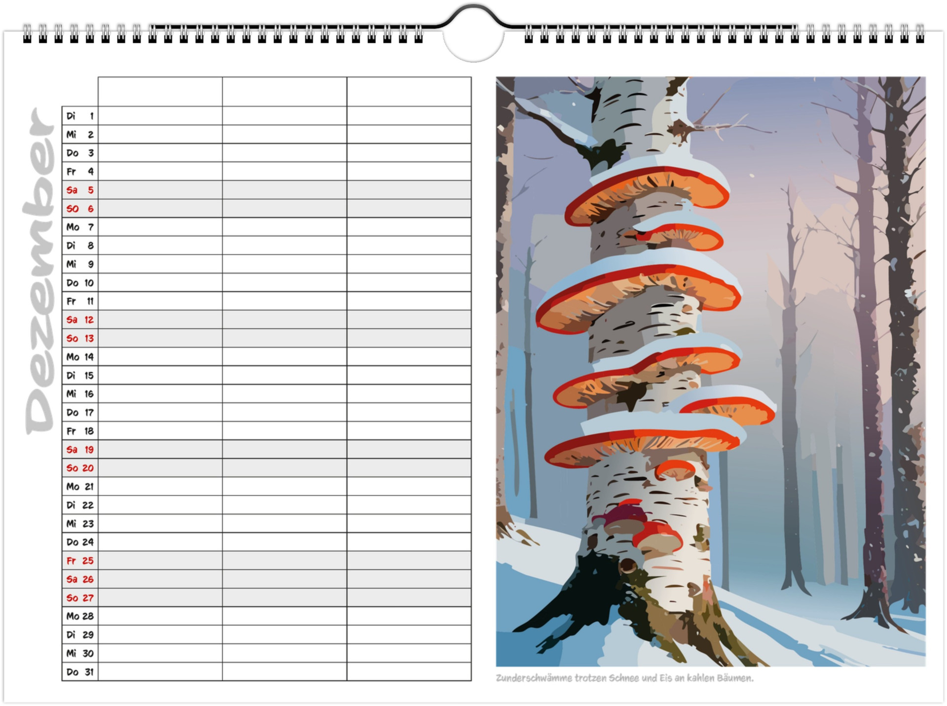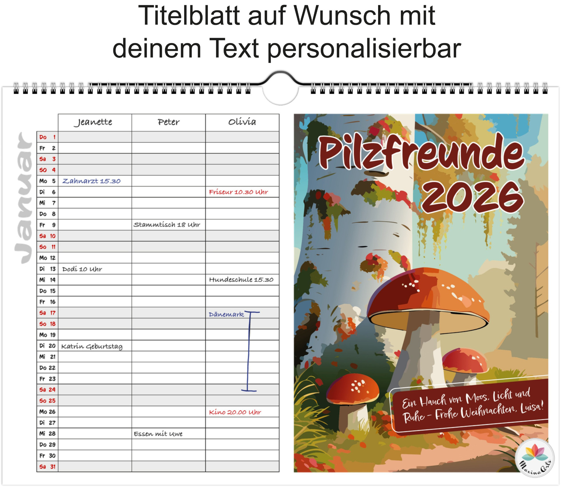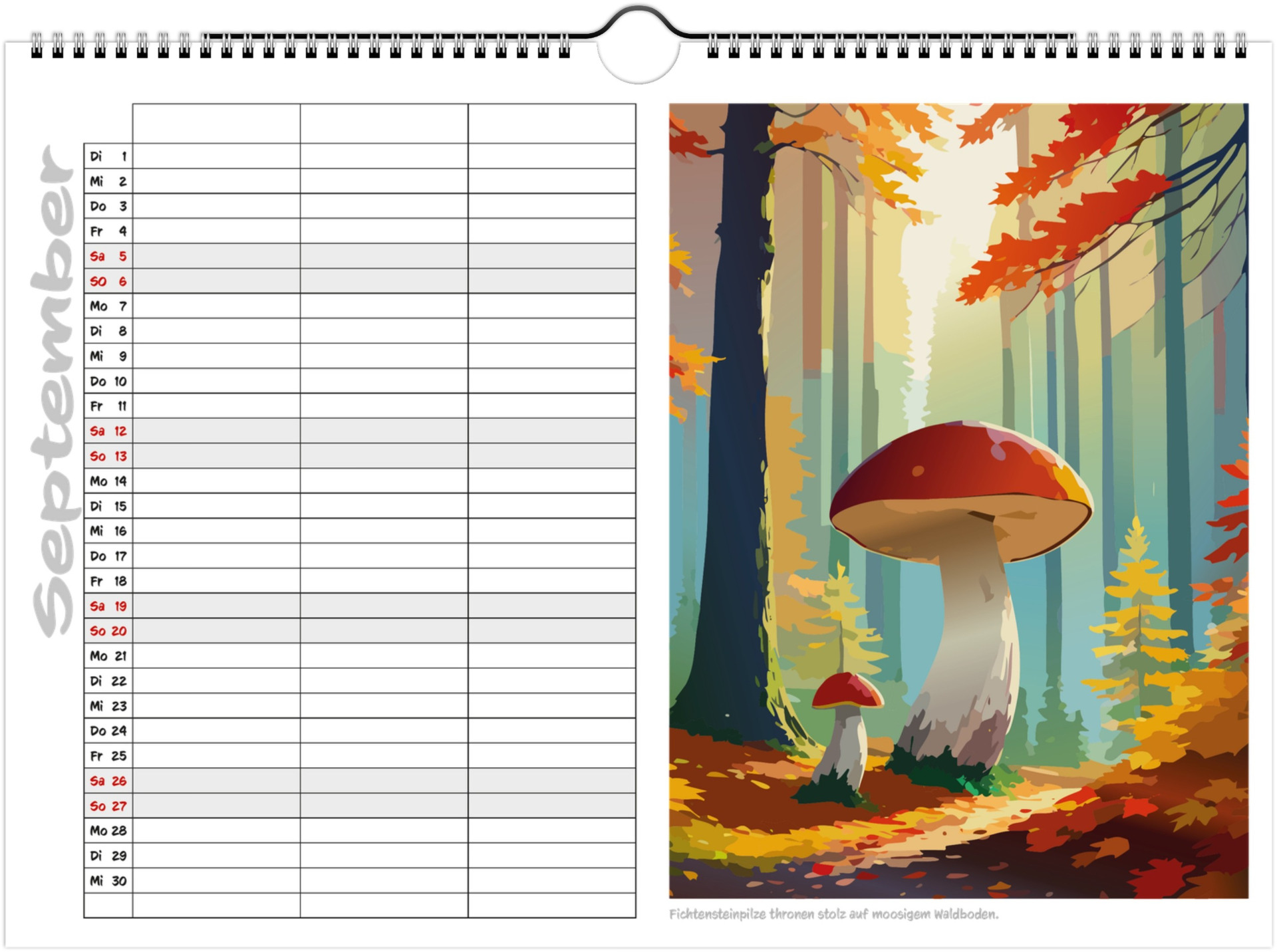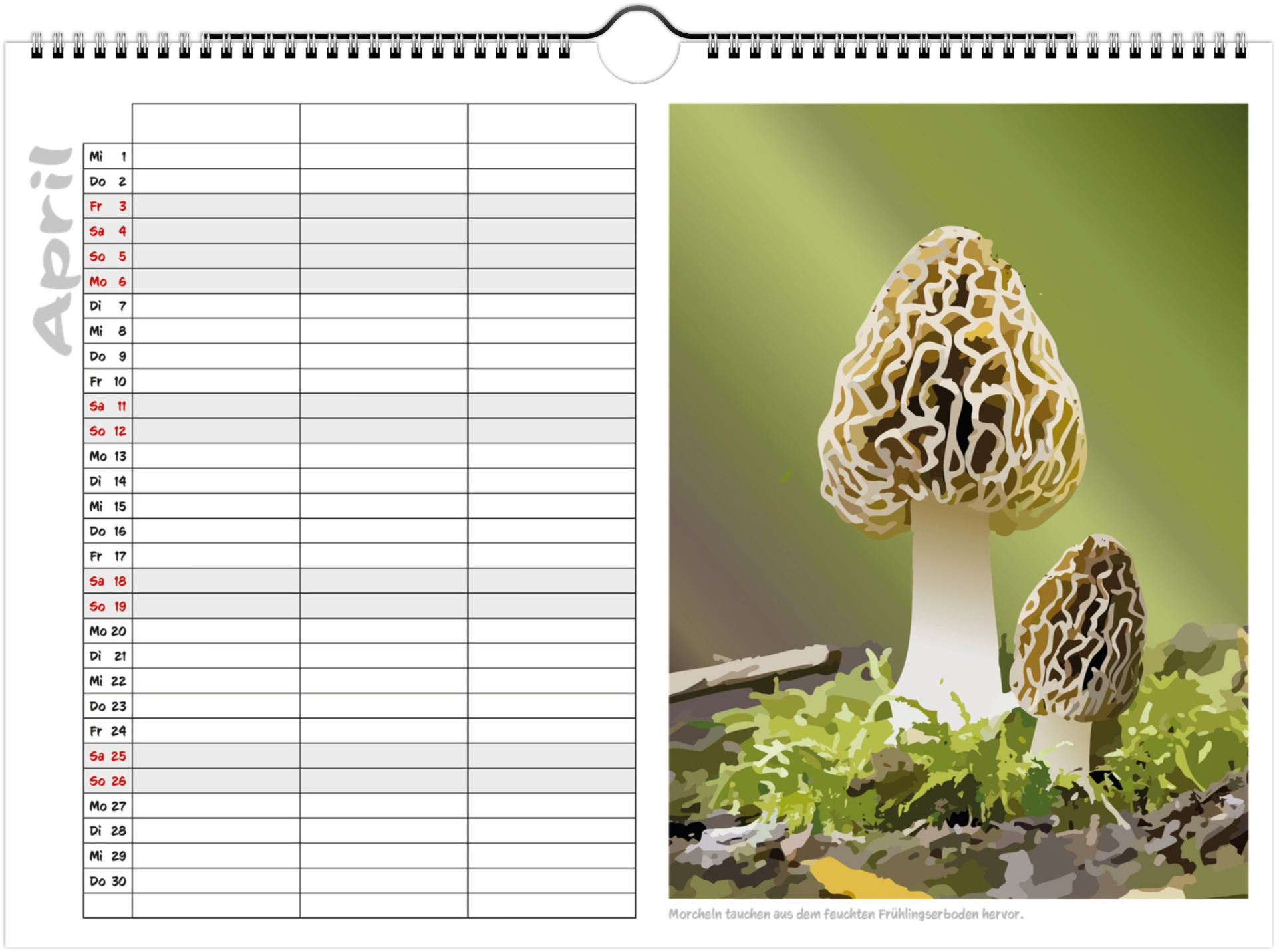 Jeder Monat zeigt liebevoll illustrierte Pilze in ihrer natürlichen Umgebung und bietet viel Platz für Termine, Geburtstage & Notizen.