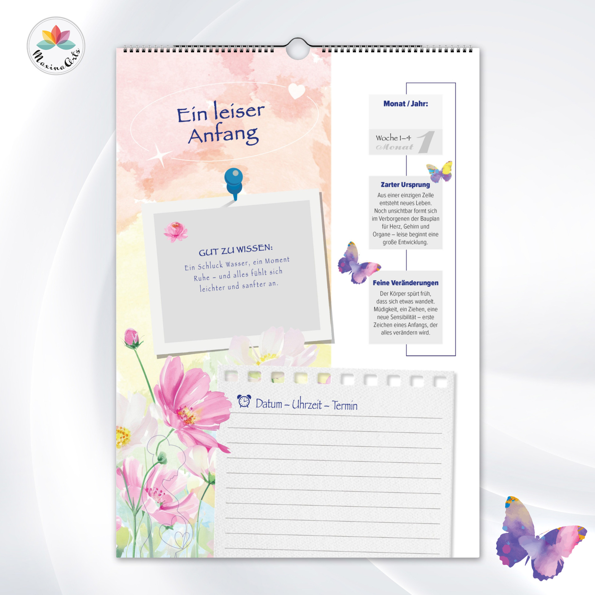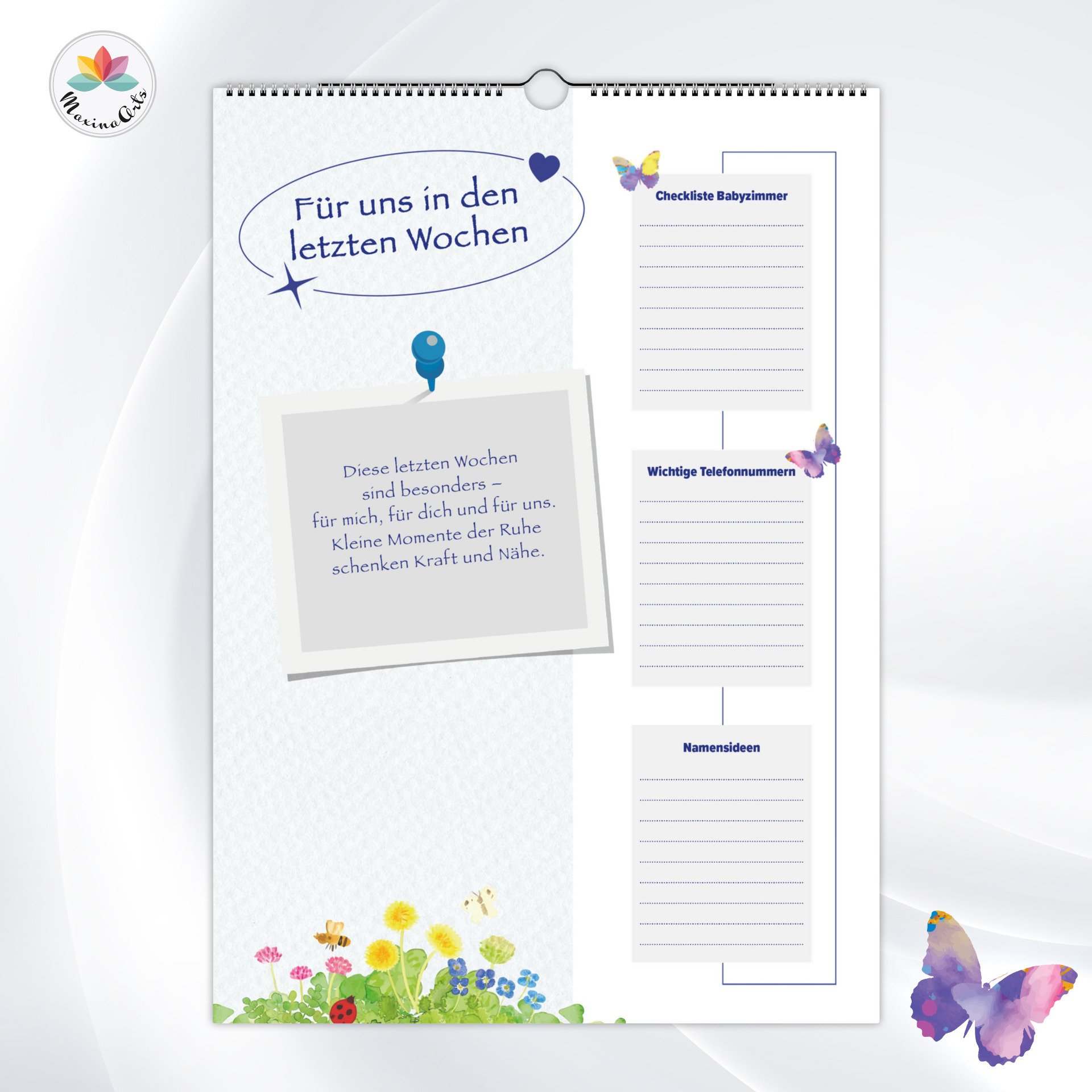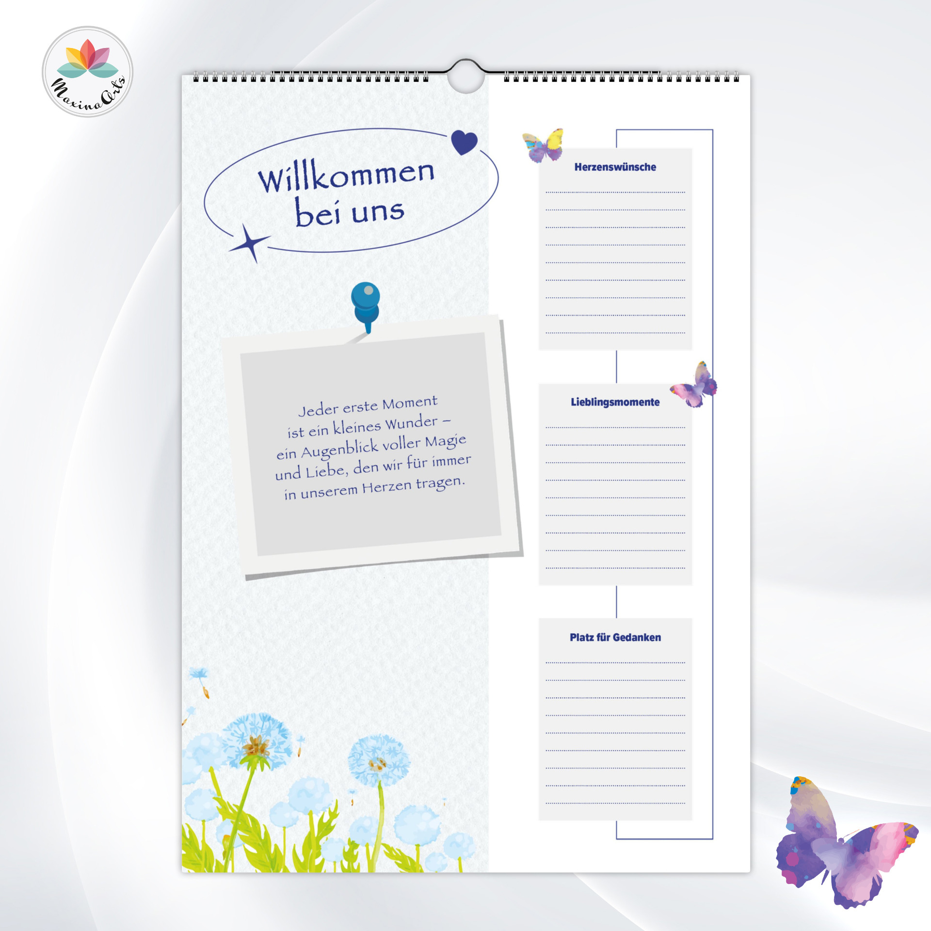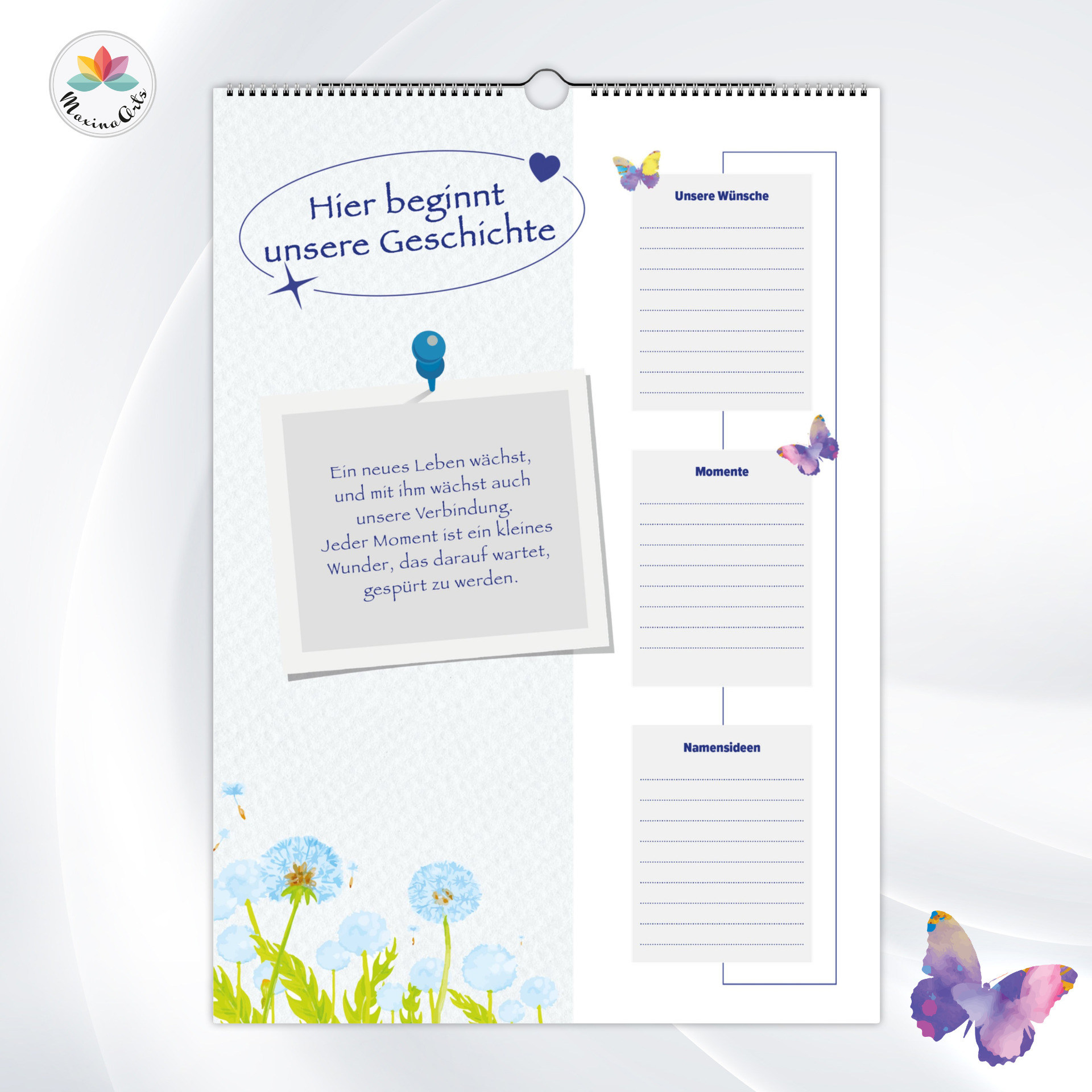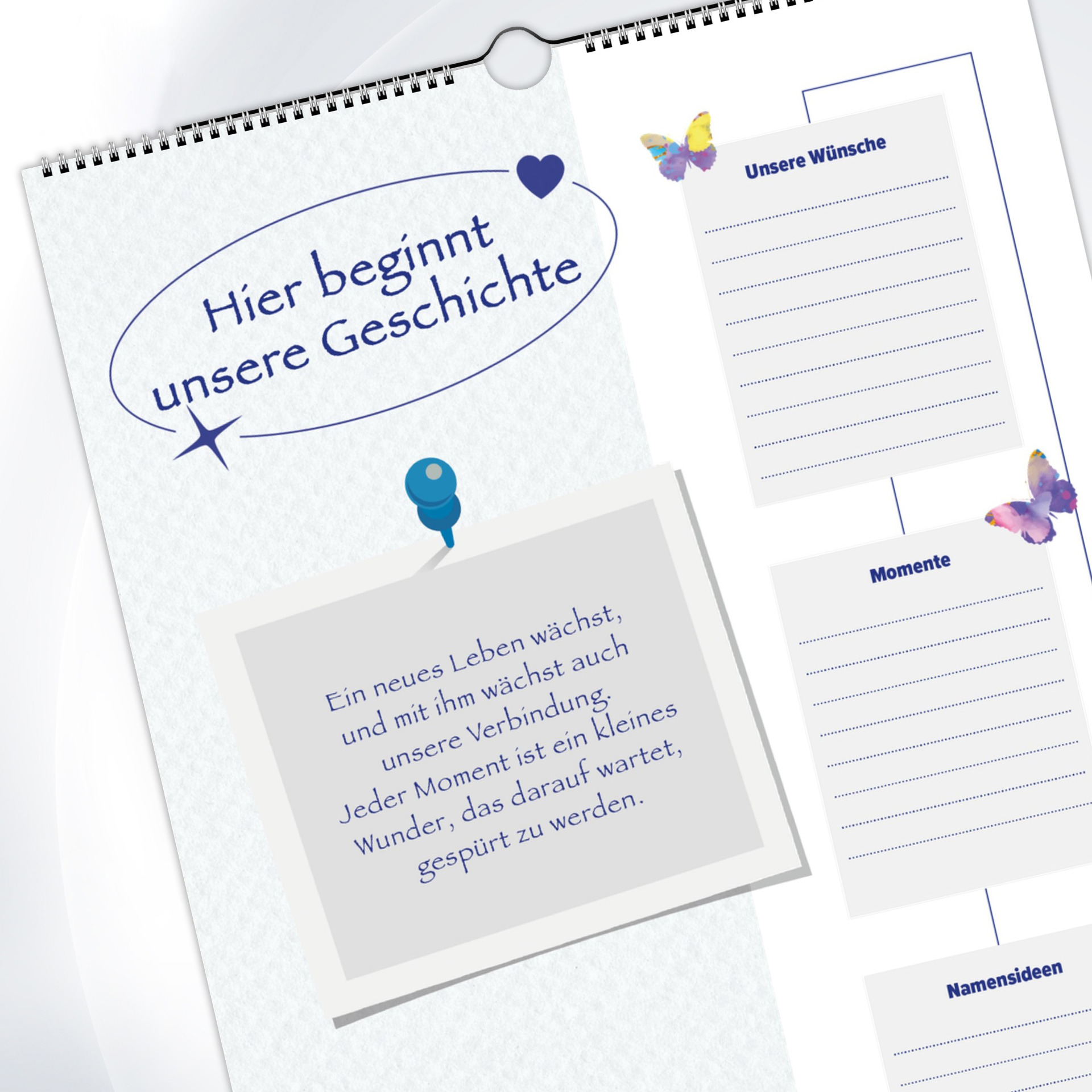 Dieser Schwangerschaftskalender begleitet dich durch die neun besonderen Monate vor der Geburt deines Babys. Monat für Monat erhältst du kurze Informationen zur Entwicklung von Mutter und Kind und hast gleichzeitig Platz für persönliche Notizen und Fotos. So entsteht eine liebevolle Erinnerung an eine einzigartige Zeit voller Vorfreude.