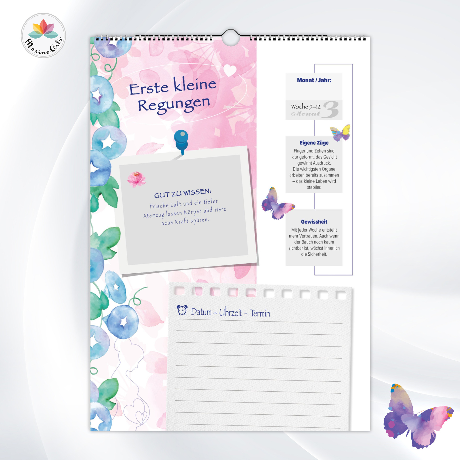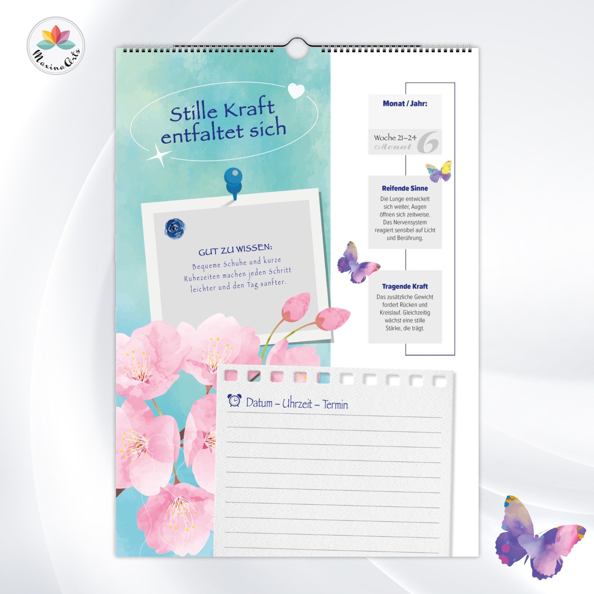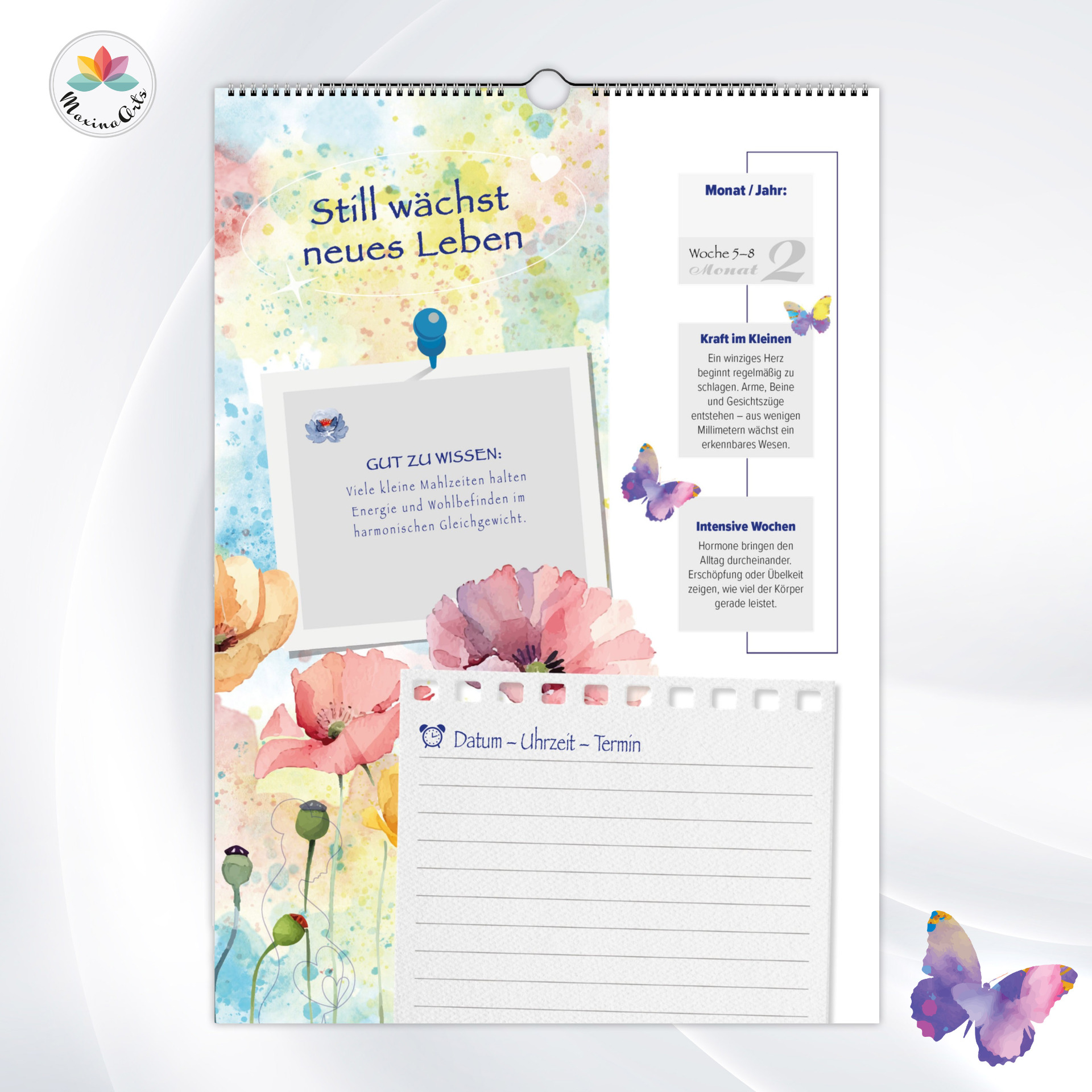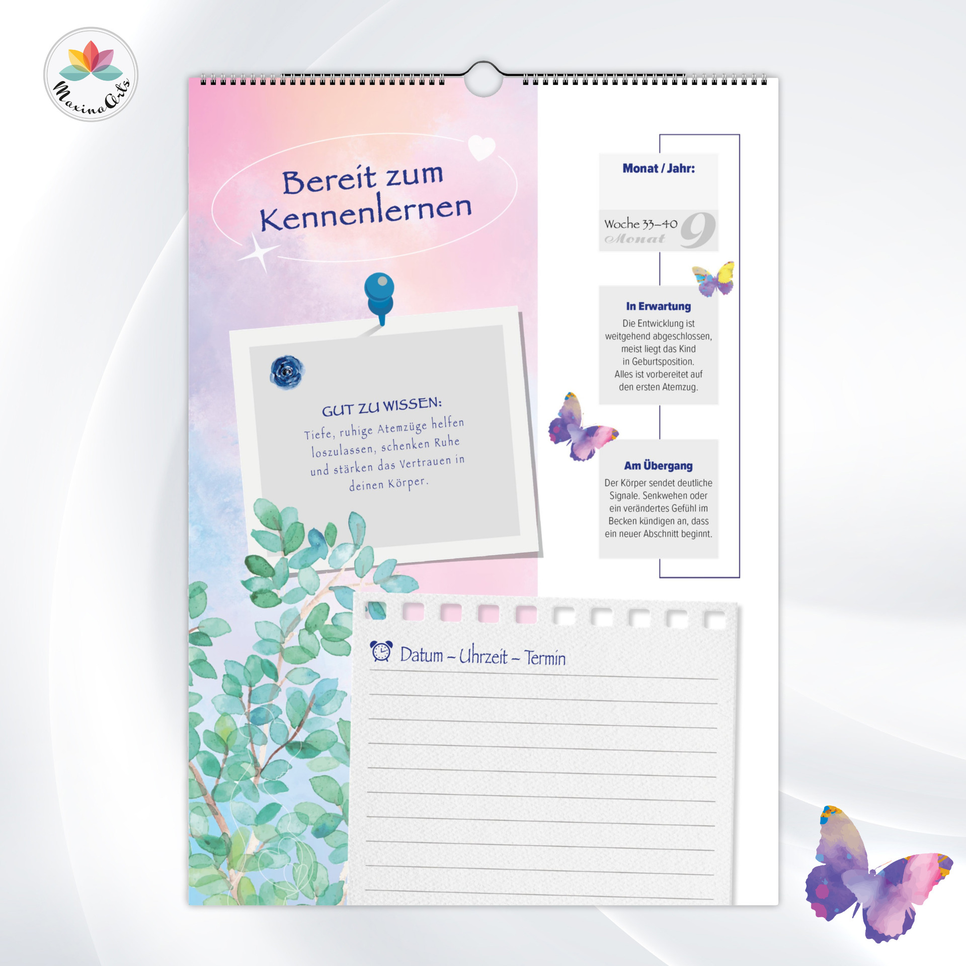 Dieser Schwangerschaftskalender begleitet dich durch die neun besonderen Monate vor der Geburt deines Babys. Monat für Monat erhältst du kurze Informationen zur Entwicklung von Mutter und Kind und hast gleichzeitig Platz für persönliche Notizen und Fotos. So entsteht eine liebevolle Erinnerung an eine einzigartige Zeit voller Vorfreude.