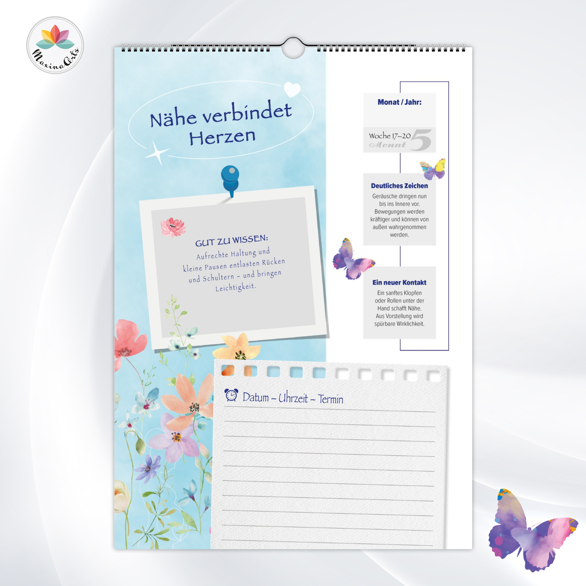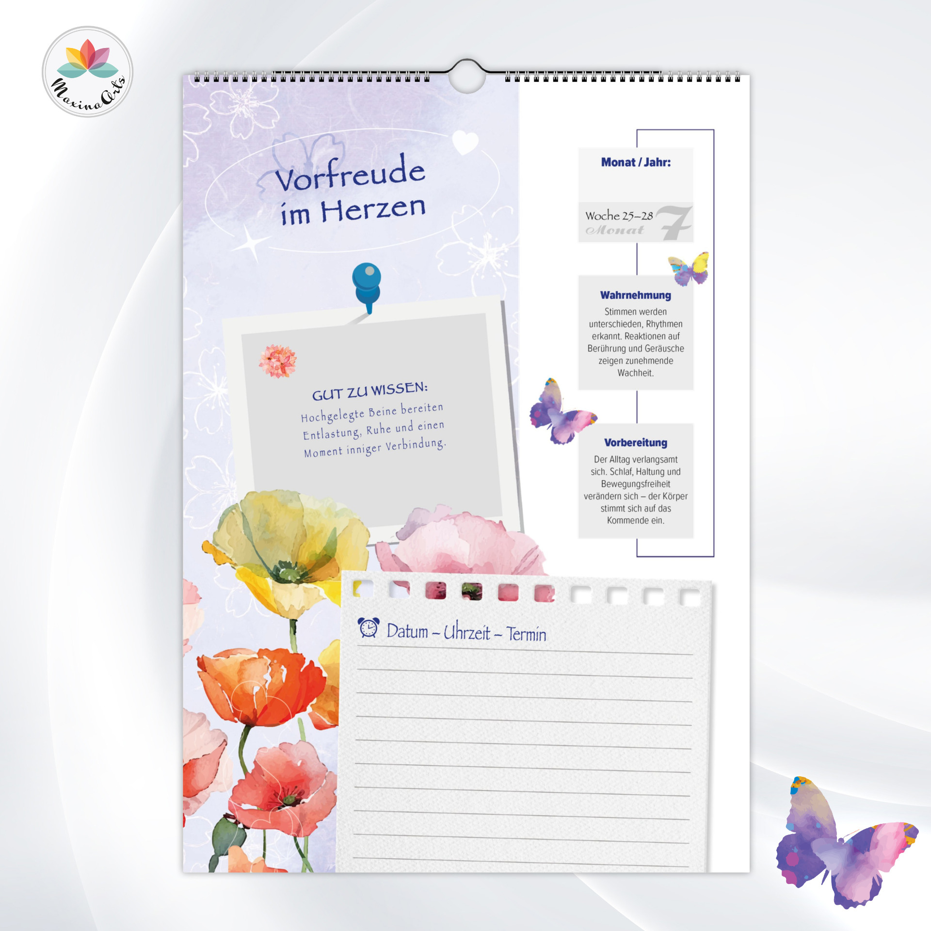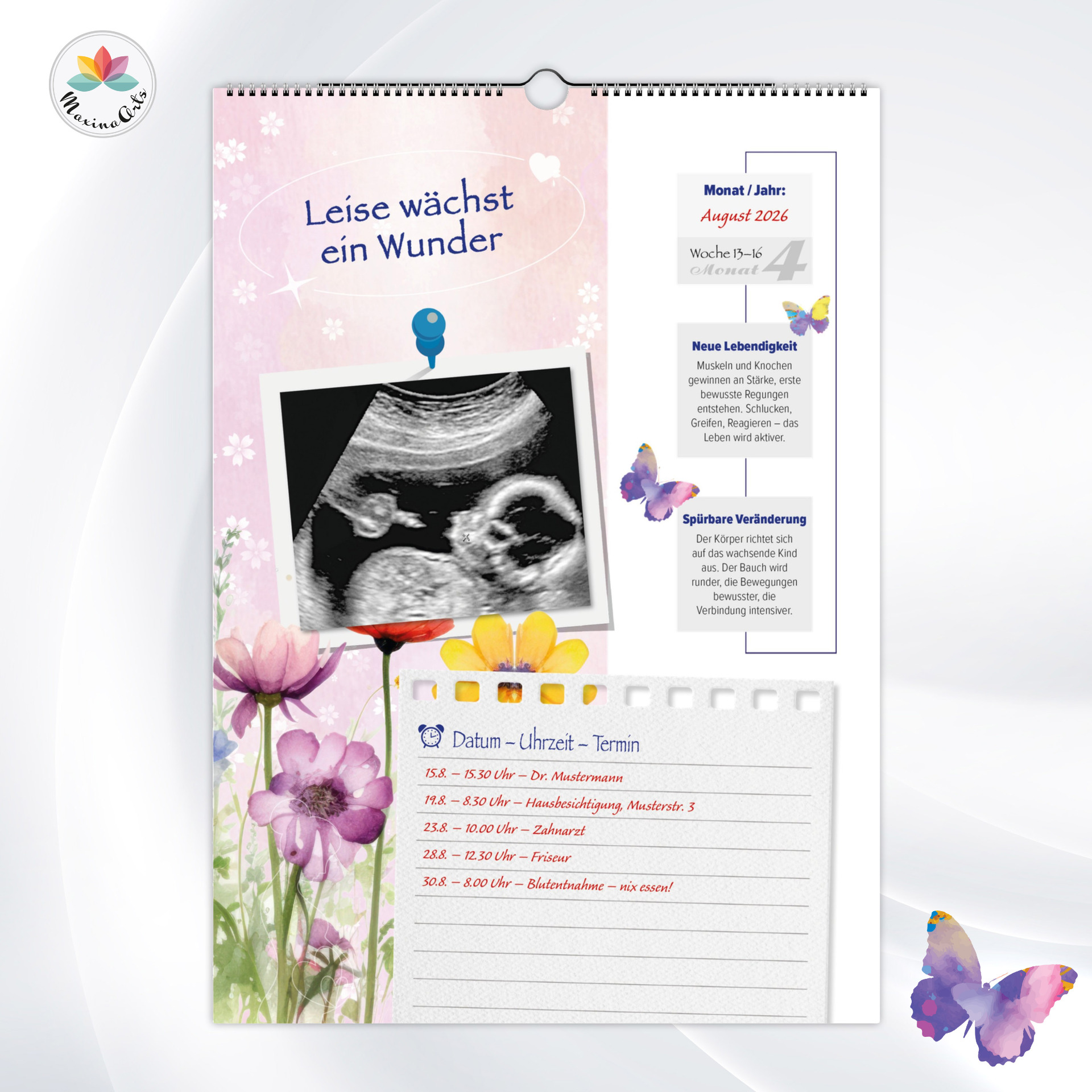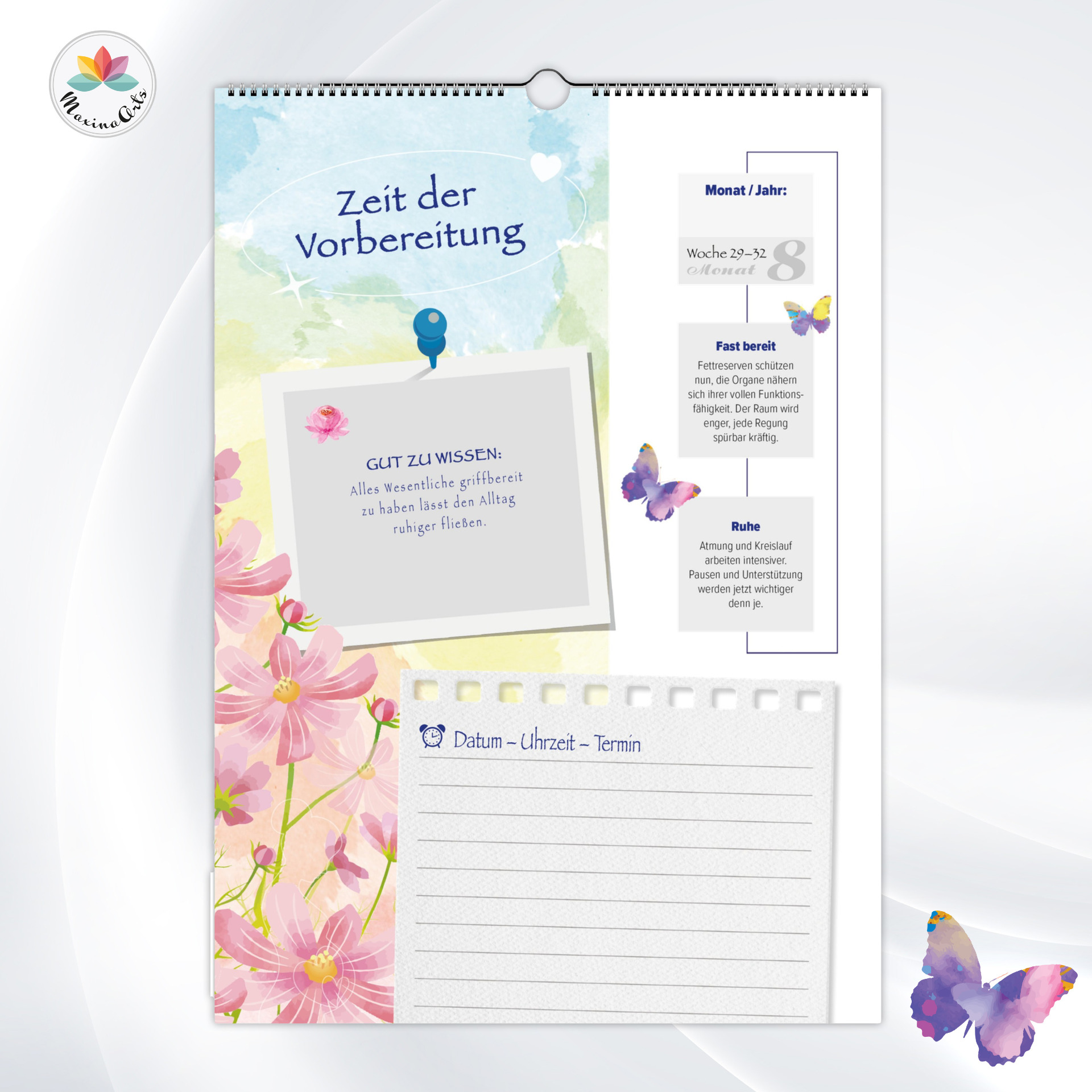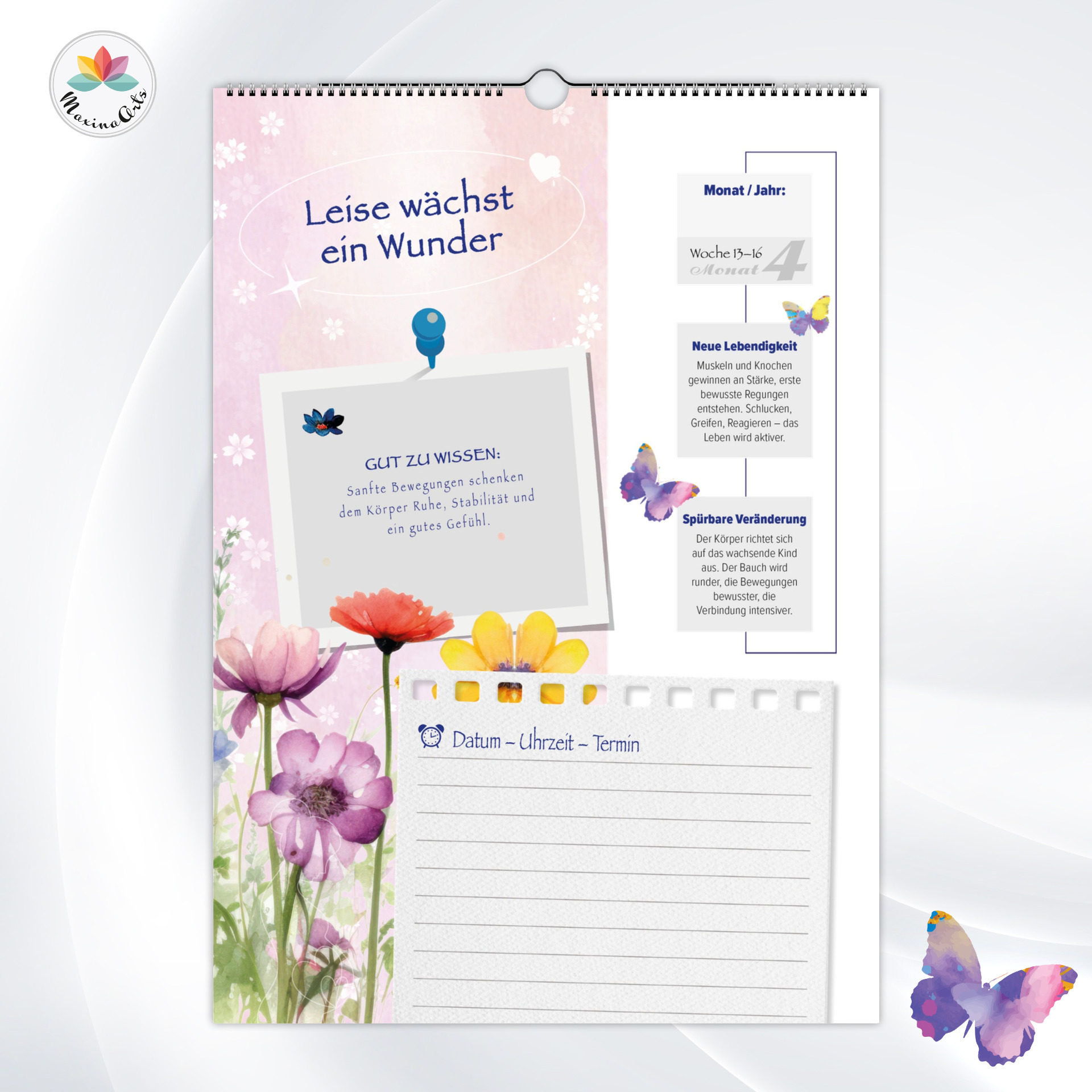Dieser Schwangerschaftskalender begleitet dich durch die neun besonderen Monate vor der Geburt deines Babys. Monat für Monat erhältst du kurze Informationen zur Entwicklung von Mutter und Kind und hast gleichzeitig Platz für persönliche Notizen und Fotos. So entsteht eine liebevolle Erinnerung an eine einzigartige Zeit voller Vorfreude.
