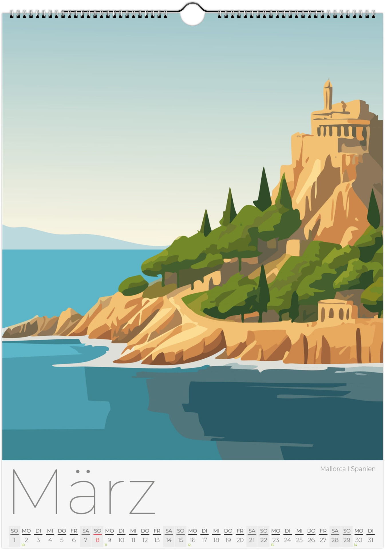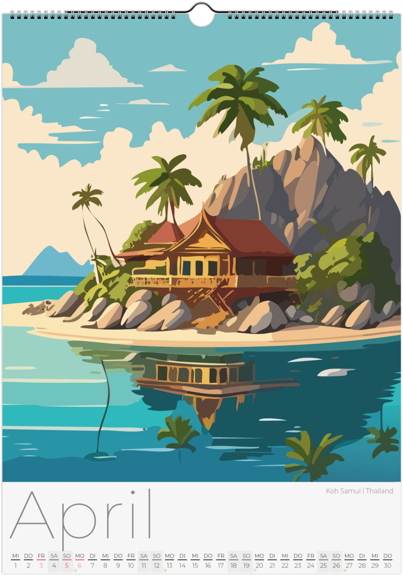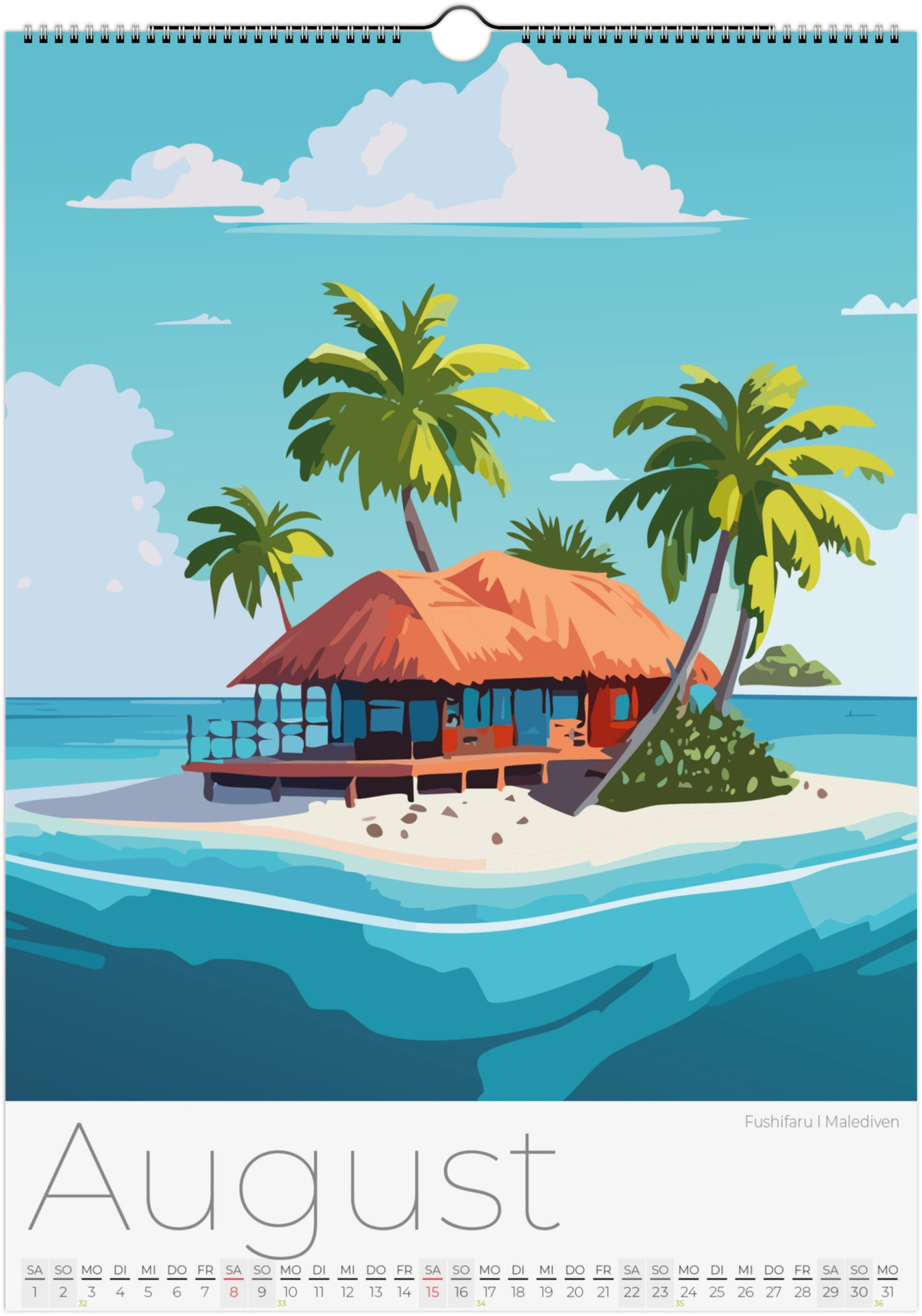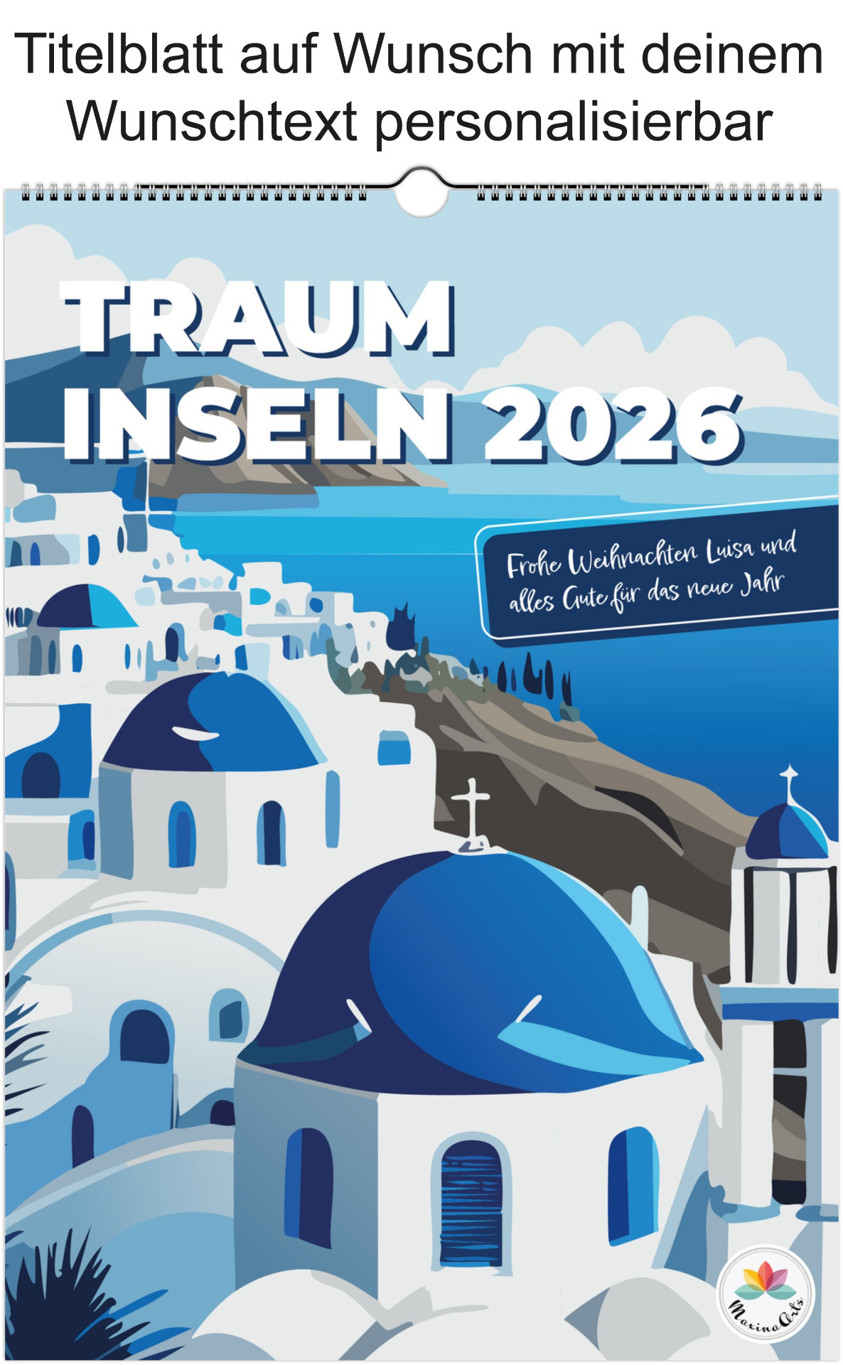 Der Trauminseln Kalender 2026 zeigt 12 wunderschöne Illustrationen tropischer und mediterraner Inseln – perfekt für Reisefans, Sommerfreunde und Meer-Liebhaber.