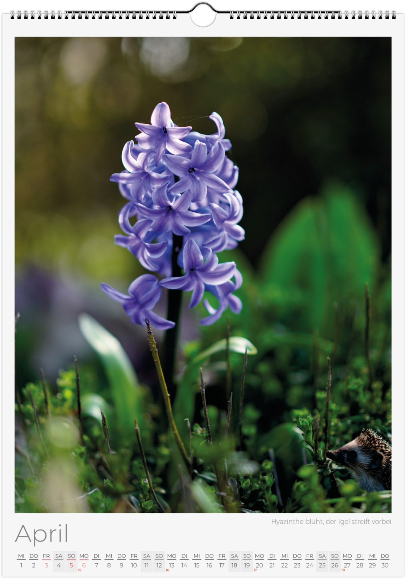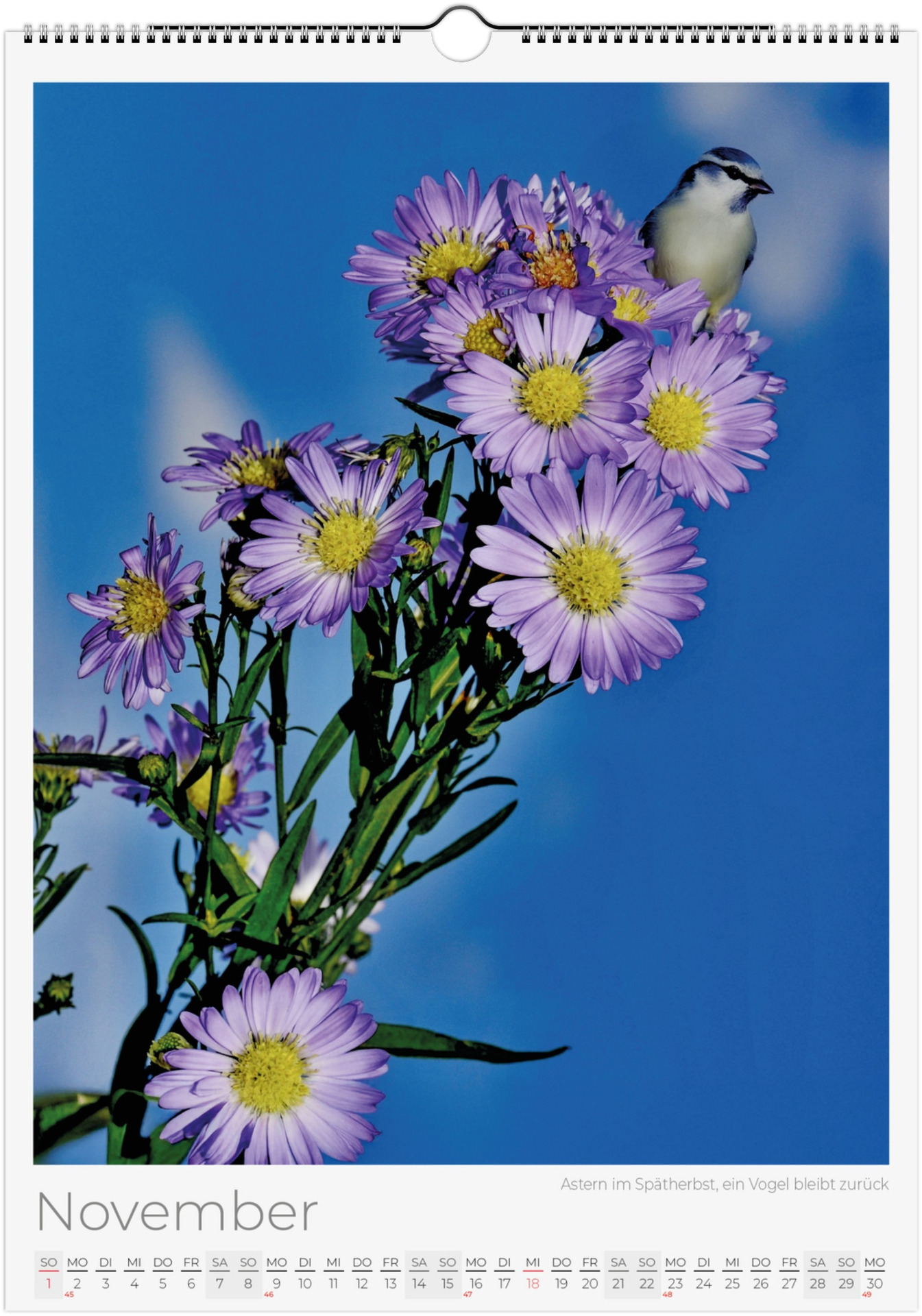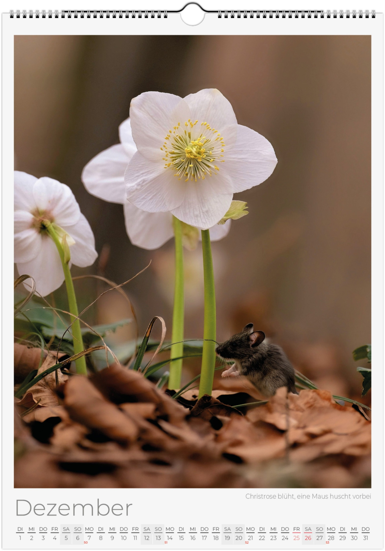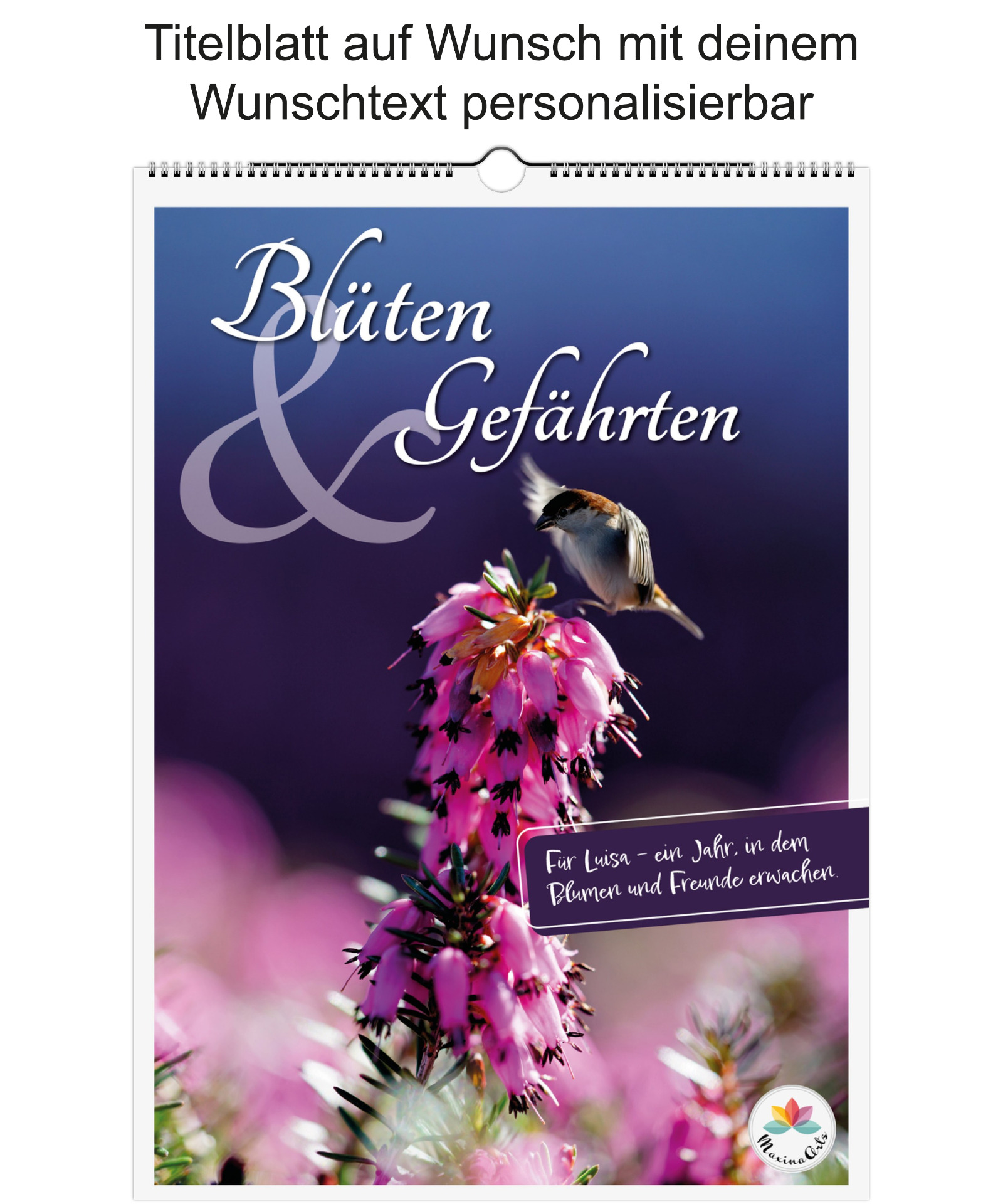 12 Monate voller blühender Farben und kleiner tierischer Begleiter. Jeder Monat zeigt eine sorgfältig gestaltete Blumen-Illustration mit einem charmanten Tier, das die Szene lebendig macht.