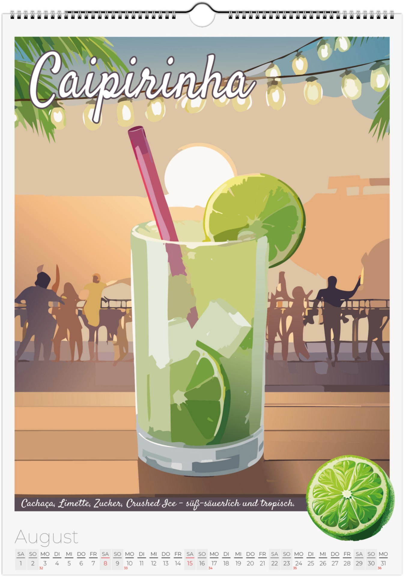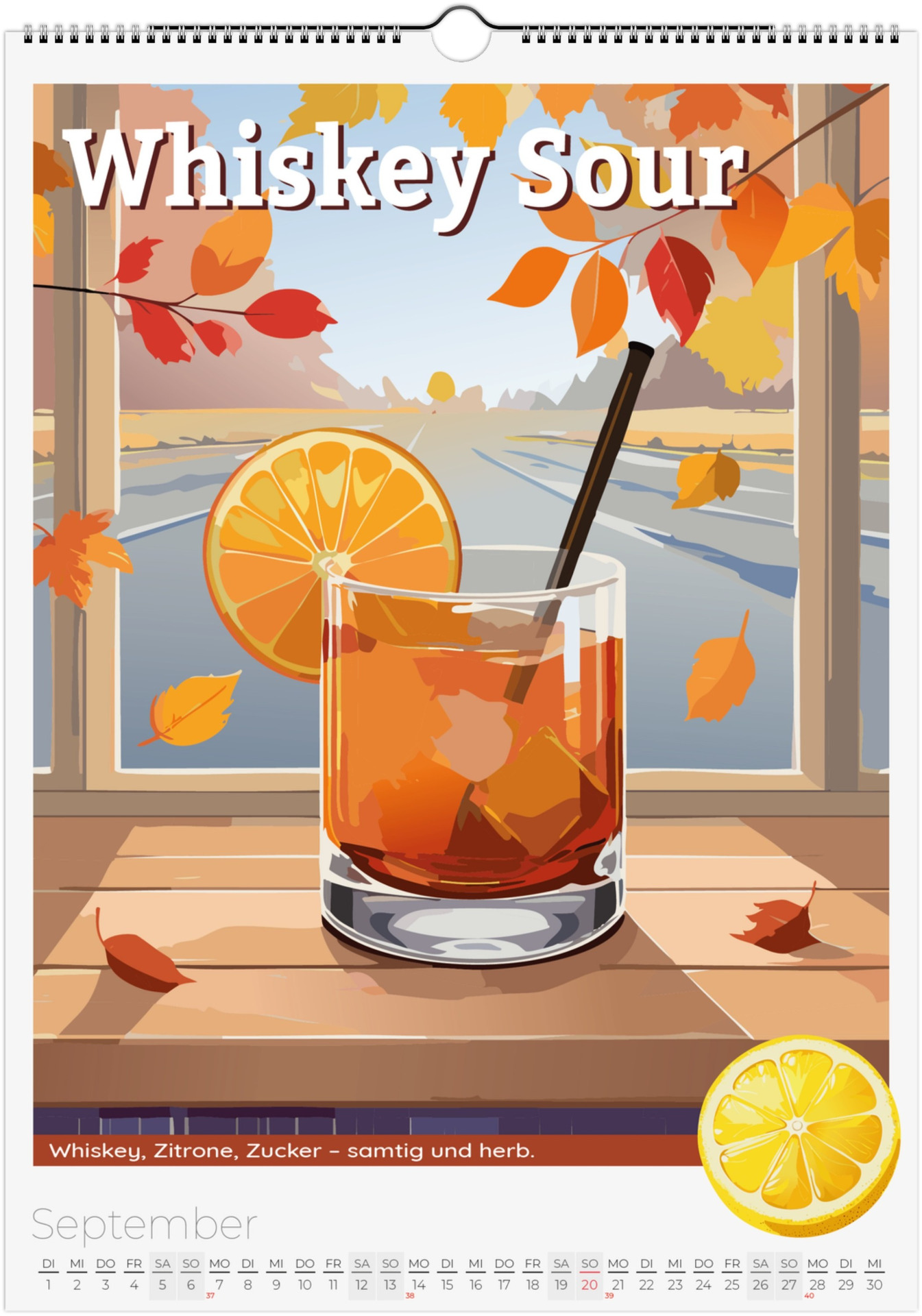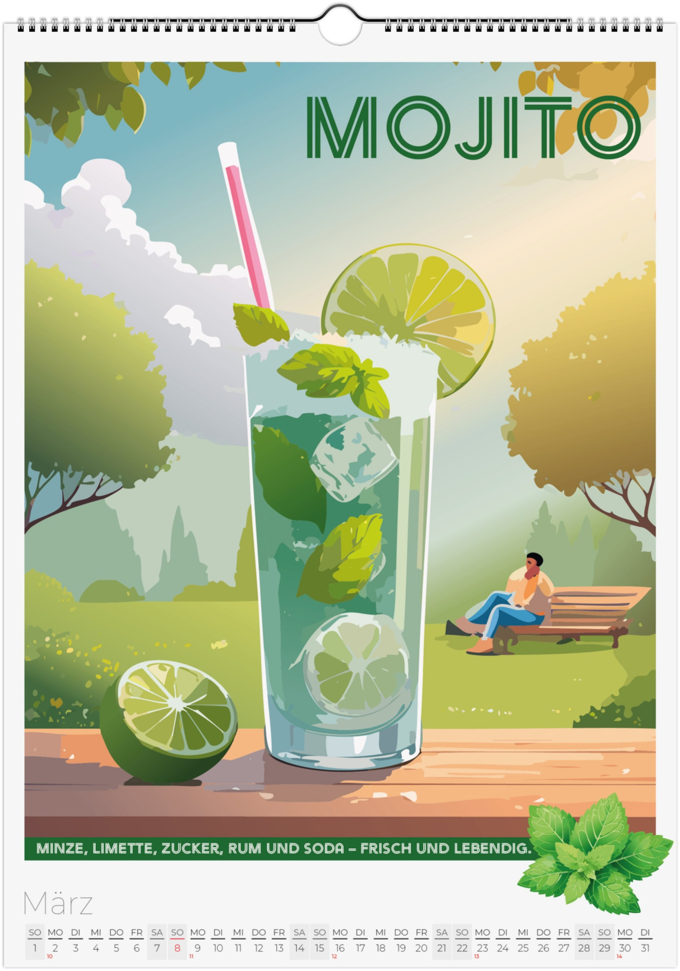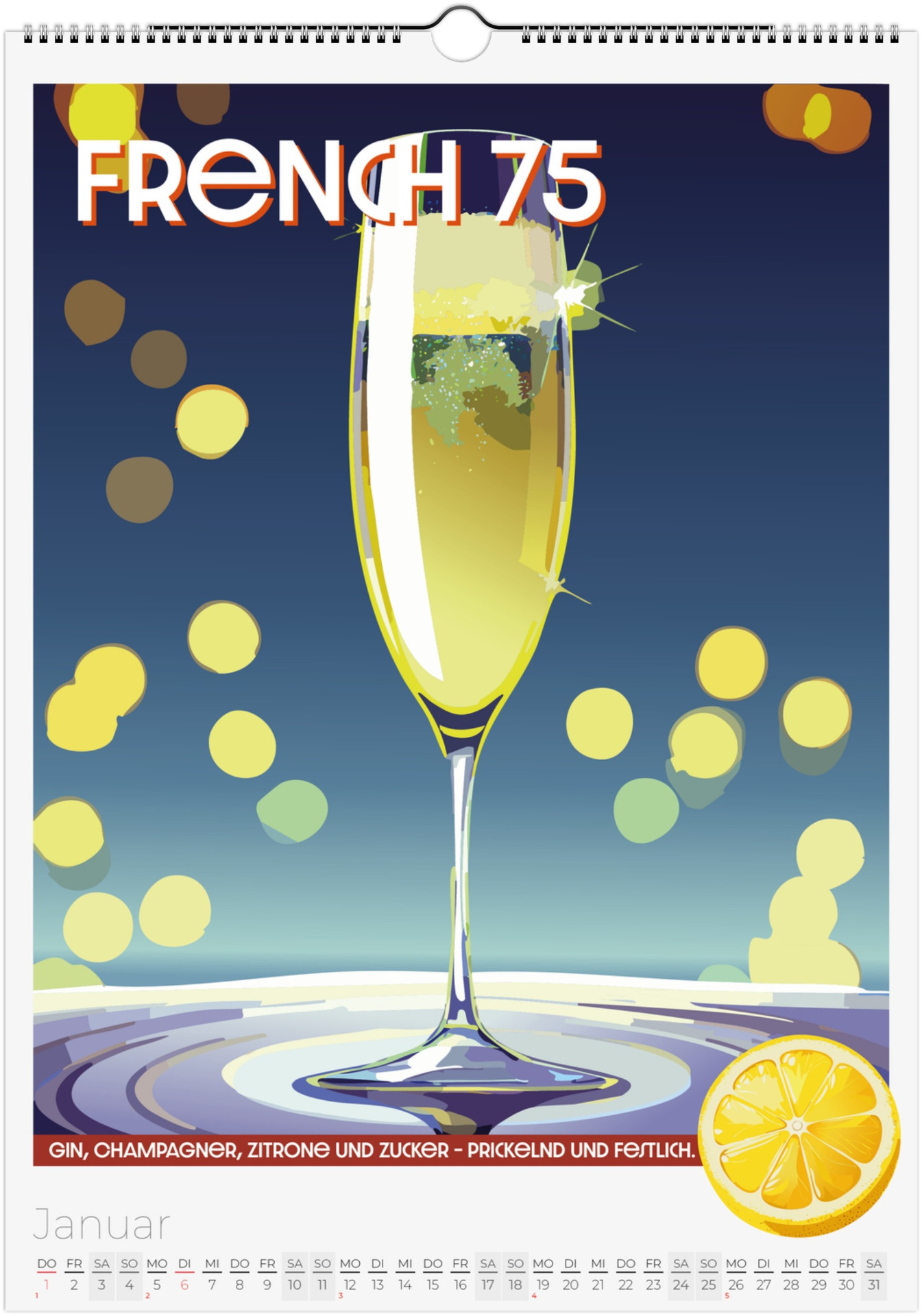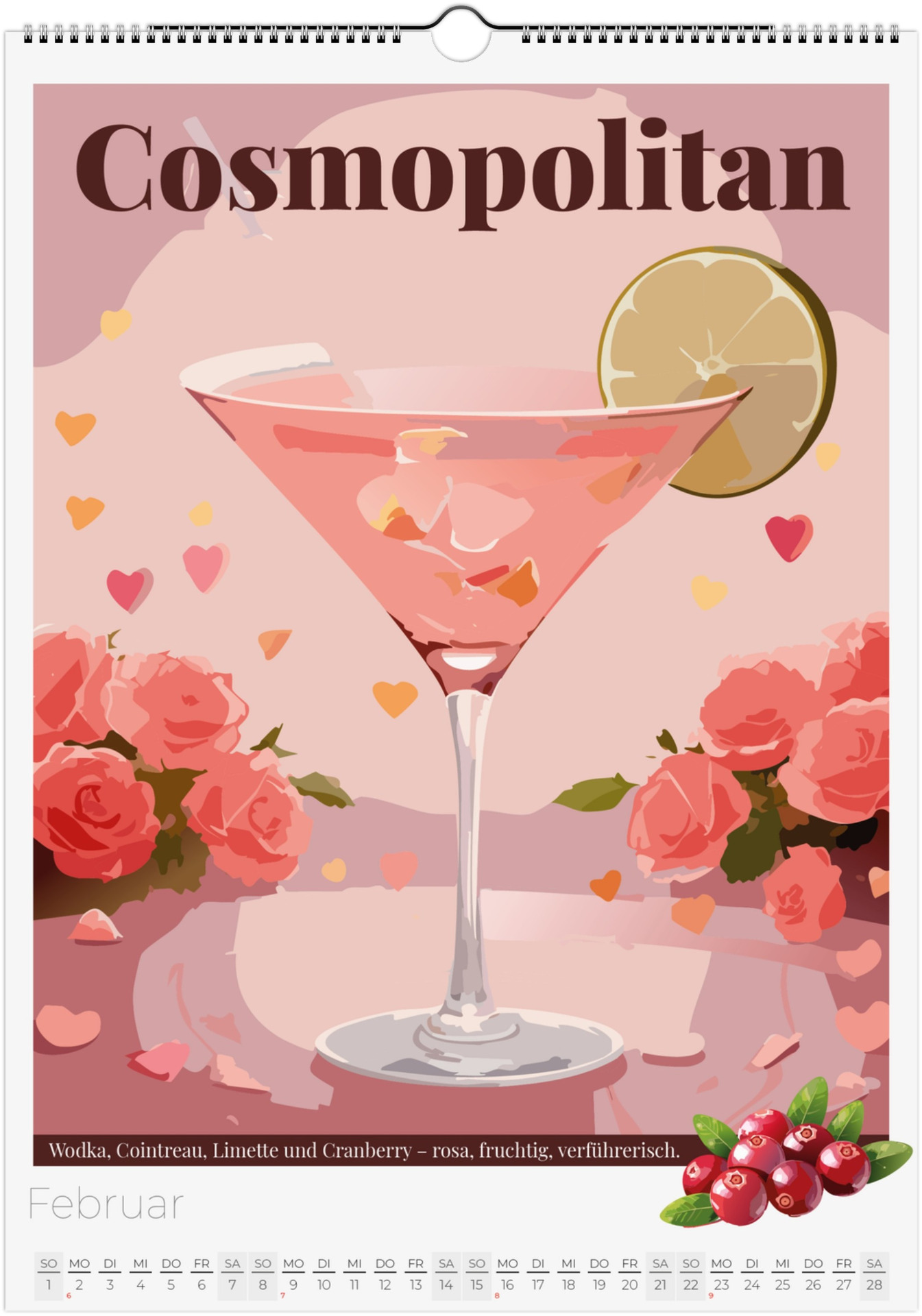 12 Monate voller stilvoller Cocktailillustrationen und eleganter Genussmomente. Jeder Monat zeigt einen besonderen Cocktail in moderner, minimalistischer Szene – vom spritzigen Sommerdrink bis zum winterlichen Klassiker.