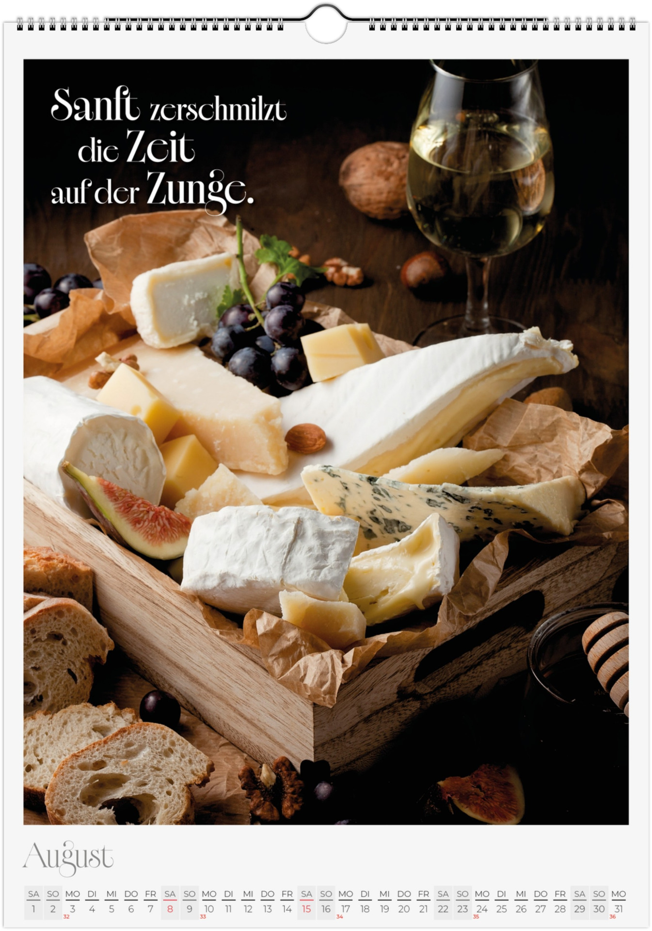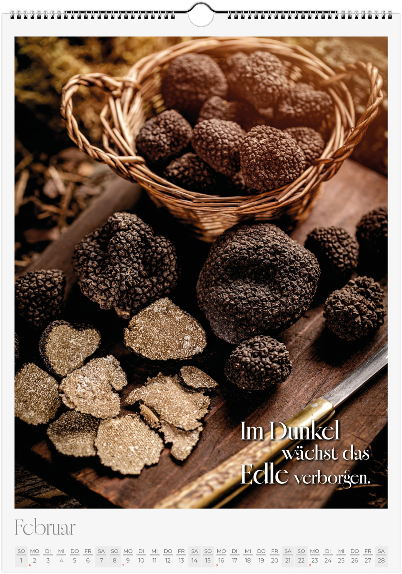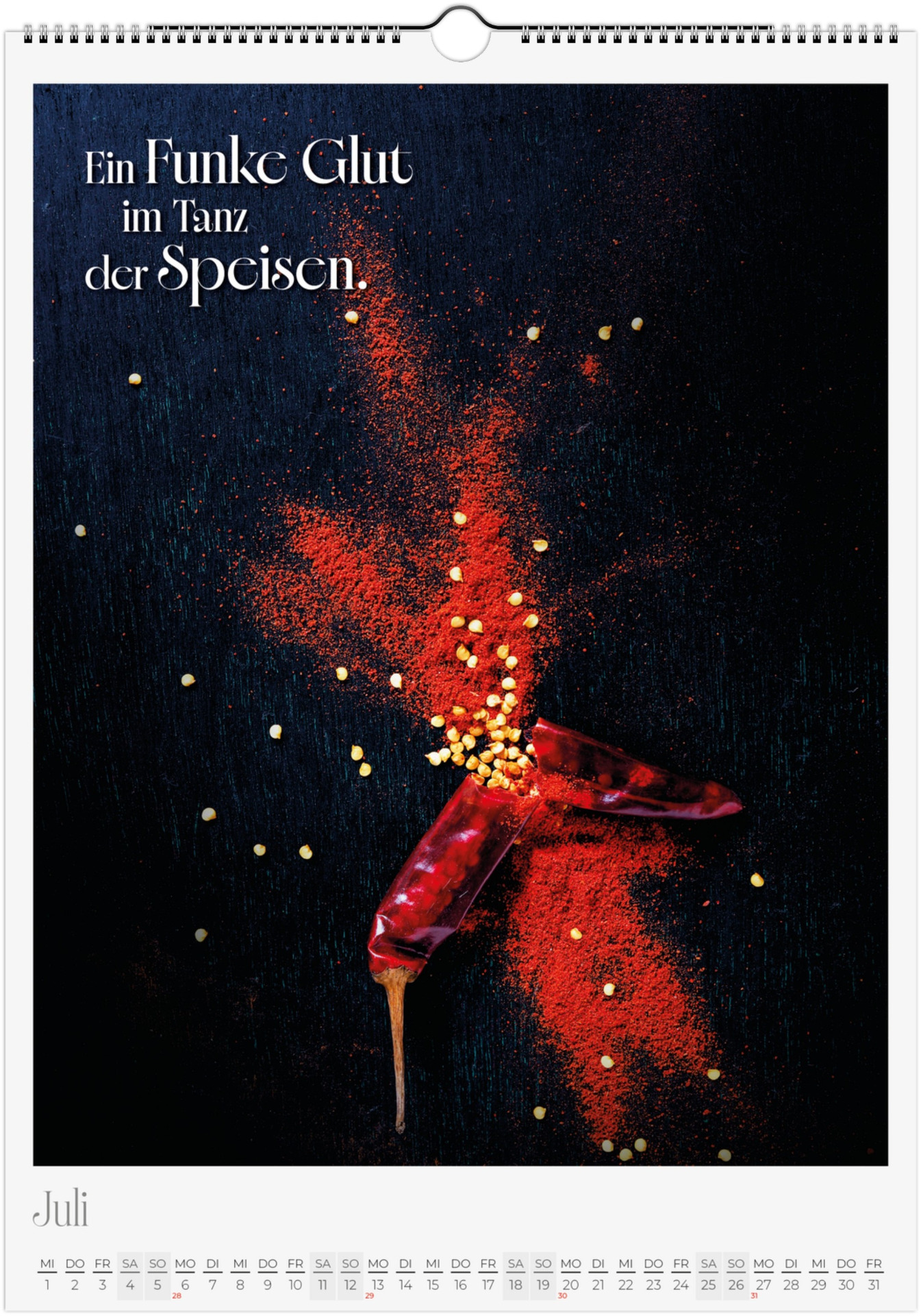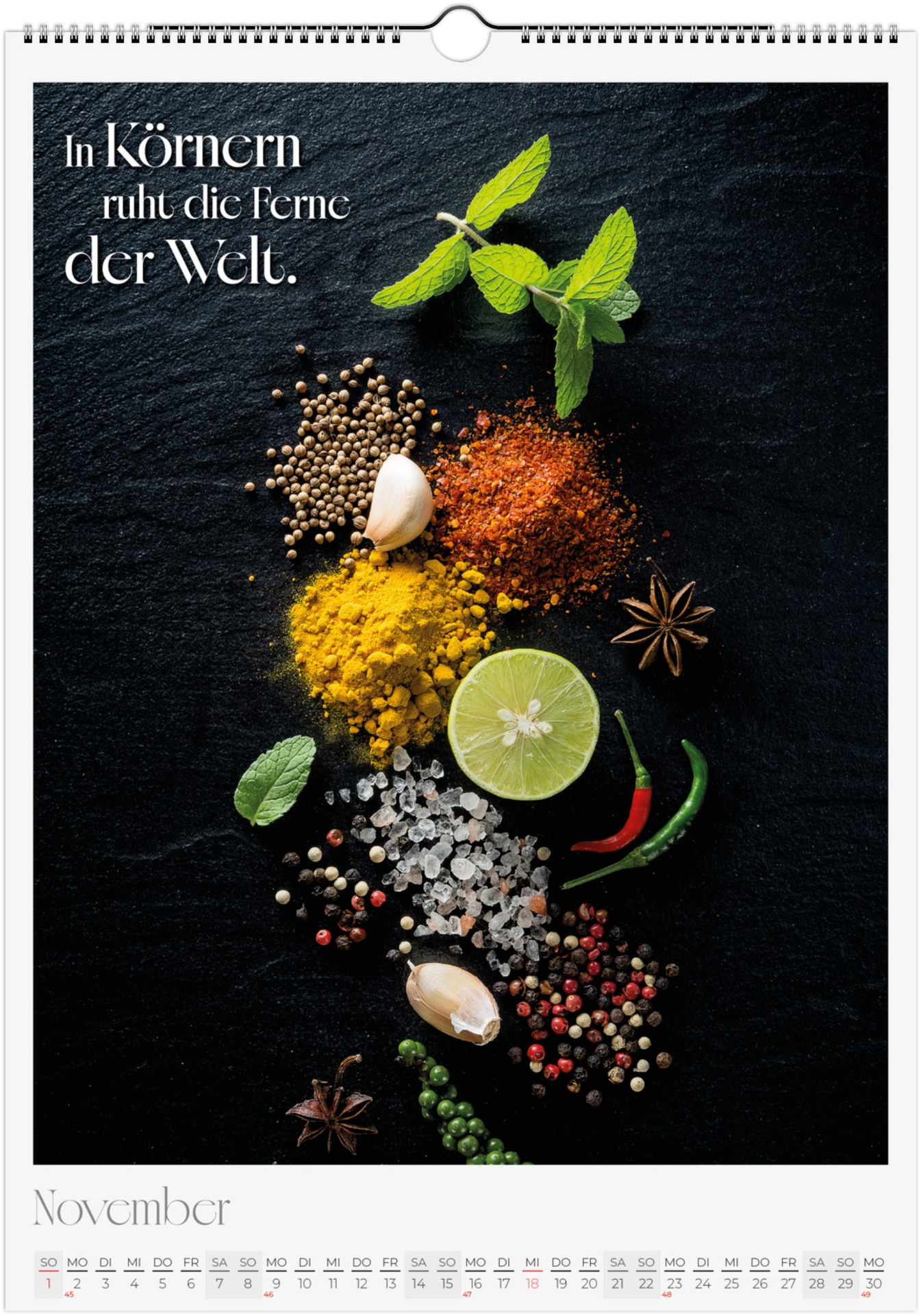 12 Monate voller kulinarischer Vielfalt und poetischer Sprüche. Jeder Monat zeigt ein liebevoll gestaltetes Food-Motiv – von Basilikum, Chili und Zitronen bis hin zu Kaffee, Käse oder Trüffel.