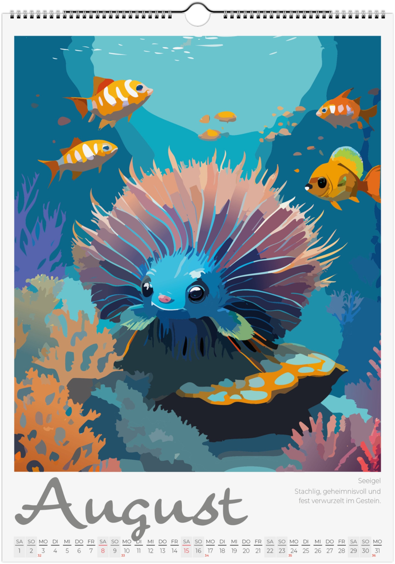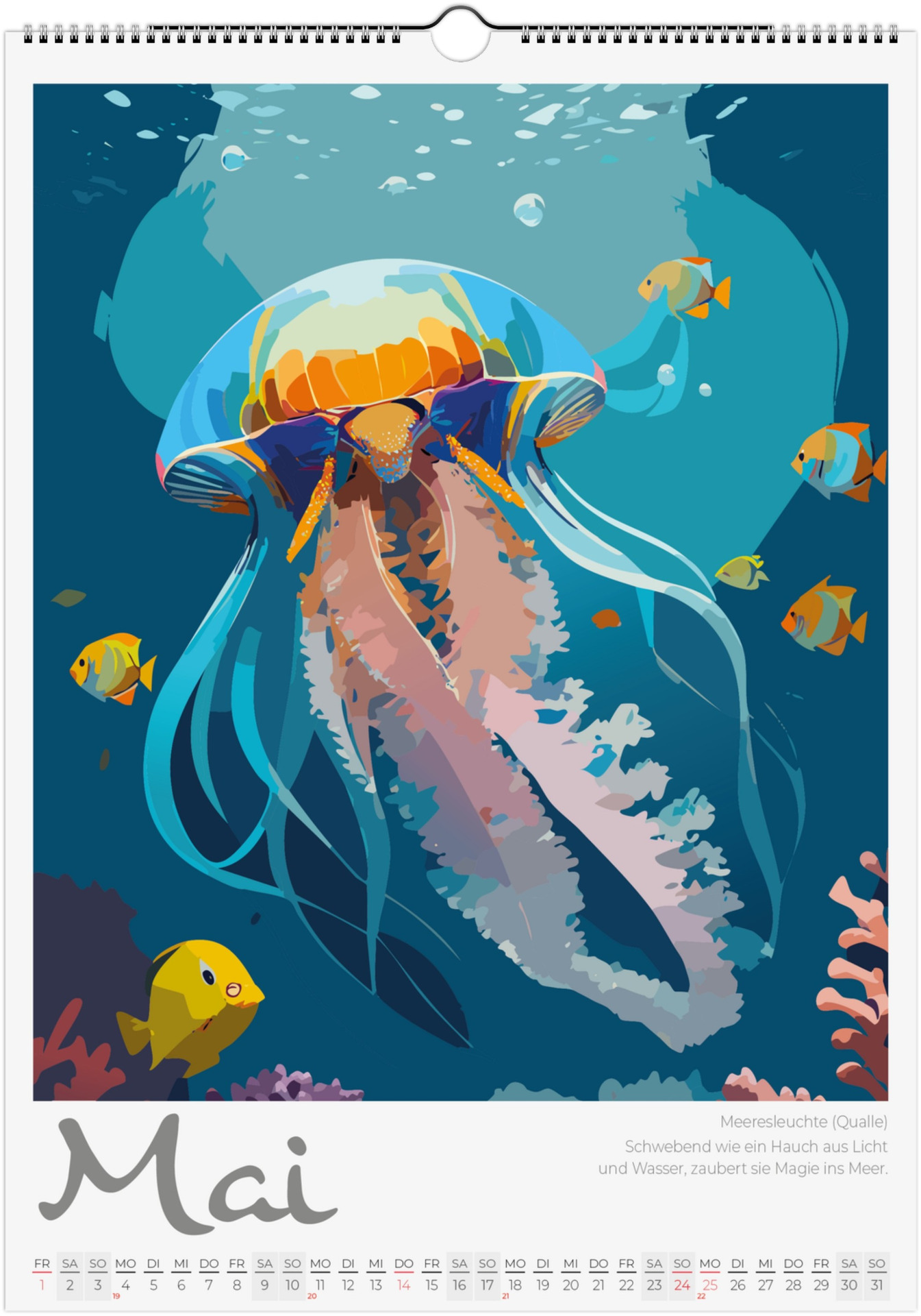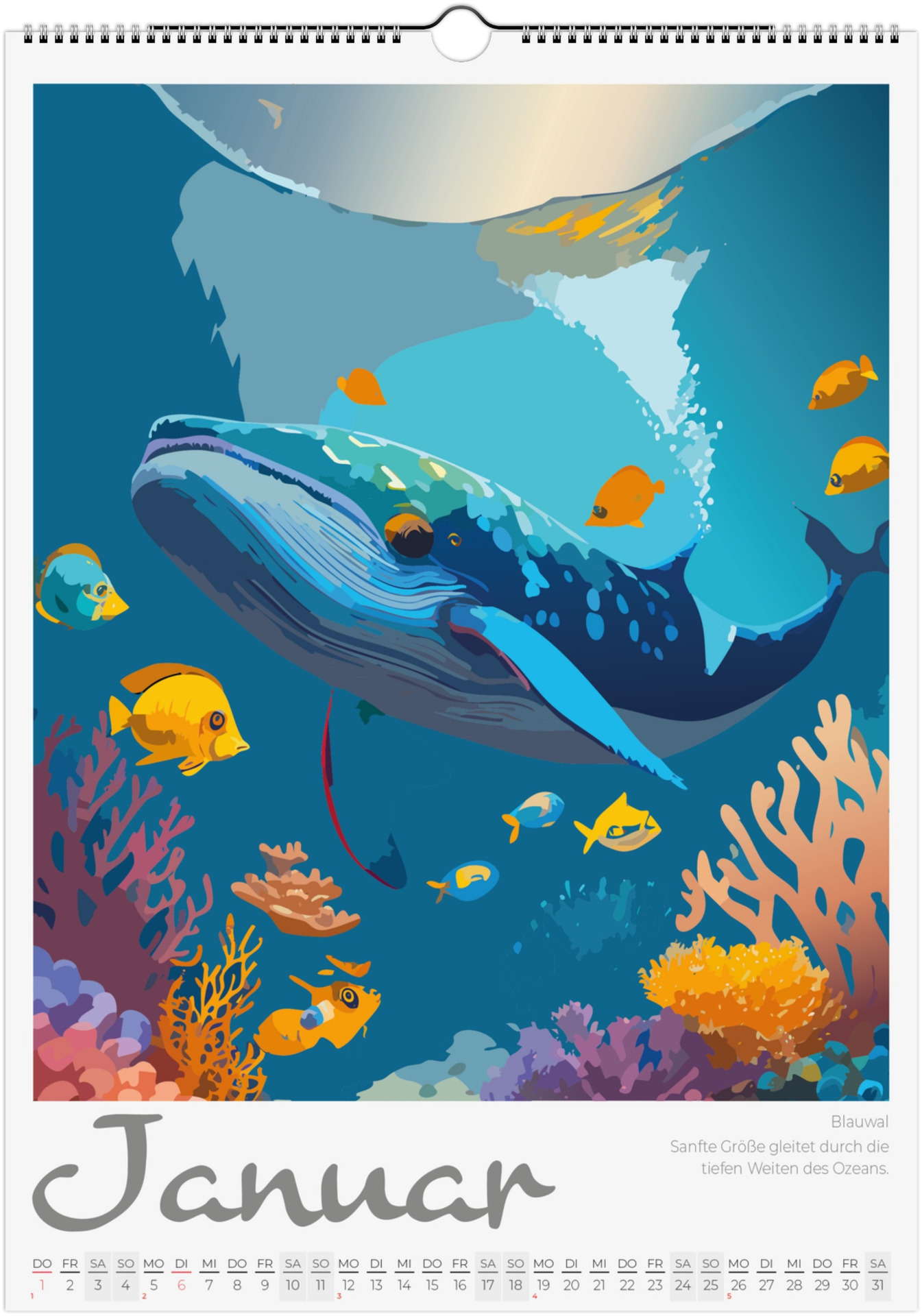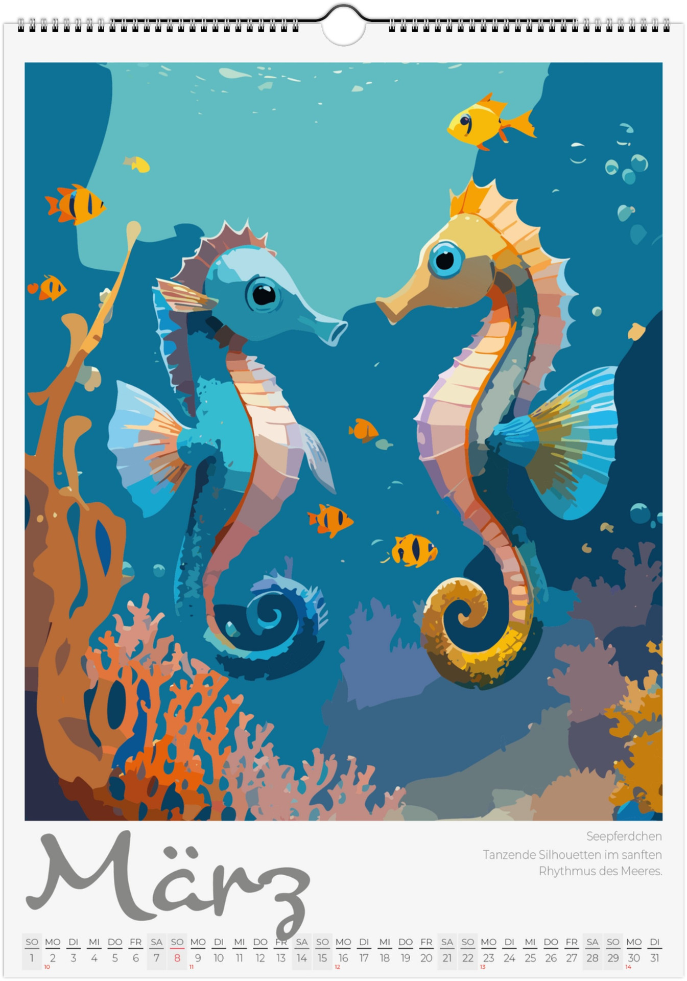 12 Monate voller faszinierender Meeresbewohner, Unterwasserwelt und poetischer Illustrationen. Jeder Monat zeigt ein eigenes Tier in seiner natürlichen Umgebung.
