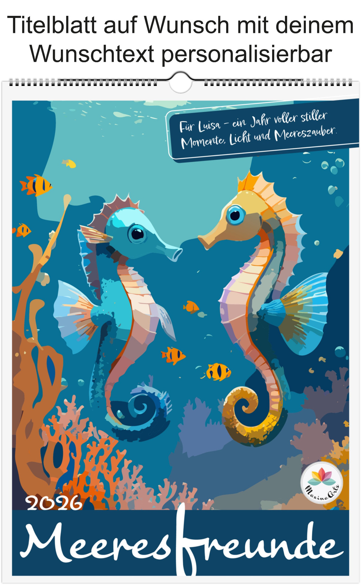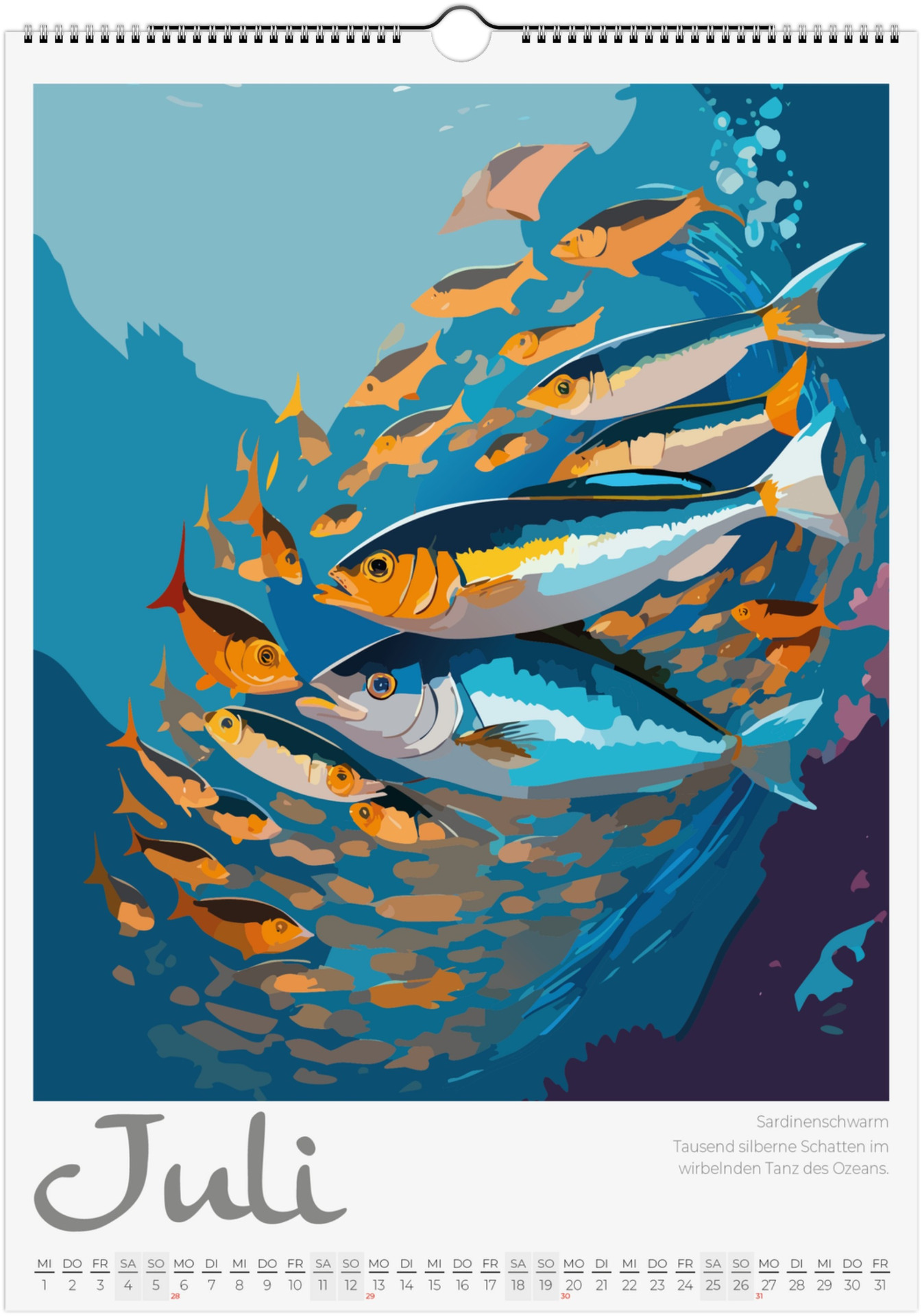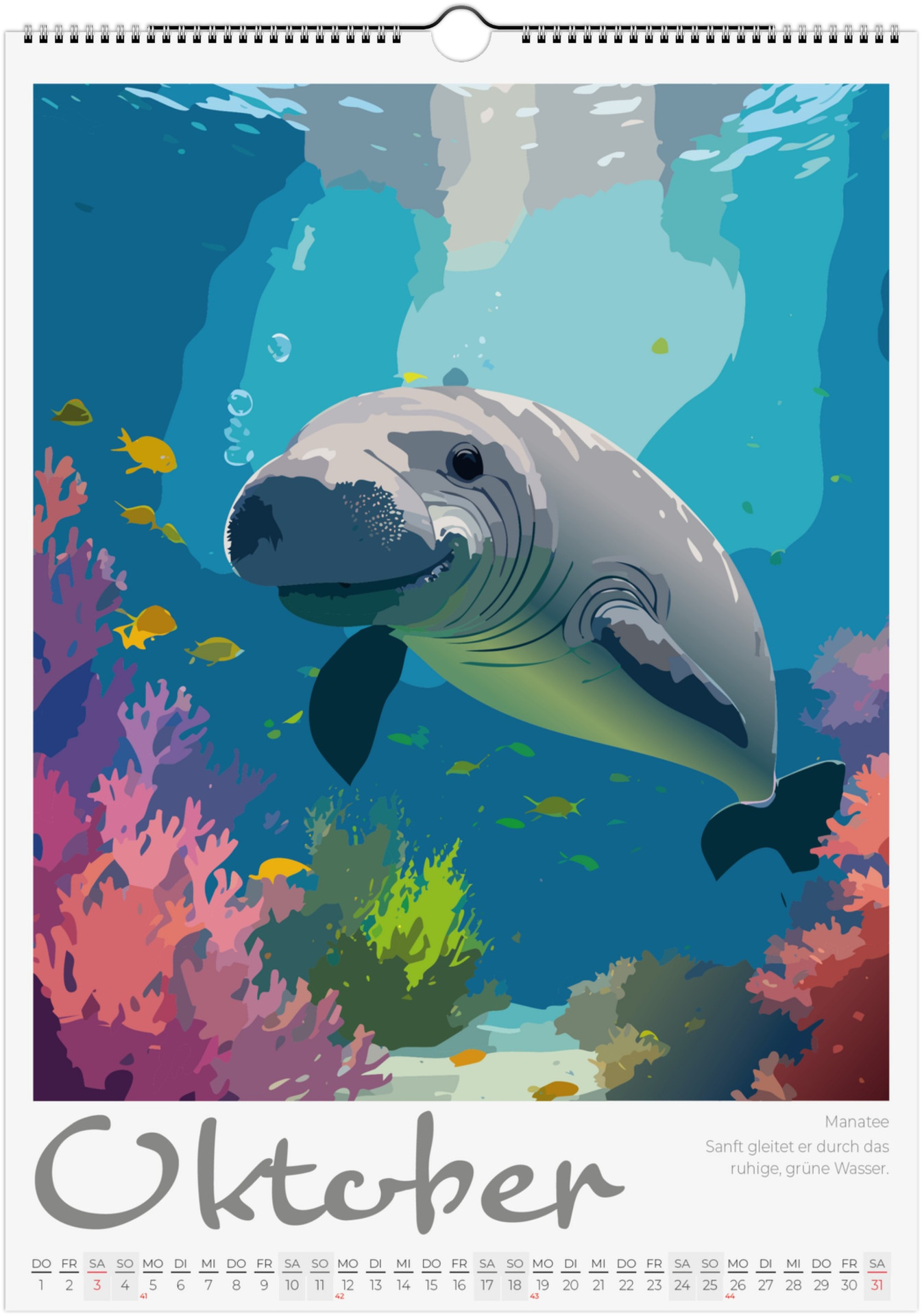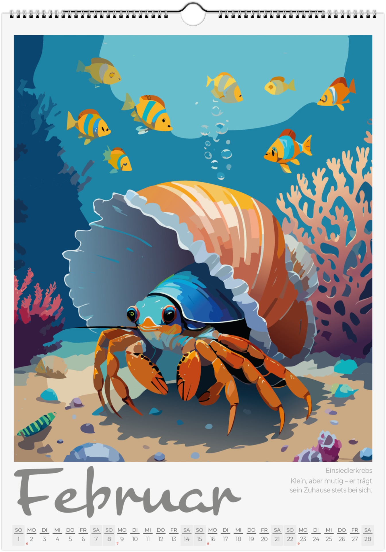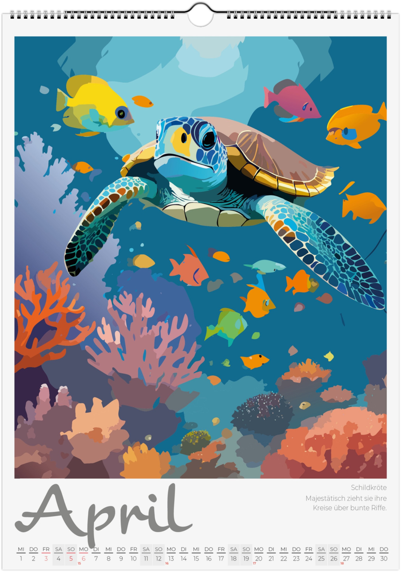 12 Monate voller faszinierender Meeresbewohner, Unterwasserwelt und poetischer Illustrationen. Jeder Monat zeigt ein eigenes Tier in seiner natürlichen Umgebung.