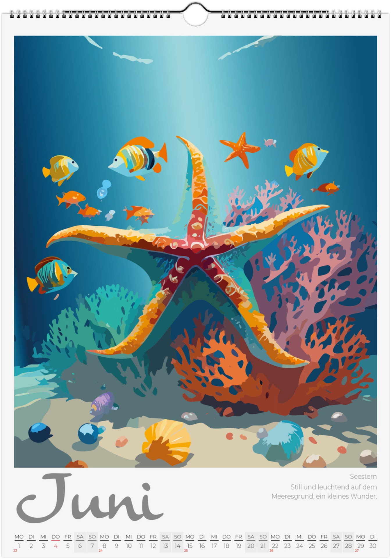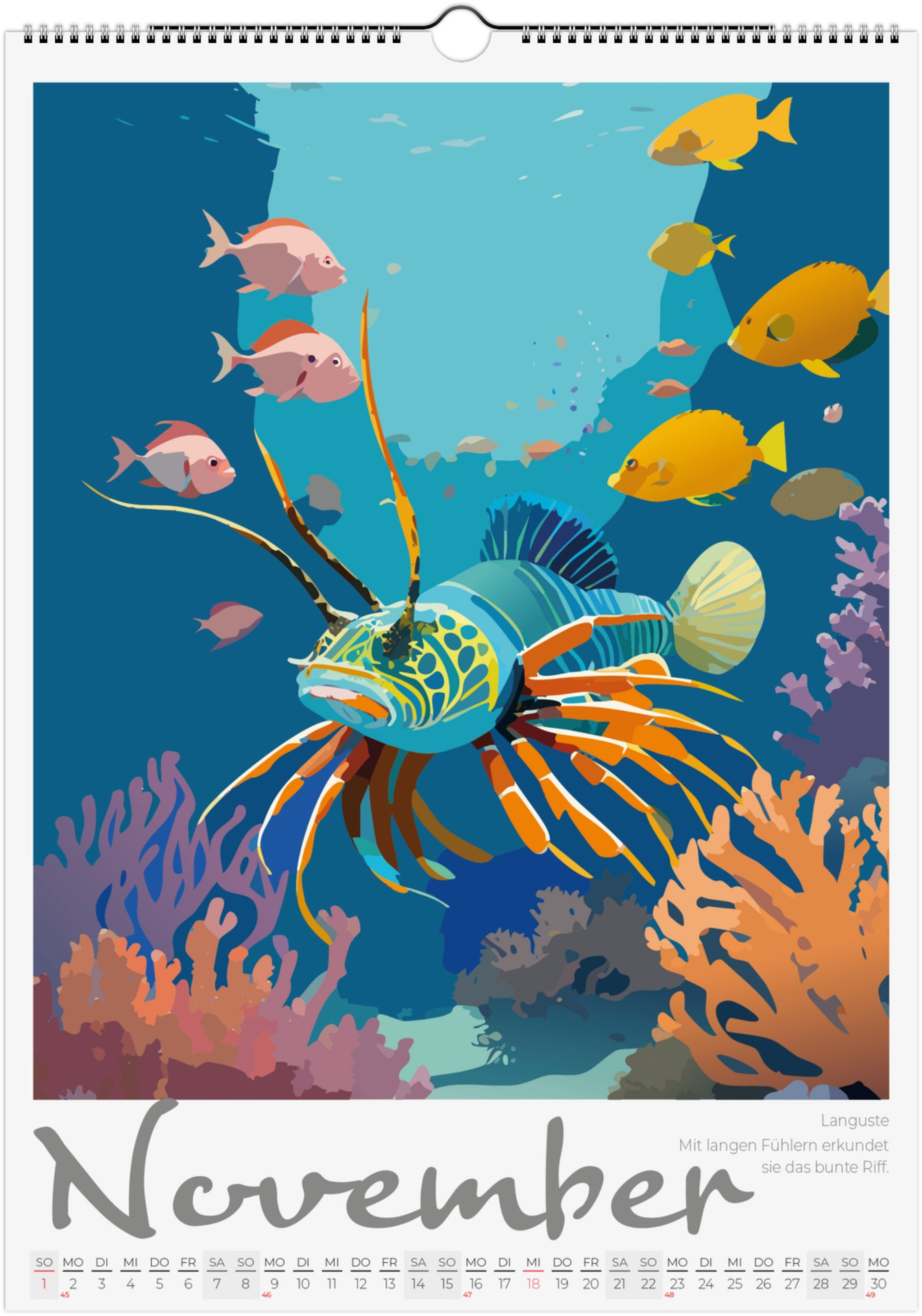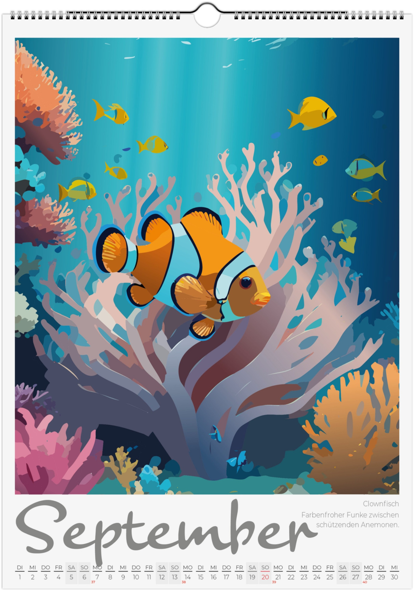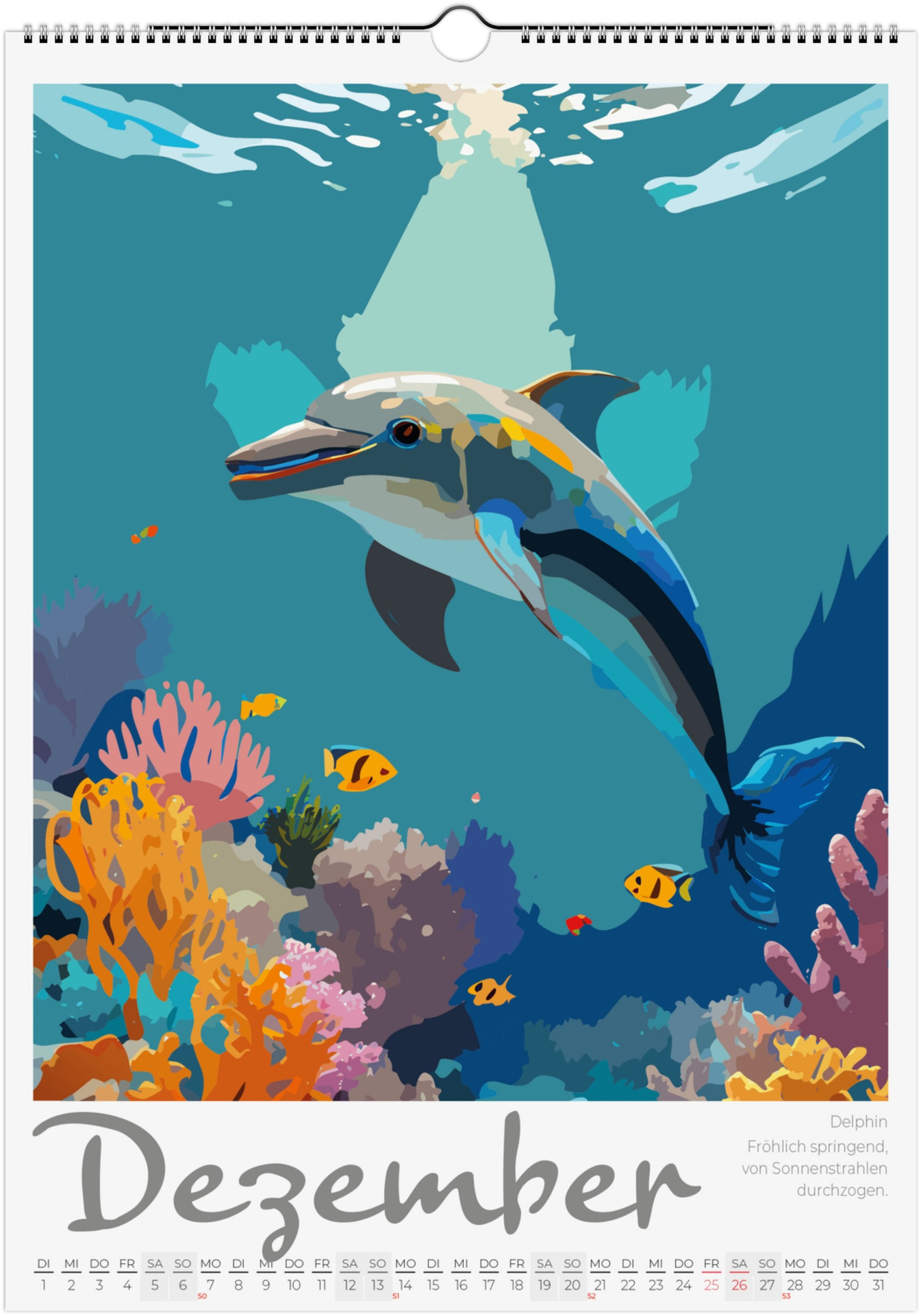 12 Monate voller faszinierender Meeresbewohner, Unterwasserwelt und poetischer Illustrationen. Jeder Monat zeigt ein eigenes Tier in seiner natürlichen Umgebung.