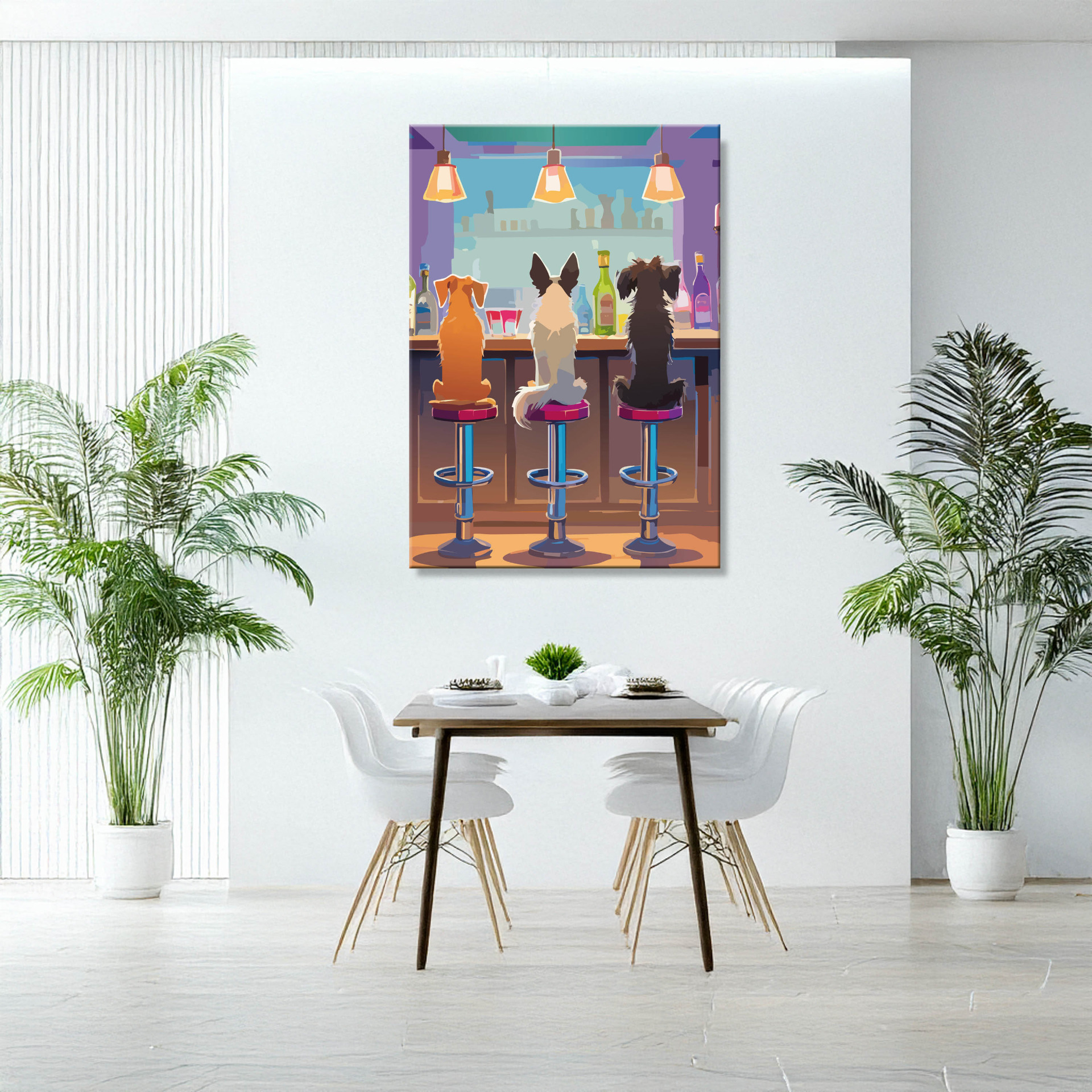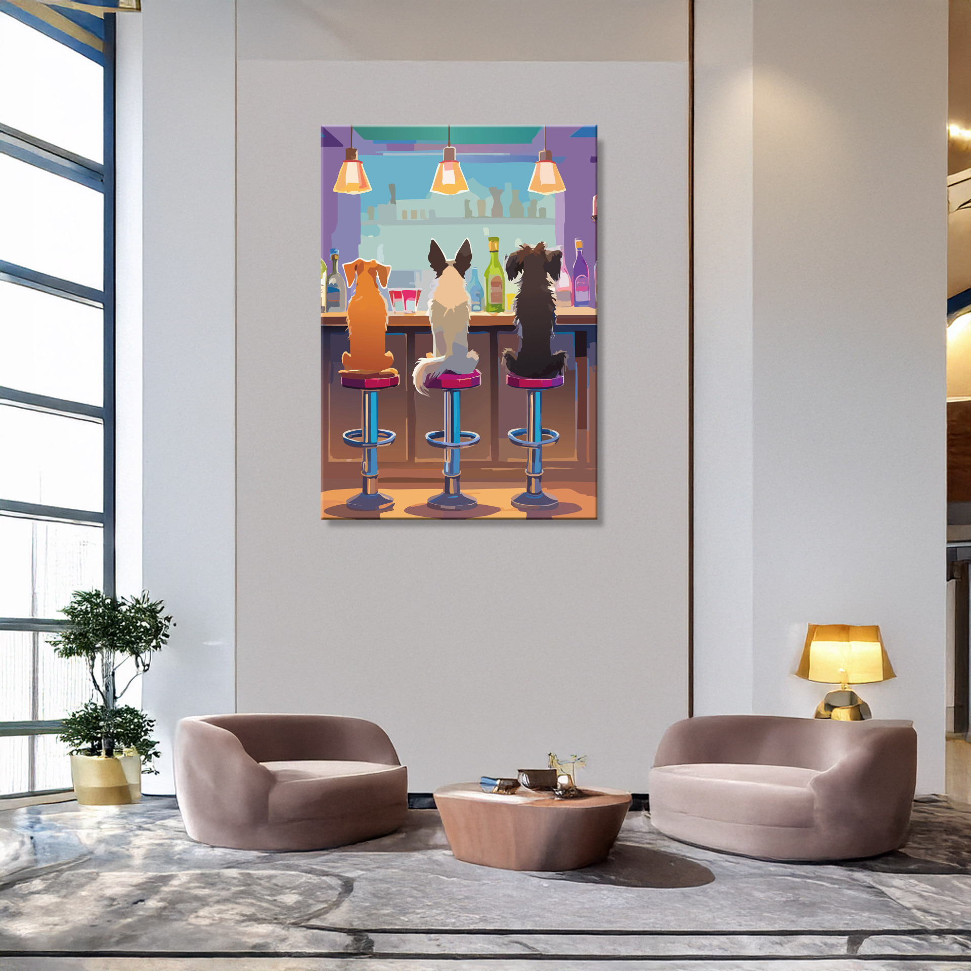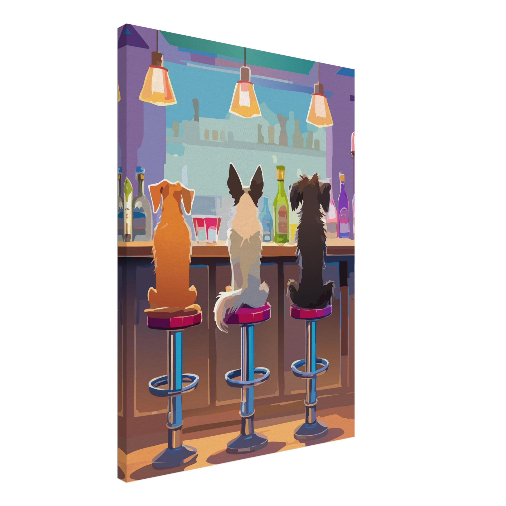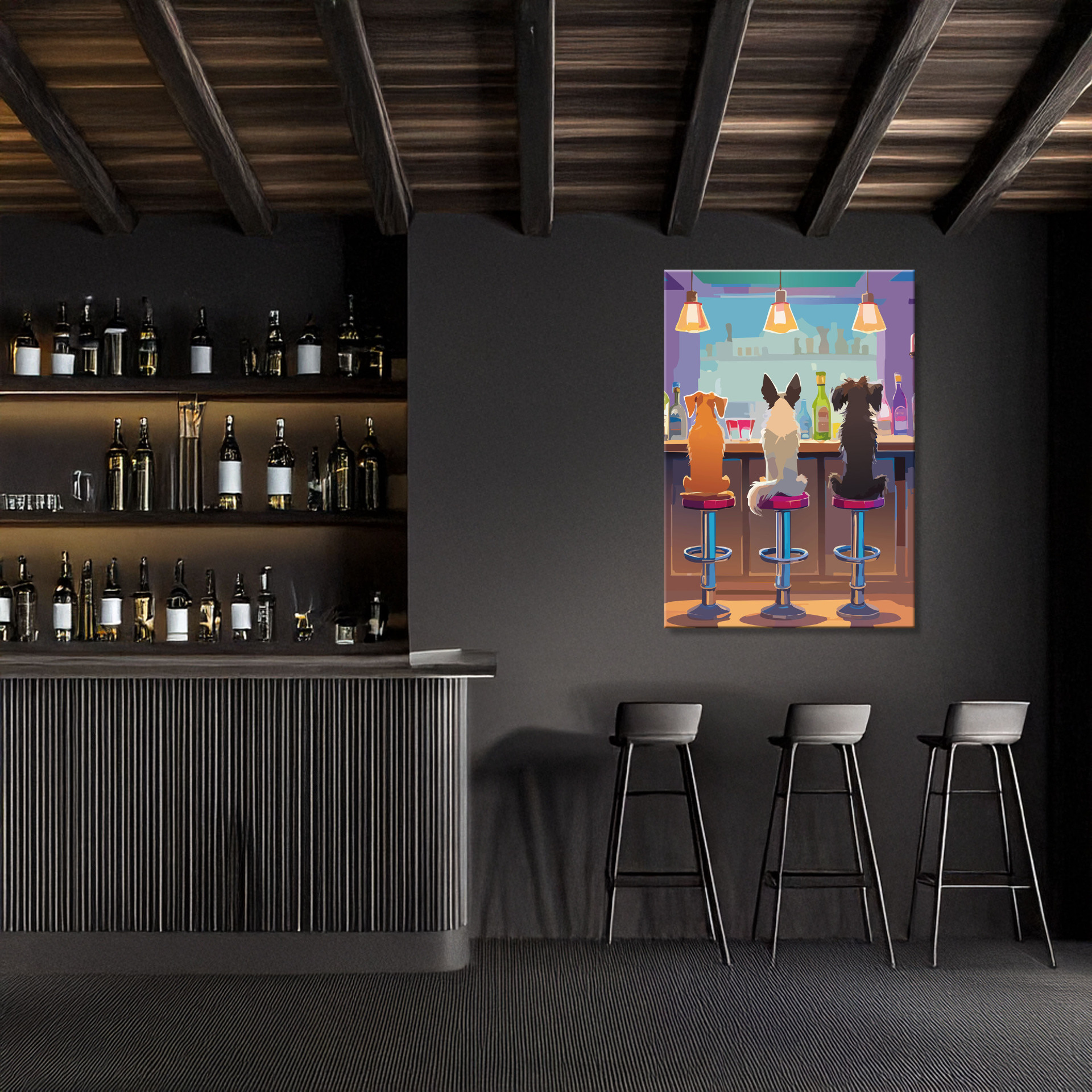 Von hinten betrachtet, aber voller Persönlichkeit: Drei Hunde an der Bar, jeder vertieft in sein eigenes Warten. Ein Kunstwerk, das charmant, witzig und stilvoll zugleich ist.