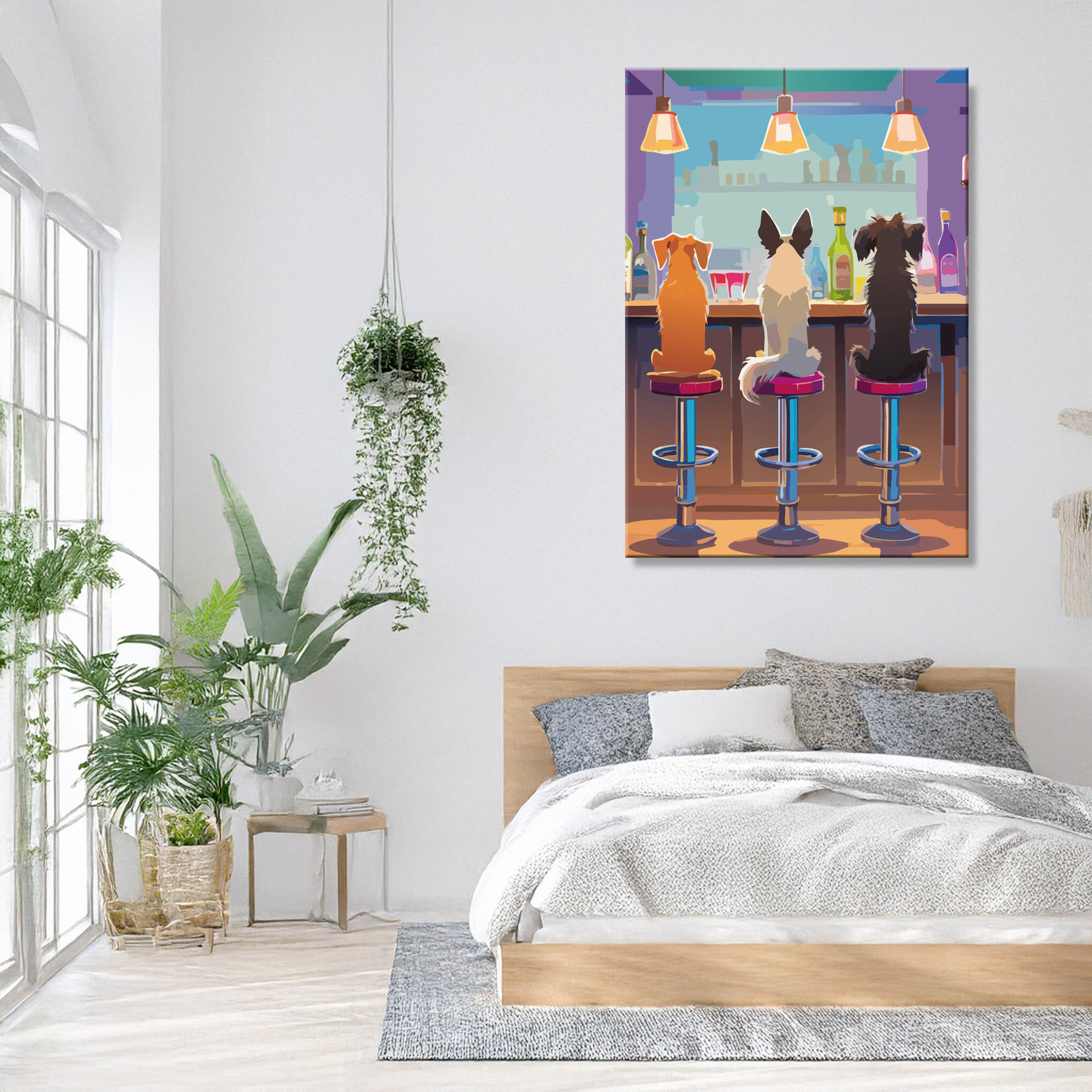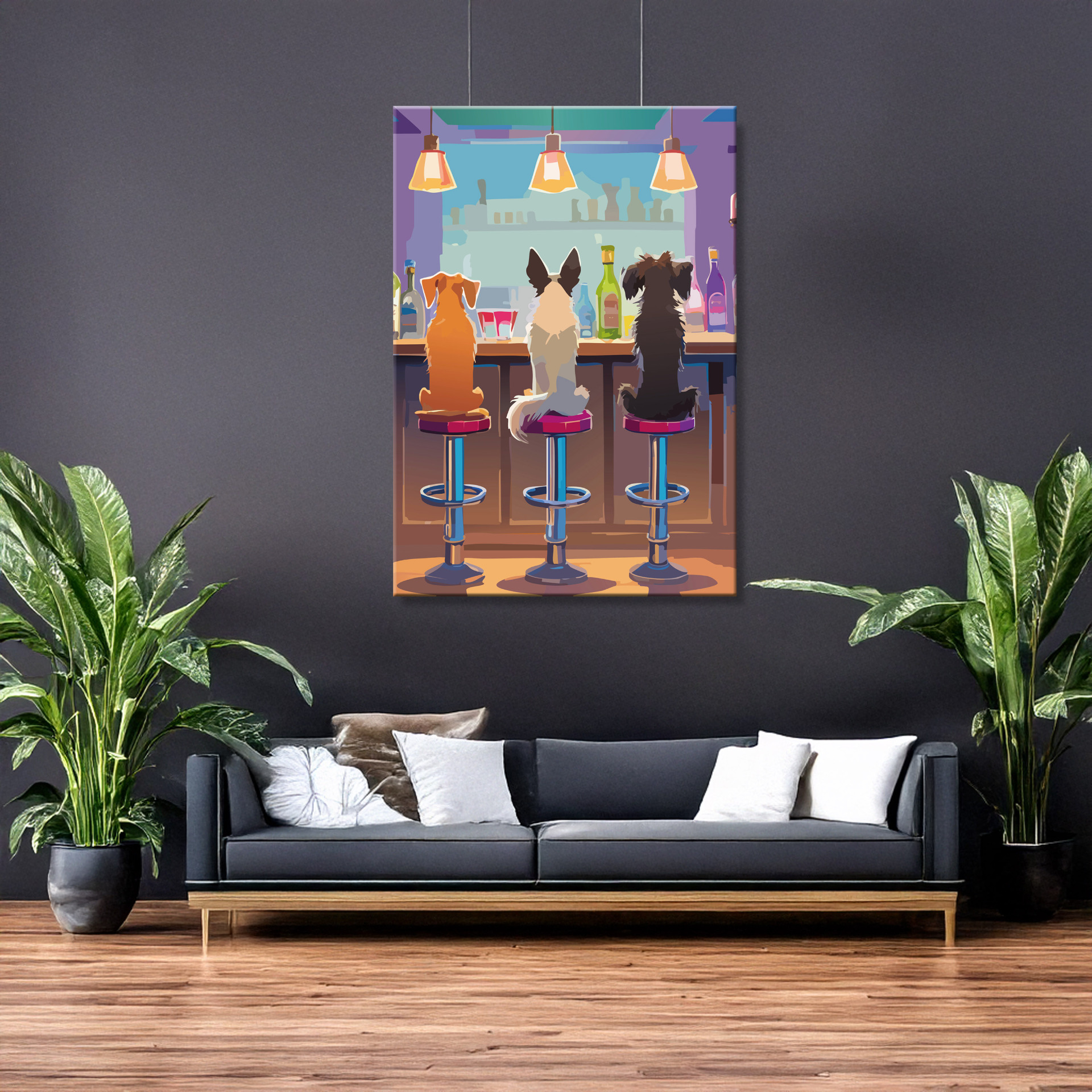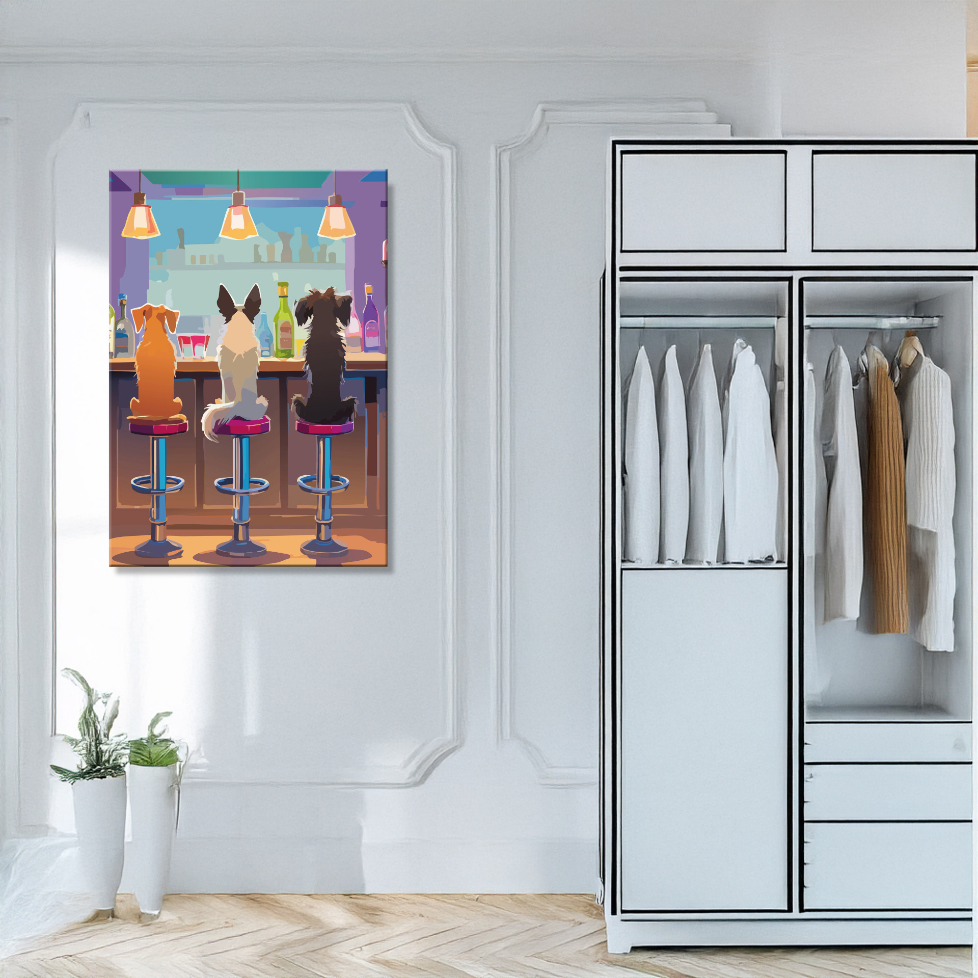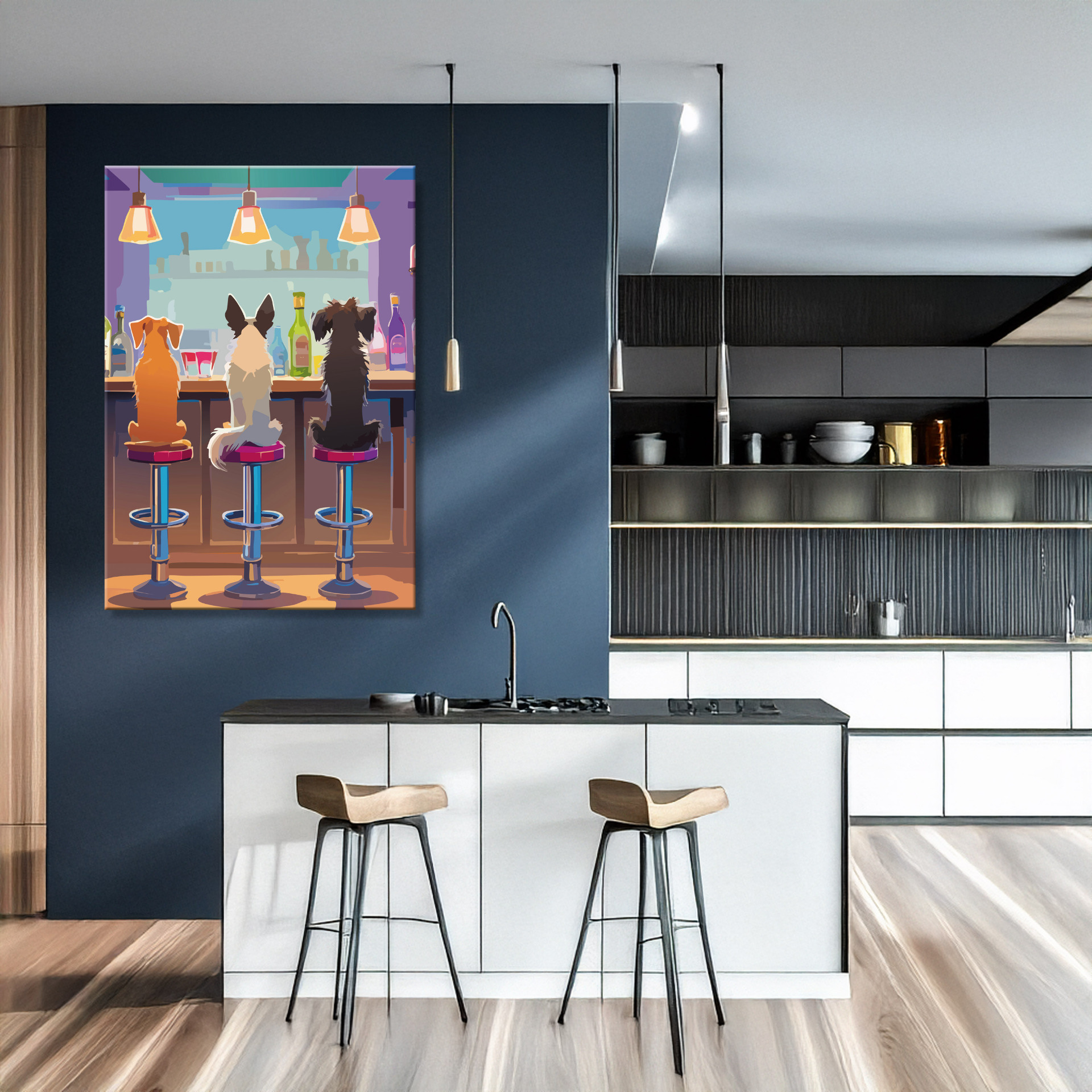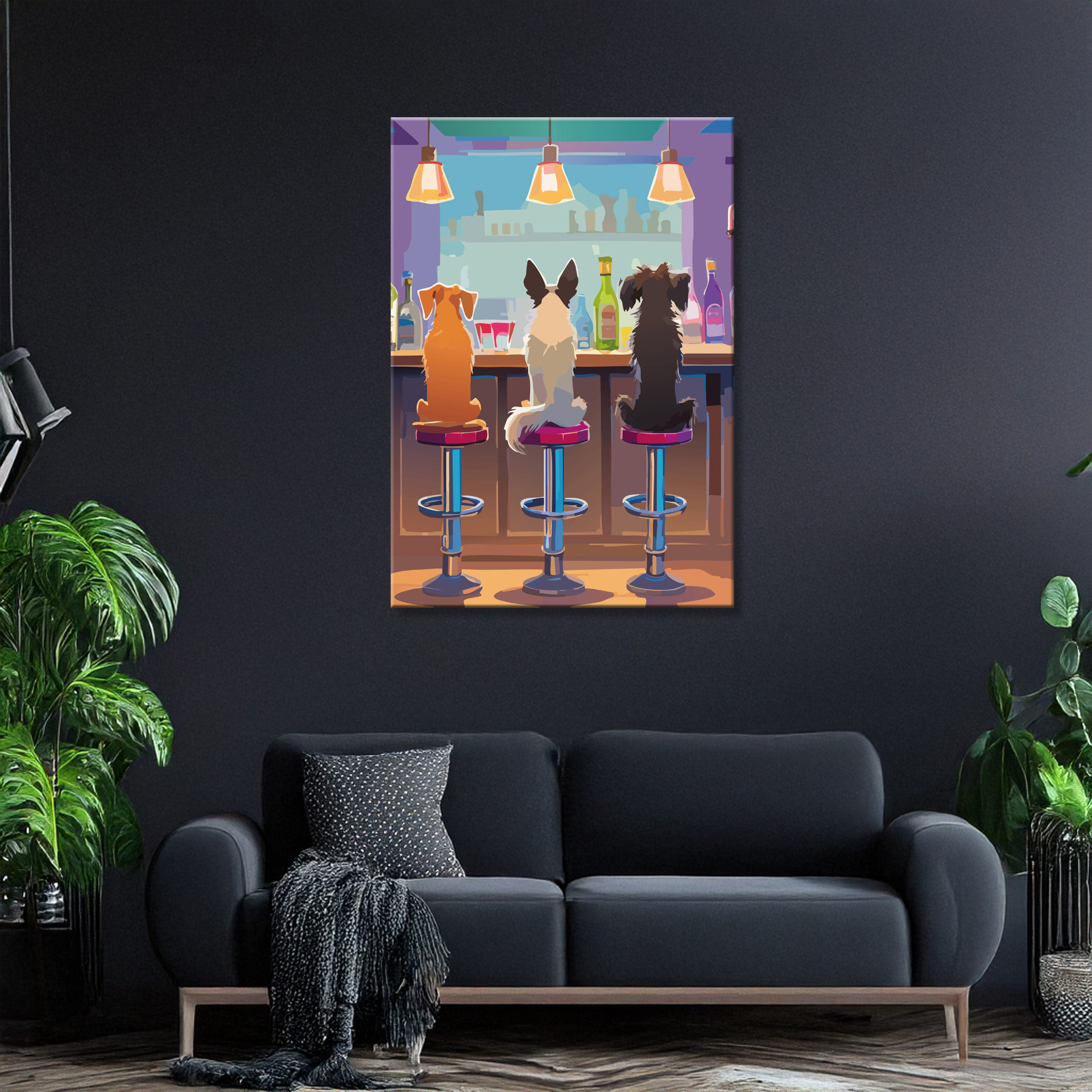 Von hinten betrachtet, aber voller Persönlichkeit: Drei Hunde an der Bar, jeder vertieft in sein eigenes Warten. Ein Kunstwerk, das charmant, witzig und stilvoll zugleich ist.